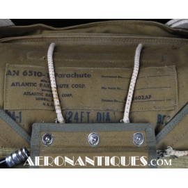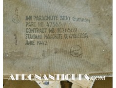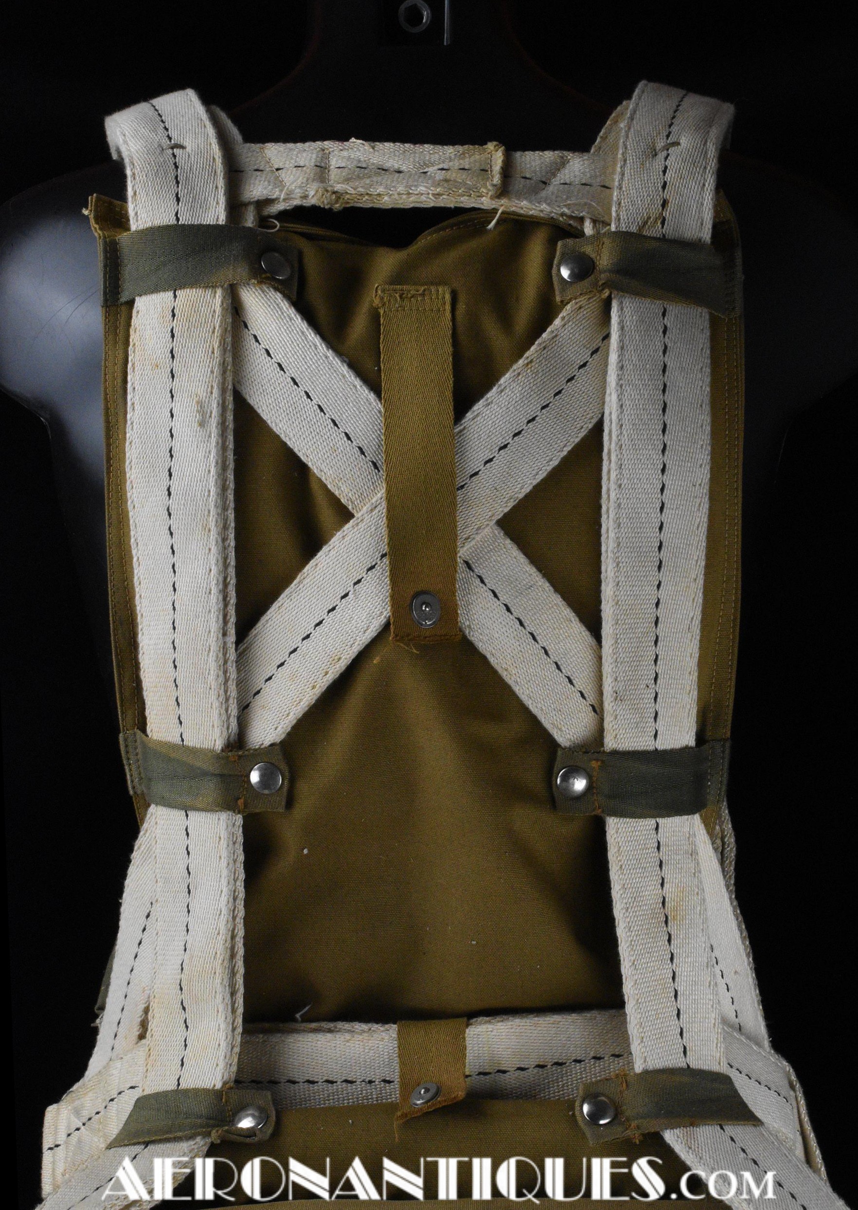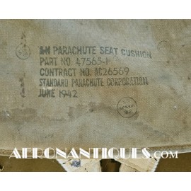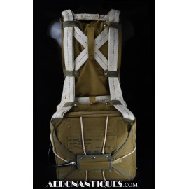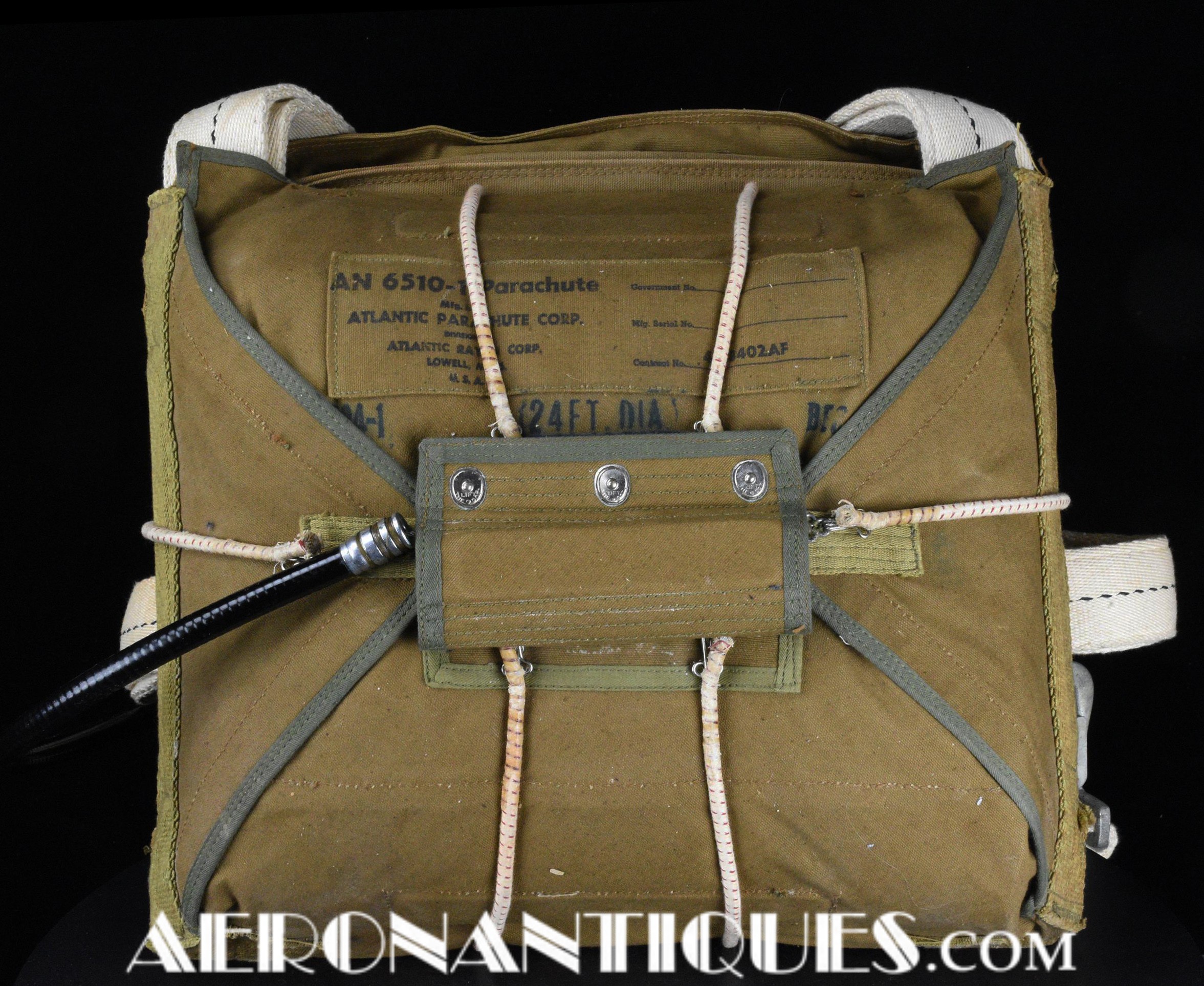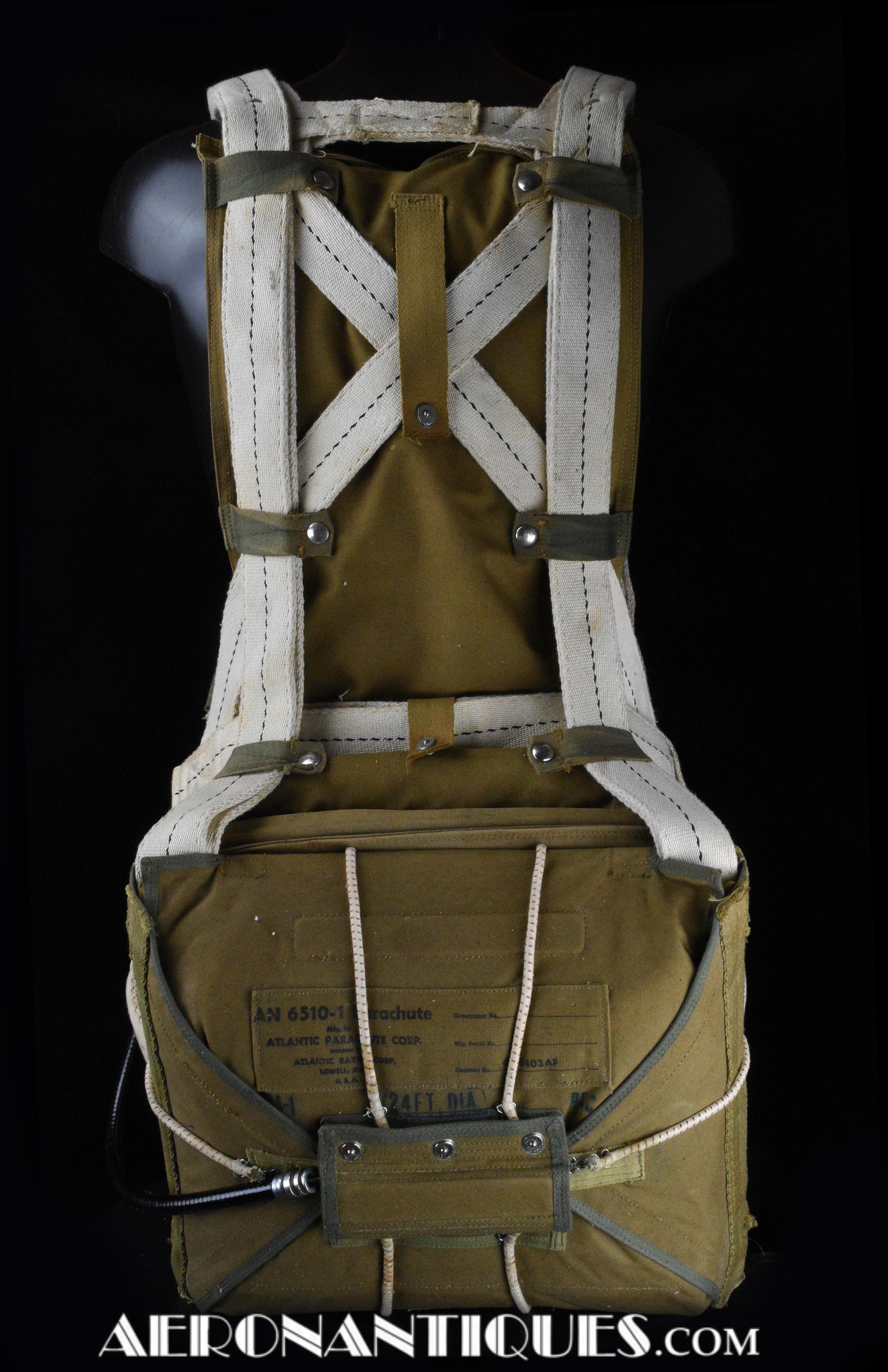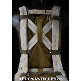 Circa 1942-43 US Army Air Force and Navy fighter or bomber pilot seat parachute and harness assembly type AN-6510. 42G2012 harness made by FASHION FROCKS. 1943 dated 42N2004-1 parachute pack (for 24 feet canopies) made by ATLANTIC PARACHUTE CORP. Type 42D2013 back pad. 47565-1 seat cushion dated 1942 made by STANDARD PARACHUTE CORP. NO CANOPY INSIDE. Typical WWII fighter pilot or C-47, B-17 pilots and co-pilots flying gear. The AN-6510 seat parahute has been produced from 1941 to 1943 before being superseded by the S-5 with Irving quick release buckle from 1944 on.