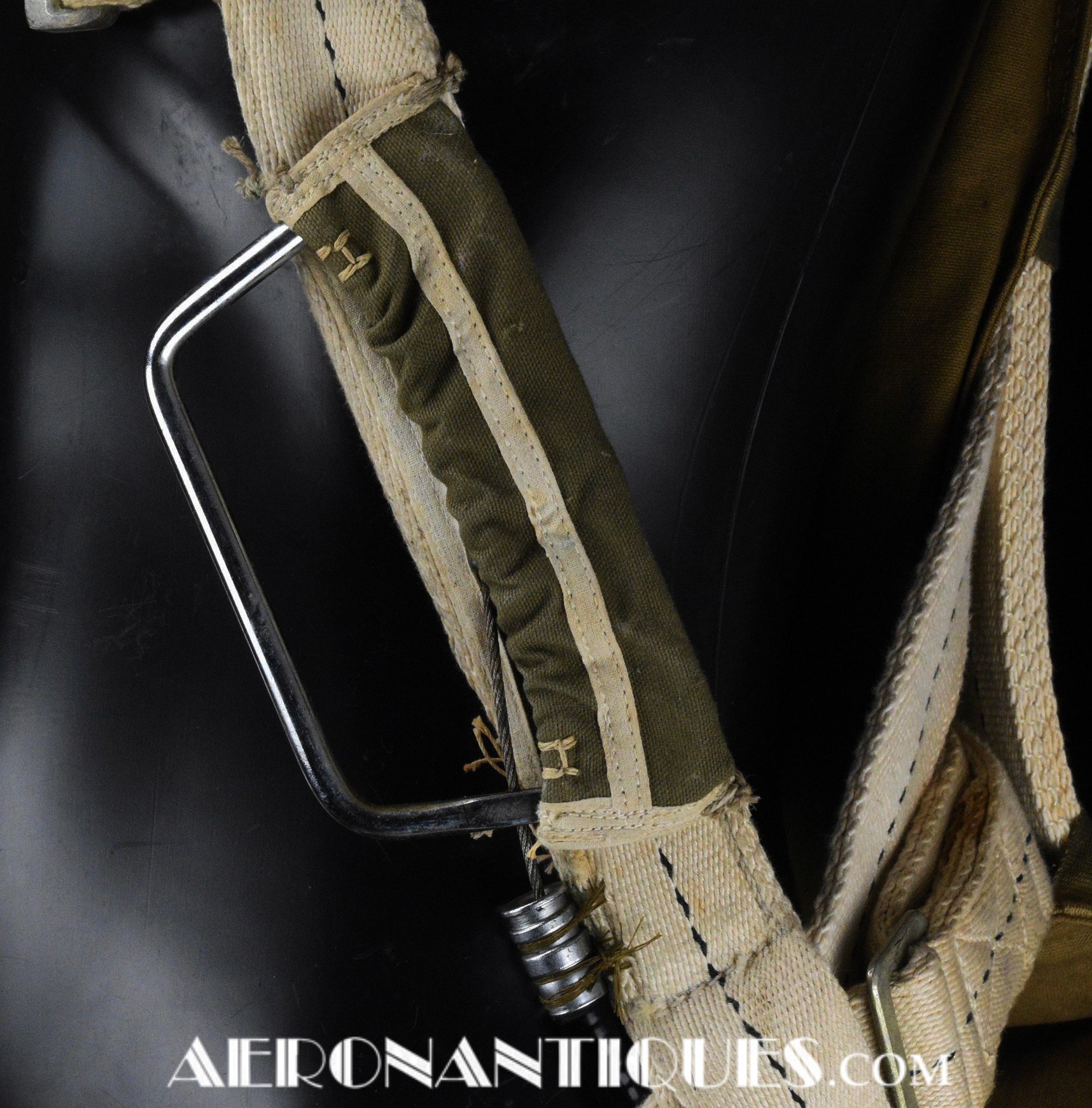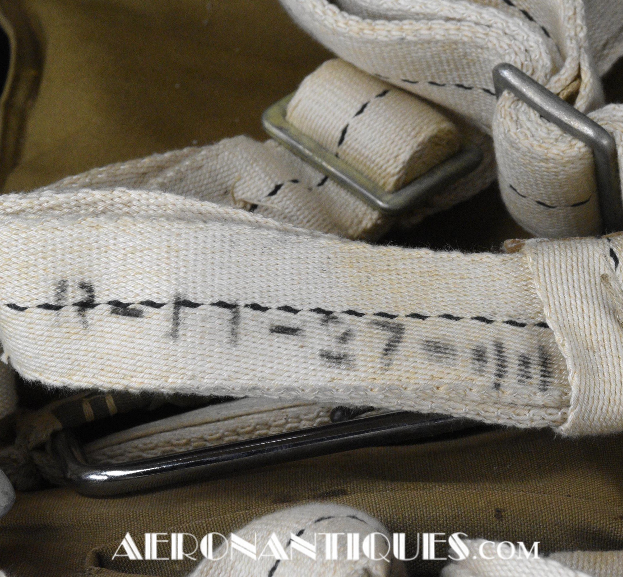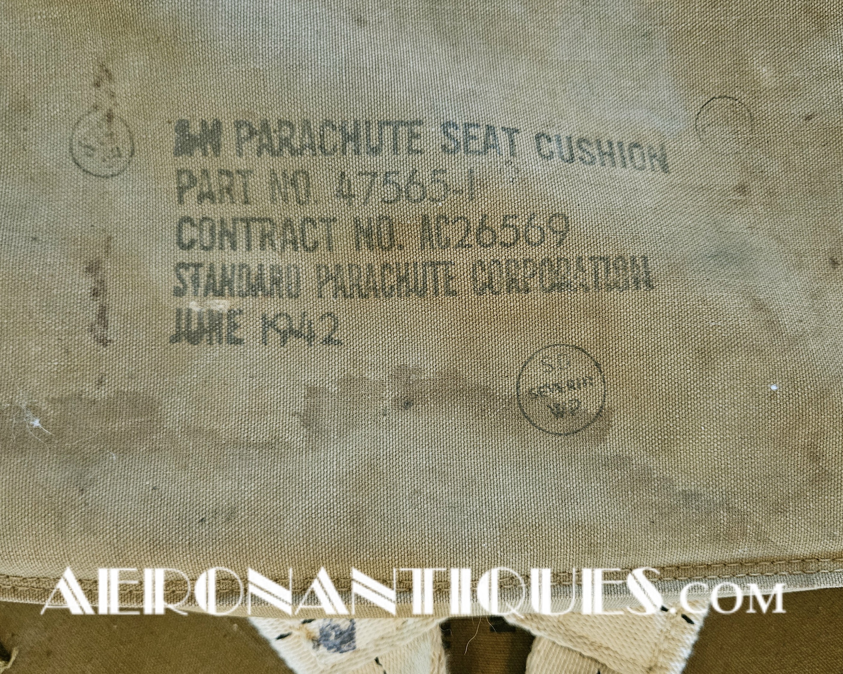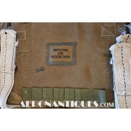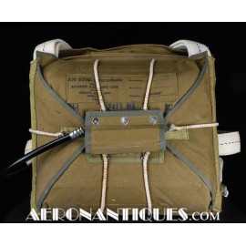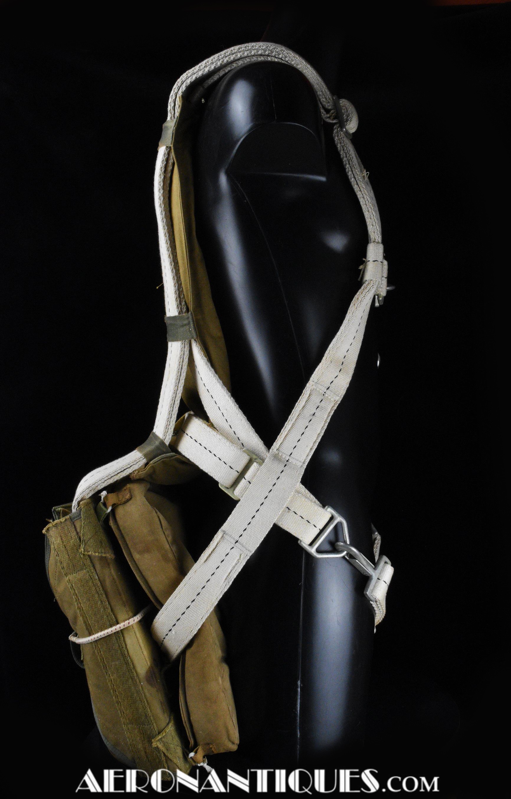 Circa 1942-43 US Army Air Force and Navy fighter or bomber pilot seat parachute and harness assembly type AN-6510. 42G2012 harness made by FASHION FROCKS. 1943 dated 42N2004-1 parachute pack (for 24 feet canopies) made by ATLANTIC PARACHUTE CORP. Type 42D2013 back pad. 47565-1 seat cushion dated 1942 made by STANDARD PARACHUTE CORP. NO CANOPY INSIDE. Typical WWII fighter pilot or C-47, B-17 pilots and co-pilots flying gear. The AN-6510 seat parahute has been produced from 1941 to 1943 before being superseded by the S-5 with Irving quick release buckle from 1944 on.