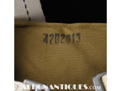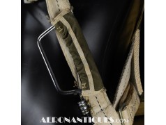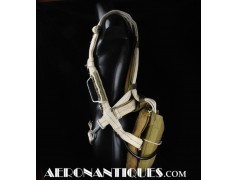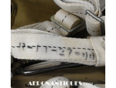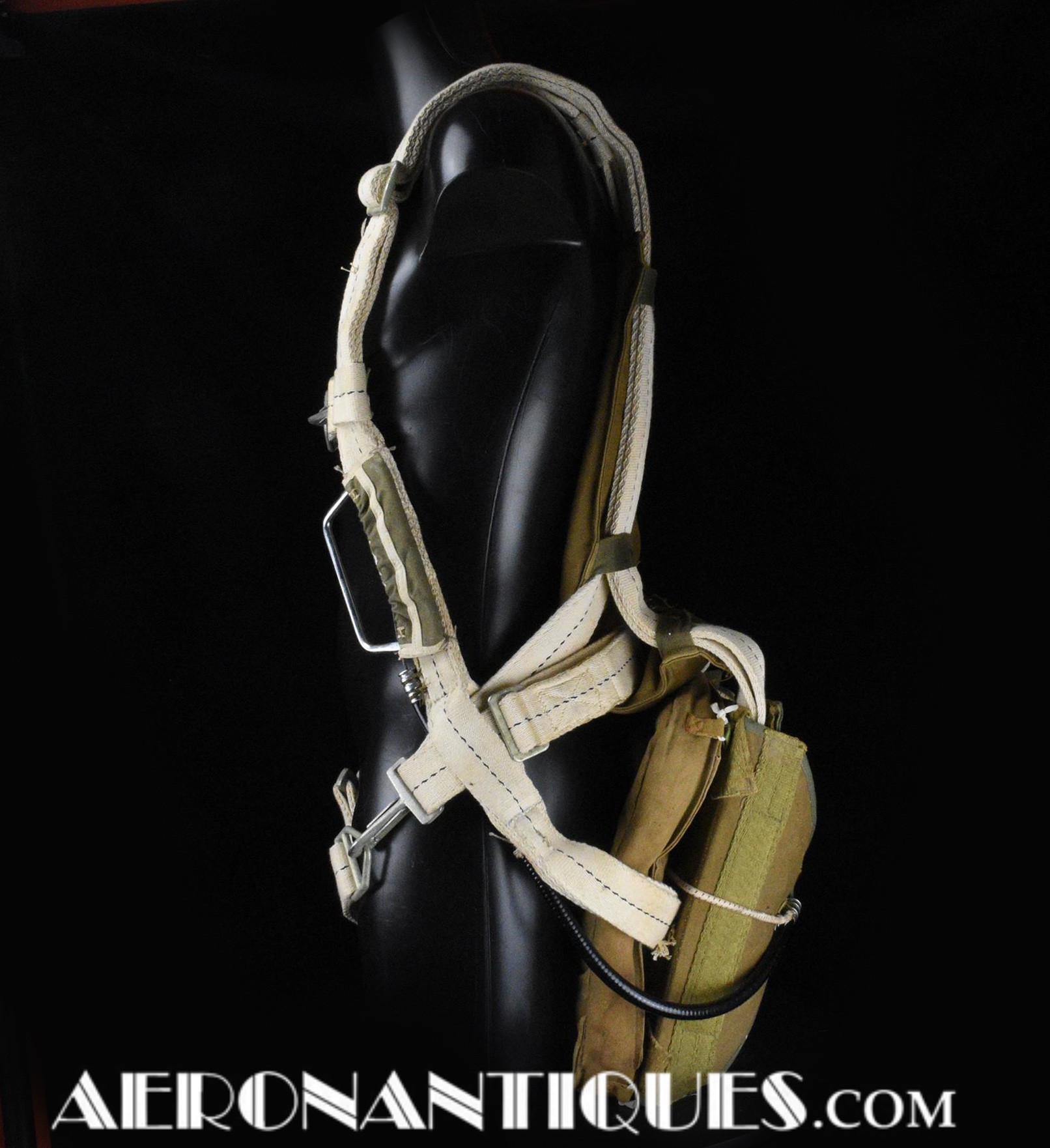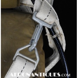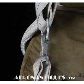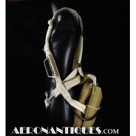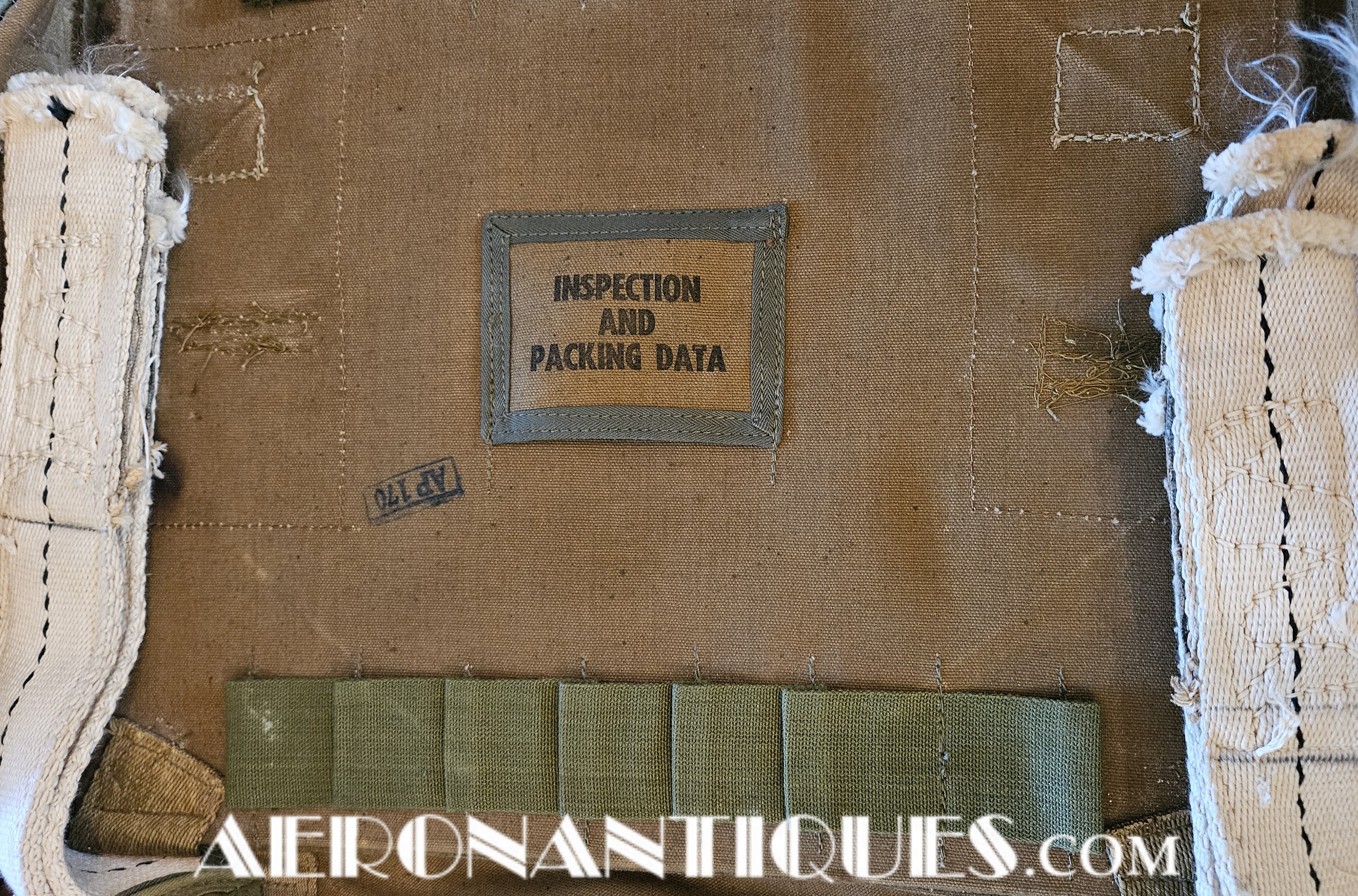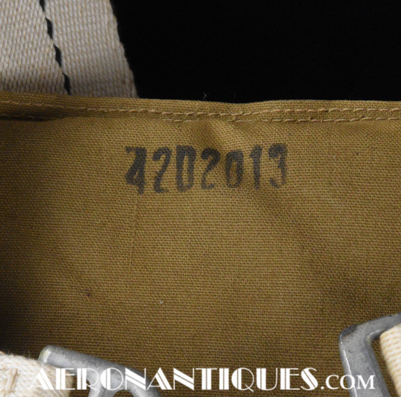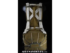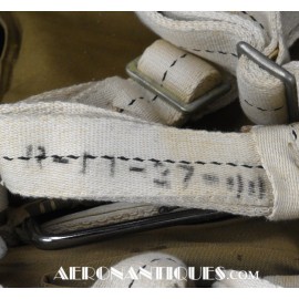 Circa 1942-43 US Army Air Force and Navy fighter or bomber pilot seat parachute and harness assembly type AN-6510. 42G2012 harness made by FASHION FROCKS. 1943 dated 42N2004-1 parachute pack (for 24 feet canopies) made by ATLANTIC PARACHUTE CORP. Type 42D2013 back pad. 47565-1 seat cushion dated 1942 made by STANDARD PARACHUTE CORP. NO CANOPY INSIDE. Typical WWII fighter pilot or C-47, B-17 pilots and co-pilots flying gear. The AN-6510 seat parahute has been produced from 1941 to 1943 before being superseded by the S-5 with Irving quick release buckle from 1944 on.