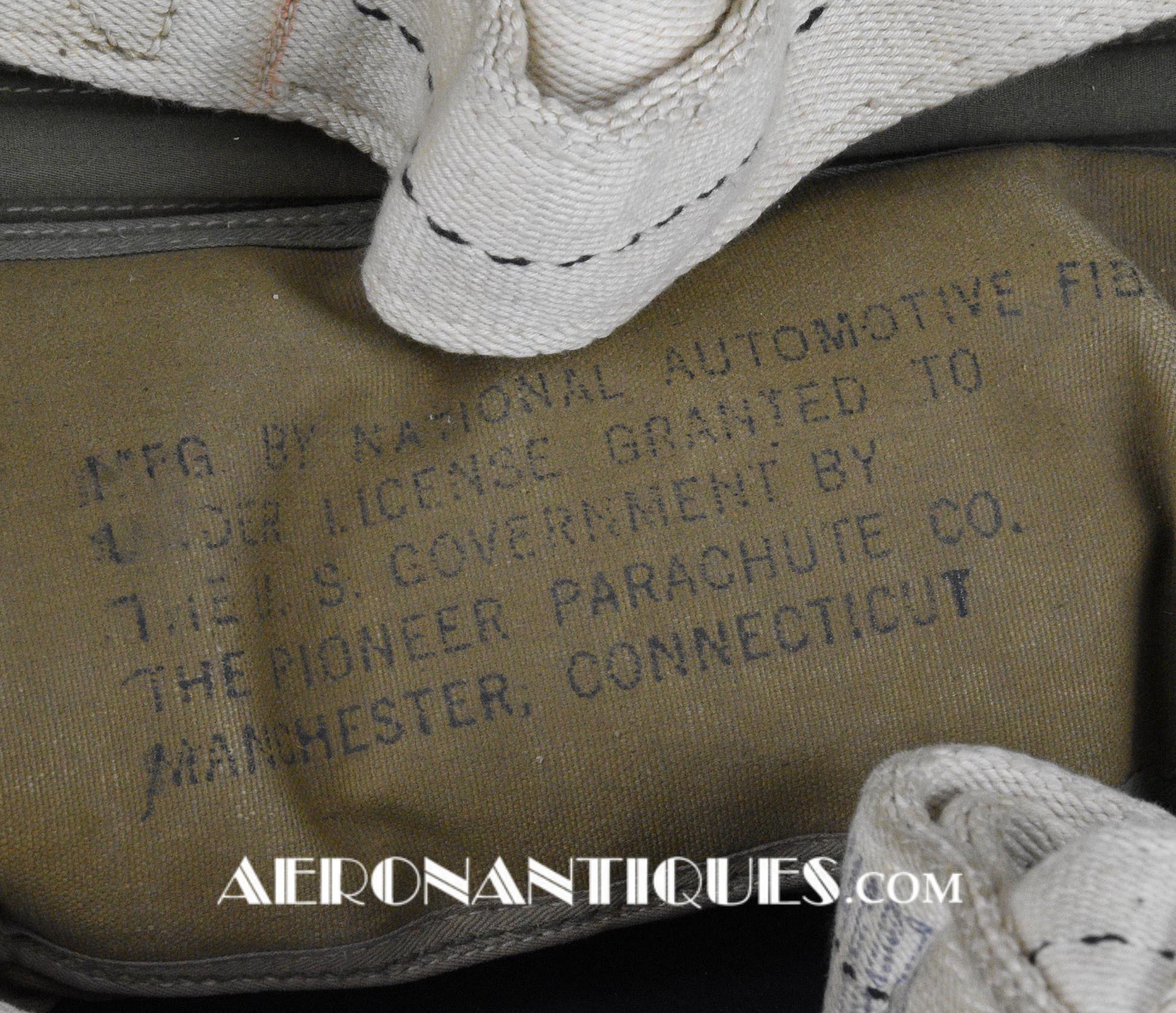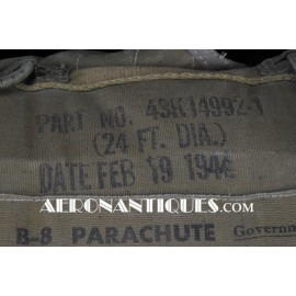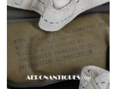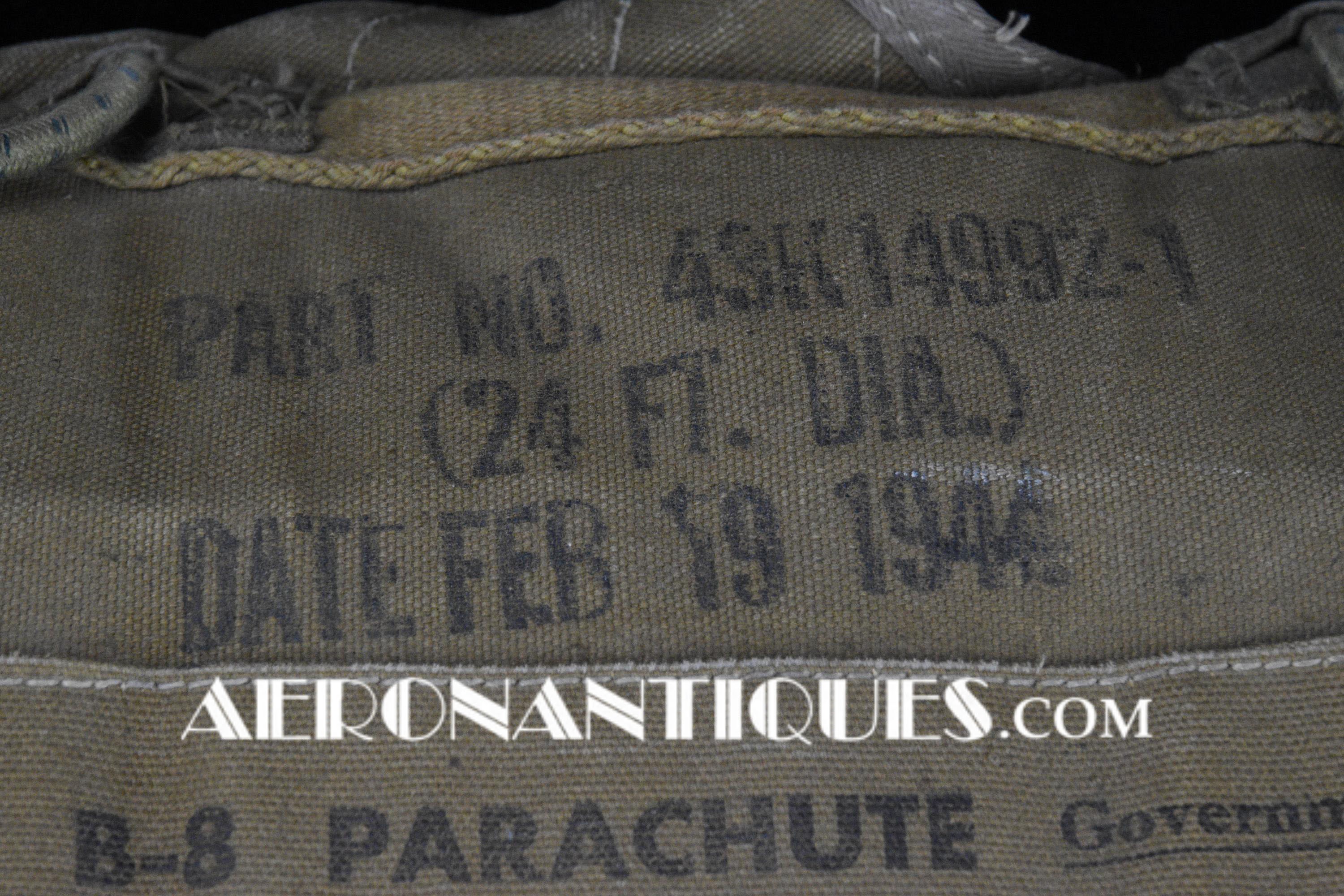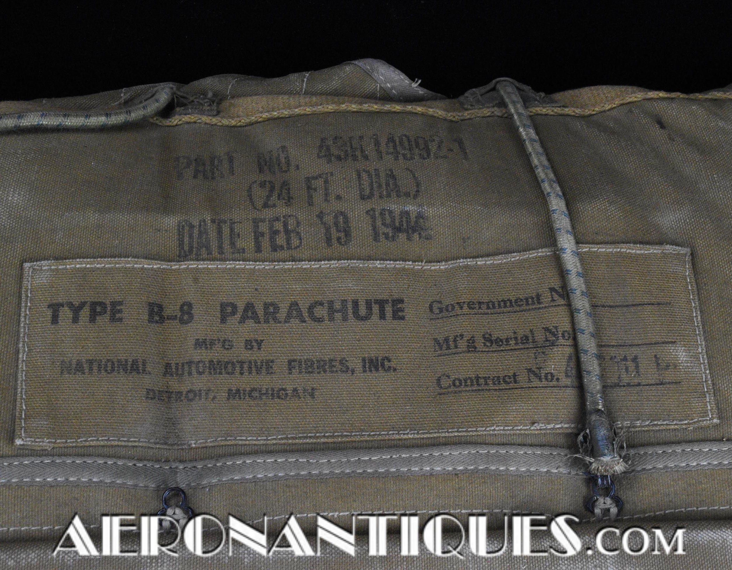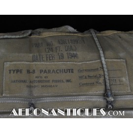 WWII US Army Air Force / Navy fighter or bomber pilot B-8 type back parachute, complete with canopy, lines, extractor and risers. Bayonet type harness made by NATIONAL AUTOMOTIVE FIBERS INC. DETROIT ,MICHIGAN, dated FEBRUARY 1944. Rare item, typical of 8th Air Force P-51 or P-47 fighter pilots. These parachutes were also issued to B-24 or B-26 pilots as can be seen on numerous period pics. Outstanding condition.