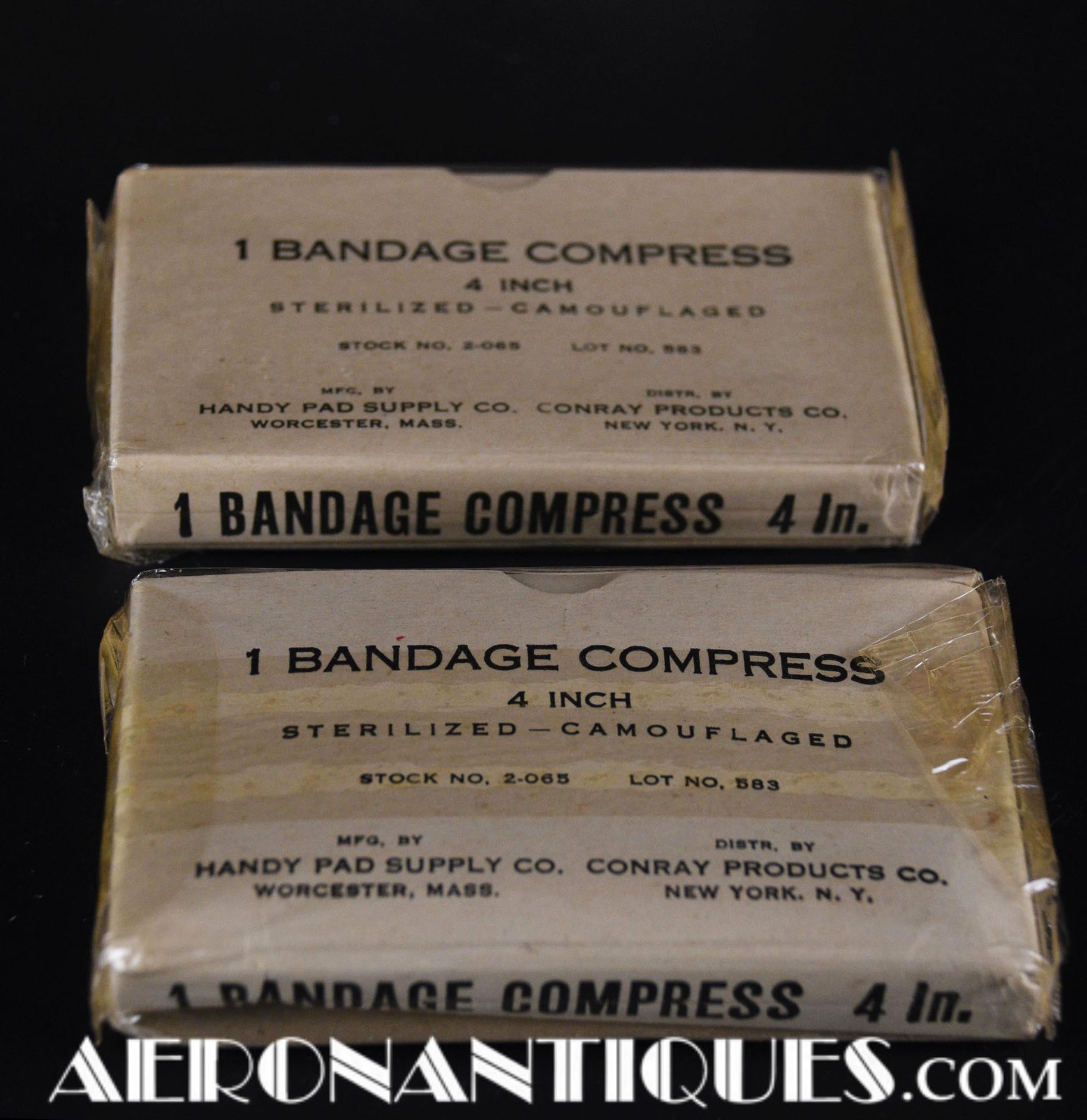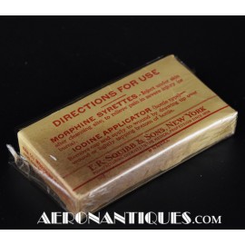 Very rare WWII US Army Air Force and Naval Aviation life rafts First-Aid kit. With outer box, inner box and waterproof wrapping. All original content still sealed. Containing 1 box with two burns treatment tubes (sealed), 1 box of 24 sulfadiazine tablets (sealed), one box of 5 sulfanilamide shaker packets (sealed), two boxes of bandages (sealed), one box of Iodine applicator and morphine syrettes (opened and syrettes are missing). These 1st Aid Kits were part of the US Navy Fighter and Bomber pilots individual and collective life rafts during WWII.