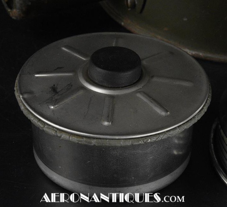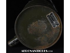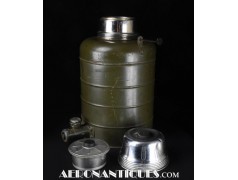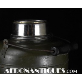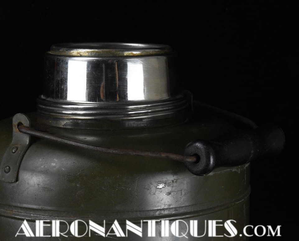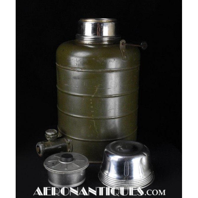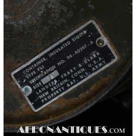 Large US Army Air Force regulation F-1 type insulated liquid container for bomber aircrews. 1 gallon capacity. US WWII by LANDERS FRARY & CLARK with matching data plate. Complete with carrying handle, tap, insulated cap and outer cup stopper. Heigth 37 cm. Diameter 22 cm. Very good original condition.