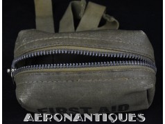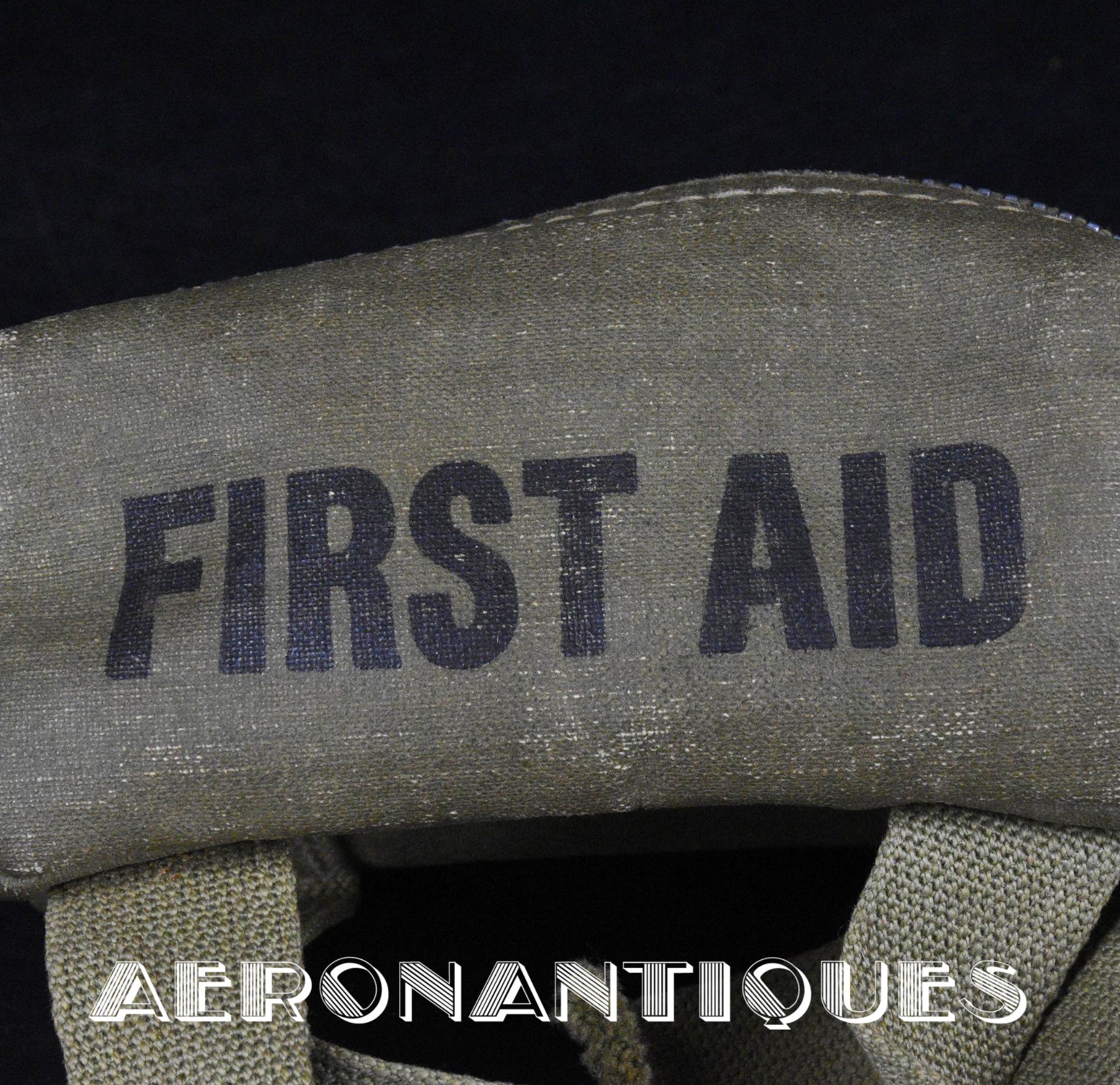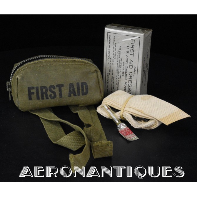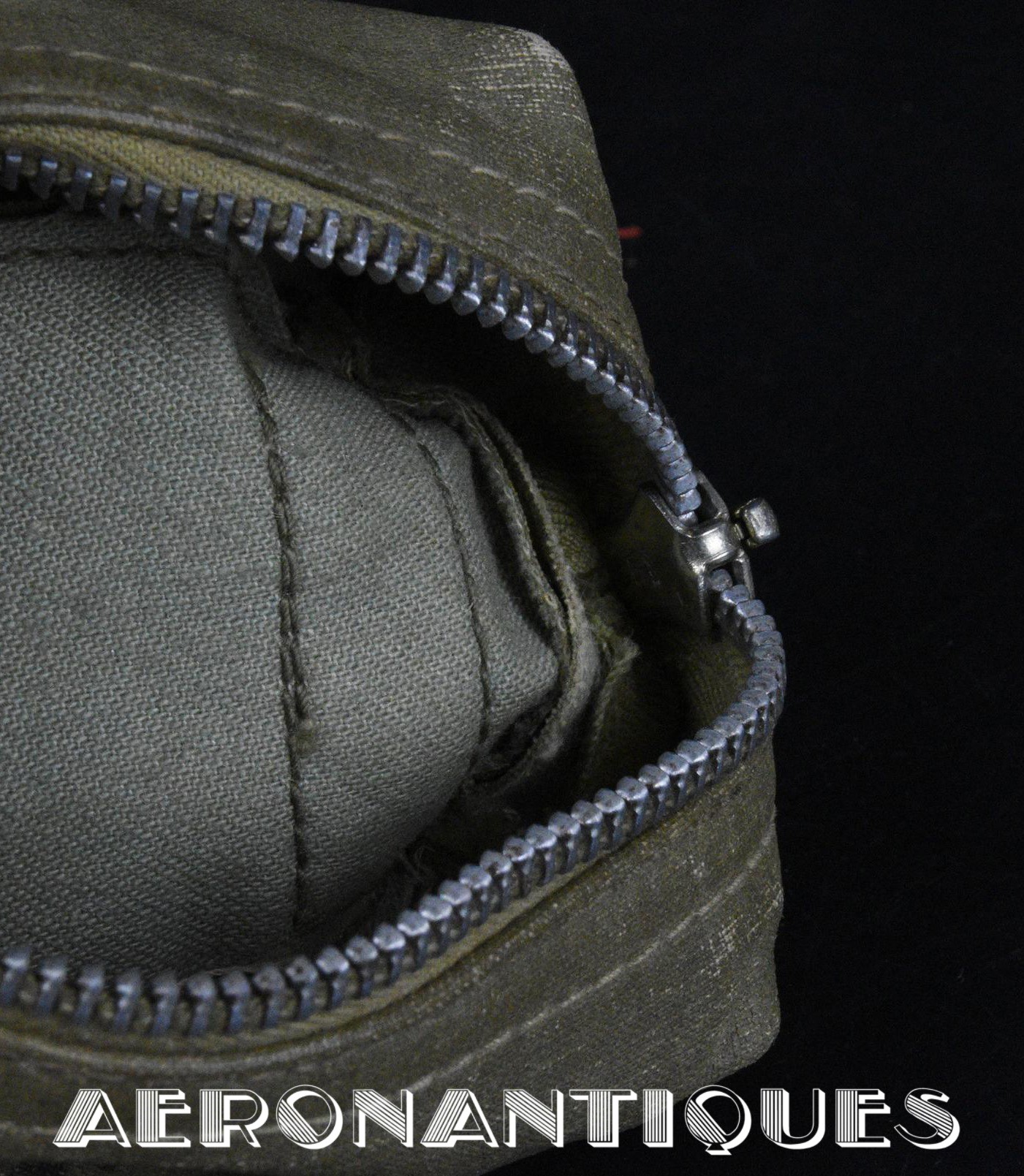 1942-43 1st pattern First-Aid Parachute Packet. Zippered waterproof coated canvas pouch, issued until 1944. This pouch contains one carlisle dressing, one tourniquet and one syrette. Functional "TALON" zipper. These kits were intended to be attached to the parachute harness with the ties. Outstanding condition. Original pouch and content