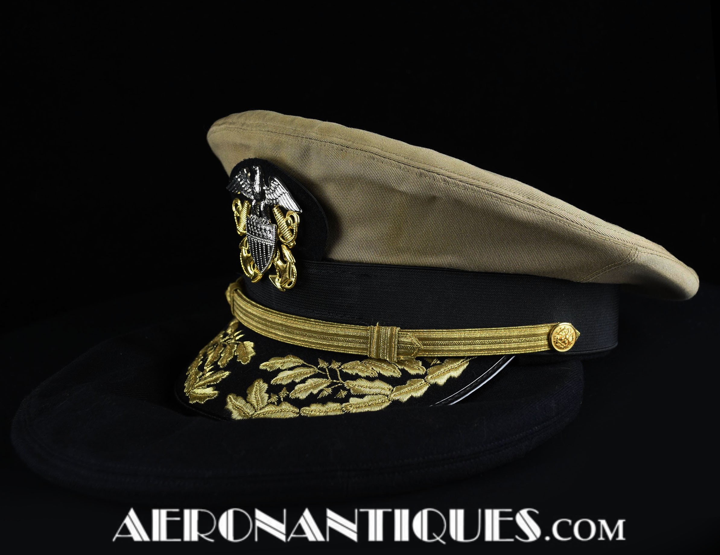US Navy Flag Officers visor hat with khaki twill and dark blue wool tops. Bullion scrambled eggs visor with double row of oak leaves and accorns (admiral, vice admiral, rear admiral). 1960/70's manufacture by BANCROFT. Outstanding quality. Size 7 (56 cm).