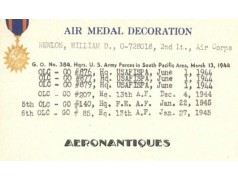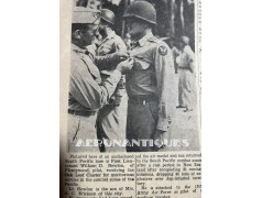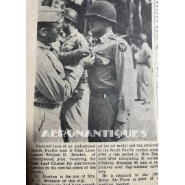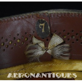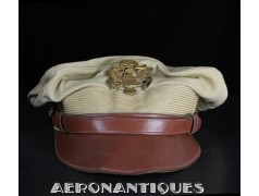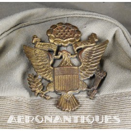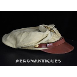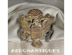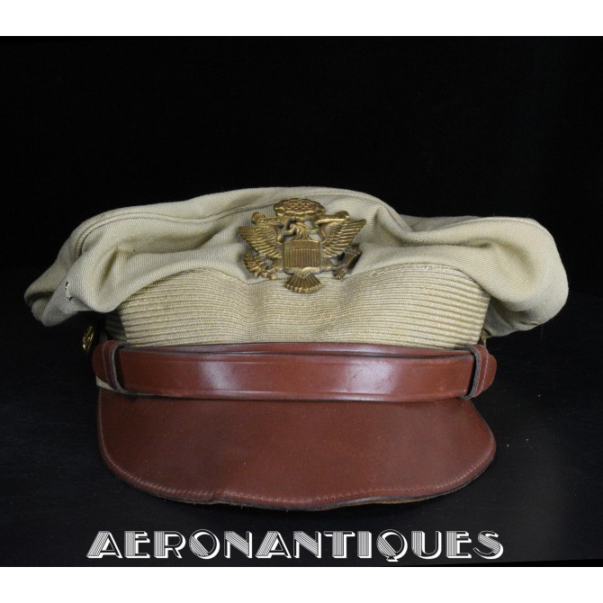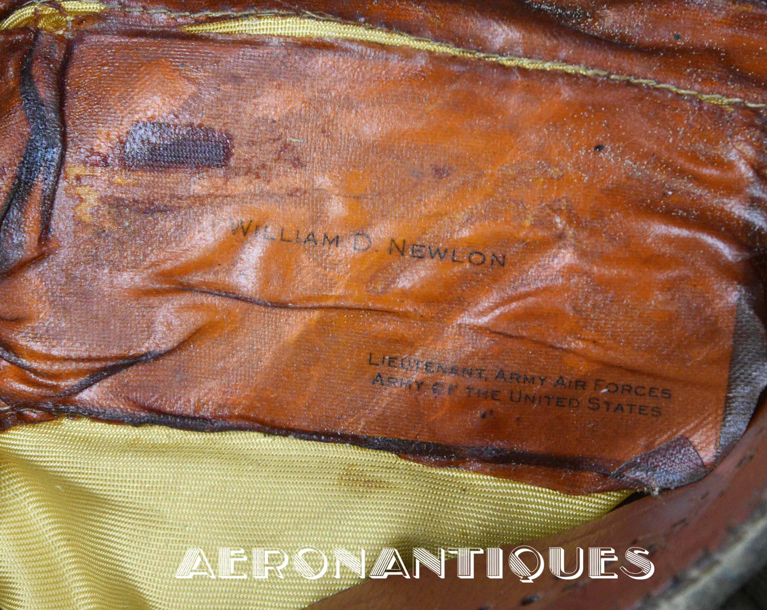 US Army Air Force summer officer's crusher cap aka 50 missions, lightweight construction with pliable frame and visor Named to Lt. William D. Newlon, pilot of the B-25 "Thor, God of Thunder!" with the 42nd Bombardment Group, 13th Air Force in the Pacific. He received the Air Medal 30 times (6 oak leaves clusters). Tan leather chin strap and visor. Gilt brass eagle with curved wings. Size 7. Sunglasses and earphones are not included. Very nice shape and patina with a few holes and general wear.