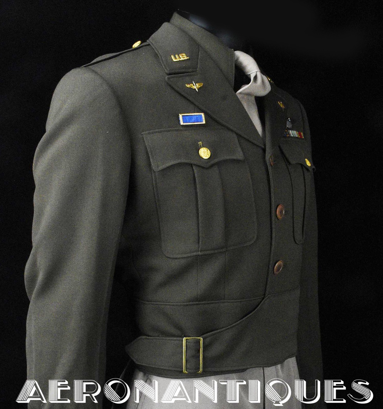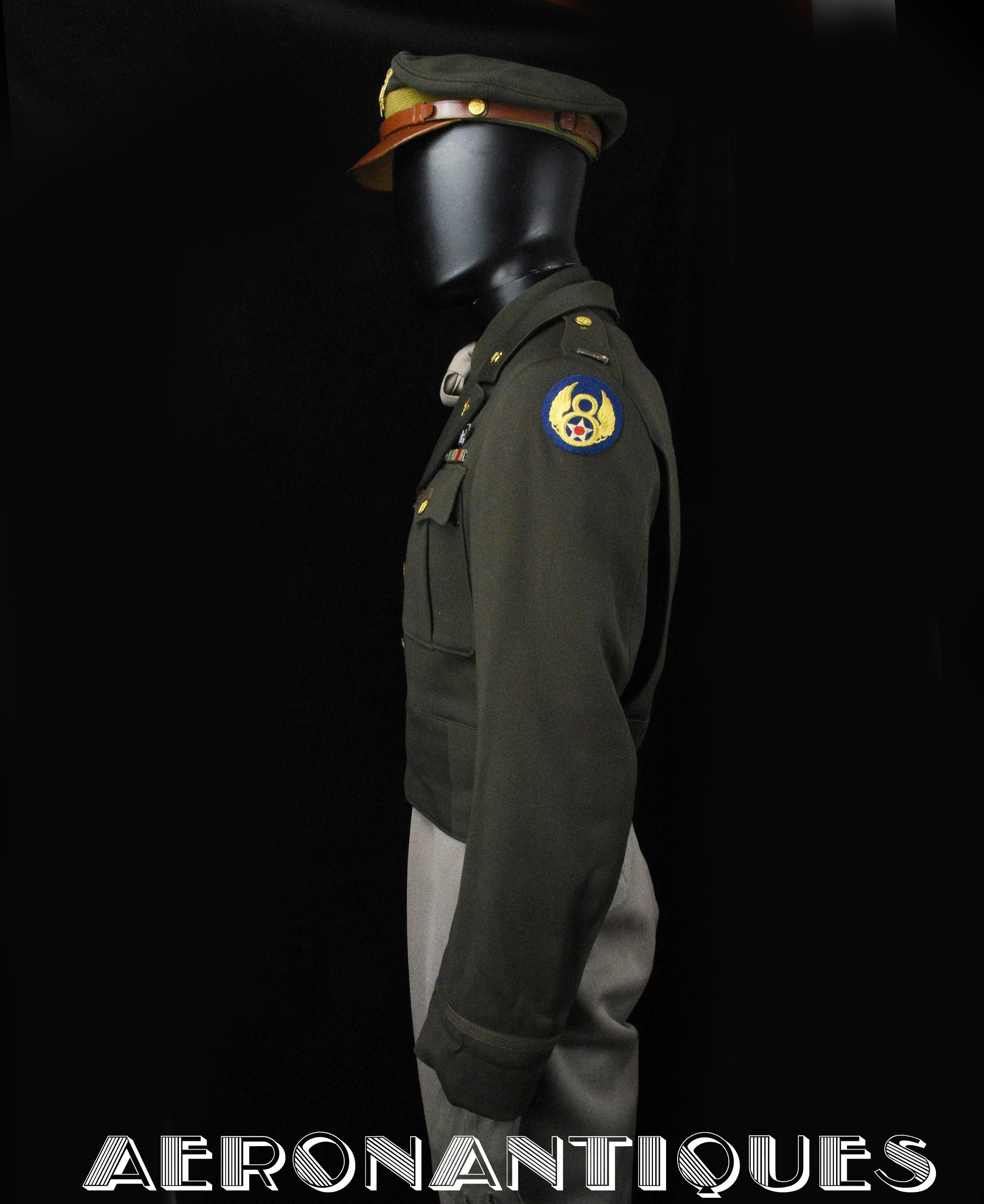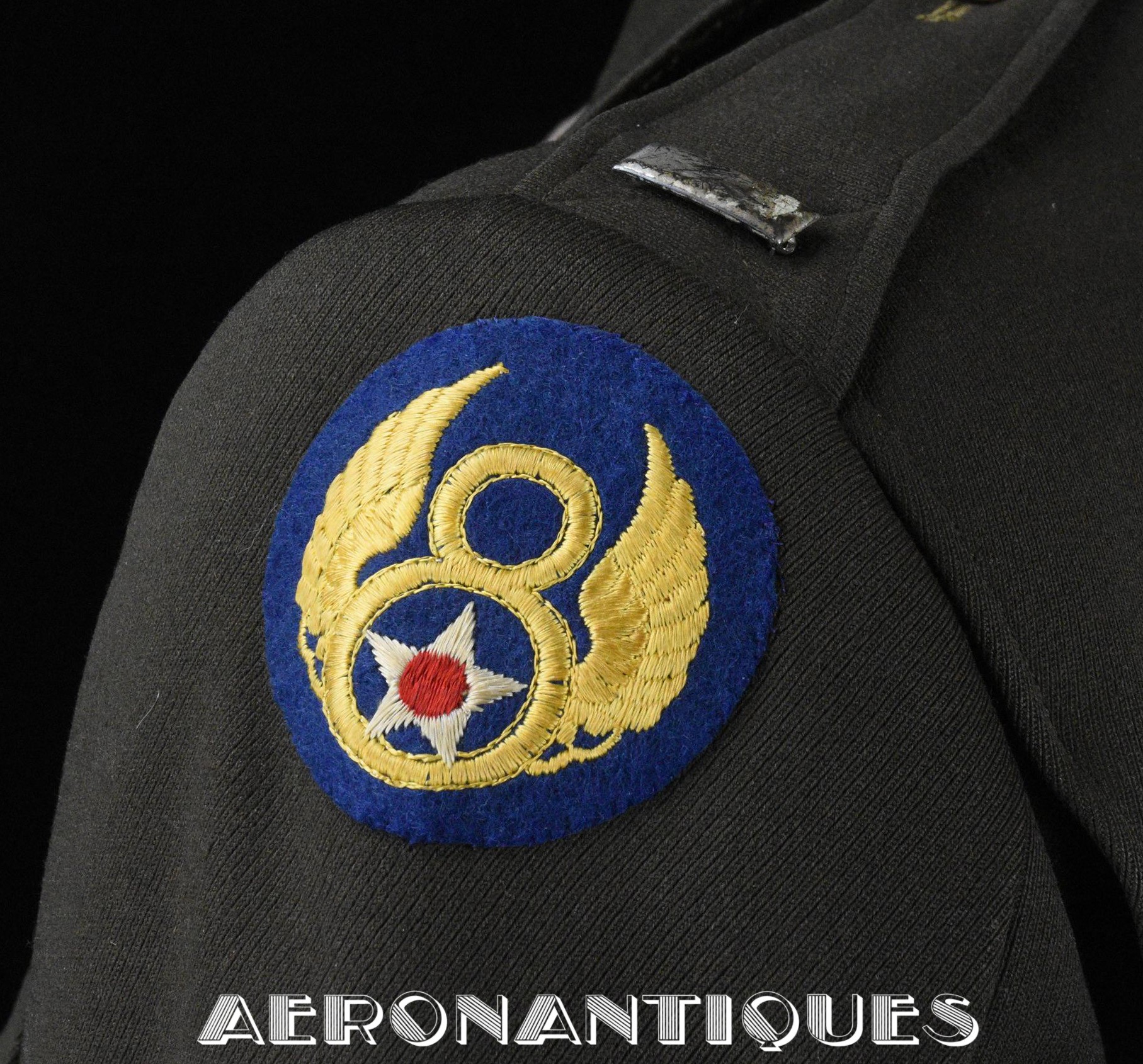 Army Air Force pilot's jacket, a tailored modification of a shortened regulation service jacket, size 38 LONG, dated 1942. British made embroidered cotton 8th Air Force shoulder patch on wool backing. US made silver pilot's wings with pin attachment. 1st Lt rank insignias on shoulder straps. Winged propellers and "U.S." officer's insignia, early models attachment fasteners. Distinguished Unit Citation ribbon above right breast pocket. Ribbons for the Air Medal with three silver oak leaves (awarded 15 additional times), EAME (Europe, Africa, Middle East campaigns) and WWII Victory Medal above the right pocket.