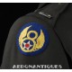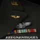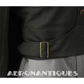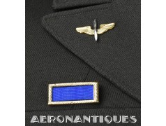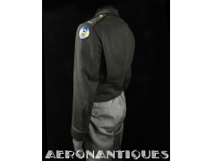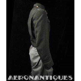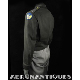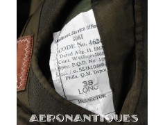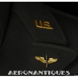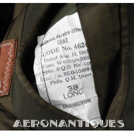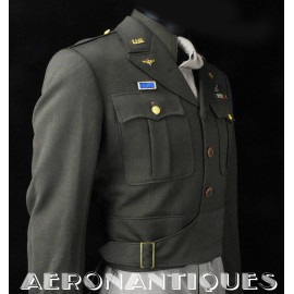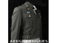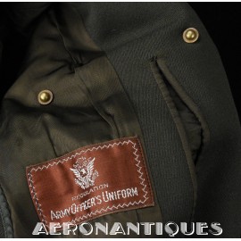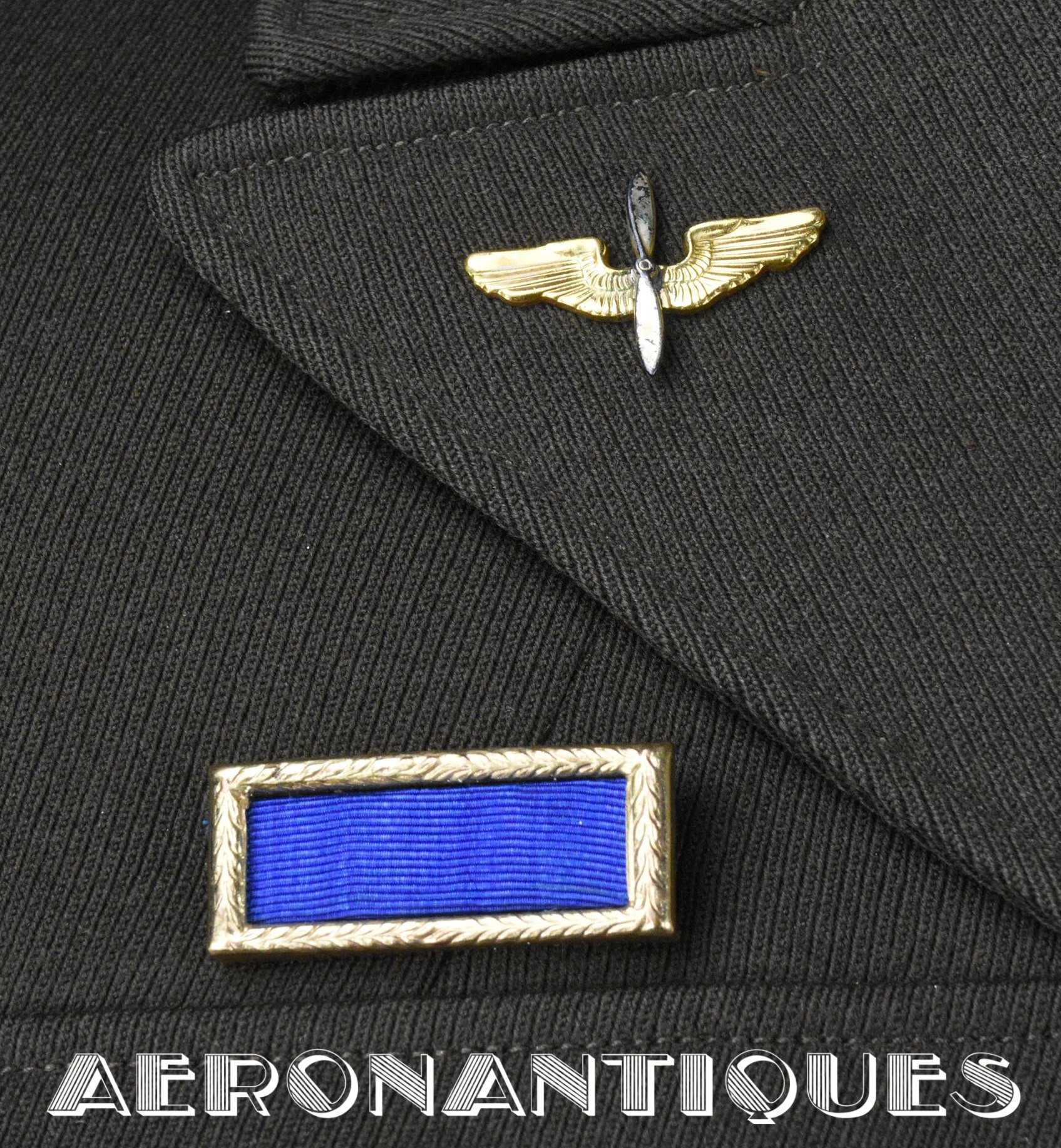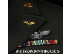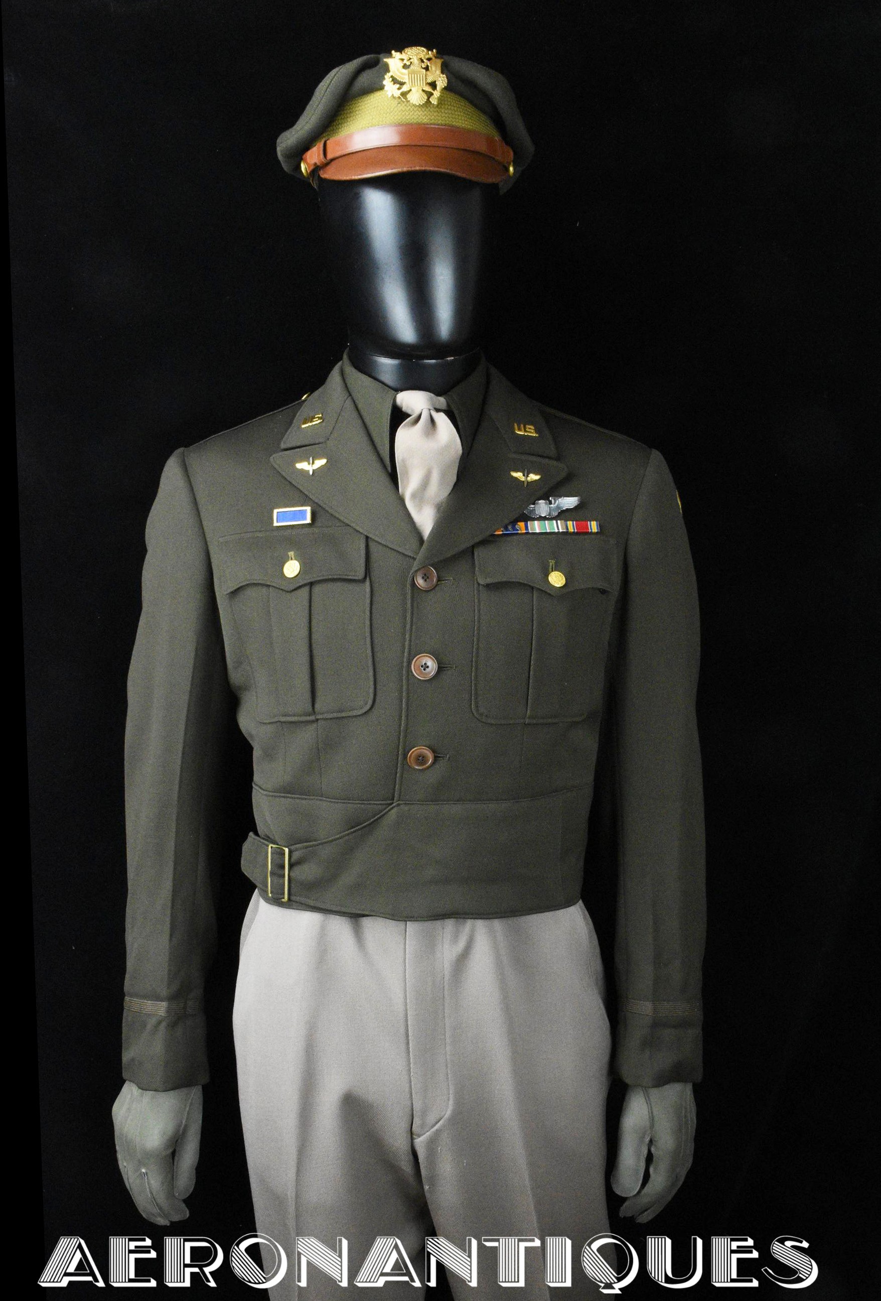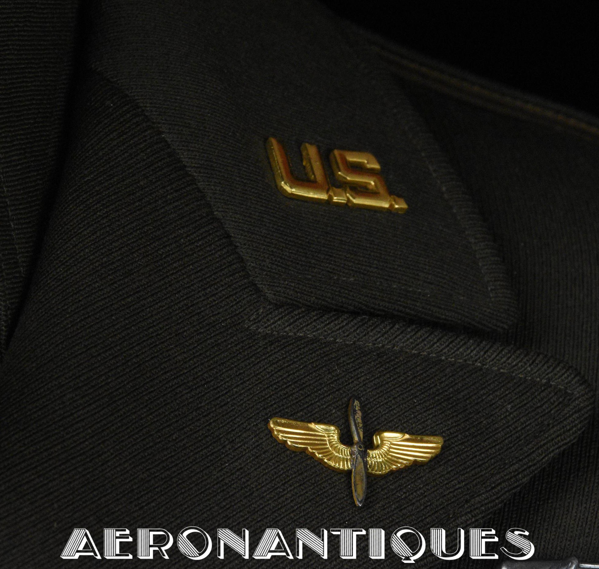 Army Air Force pilot's jacket, a tailored modification of a shortened regulation service jacket, size 38 LONG, dated 1942. British made embroidered cotton 8th Air Force shoulder patch on wool backing. US made silver pilot's wings with pin attachment. 1st Lt rank insignias on shoulder straps. Winged propellers and "U.S." officer's insignia, early models attachment fasteners. Distinguished Unit Citation ribbon above right breast pocket. Ribbons for the Air Medal with three silver oak leaves (awarded 15 additional times), EAME (Europe, Africa, Middle East campaigns) and WWII Victory Medal above the right pocket.