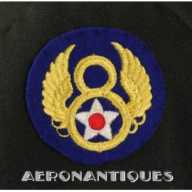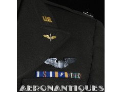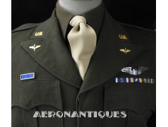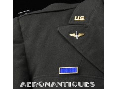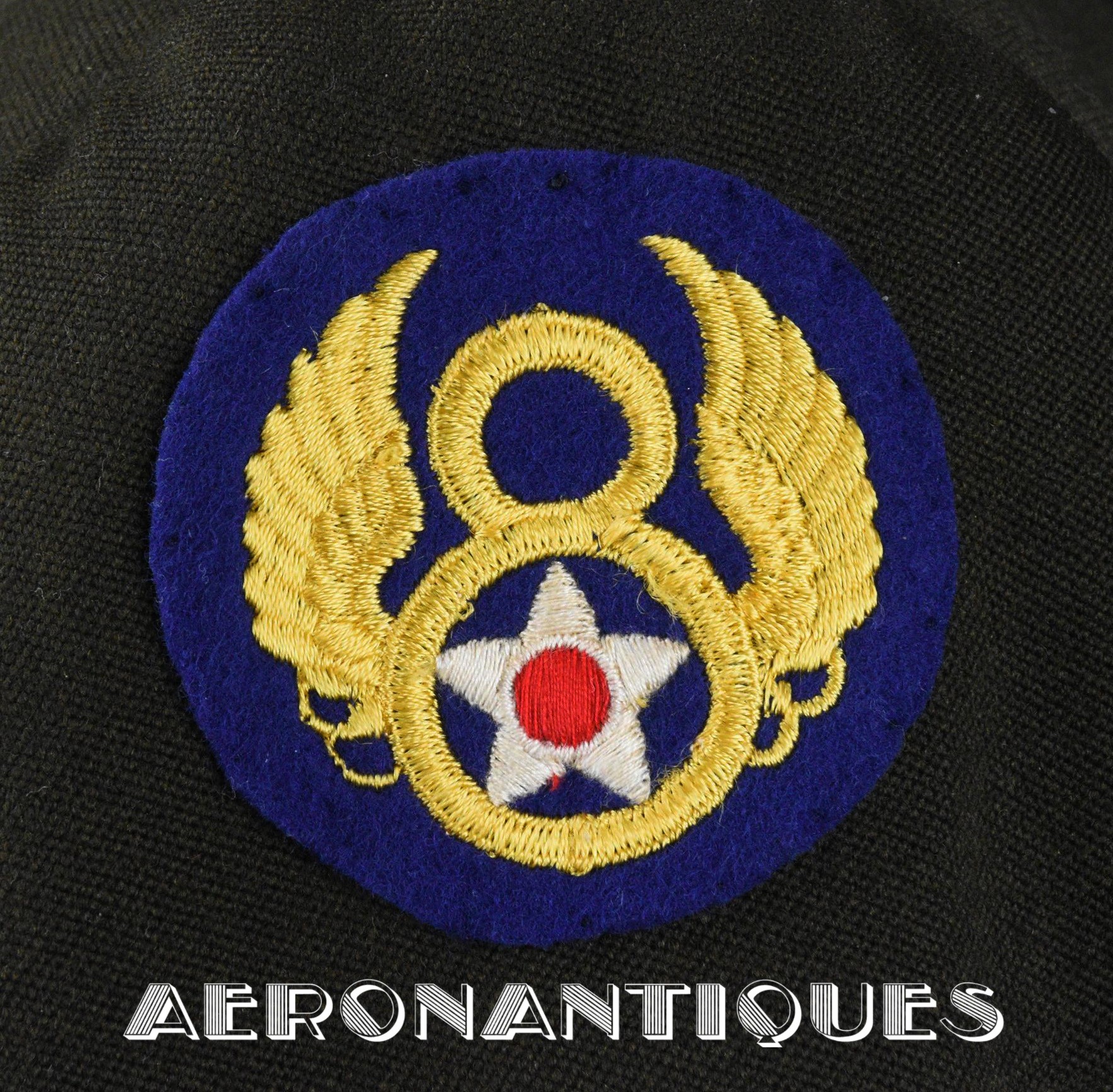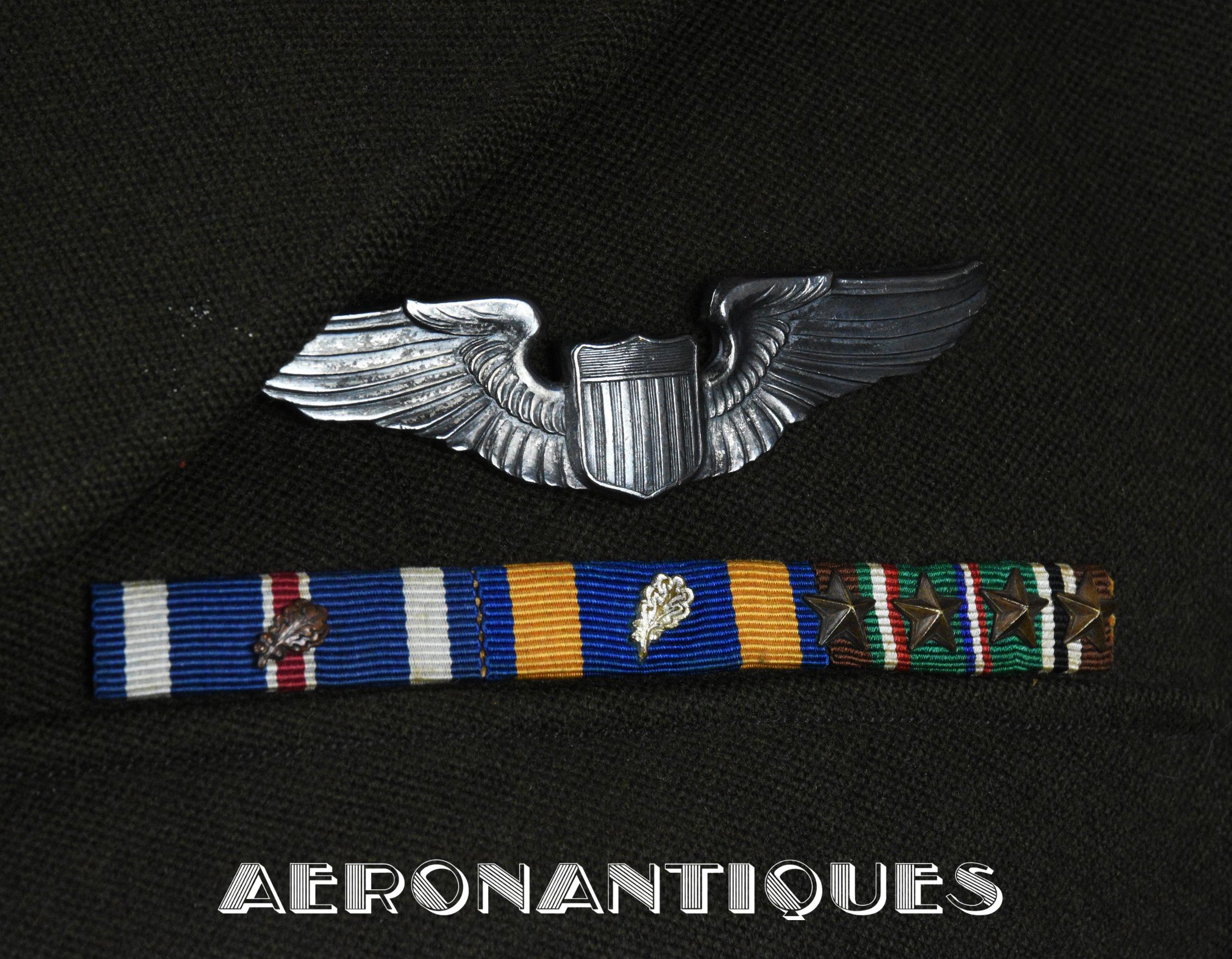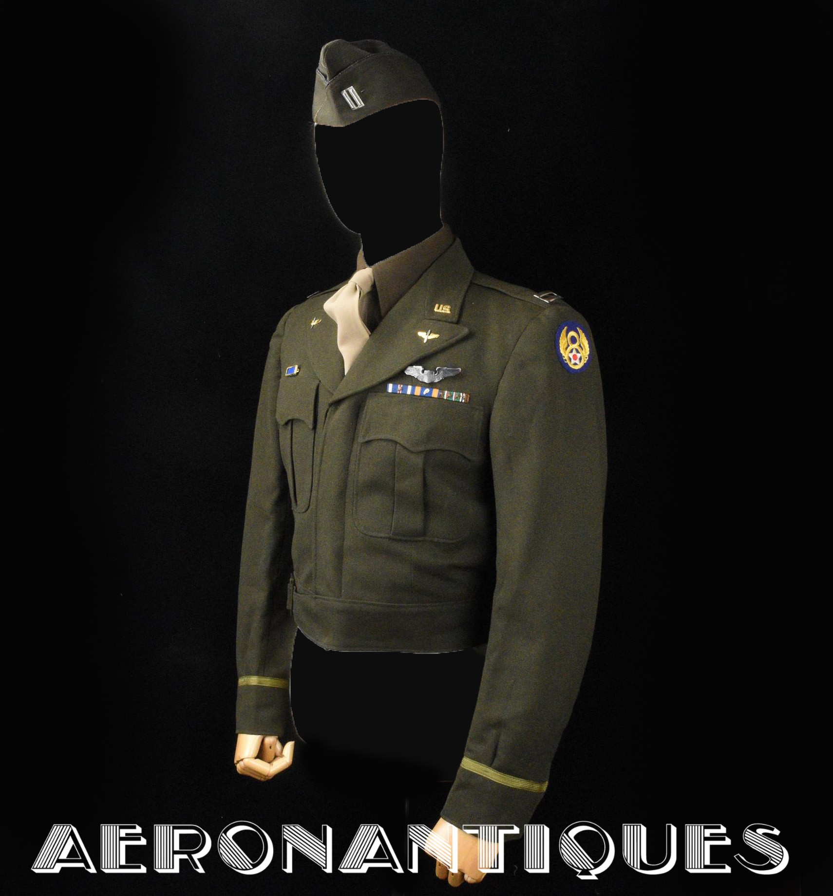 British-made Ike jacket belonging to a 8th US Army Air Force Captain. The jacket is London tailor-made of Barathea wool with red lining, characteristic of fighter pilots who flew combat missions and achieved several victories. It features an 8th Air Force shoulder patch, also British-made, in embroidered cotton on wool backing. The sterling pilot's wings are US-made. Ribbons for the Distinguished Flying Cross with a bronze oak leaf, the Air Medal with a silver oak leaf, and the EAME Campaign Medal with 4 battle stars (British-made) are also included. Above the right pocket is the British-made Presidential Unit Citation awarded to the unit in the summer of 1944. US and Army Air Force officer's winged propellers insignias on lapels. Rank shoulder insignias are British-made by Gaunt. A very fine piece of clothing with high-quality insignias. Hat, shirt, and tie are not included. B-17 pilot John C. Walter, of the 8th Air Force, mentions this tailor in his book "MY WAR".