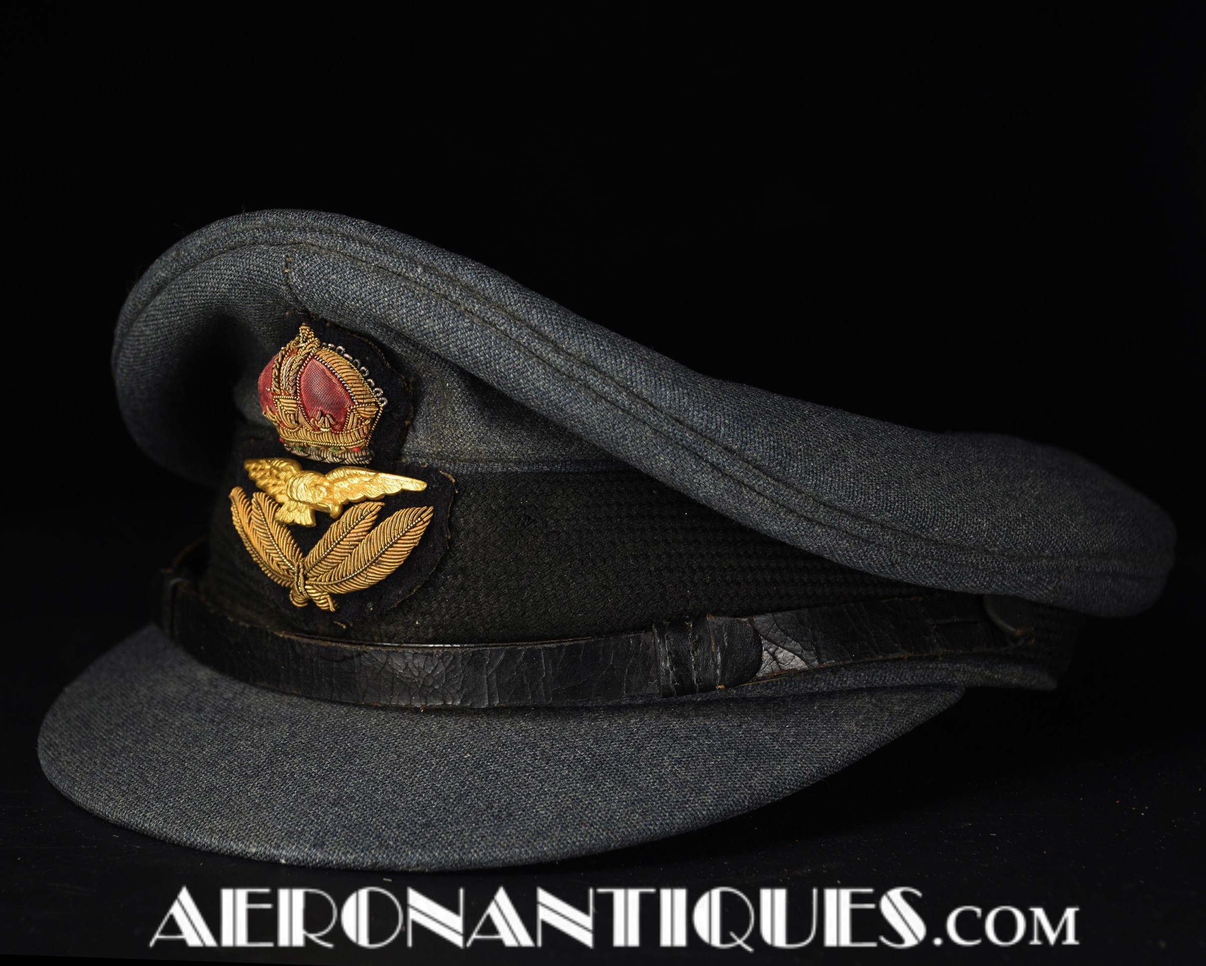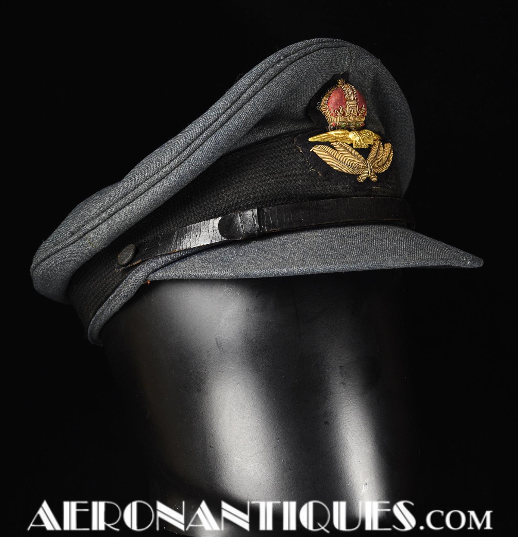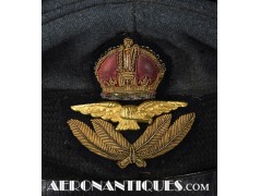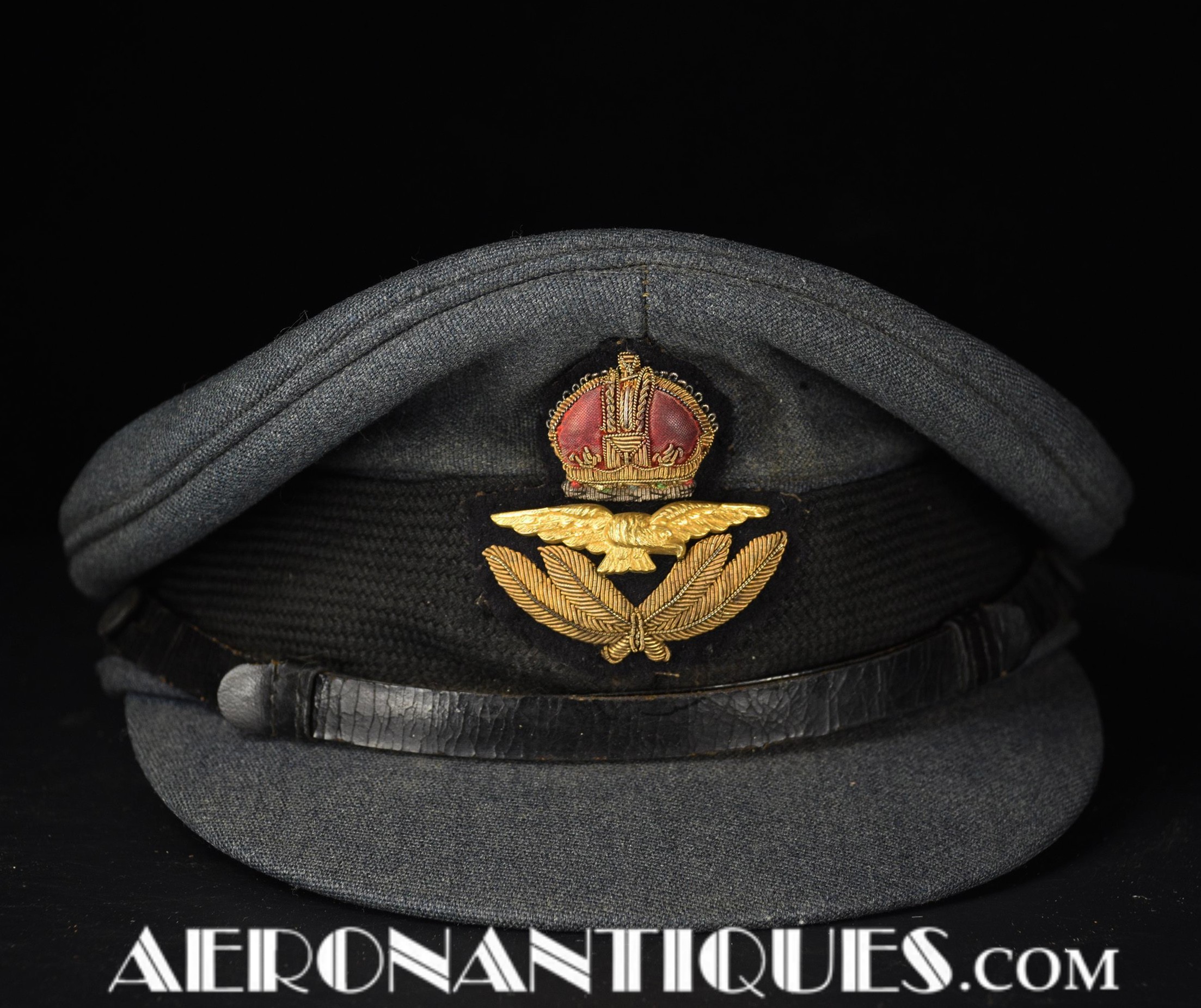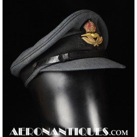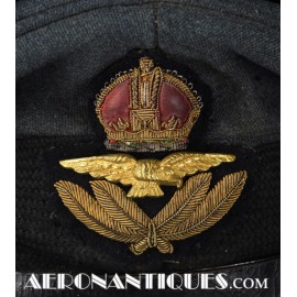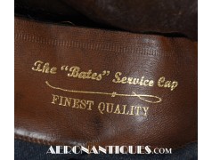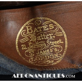 Casquette de service d’officier de la Royal Air Force, du grade de Pilot Officer à Wing Commander. Fabrication du fameux chapelier BATES de Jermyn Street à Londres. Laine Barathea. Couronne et lauriers en cannetille. Aigle en laiton doré. Jugulaire en cuir verni. Modèle WWII avec couronne GV/VI. Très belle patine, idéale pour constituer un mannequin de pilote. Tour de tête 56/57 cm.