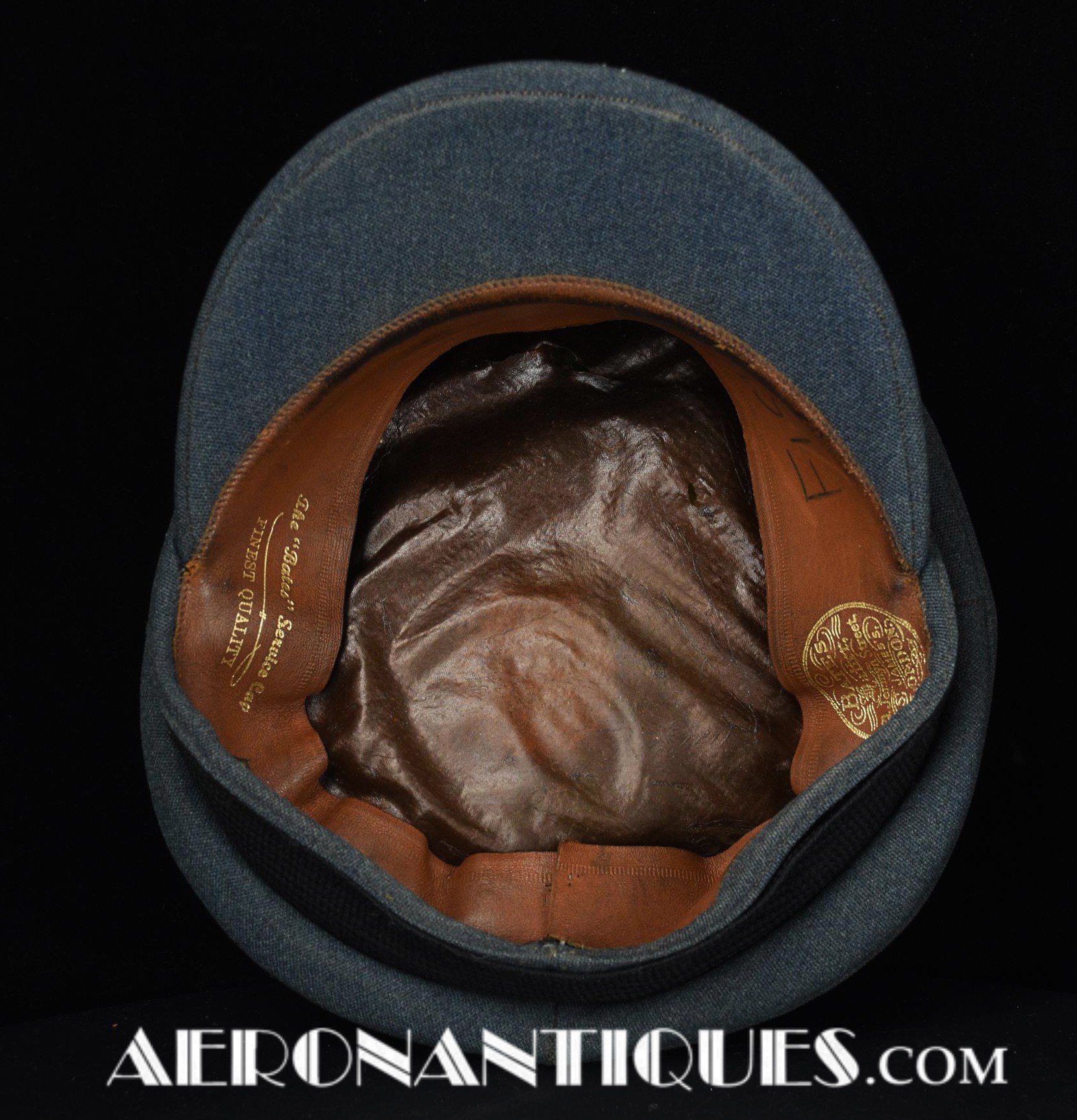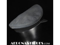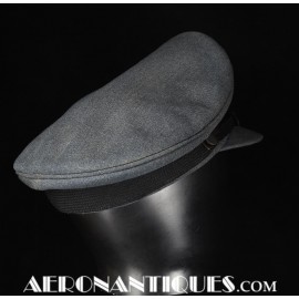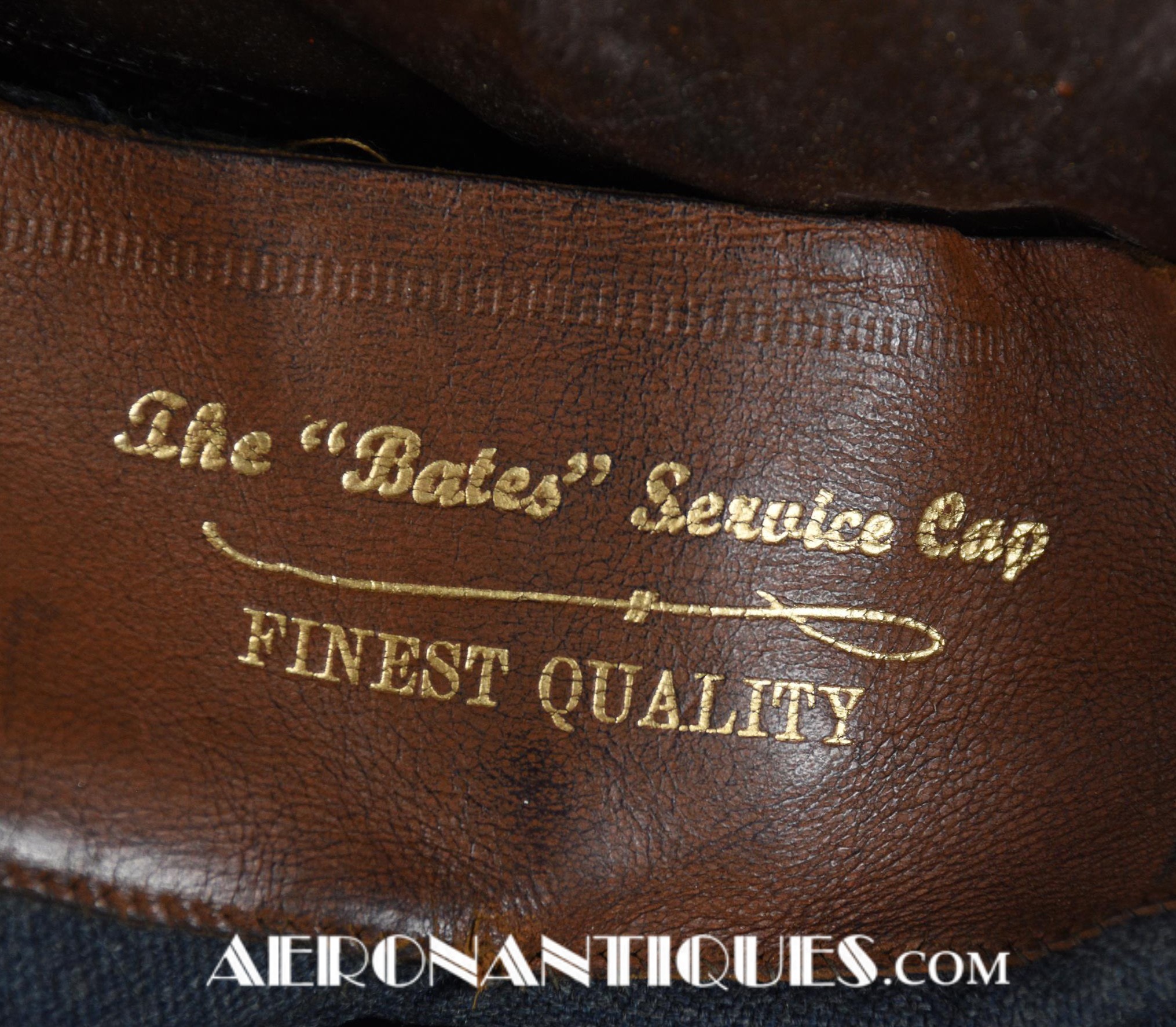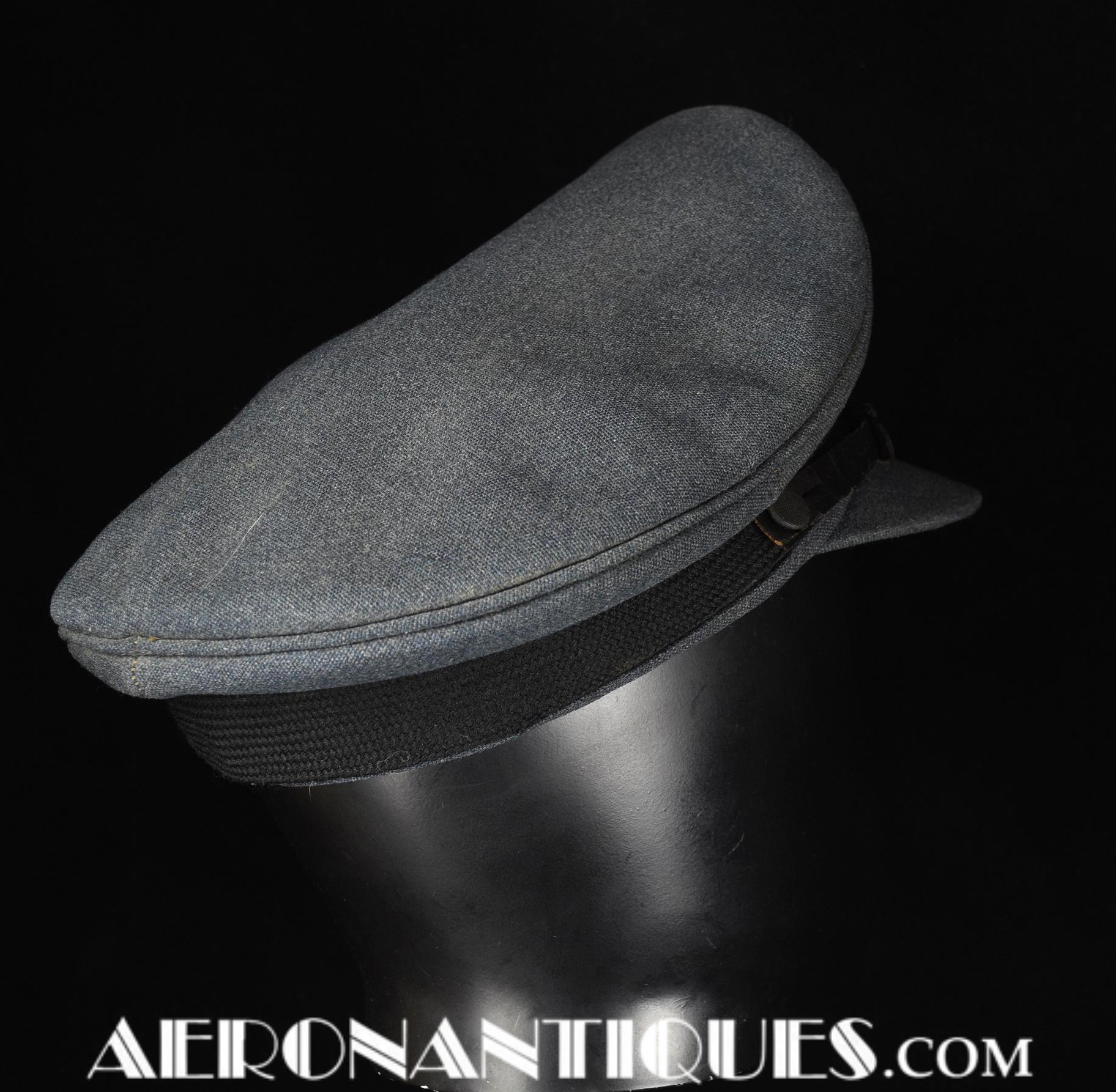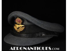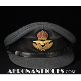 Casquette de service d’officier de la Royal Air Force, du grade de Pilot Officer à Wing Commander. Fabrication du fameux chapelier BATES de Jermyn Street à Londres. Laine Barathea. Couronne et lauriers en cannetille. Aigle en laiton doré. Jugulaire en cuir verni. Modèle WWII avec couronne GV/VI. Très belle patine, idéale pour constituer un mannequin de pilote. Tour de tête 56/57 cm.