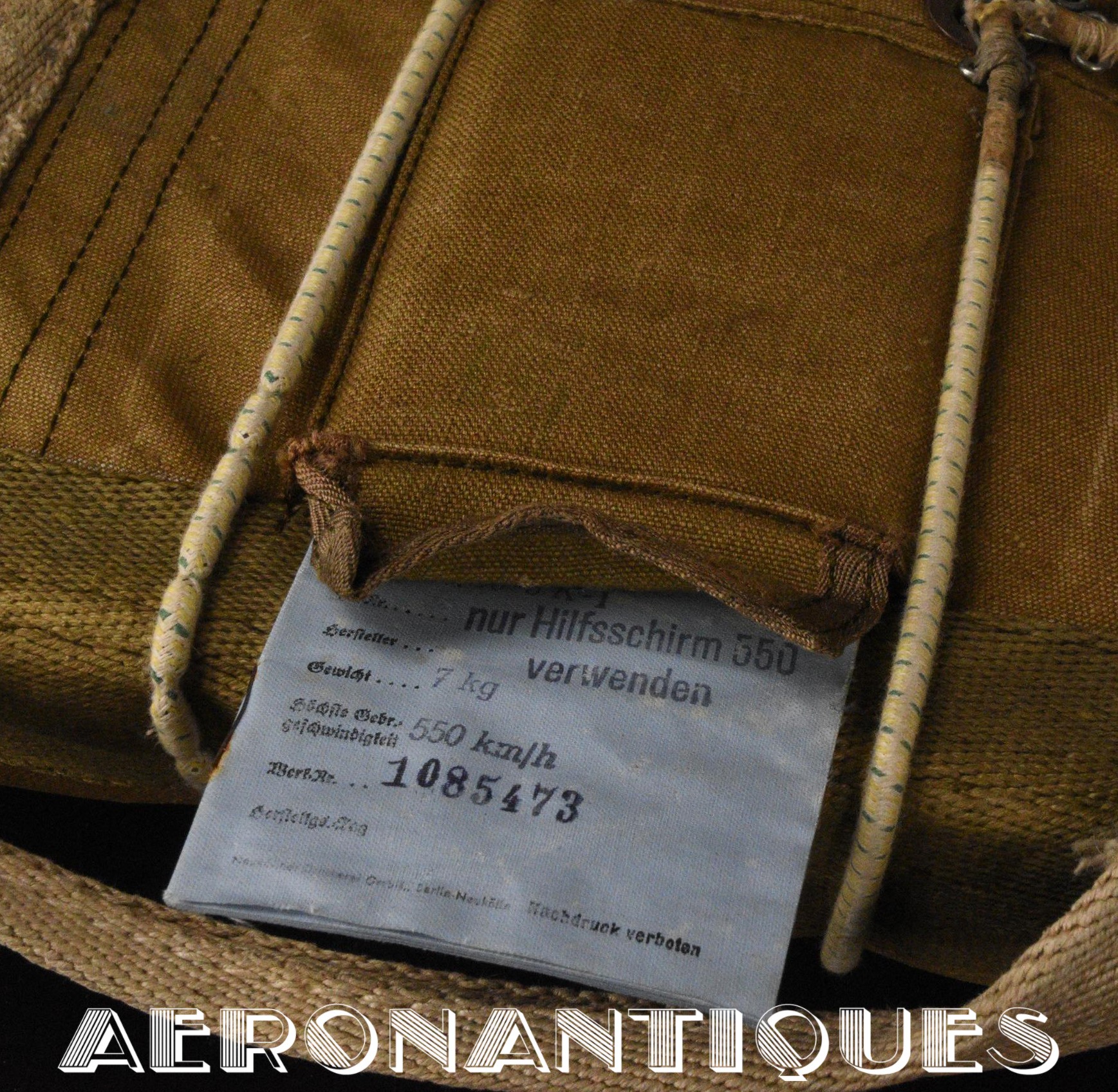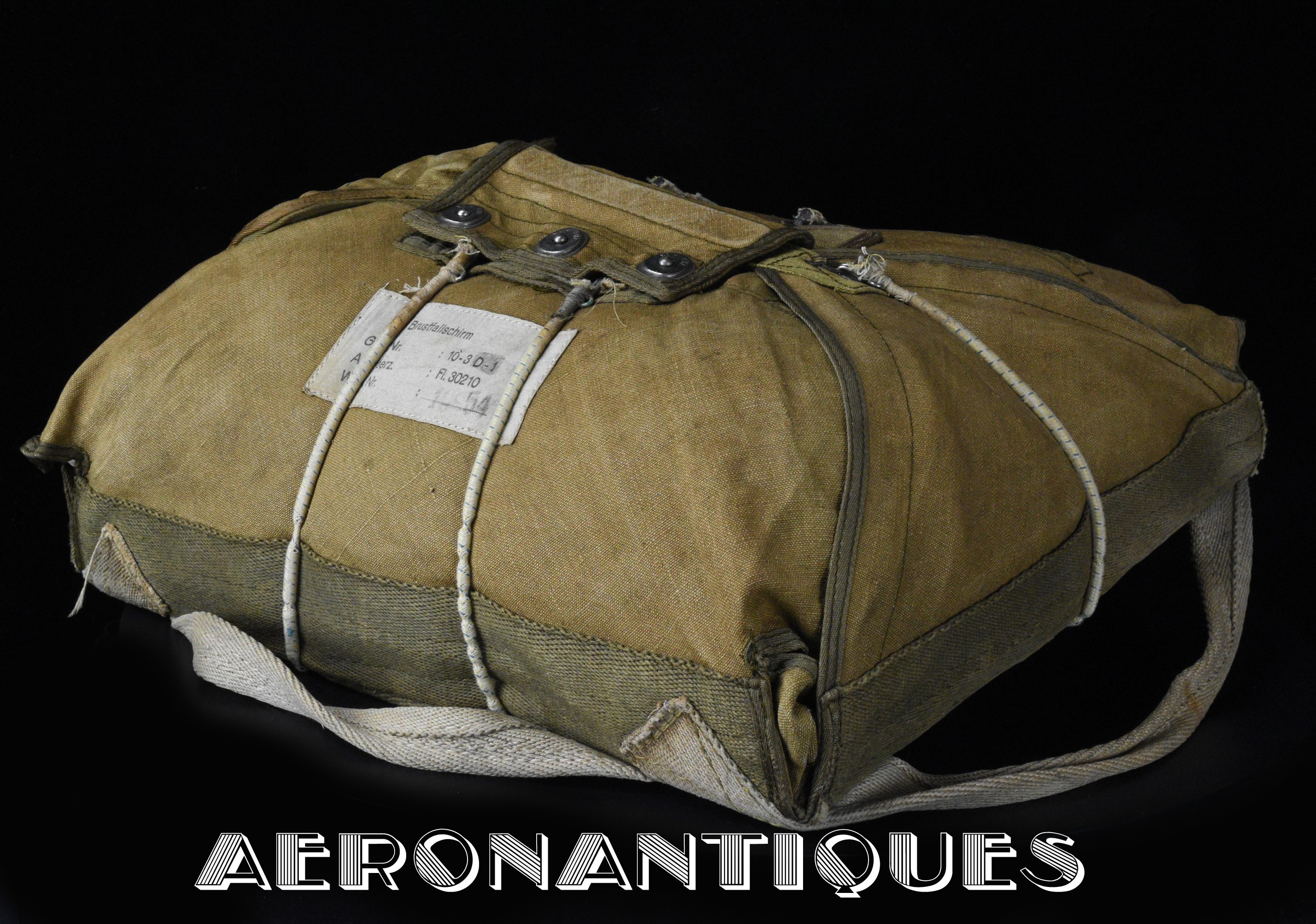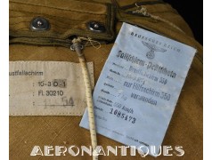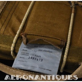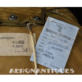 Exceptionnel parachute type Fl-30210 pour équipages de bombardier de la Luftwaffe avec harnais, coussin dorsal, enveloppe et voilure d'origine. Fabrication de 1942/43. Élastiques d'origine. la boucle a sa clé de sécurité. Tous les tampons correspondent aux numéros. Dernière vérification en décembre 1944. Carnet d'entretien correspondant au numéro. Pièce extrêmement rare, particulièrement dans cet état.