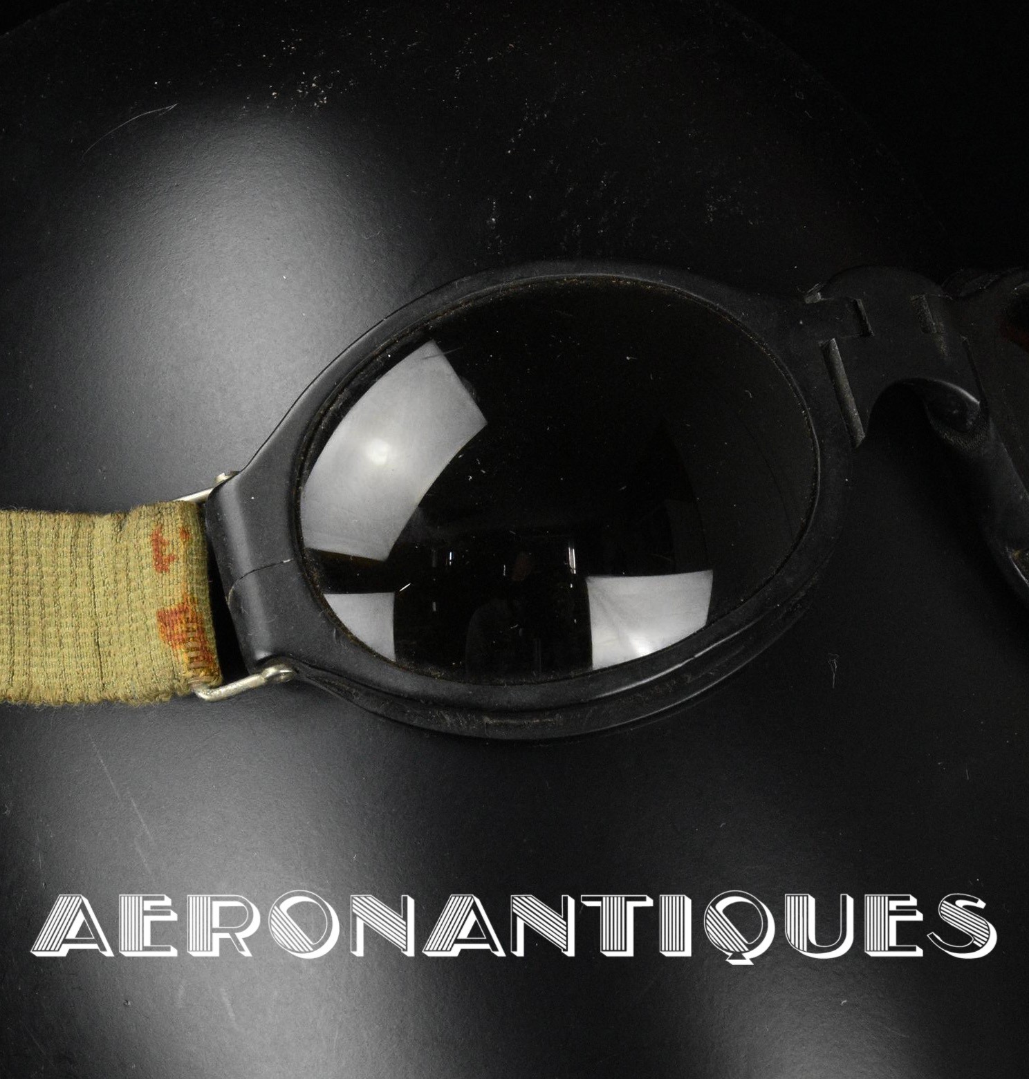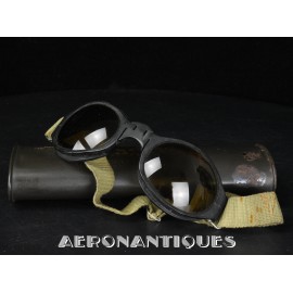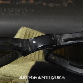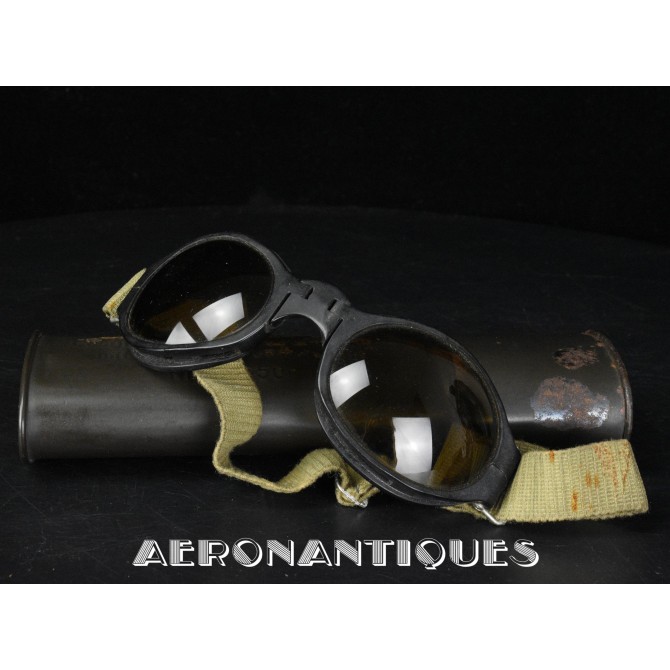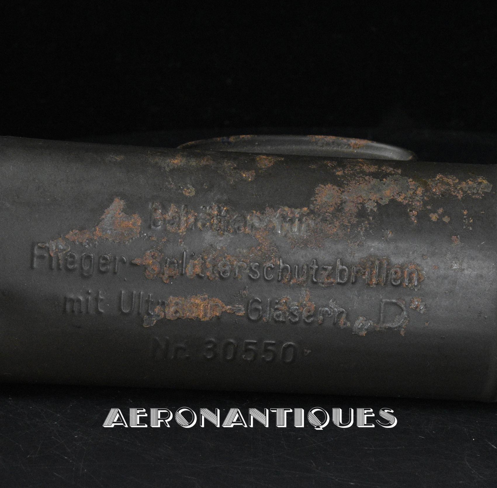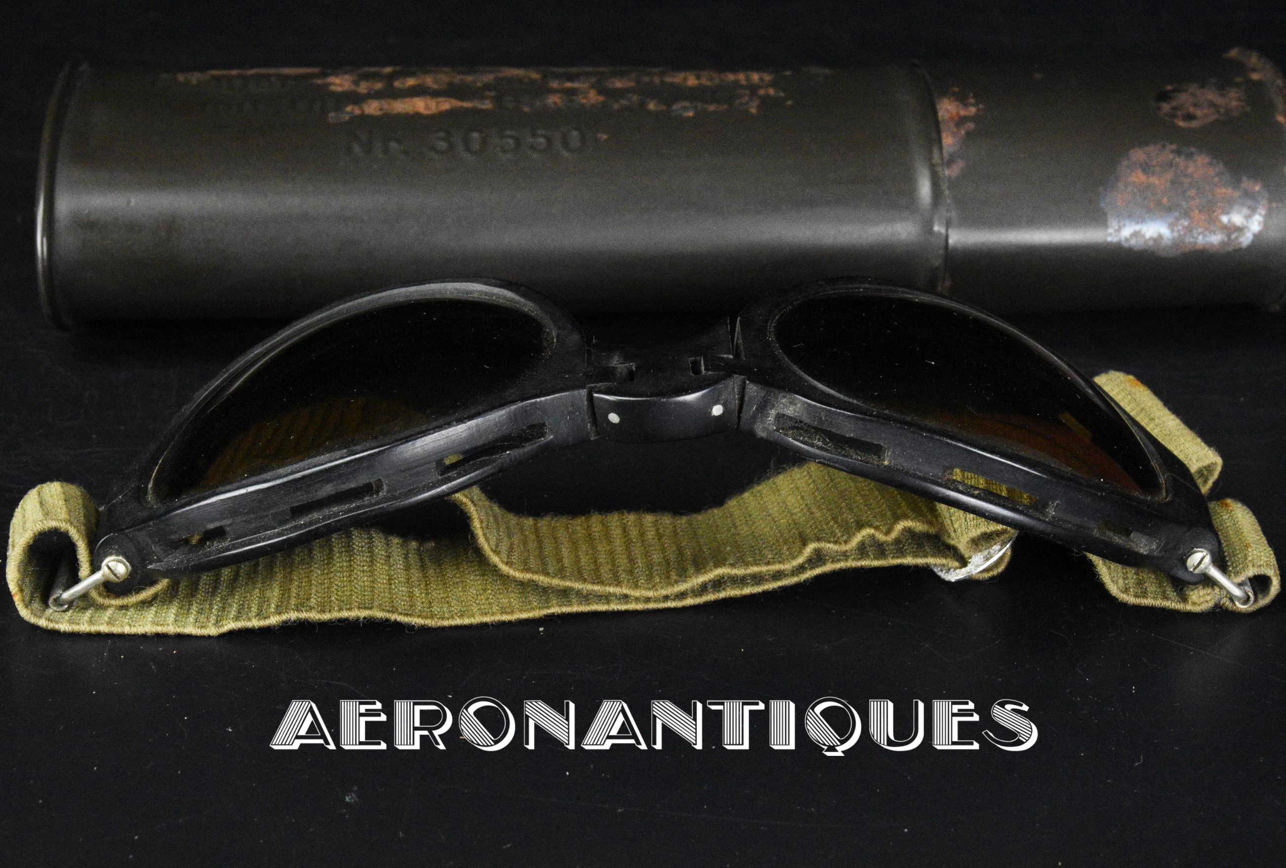 Lunettes de vol Nietsche & Gunther de pilote de la Luftwaffe. Modèle pliant. Monture en bakélite. Verres minéraux teintés. Bande de serrage en toile élastique. Estampille fabricant "NIGURA" (NIetsche GUnther RAtenow). Complètes avec l'étui en tôle d'origine correspondant, lettre "D" définissant le modèle avec verres teintés. Rare. Serre-tête non inclus, disponible sur le site à la rubrique ALLEMAGNE/GB/DIVERS