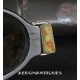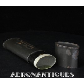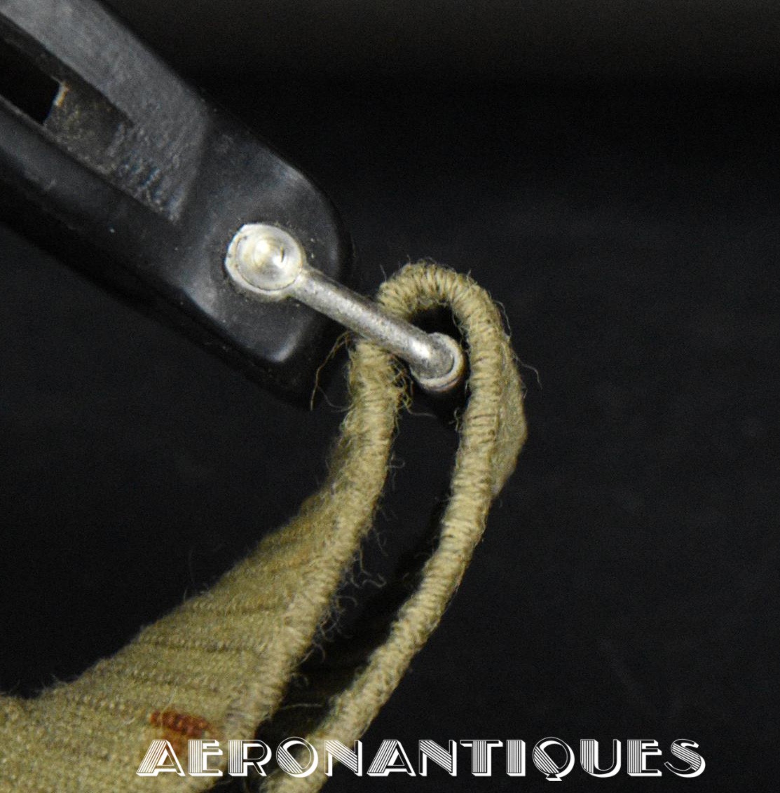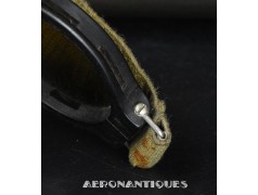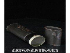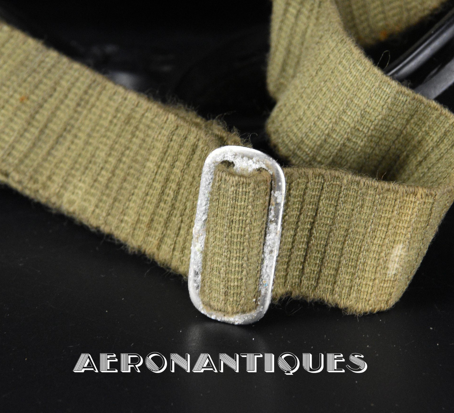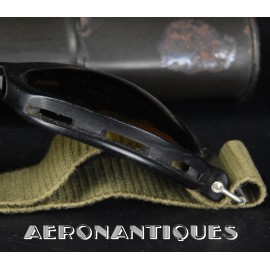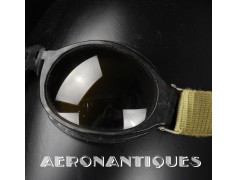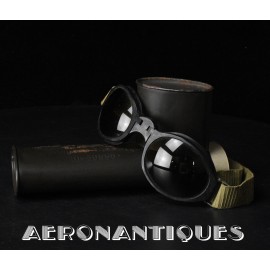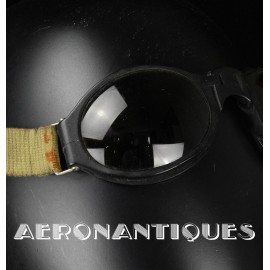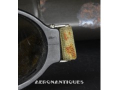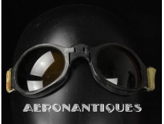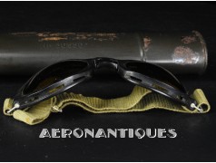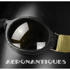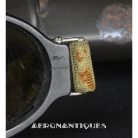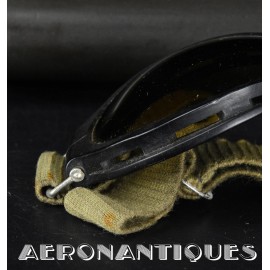 Lunettes de vol Nietsche & Gunther de pilote de la Luftwaffe. Modèle pliant. Monture en bakélite. Verres minéraux teintés. Bande de serrage en toile élastique. Estampille fabricant "NIGURA" (NIetsche GUnther RAtenow). Complètes avec l'étui en tôle d'origine correspondant, lettre "D" définissant le modèle avec verres teintés. Rare. Serre-tête non inclus, disponible sur le site à la rubrique ALLEMAGNE/GB/DIVERS