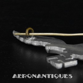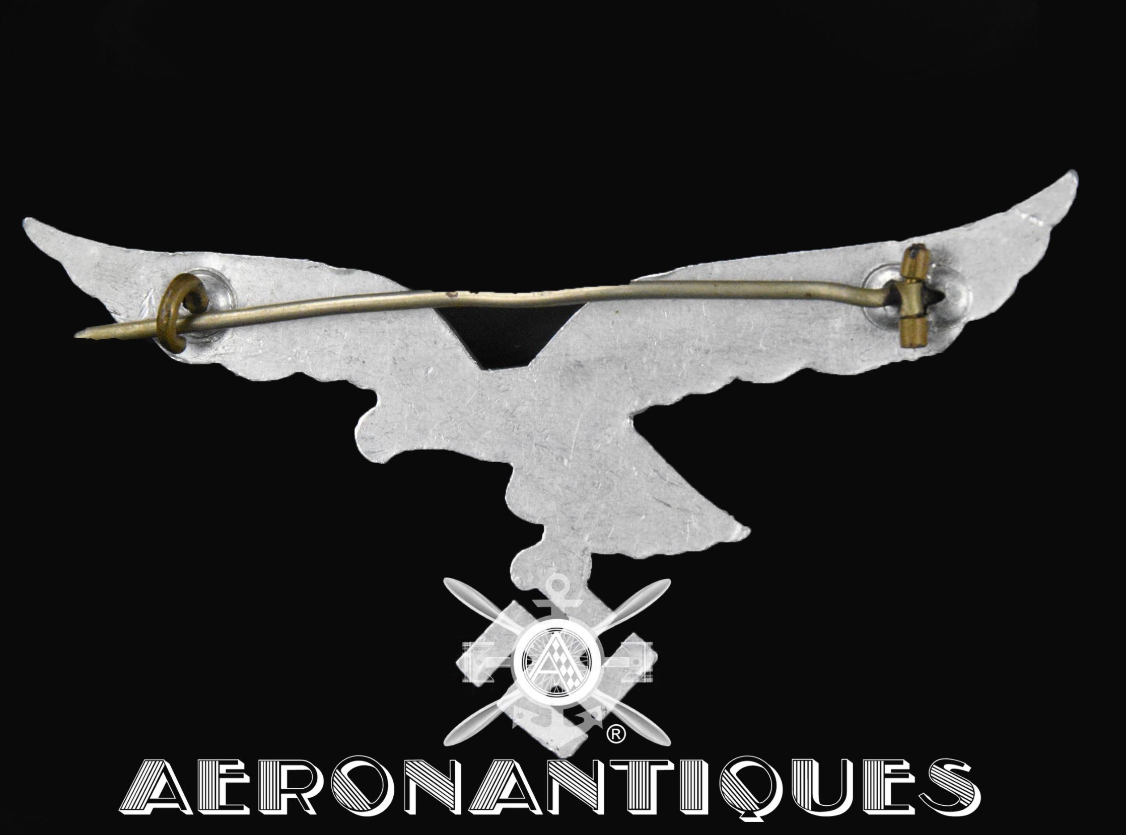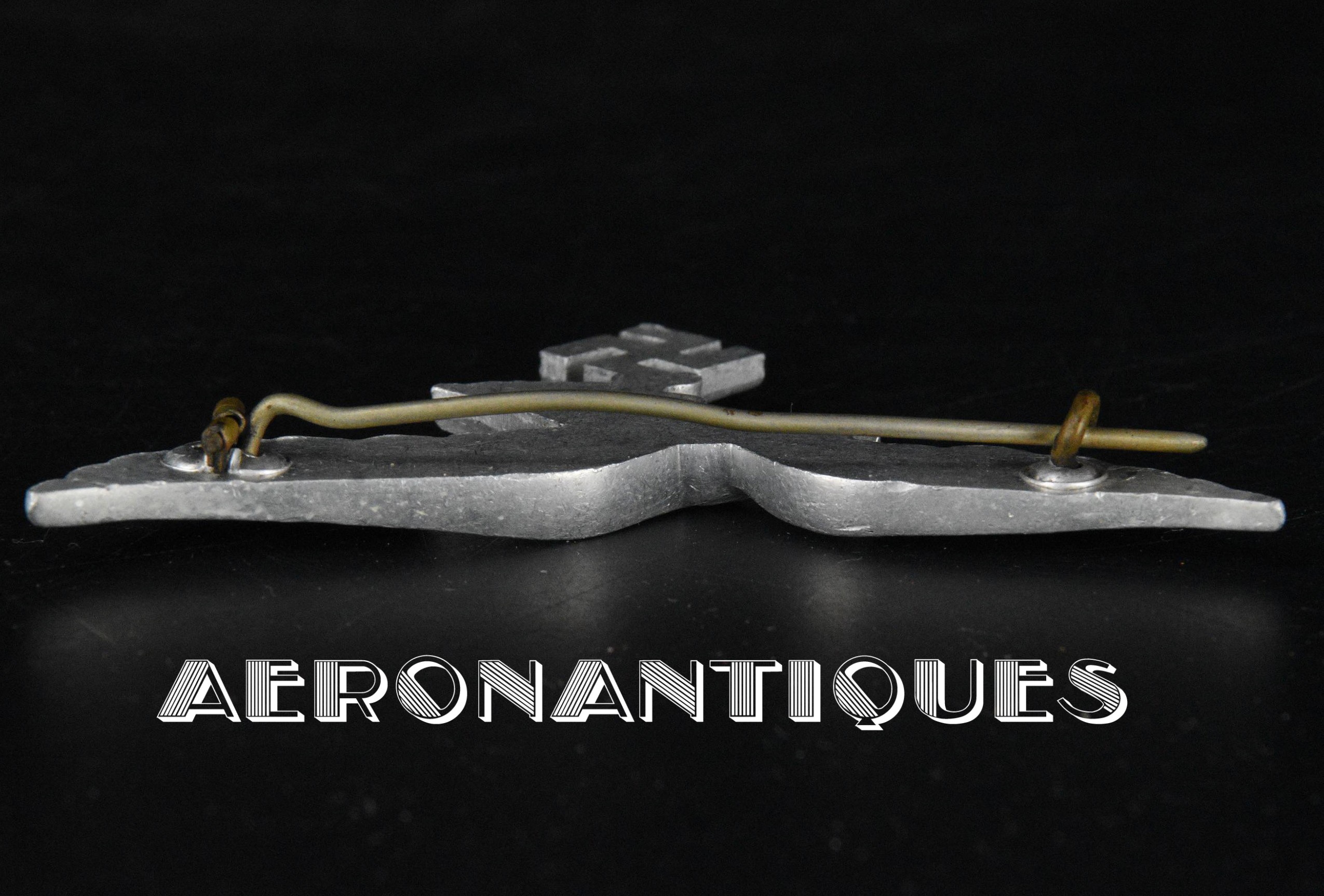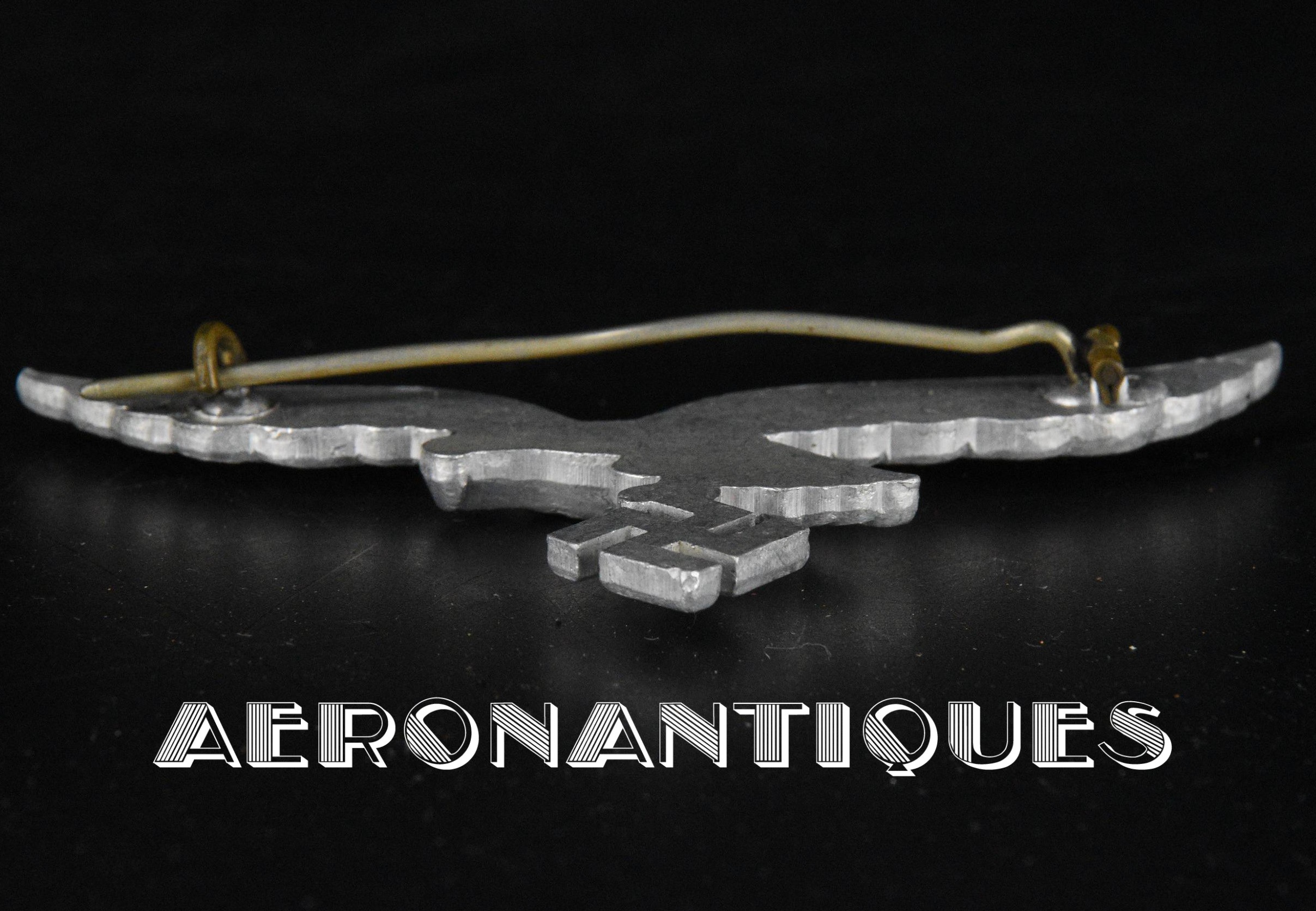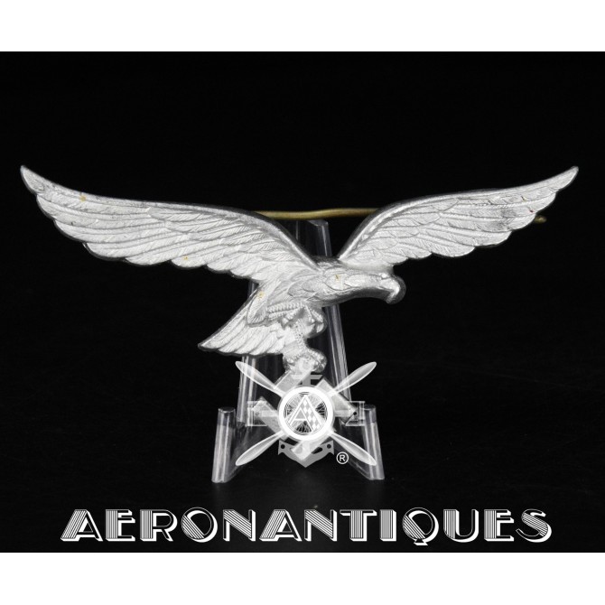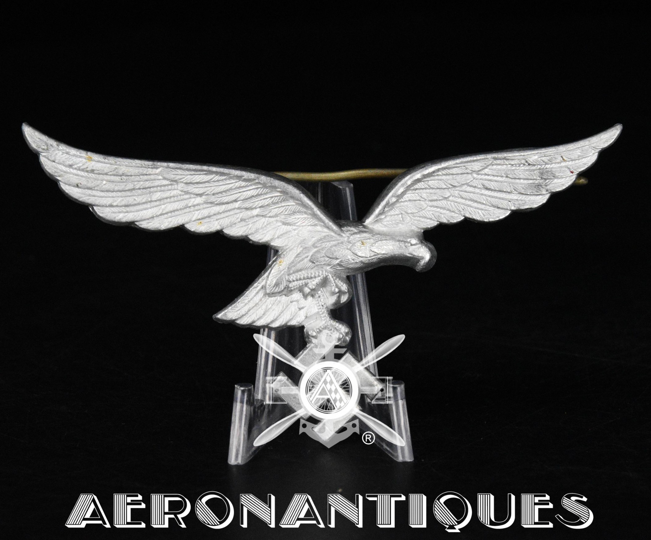 Aigle de poitrine de pilote de la Luftwaffe, fabrication en aluminium. Deuxième modèle (1938). Longueur: 83 mm. Destiné à l'origine à être porté sur la veste blanche d'été (sommeruniform), ce type d'aigle équipait également de manière non réglementaire les blousons de vol en cuir de type cycliste comme en témoignent de nombreuses photos d'époque. Cet article est proposé avec un certificat d'authenticité sur demande.
