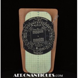 Calculateur computer mécanique de vol de l'US Army Air Force réglementaire modèle AN 5835-1, fabrication en plastique noir lithographié en jaune pour faciliter la lecture de nuit par la société JB CARROLL COMPANY, contrat militaire de 1945. Le calculateur est complet avec sa housse en cuir d'origine. Longueur 24 cm. Ces calculateurs de vol équipaient les pilotes et équipages d'appareils de l'US Army Air Force, chasse, bombardier ou transport, durant la seconde guerre mondiale. Il permet de calculer vitesse réelle, altitude, densité/altitude, triangle des vitesses, temps de vol, etc..