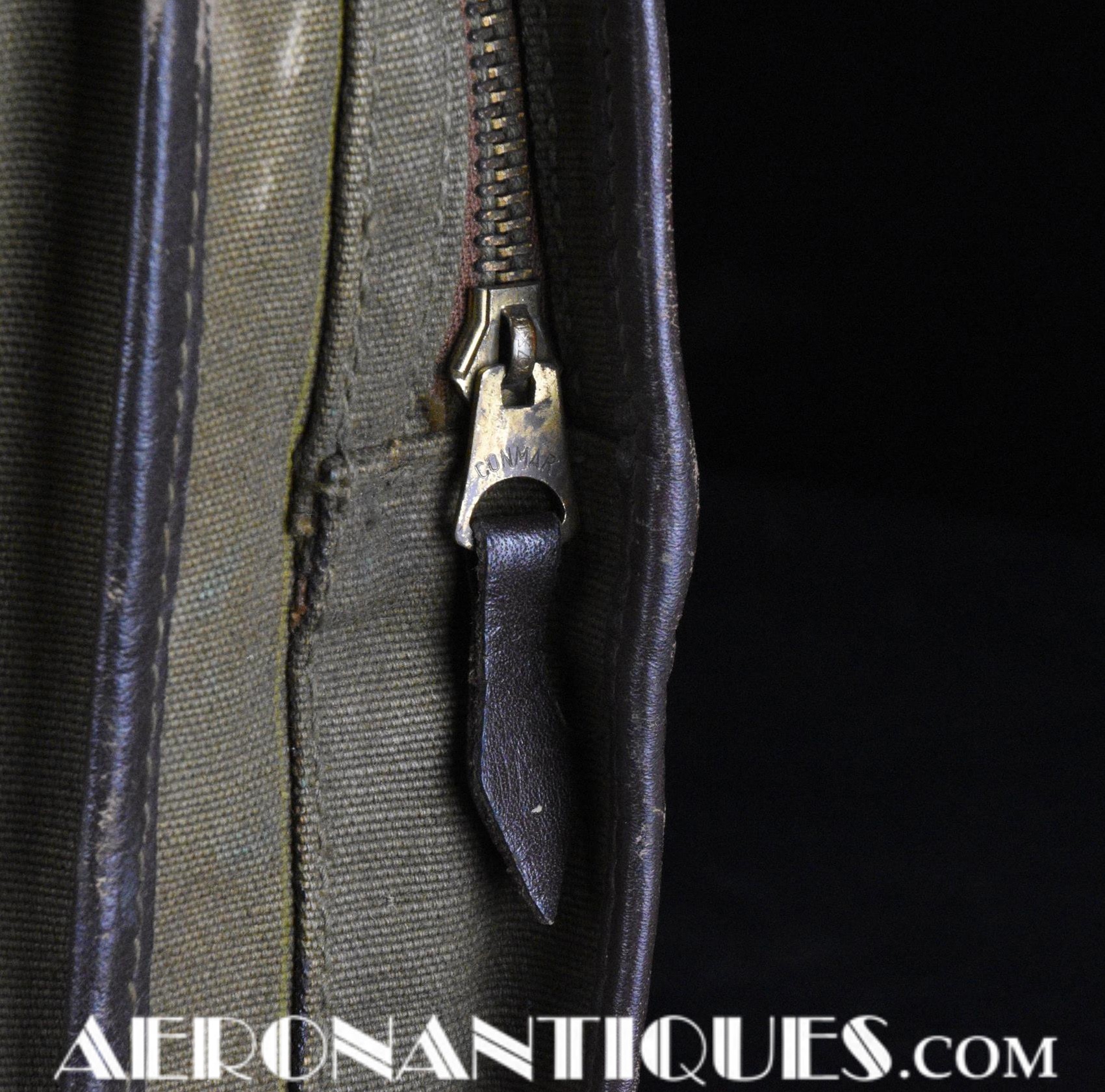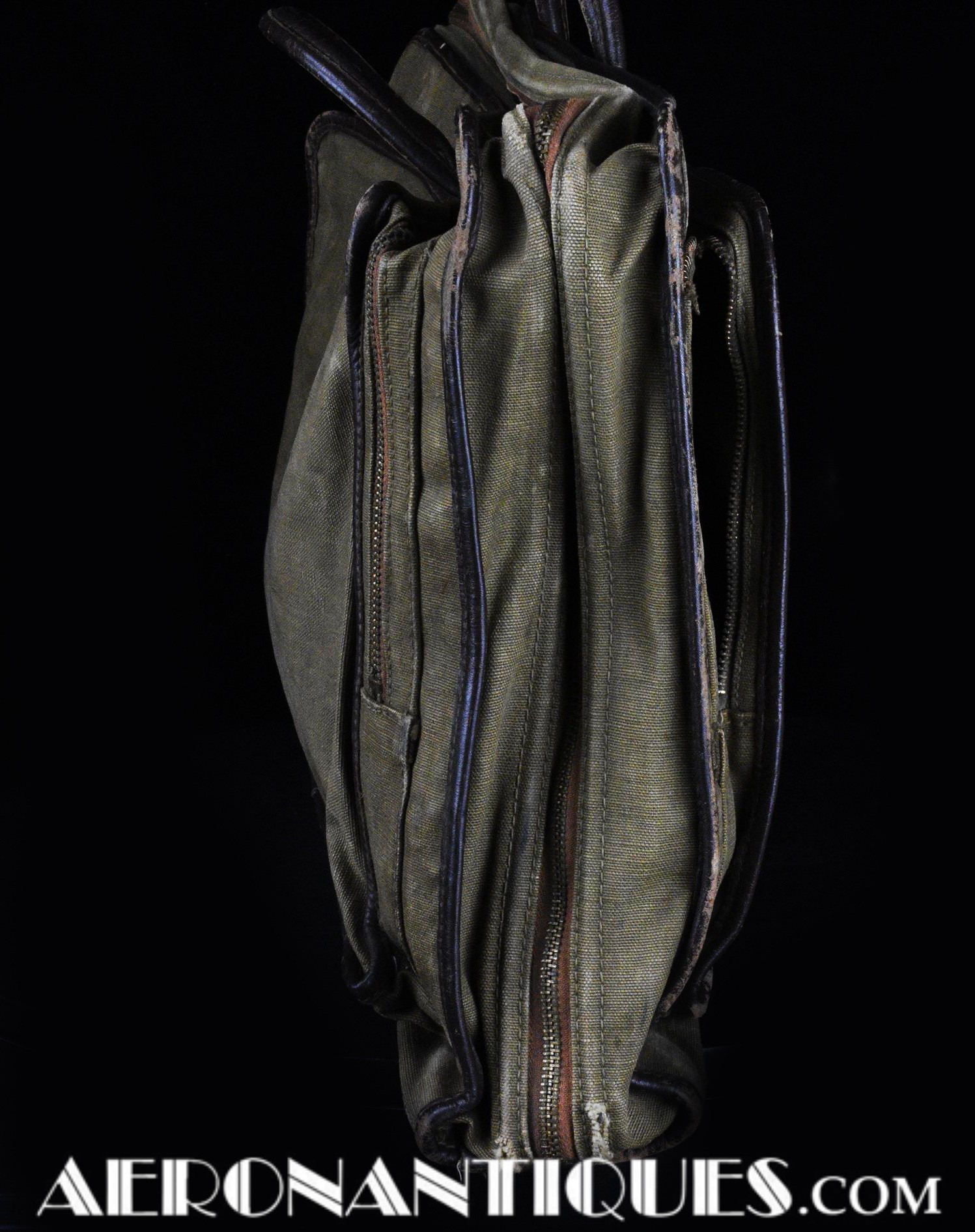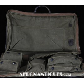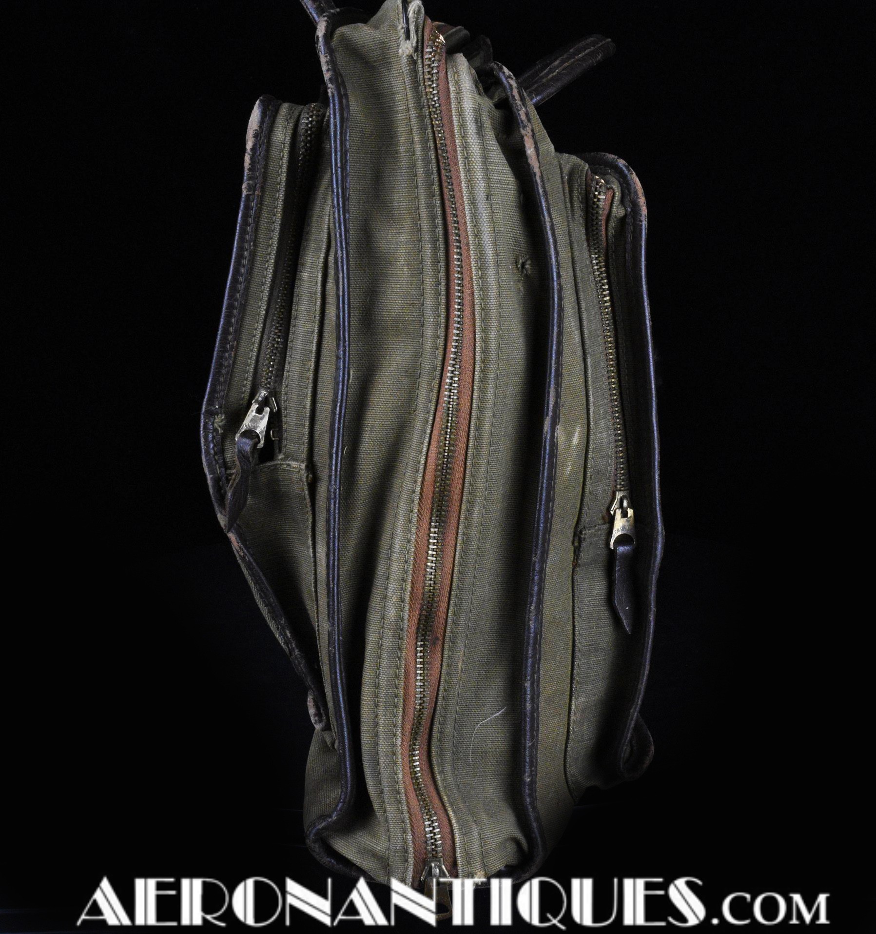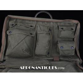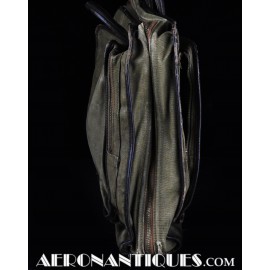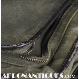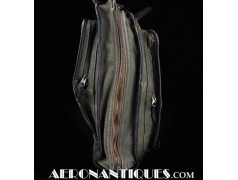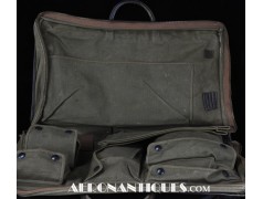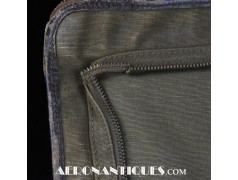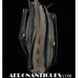 Sac réglementaire en toile de coton gansée de cuir type E-1 pour bombardiers de l'US Army Air Force. Nombreuses poches. Deux fermetures à glissière CONMAR en parfait état de fonctionnement (une fermeture à glissière partiellement endommagée sur une des poches extérieures). Belle pièce en bon état pour compléter un équipage de bombardier. Dimensions 54cm X 32cm