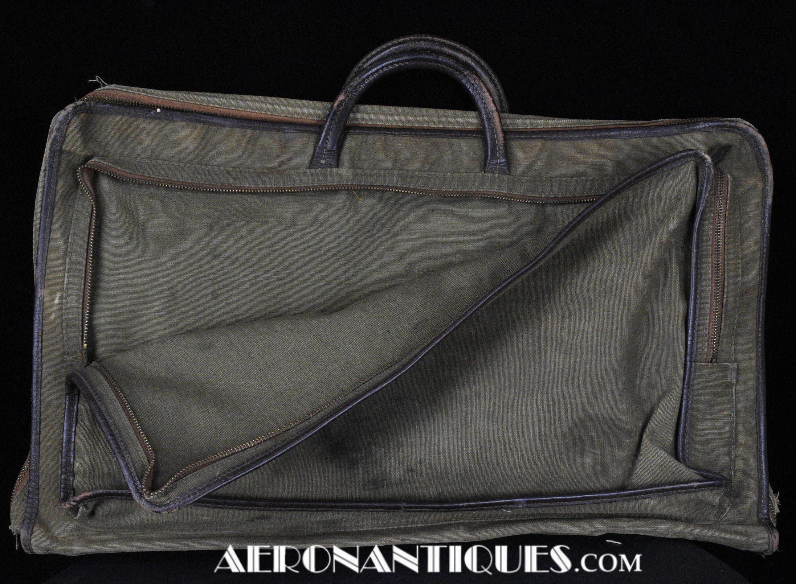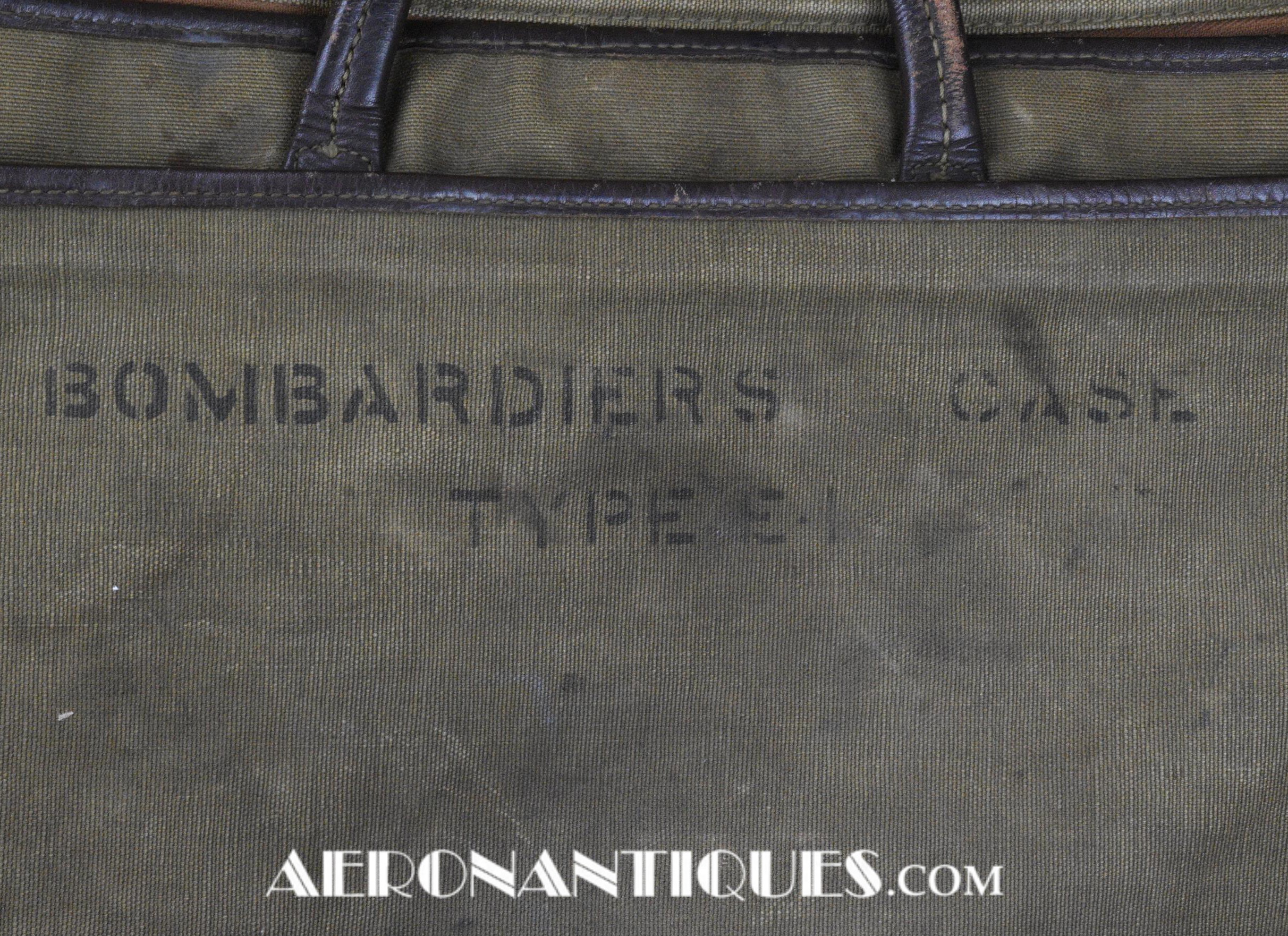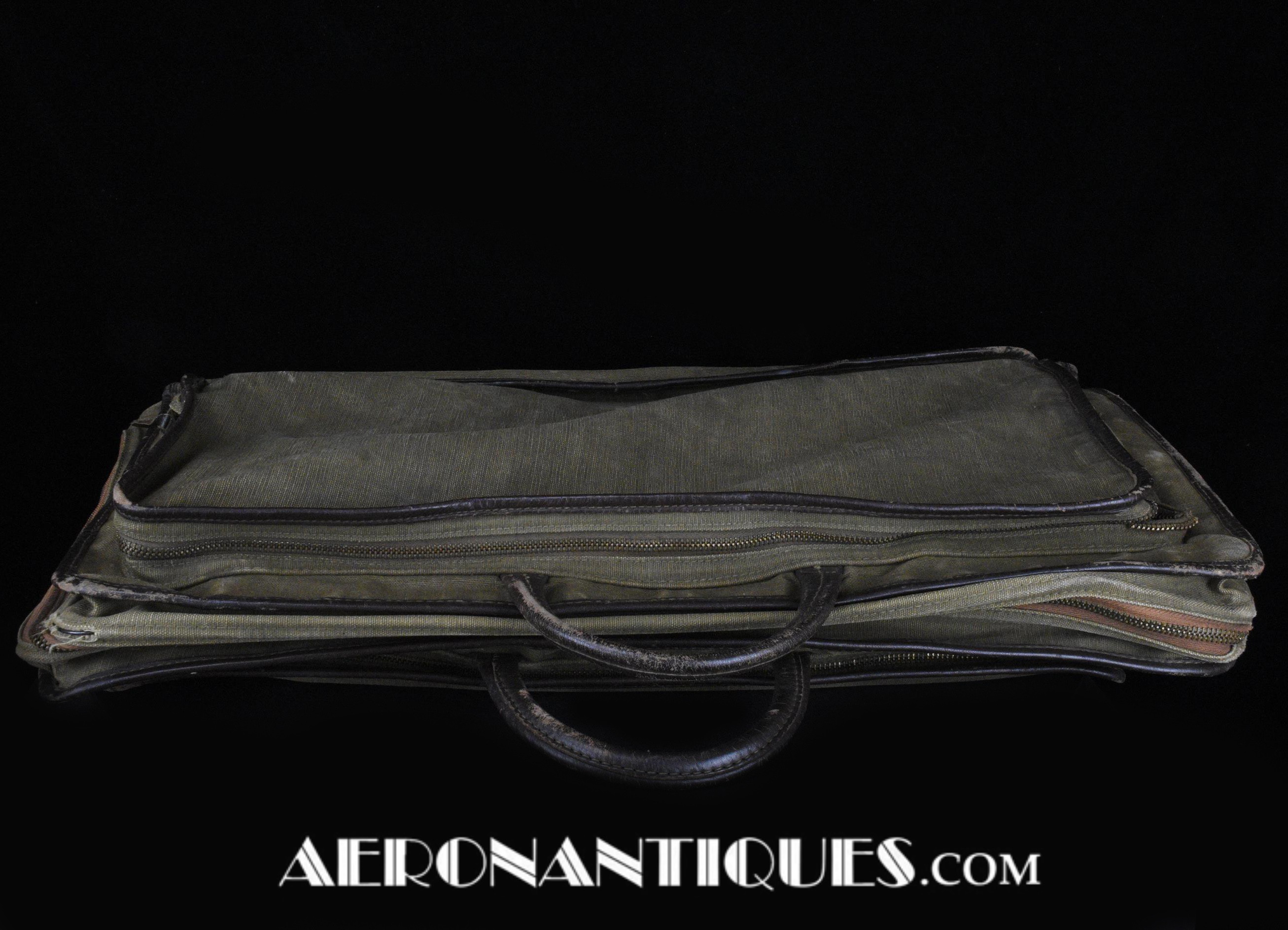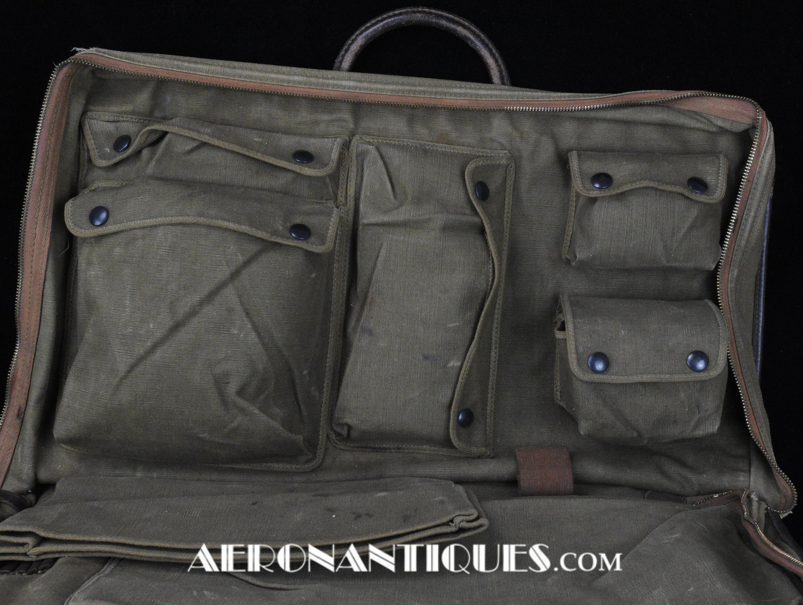 Sac réglementaire en toile de coton gansée de cuir type E-1 pour bombardiers de l'US Army Air Force. Nombreuses poches. Deux fermetures à glissière CONMAR en parfait état de fonctionnement (une fermeture à glissière partiellement endommagée sur une des poches extérieures). Belle pièce en bon état pour compléter un équipage de bombardier. Dimensions 54cm X 32cm