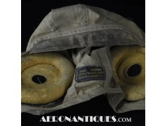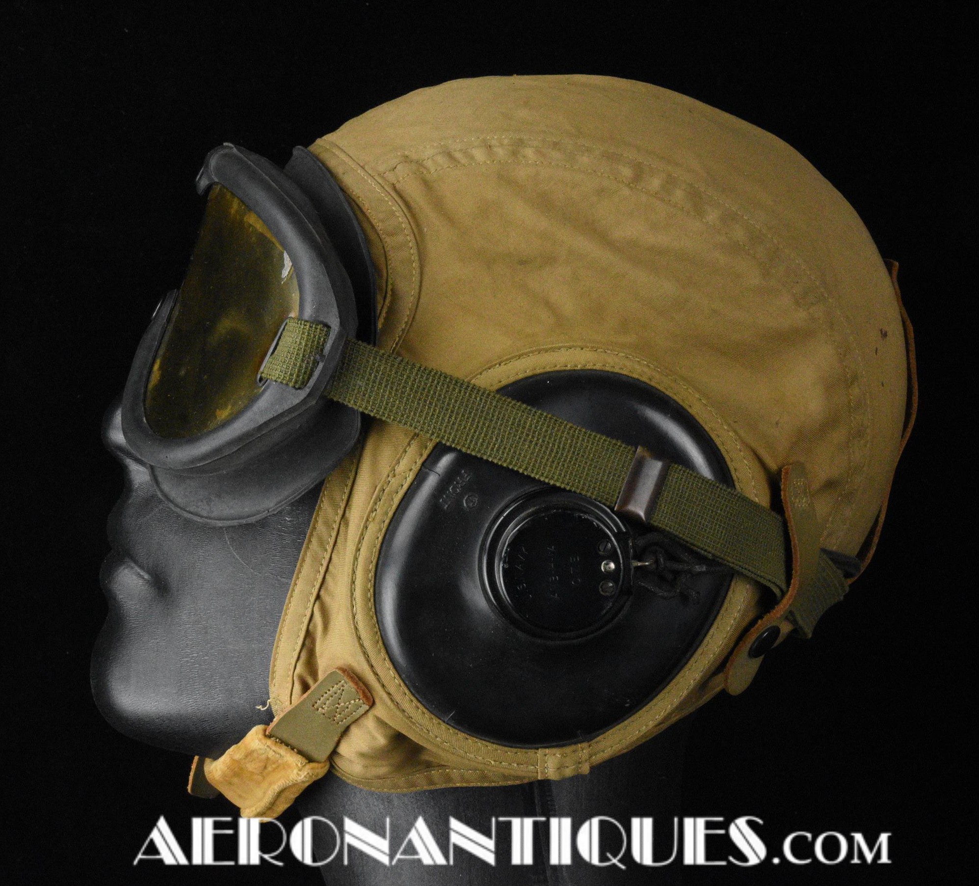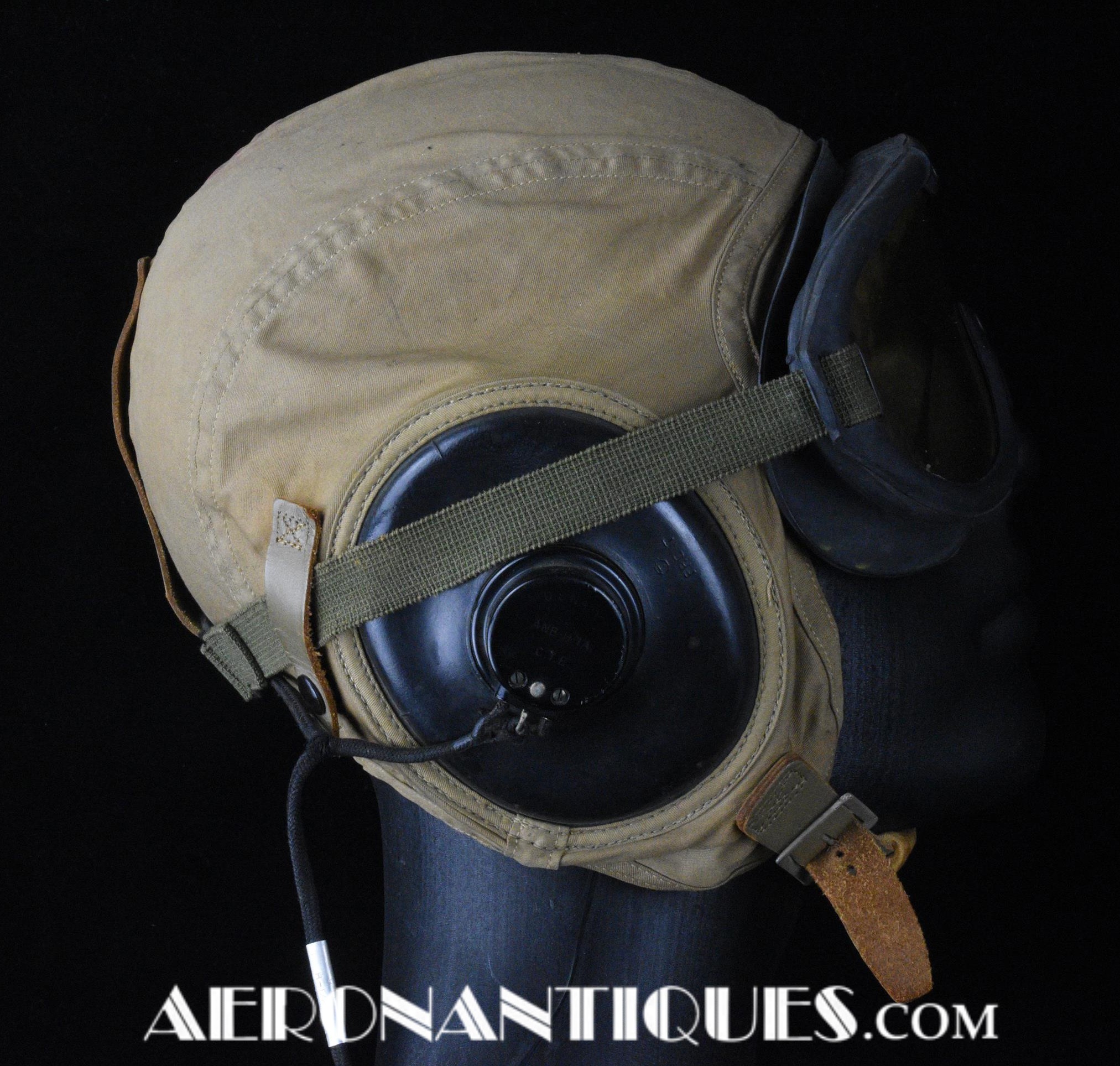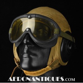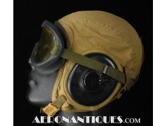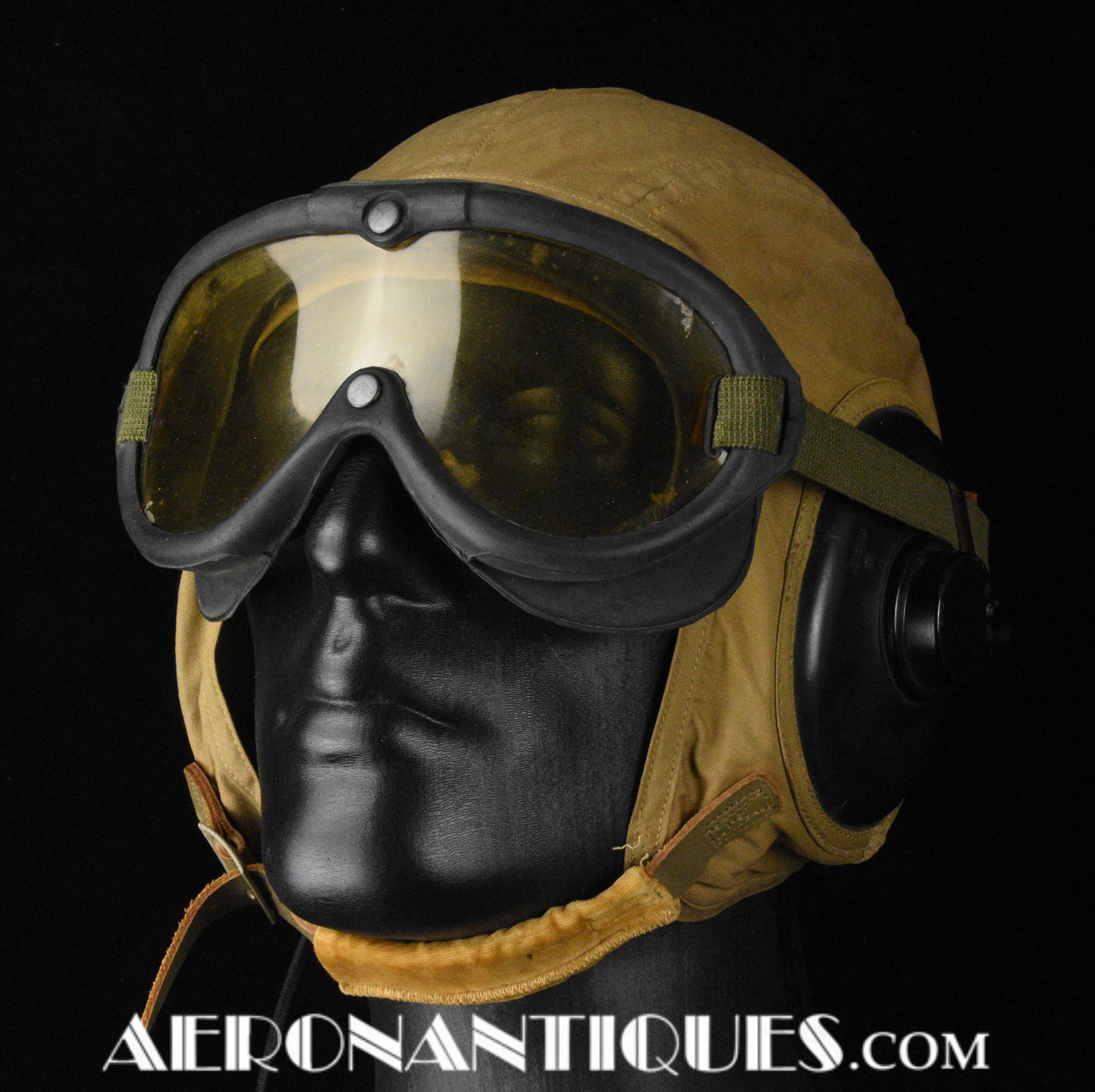 Ensemble serre-tête et lunettes identifié d'un pilote de l'Aéronavale période Seconde Guerre Mondiale, modèle été type AN-6542, circa 1944. Taille MEDIUM. Complet avec ses écouteurs type ANB-H-1A, câblage, rallonge et leur fiche spécifiques US Navy. Egalement incluses ses lunettes de vol M-144 US Navy fabrication Polaroid datées 1945 et leur boîte dans laquelle l’ensemble a été trouvé. Pièce d'équipement emblématique des pilotes de l'Aéronavale Américaine durant la Seconde Guerre Mondiale, utilisable pour compléter un ensemble de vol US NAVY ou US MARINE CORPS.