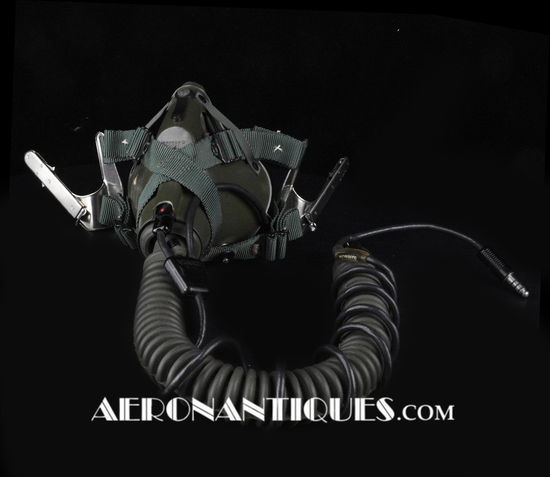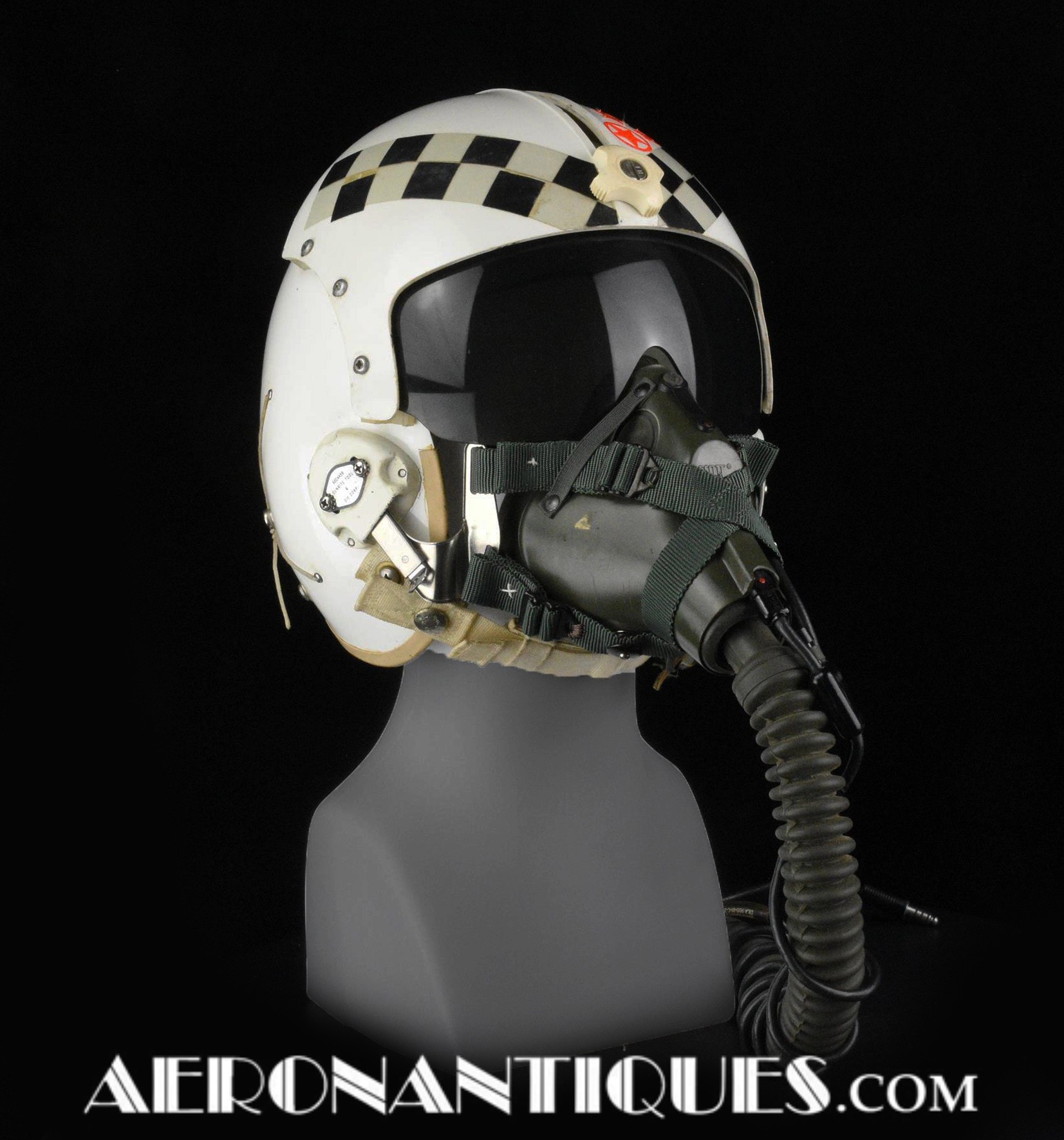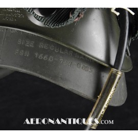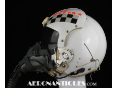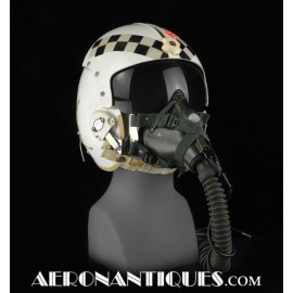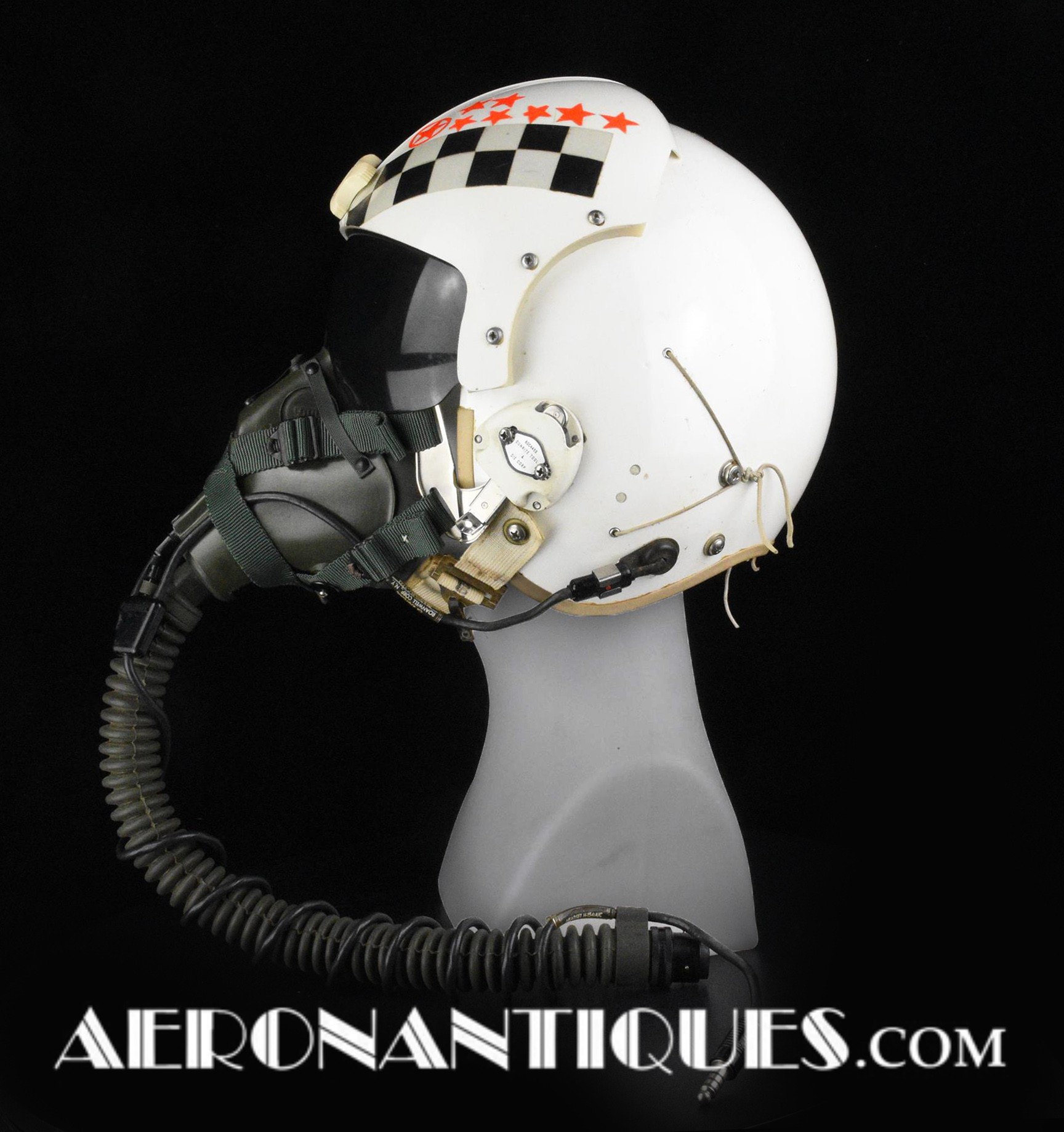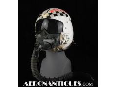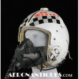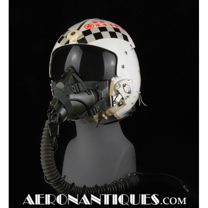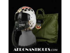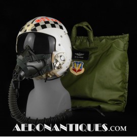 Ensemble casque et masque à oxygène d'un WSO du 113th Tactical Fighter Squadron de l'US Air Force, période du début des années 80. Casque HGU-2A/P, taille LARGE, complet avec écouteurs et fiche pour le microphone du masque à oxygène. Le couvre-visière a été personnalisé à base de damier blanc et noir fabriquée à partir d'adhésif réfléchissant tout comme les étoiles rouge/orangé symbolisant des victoires sur appareils communistes. Liner en polystyrène tapissé de patins de mousse gainée de cuir. Le masque à oxygène est un modèle MBU-5 fabrication SCOTT daté 1983, taille REGULAR-NARROW équipé avec microphone, cordon et fiche, attaches baïonnettes du troisième type. Coque rigide sans fêles. L'ensemble est complété par le sac de transport d'origine. Équipement homogène ayant appartenu au même pilote, Weapons System Operator sur McDonnell Douglas F-4E Phantom II. Le support de présentation est inclus.