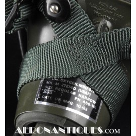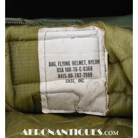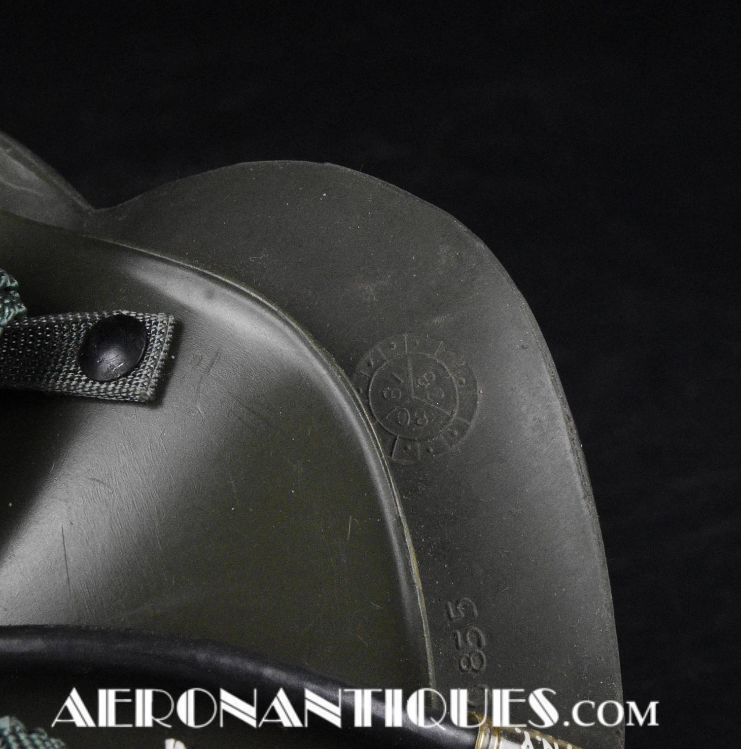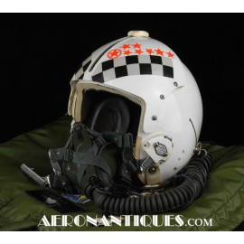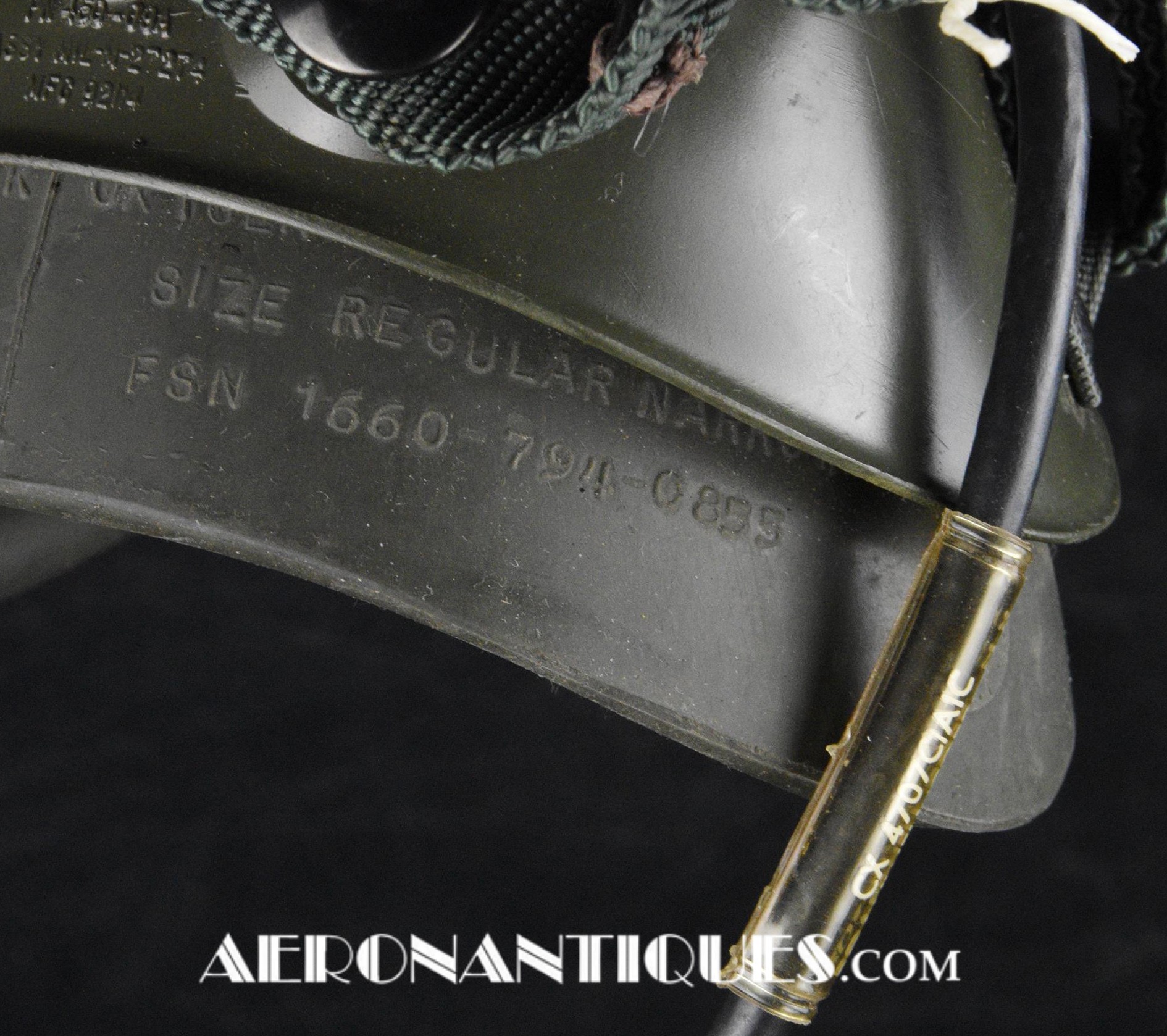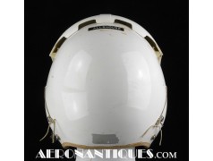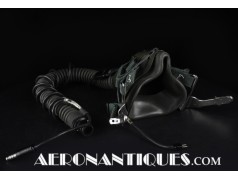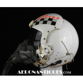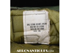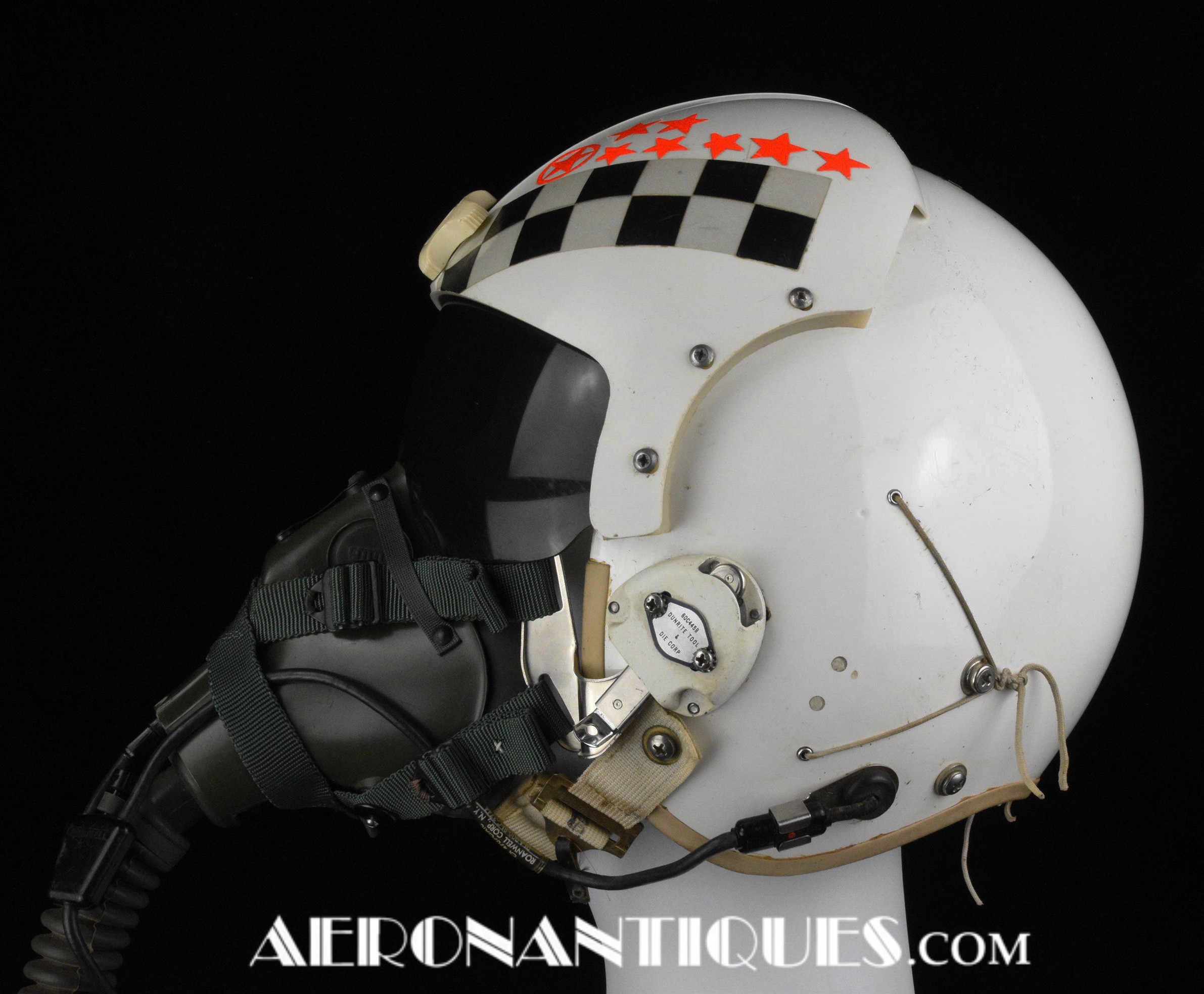 Ensemble casque et masque à oxygène d'un WSO du 113th Tactical Fighter Squadron de l'US Air Force, période du début des années 80. Casque HGU-2A/P, taille LARGE, complet avec écouteurs et fiche pour le microphone du masque à oxygène. Le couvre-visière a été personnalisé à base de damier blanc et noir fabriquée à partir d'adhésif réfléchissant tout comme les étoiles rouge/orangé symbolisant des victoires sur appareils communistes. Liner en polystyrène tapissé de patins de mousse gainée de cuir. Le masque à oxygène est un modèle MBU-5 fabrication SCOTT daté 1983, taille REGULAR-NARROW équipé avec microphone, cordon et fiche, attaches baïonnettes du troisième type. Coque rigide sans fêles. L'ensemble est complété par le sac de transport d'origine. Équipement homogène ayant appartenu au même pilote, Weapons System Operator sur McDonnell Douglas F-4E Phantom II. Le support de présentation est inclus.