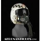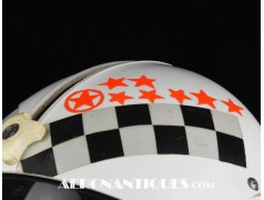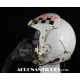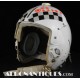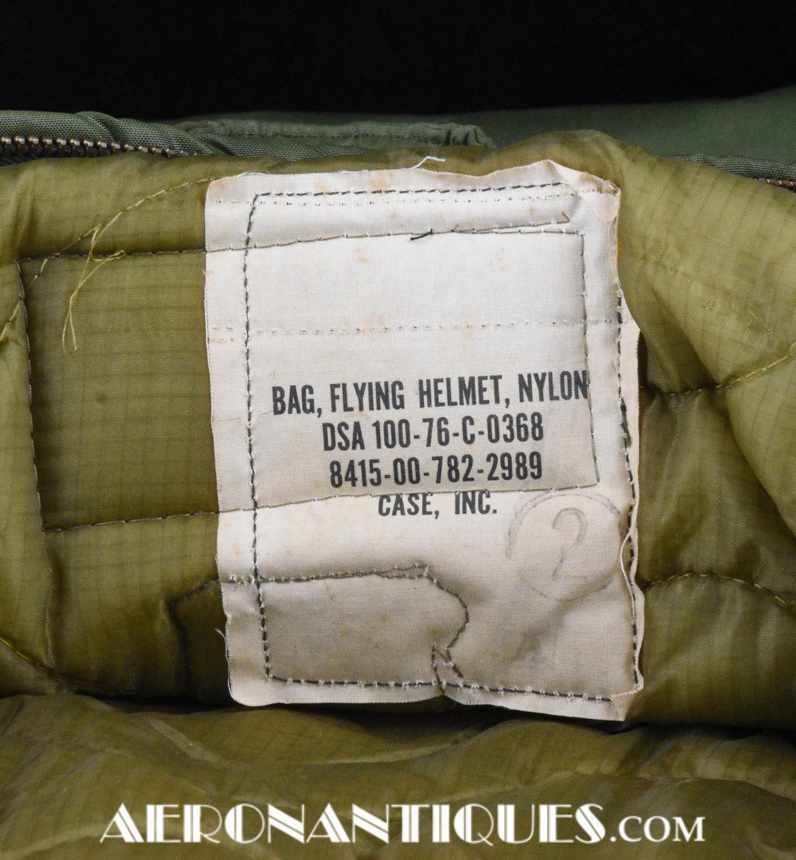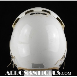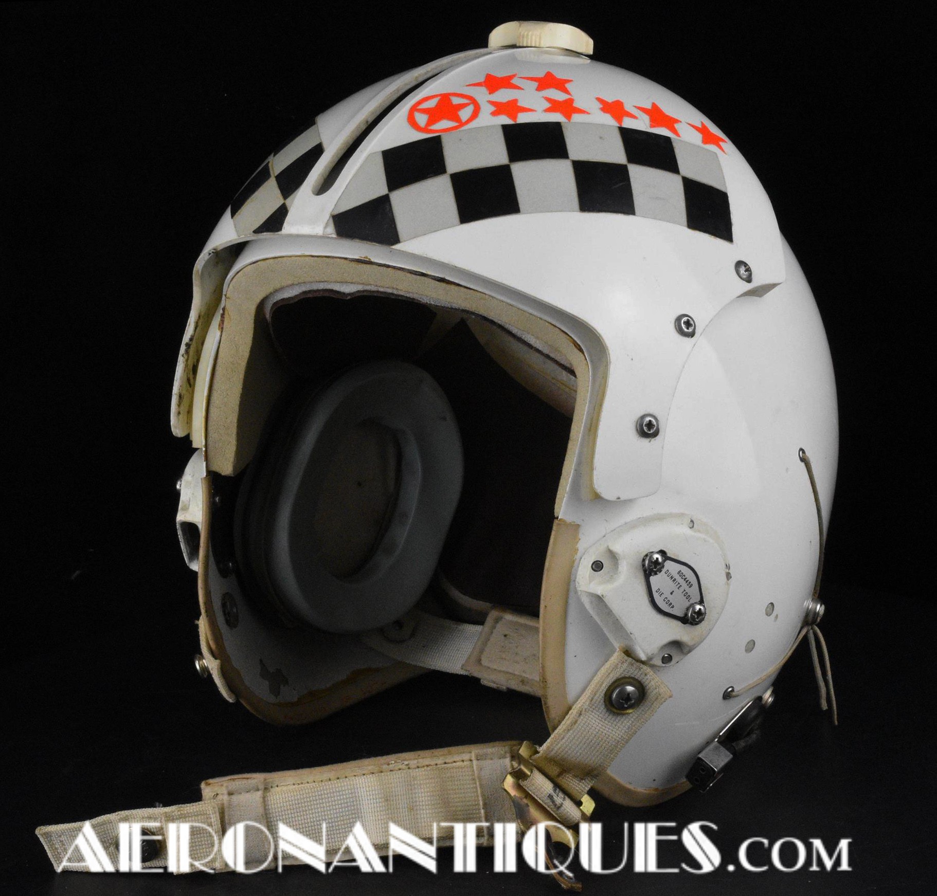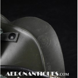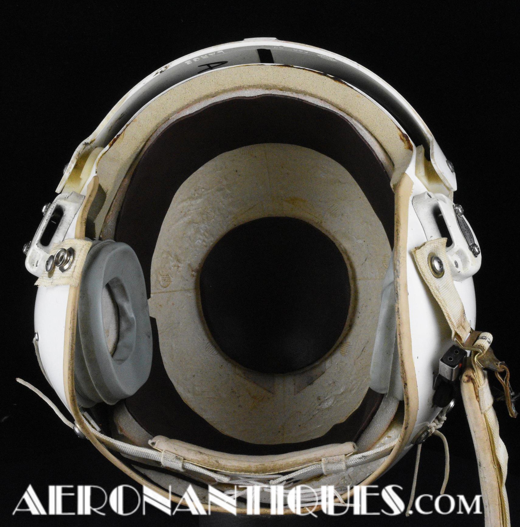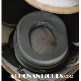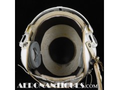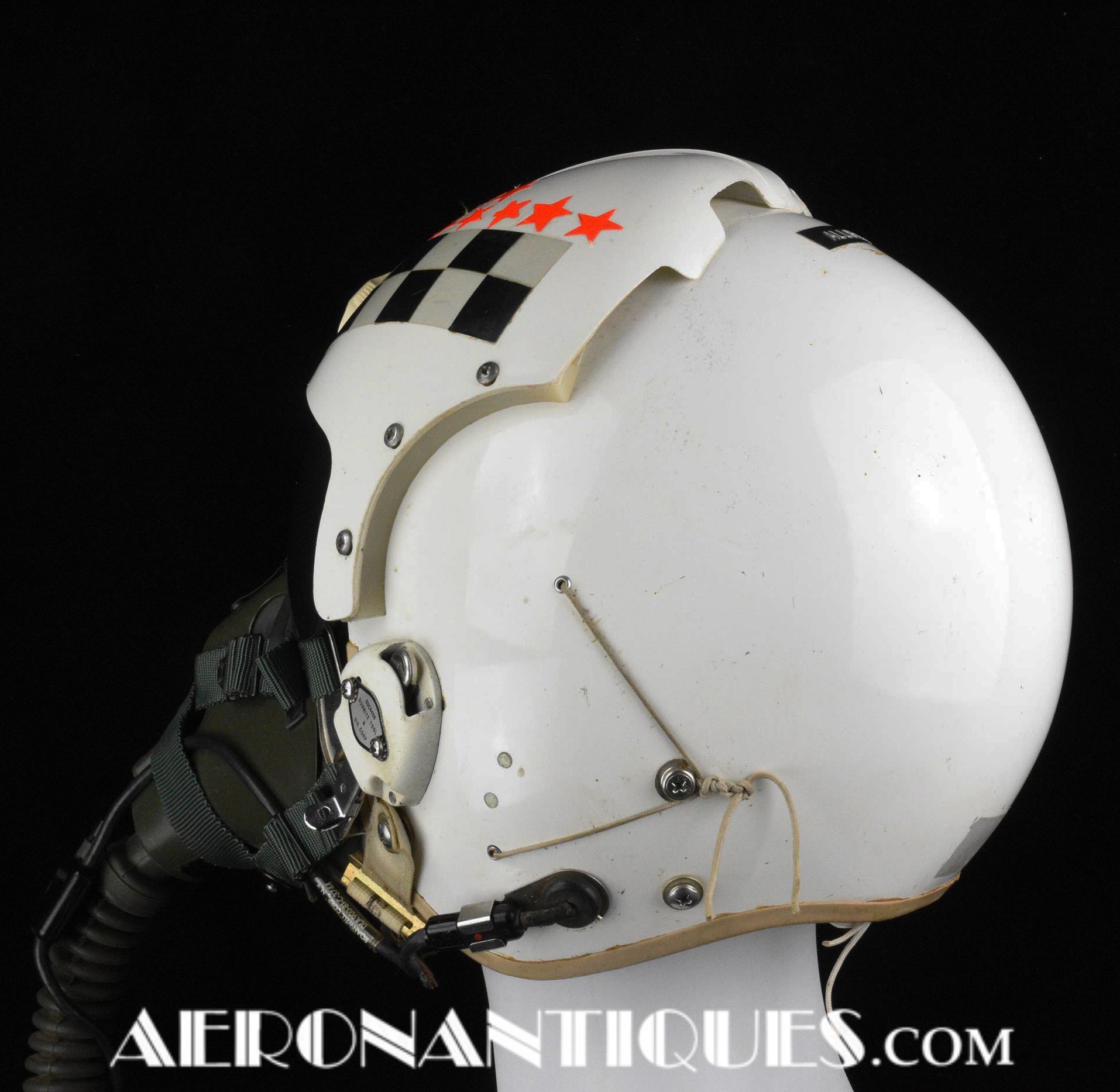 Ensemble casque et masque à oxygène d'un WSO du 113th Tactical Fighter Squadron de l'US Air Force, période du début des années 80. Casque HGU-2A/P, taille LARGE, complet avec écouteurs et fiche pour le microphone du masque à oxygène. Le couvre-visière a été personnalisé à base de damier blanc et noir fabriquée à partir d'adhésif réfléchissant tout comme les étoiles rouge/orangé symbolisant des victoires sur appareils communistes. Liner en polystyrène tapissé de patins de mousse gainée de cuir. Le masque à oxygène est un modèle MBU-5 fabrication SCOTT daté 1983, taille REGULAR-NARROW équipé avec microphone, cordon et fiche, attaches baïonnettes du troisième type. Coque rigide sans fêles. L'ensemble est complété par le sac de transport d'origine. Équipement homogène ayant appartenu au même pilote, Weapons System Operator sur McDonnell Douglas F-4E Phantom II. Le support de présentation est inclus.