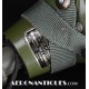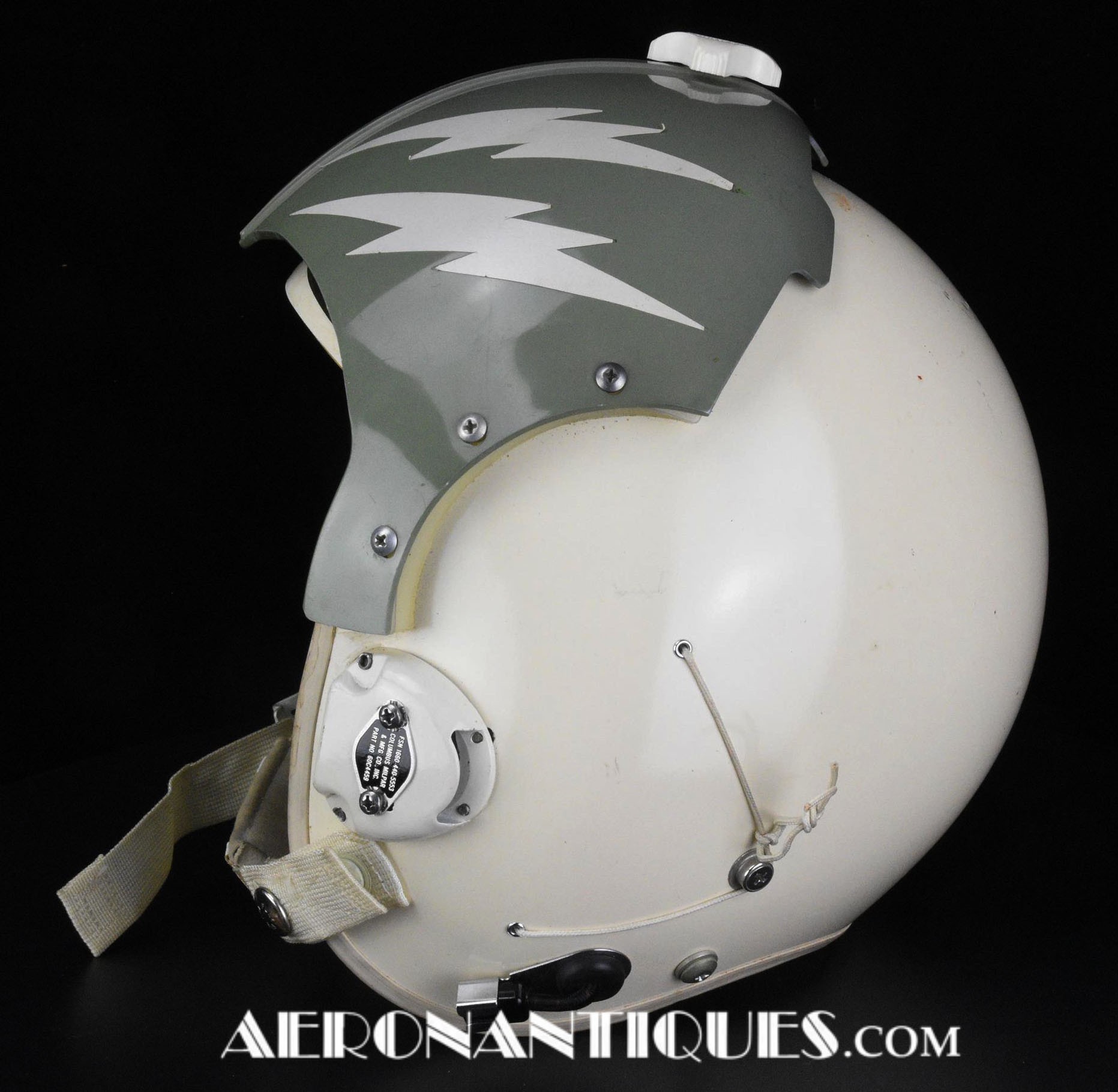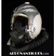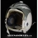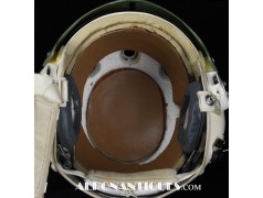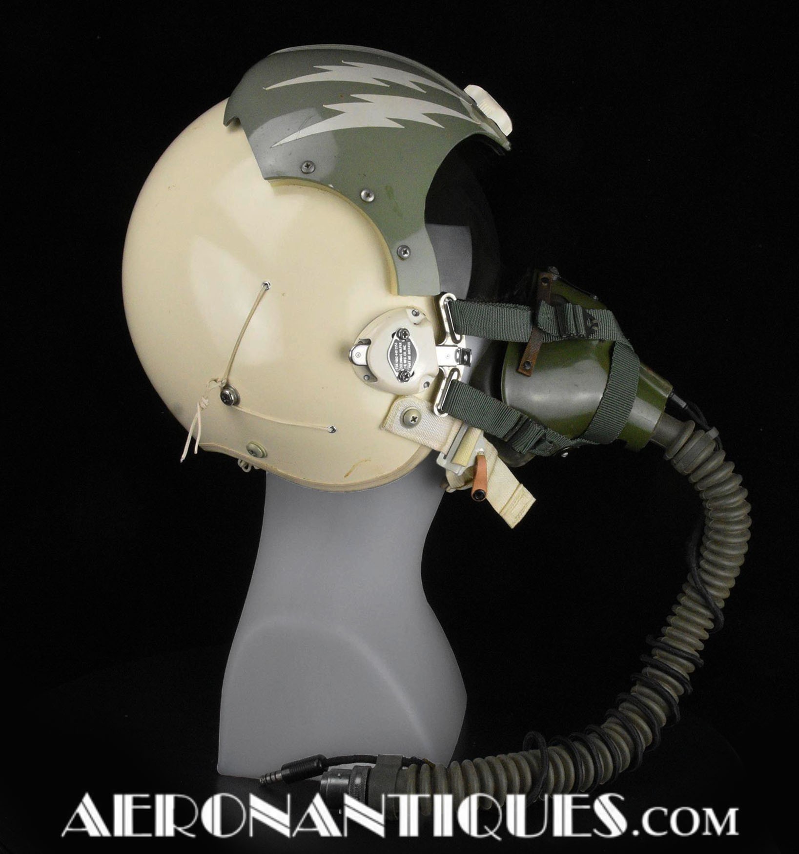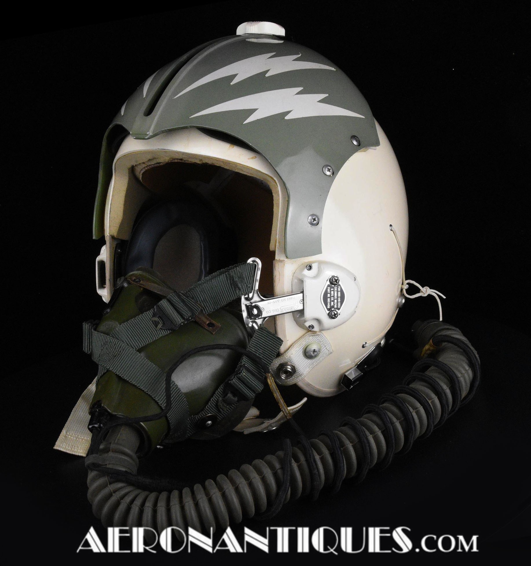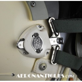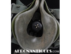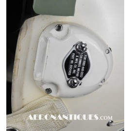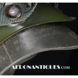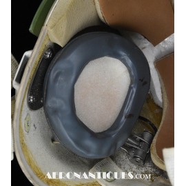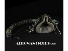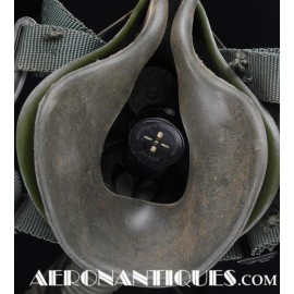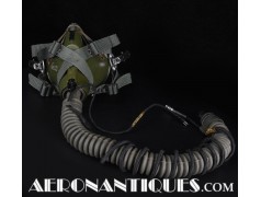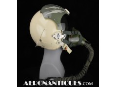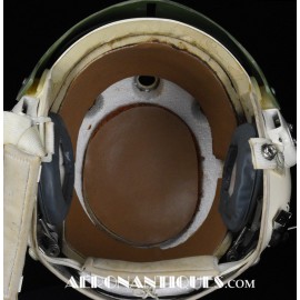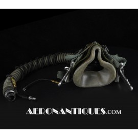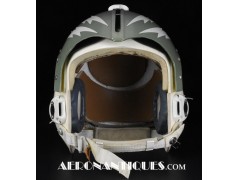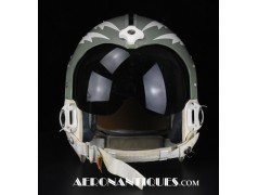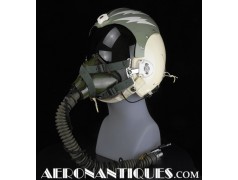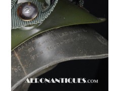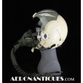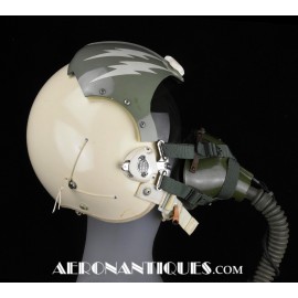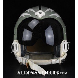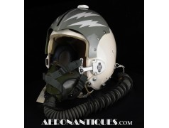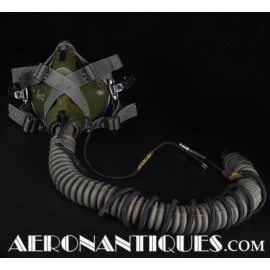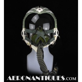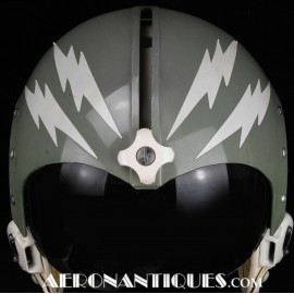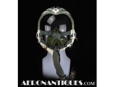 Ensemble casque, masque à oxygène et sac de transport d'un pilote de McDonnel Douglas Phantom II de l'US Air Force, période 1968-70. Le casque est un modèle HGU-2A/P, fabrication GENTEX daté 1968, taille LARGE, complet avec ses écouteurs H-154 AIC à monture ajustable et fiche pour le microphone du masque à oxygène. Le couvre-visière a été découpé d'origine pour améliorer la visibilité, coutume répandue chez les pilotes de chasse jusqu'au milieu des années 80 et l'arrivée des nouveaux casque HGU-55 offrant une meilleure vision panoramique, peint en vert et décoré avec de l'adhésif découpé en forme d'éclairs (unités de chasse et interception). Le masque à oxygène est un modèle MBU-5 fabrication SIERRA daté 1966, taille REGULAR-NARROW équipé avec microphone, cordon et fiche, attaches baïonnettes en "T" (1966-74). Le support de présentation est inclus. Ensemble en superbe état.