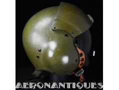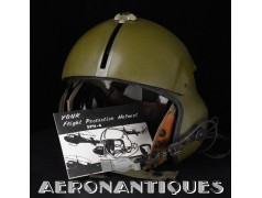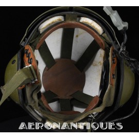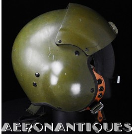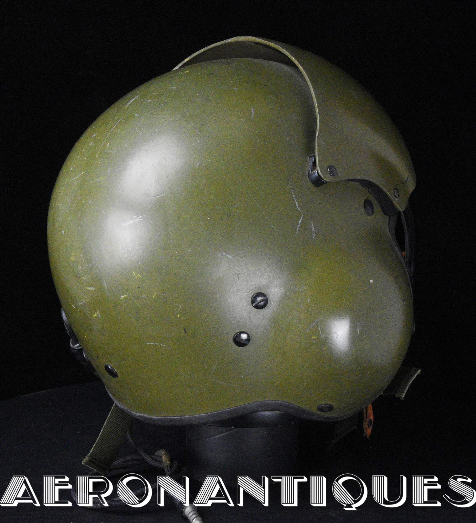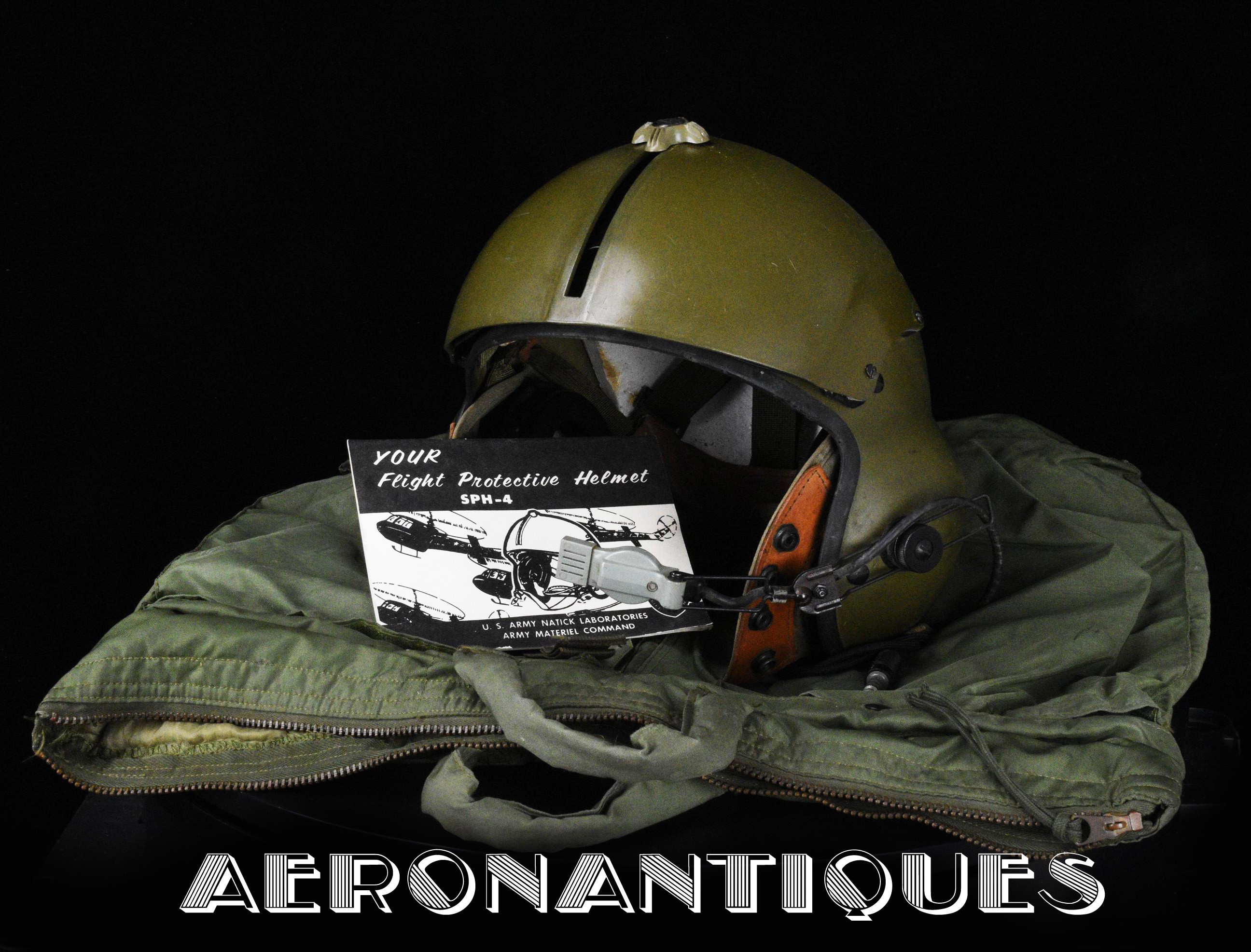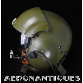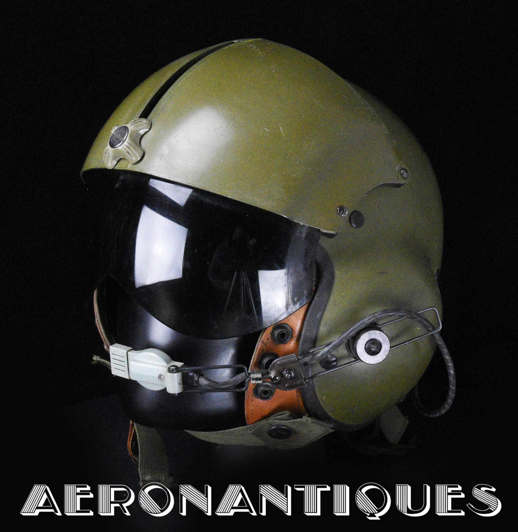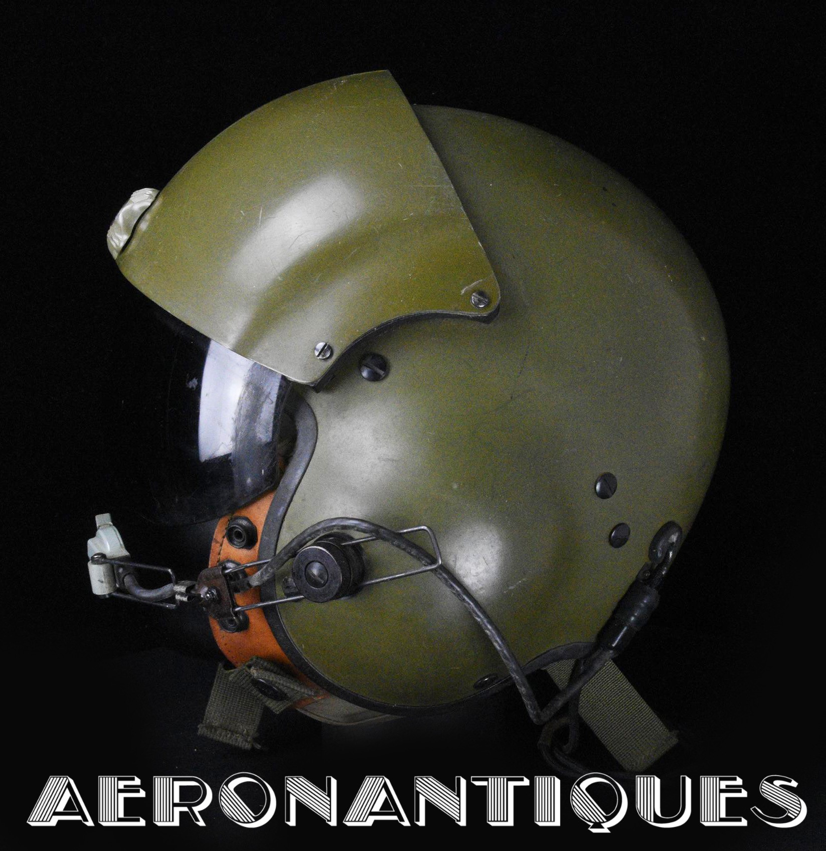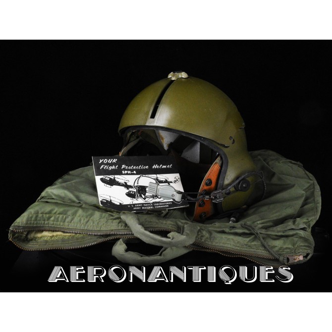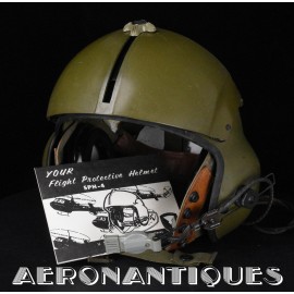 Casque de pilote d'hélicoptère de l'US Army, modèle SPH-4, fabrication GENTEX, daté 1971. Premier modèle (1969-1974). Taille "REGULAR". Complet avec coiffe intérieur nylon et cuir, suspension, microphone, écouteurs, cordon et fiche. Visière rétractable teintée fonctionnelle avec virole de sécurité. Également inclus le sac de transport d'origine et livret d'instructions. Conçu pour réduire les nuisances sonores comme l'indiquent les deux premières lettres de sa dénomination (Sound Protection), le modèle SPH-4 ne présentait pas une protection supérieures aux chocs à son prédécesseur de la série APH. Pièce mythique et caractéristique des équipements des équipages d'hélicoptère pendant la guerre du Vietnam. Très bon état.