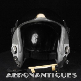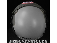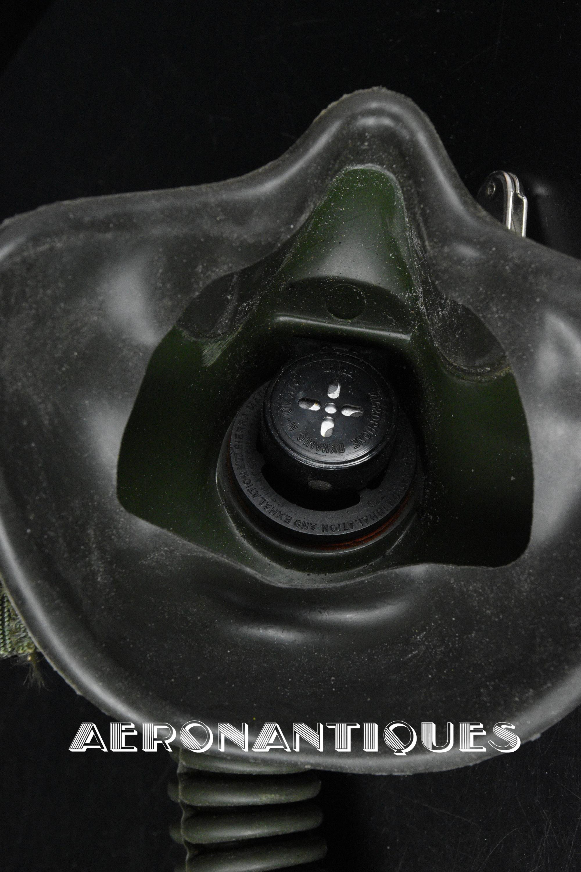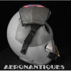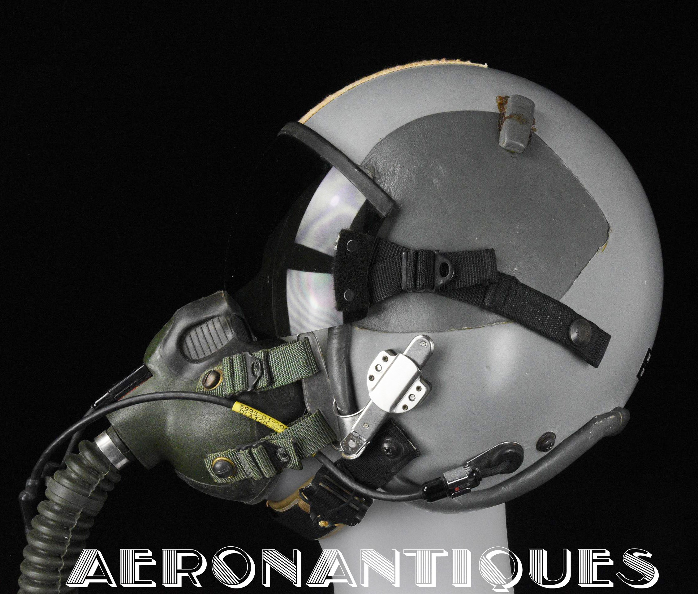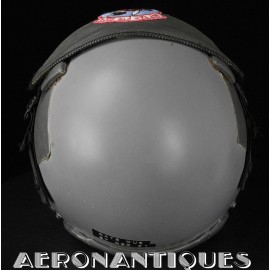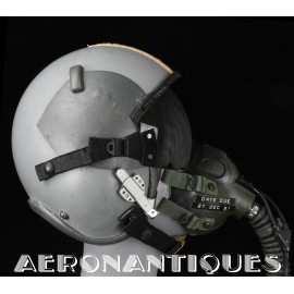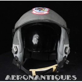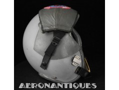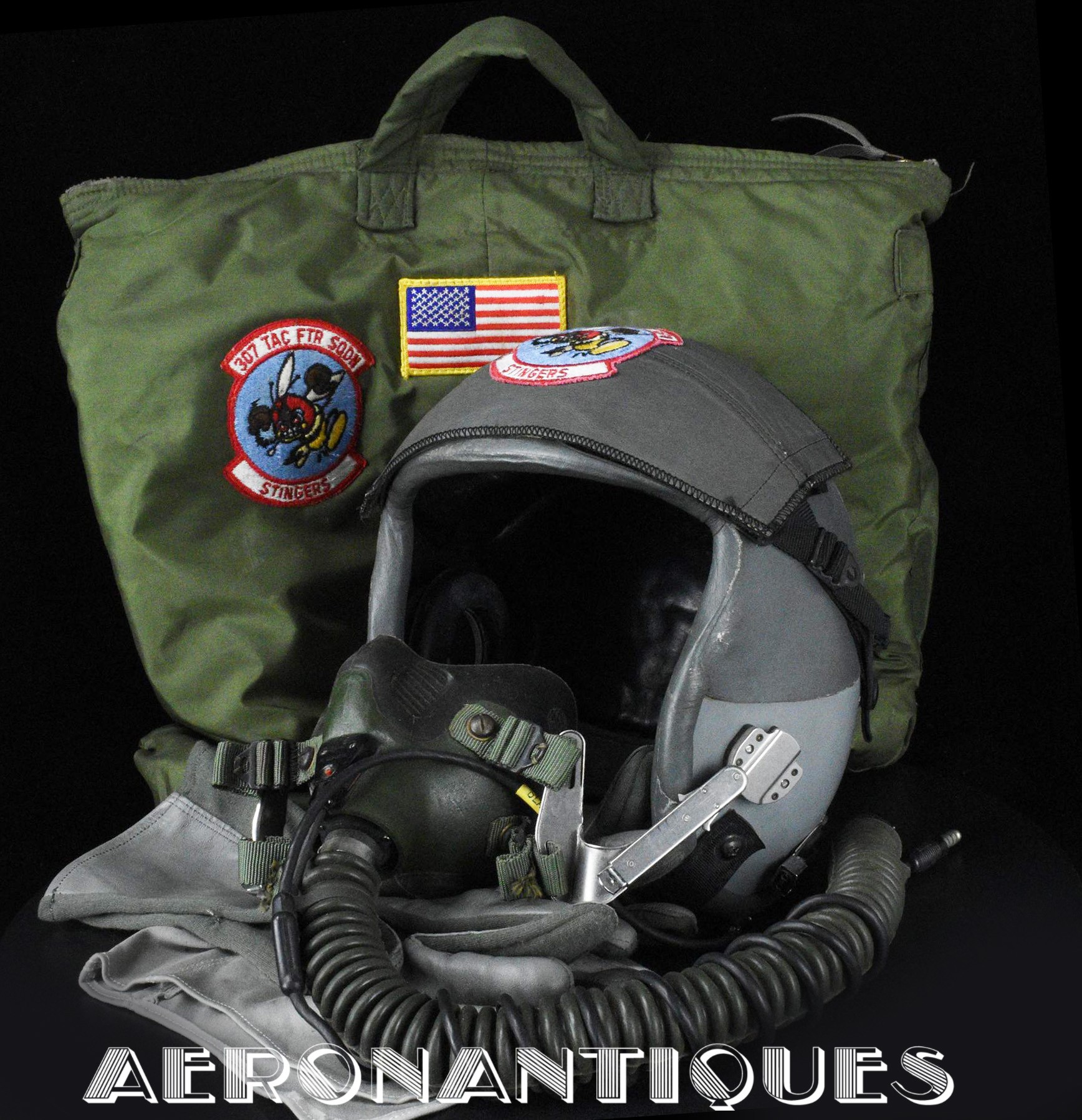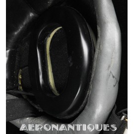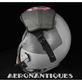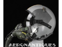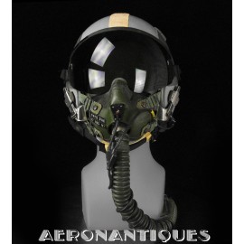Ensemble casque et masque à oxygène d'un pilote de F-16 du 307th Tactical Fighter Squadron de l'US Air Force, circa milieu des années 80. Le casque est un type HGU-55/P, visière simple teintée avec découpe pour masque MBU-12/P. Taille MEDIUM. Couvre visière en cuir gris personnalisé d'un patch du 307th TFS. Écouteurs et fiche pour microphone du masque à oxygène. Liner custom sur mesure en mousse gainée de cuir noir. Le masque MBU-12/P est une fabrication SCOTT en latex vert, taille REGULAR, daté 1985. Complet avec microphone, cordon et fiche. Le buste de présentation, les gants de vol, le bonnet de protection et le sac de transport sont inclus. très belle pièce homogène.