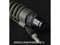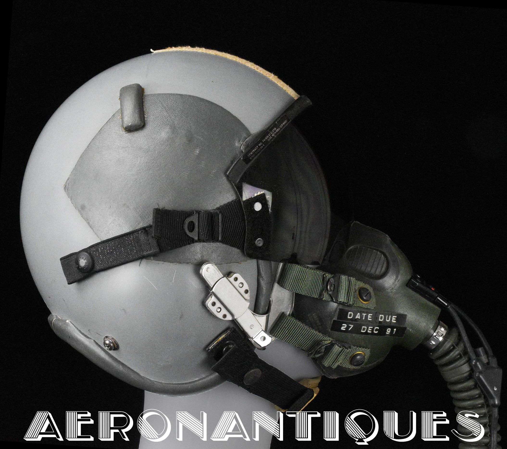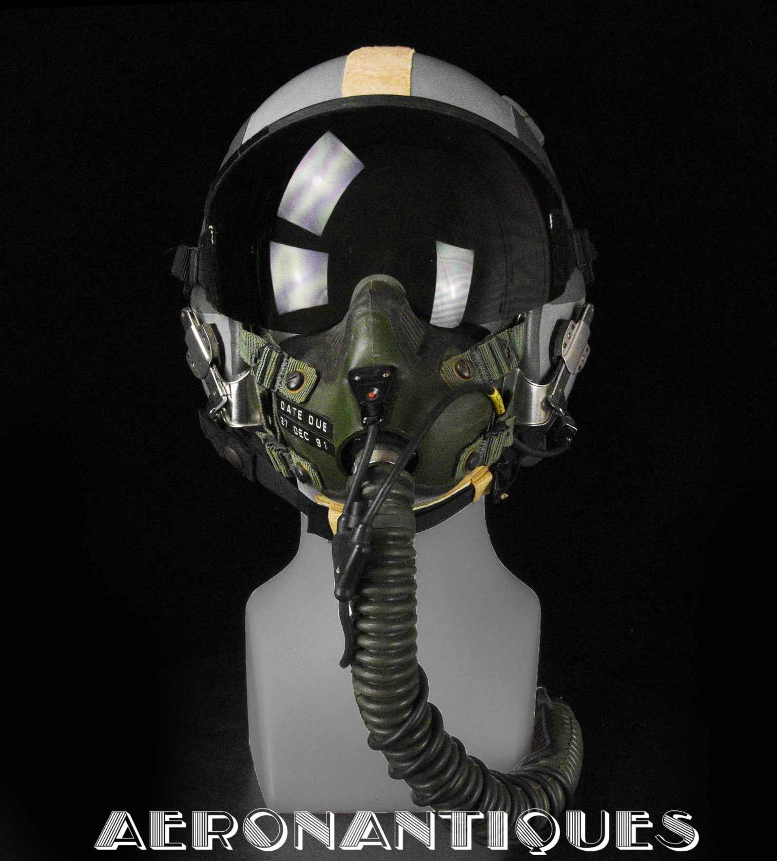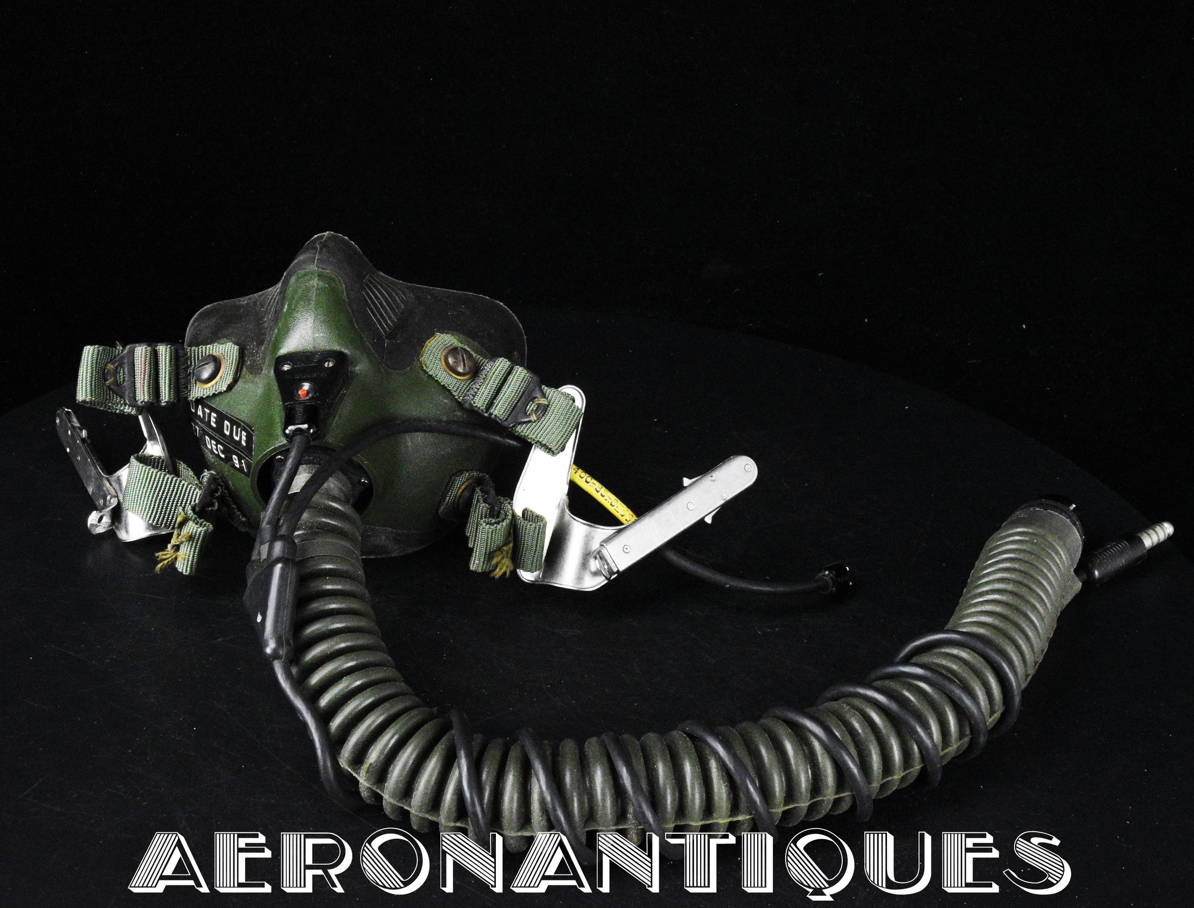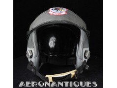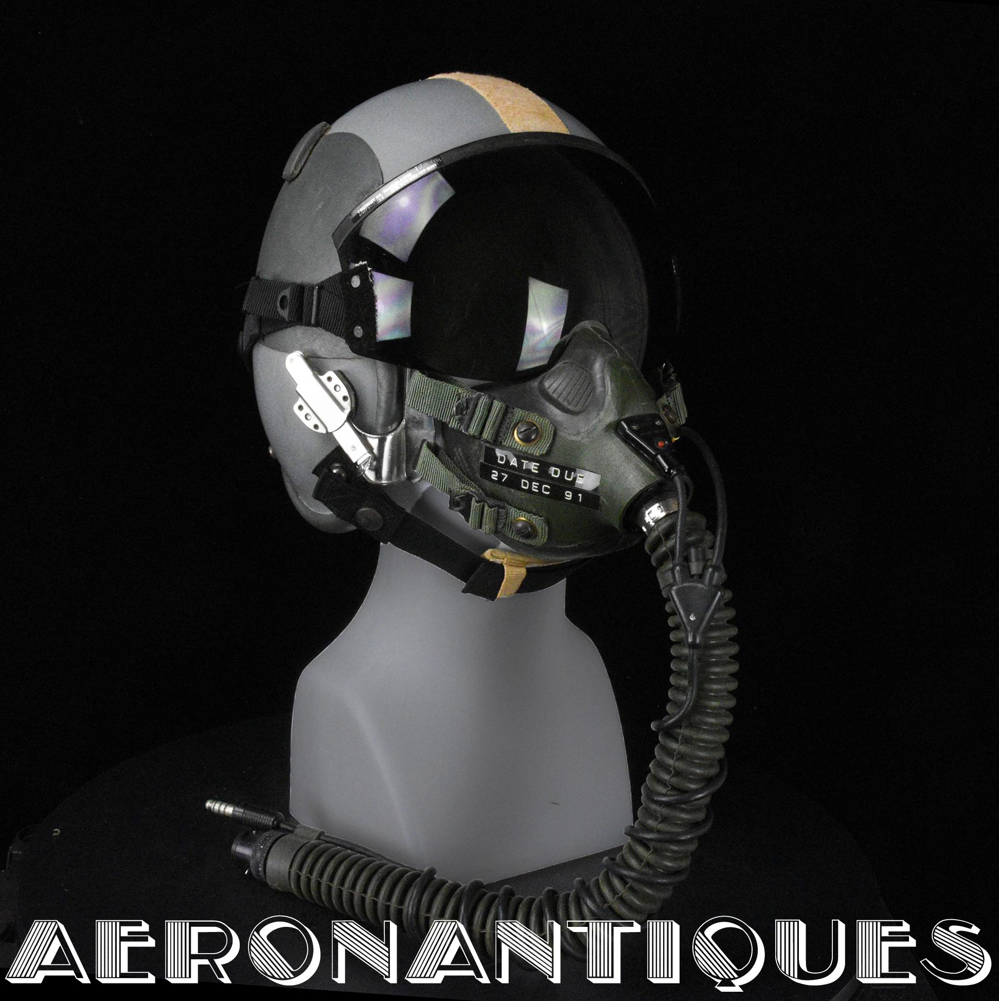 Ensemble casque et masque à oxygène d'un pilote de F-16 du 307th Tactical Fighter Squadron de l'US Air Force, circa milieu des années 80. Le casque est un type HGU-55/P, visière simple teintée avec découpe pour masque MBU-12/P. Taille MEDIUM. Couvre visière en cuir gris personnalisé d'un patch du 307th TFS. Écouteurs et fiche pour microphone du masque à oxygène. Liner custom sur mesure en mousse gainée de cuir noir. Le masque MBU-12/P est une fabrication SCOTT en latex vert, taille REGULAR, daté 1985. Complet avec microphone, cordon et fiche. Le buste de présentation, les gants de vol, le bonnet de protection et le sac de transport sont inclus. très belle pièce homogène.