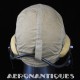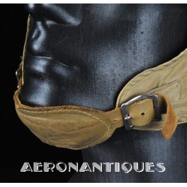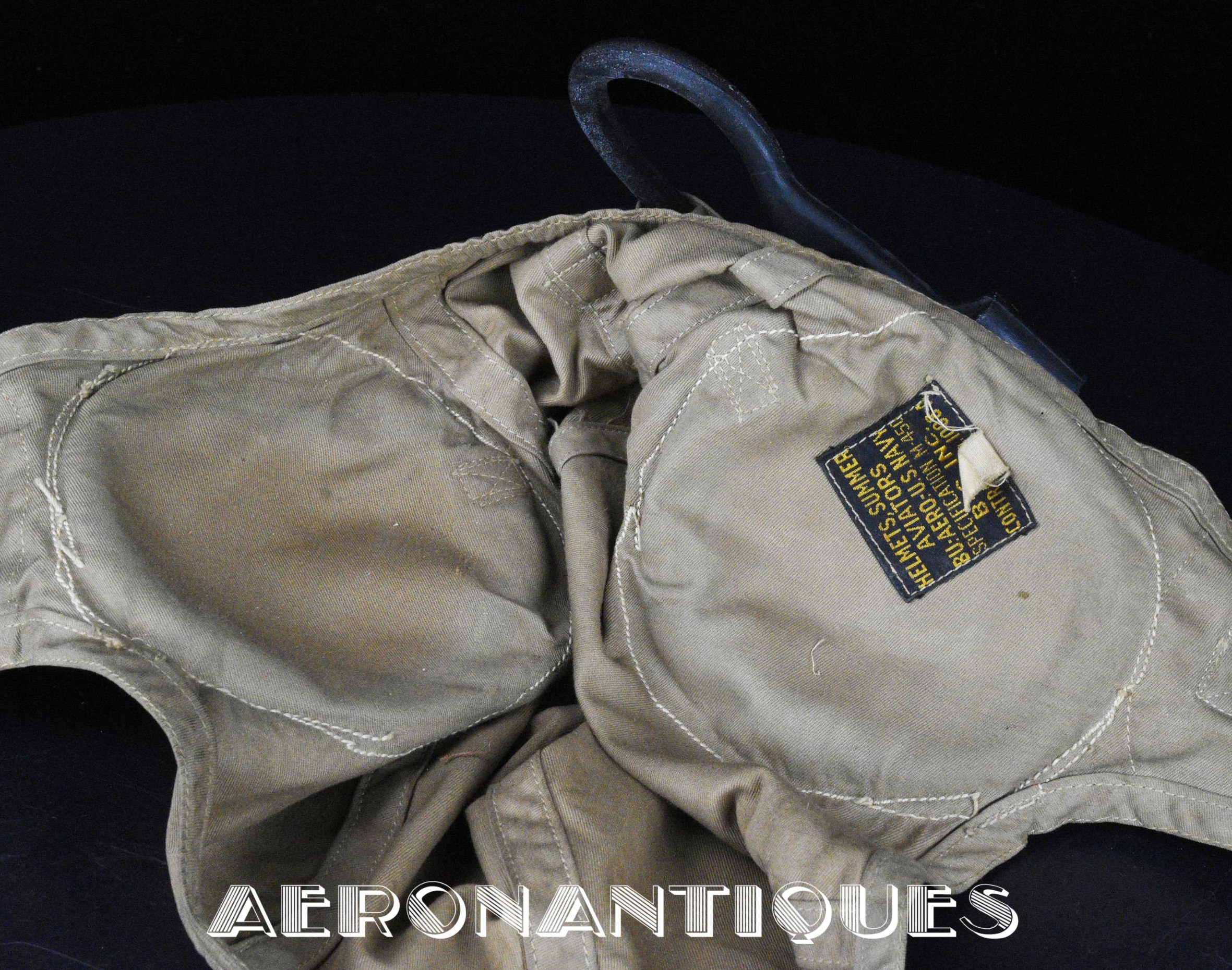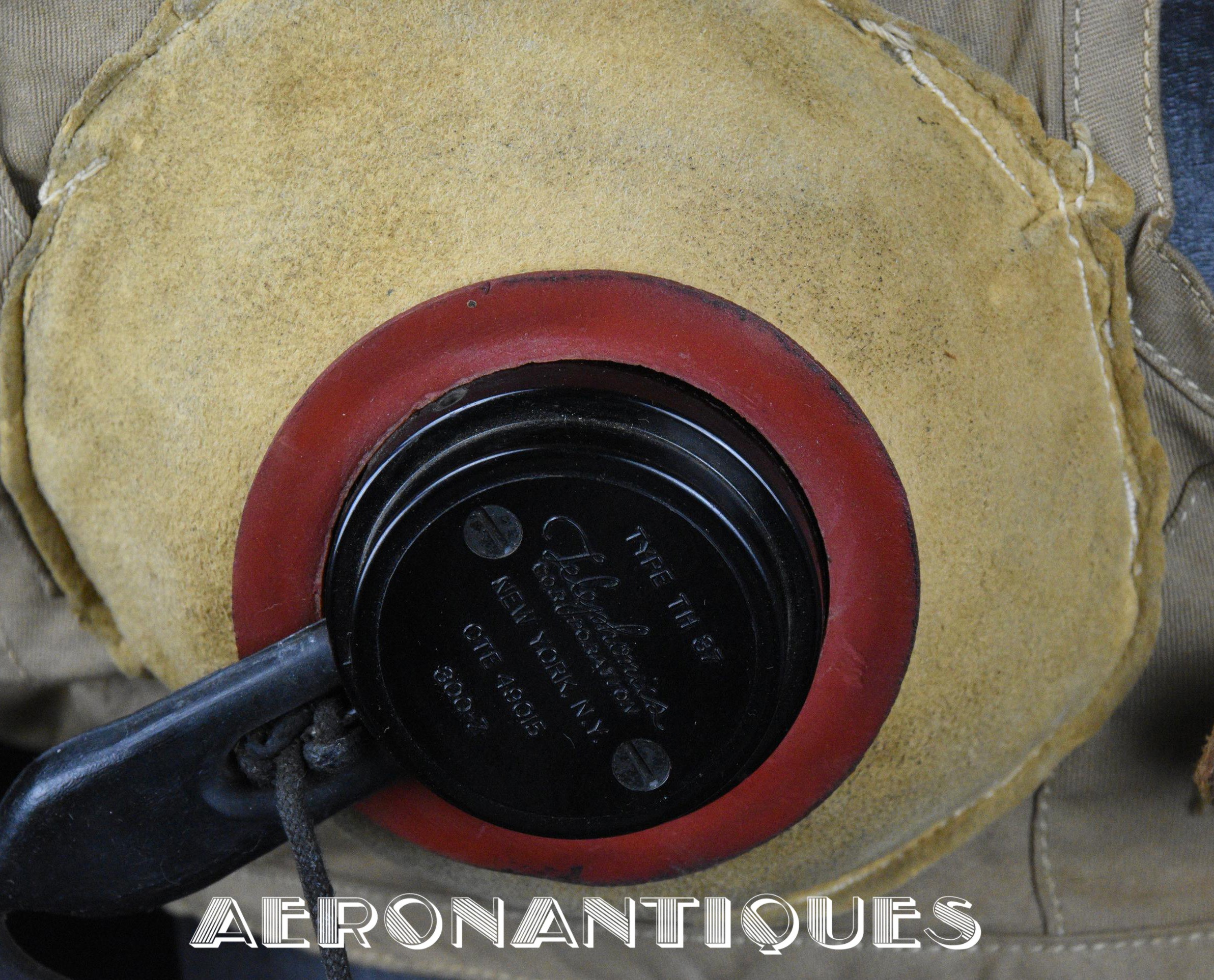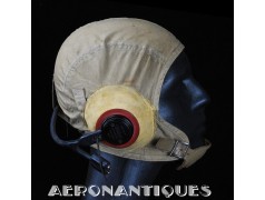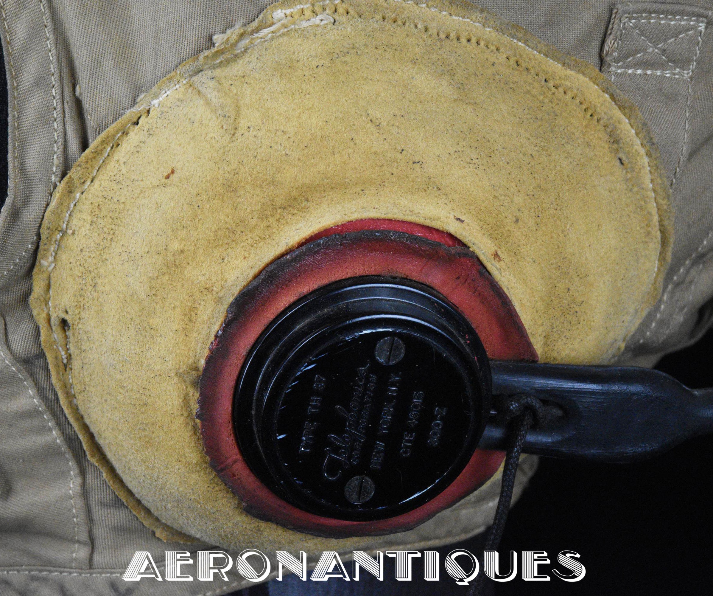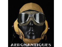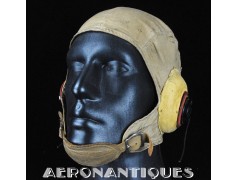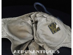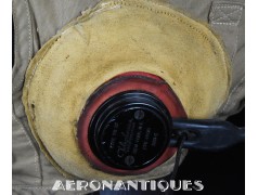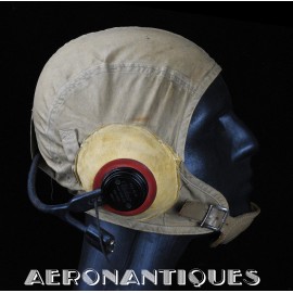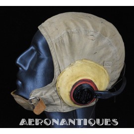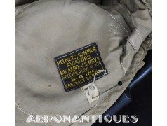 Casque de vol d'été M-450 de pilote de l'aéronavale Américaine (US Navy ou Marine Corps) de la Seconde Guerre mondiale. Fabriqué par BG INC. Modifié rigger : mentonnière avec doublure chamois (les mentonnières BG d'origine n'en sont pas dotées), coques en caoutchouc et mousse type "TC-66" recouvertes de chamois et écouteurs TH-37 de TELEPHONICS. Taille 7 3/8 (58-59 cm). Lunettes et tête de présentation non incluses. Pièce emblématique de l'équipement des pilotes de chasse de l'aéronavale de la Seconde Guerre mondiale.