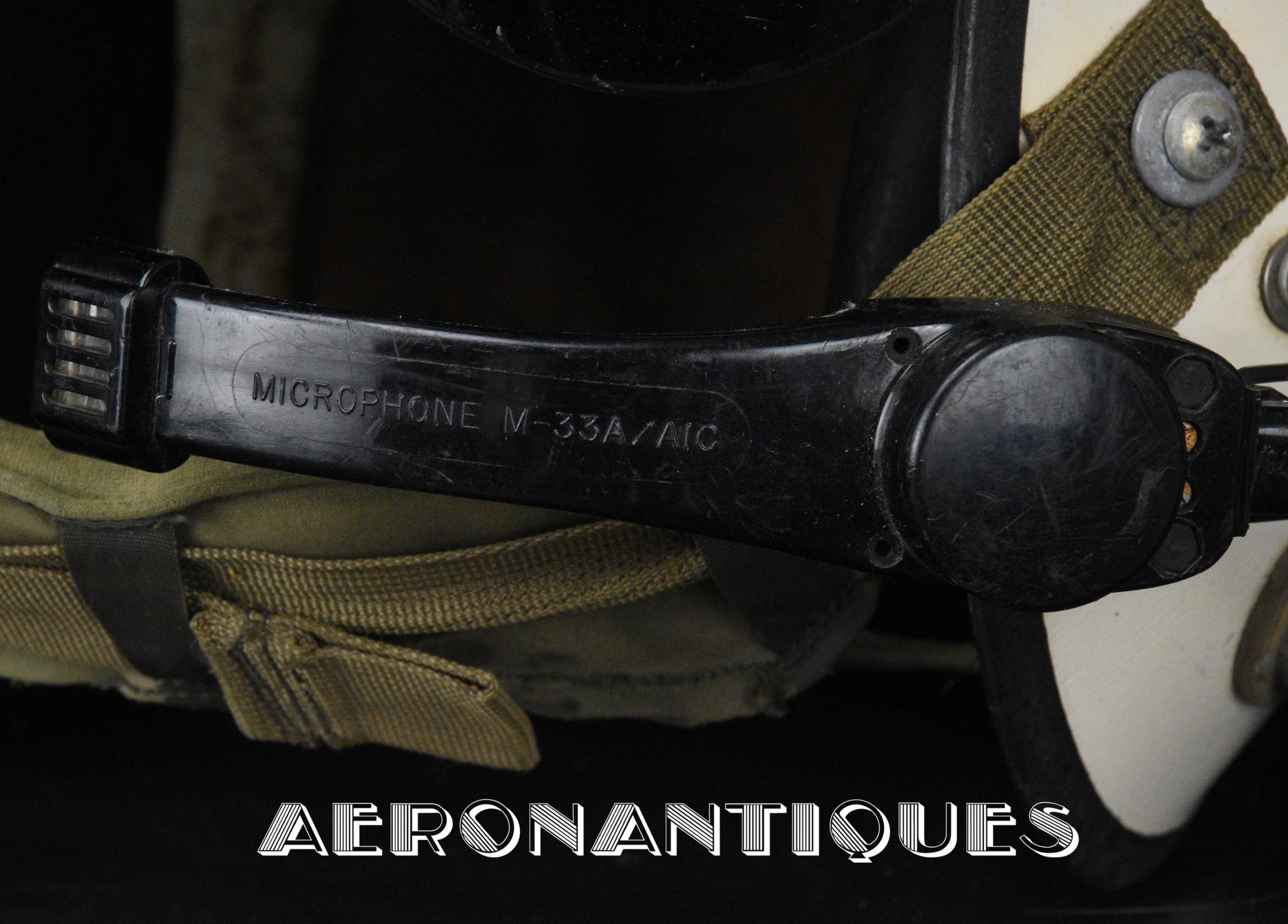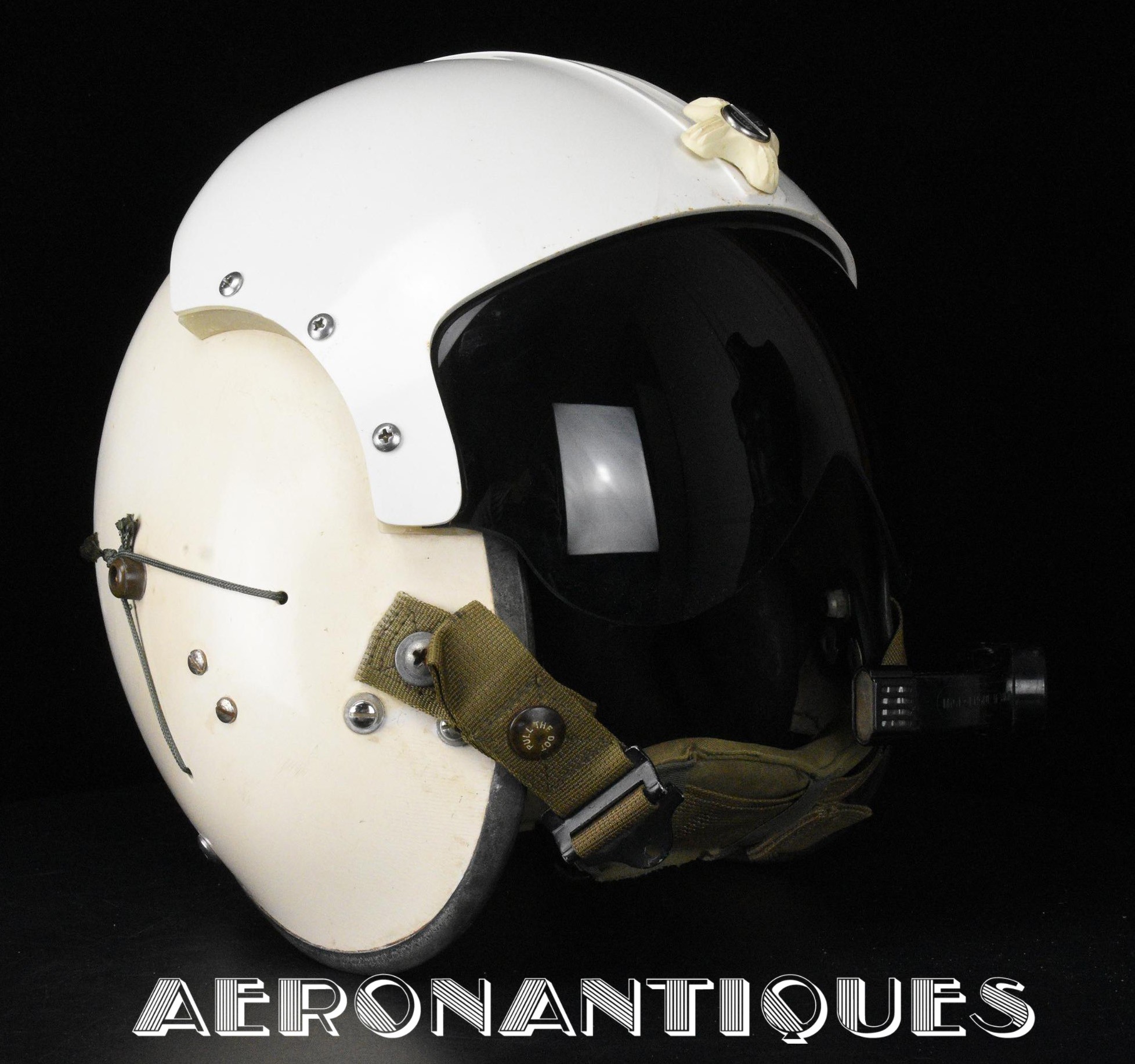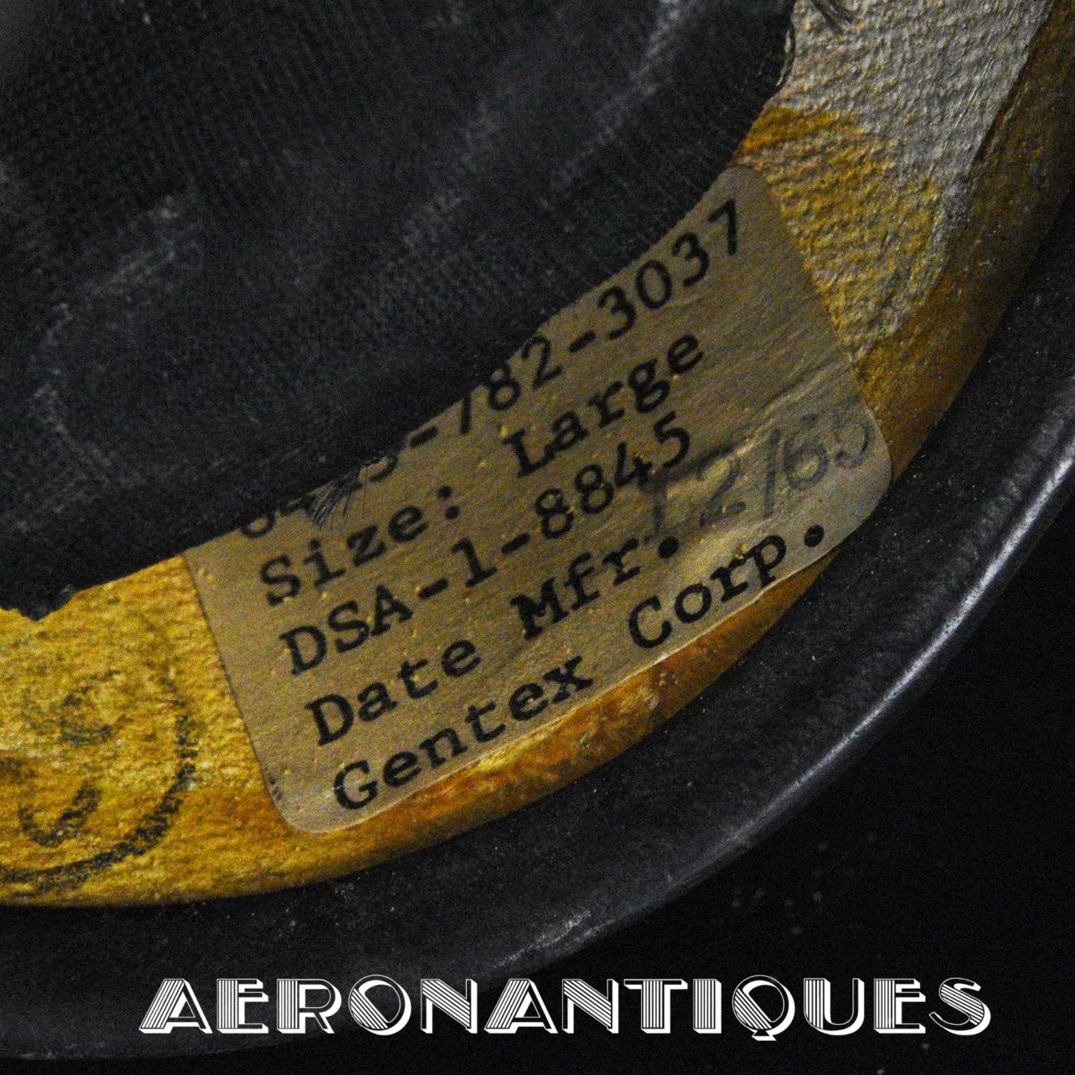 Casque de pilote d'hélicoptère de l'US Army, modèle APH-5A, fabrication GENTEX, daté 12/65. 2nd modèle avec couvre visière en plastique teint dans la masse. Taille "LARGE". Absolument complet avec microphone, écouteurs (avec leurs protections d'origine), cordon et fiche U-93A/U. Tampon amortisseurs recouverts de cuir. Visière rétractable teintée. Excellent état. Caractéristique des équipements des équipages d'hélicoptère pendant les premières années de la guerre du Vietnam. Dans un premier temps les pilotes peindront ces casques en vert OG-107 pour des raisons évidentes de camouflage avant l'arrivée des modèles déjà camouflés à partir de 1966-67. Également inclus le sac de transport d'origine.