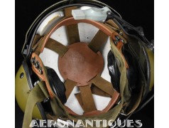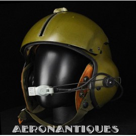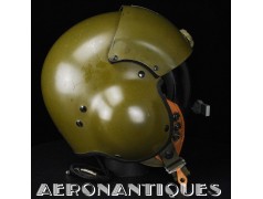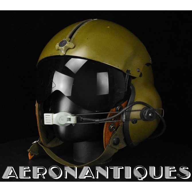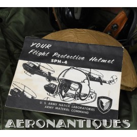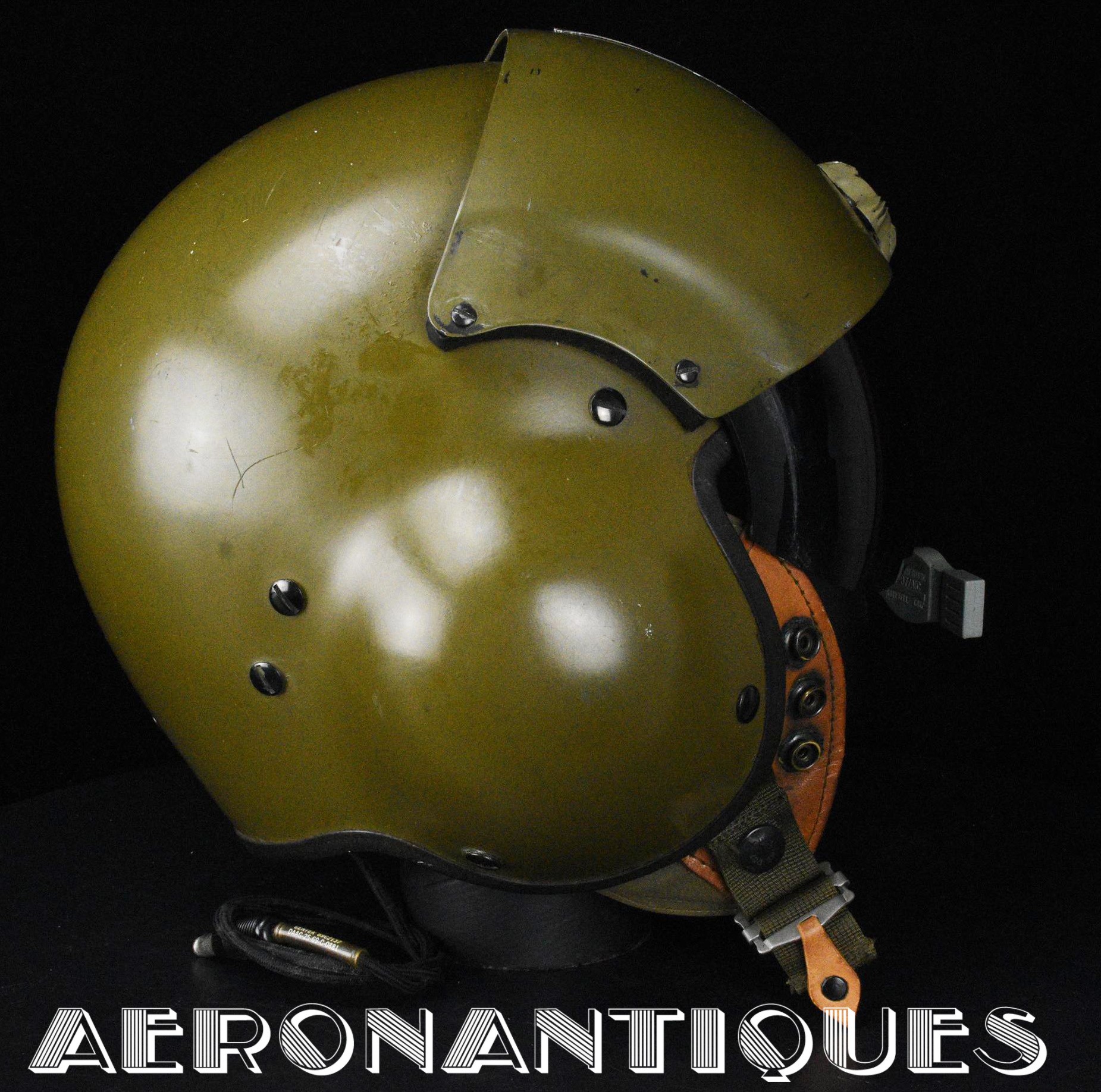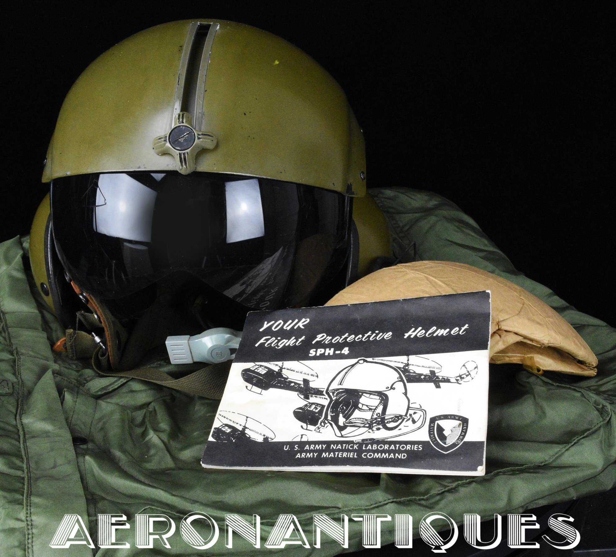 Casque de pilote d'hélicoptère de l'US Army, modèle SPH-4, fabrication GENTEX, daté 1969. Premier modèle (1969-1974). Taille "REGULAR". Complet avec coiffe intérieur nylon et cuir, suspension, microphone, écouteurs, cordon et fiche. Visière rétractable teintée fonctionnelle avec virole de sécurité. Également inclus le sac de transport d'origine, une visière de rechange ainsi que la notice d'utilisation. Conçu pour réduire les nuisances sonores comme l'indiquent les deux premières lettres de sa dénomination (Sound Protection), le modèle SPH-4 ne présentait pas une protection supérieures aux chocs à son prédécesseur de la série APH. Pièce mythique et caractéristique des équipements des équipages d'hélicoptère pendant la guerre du Vietnam. Très bon état.
