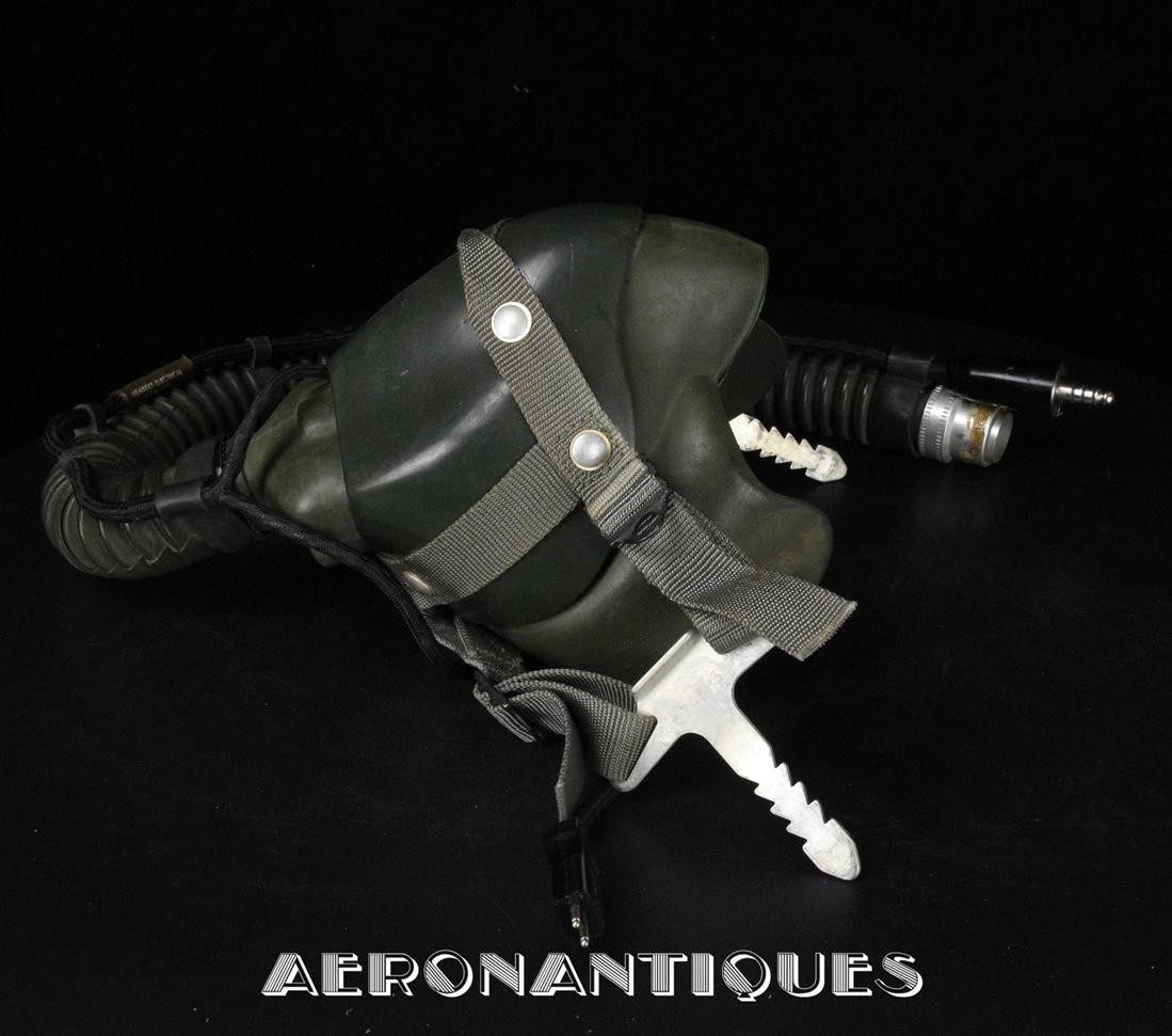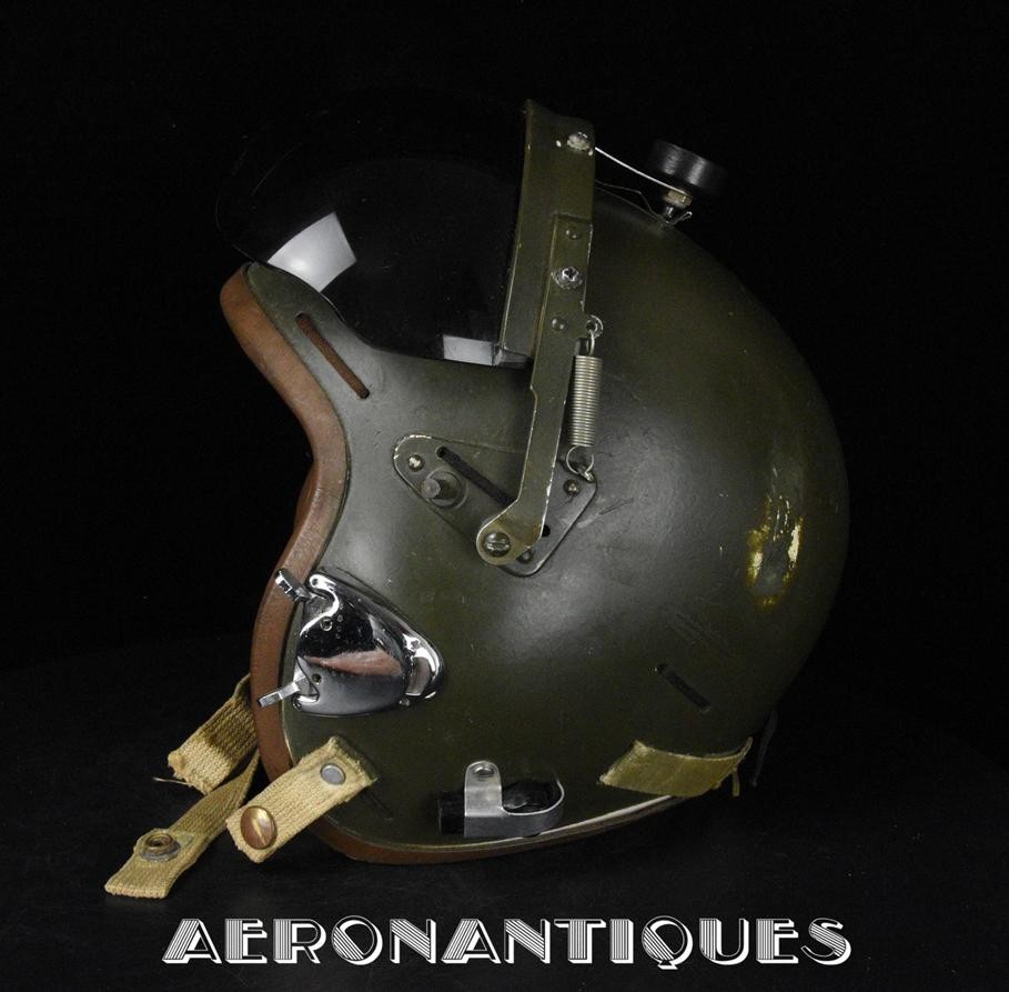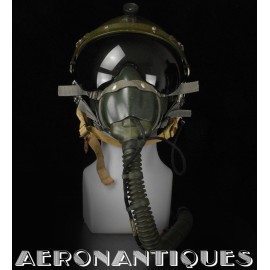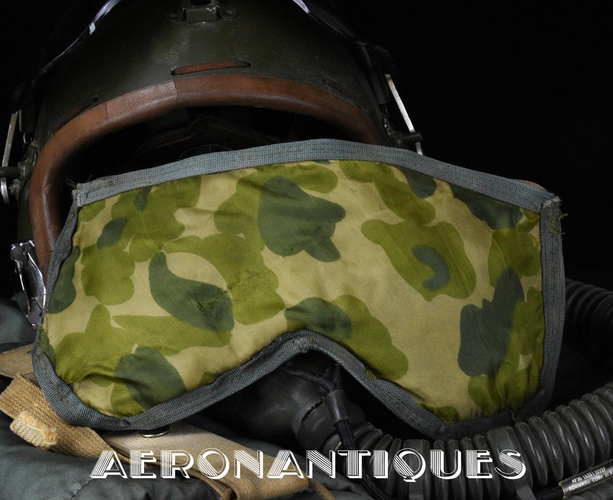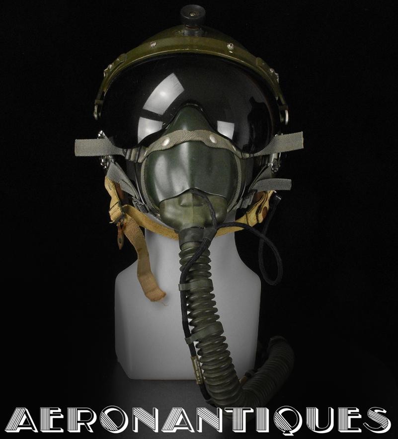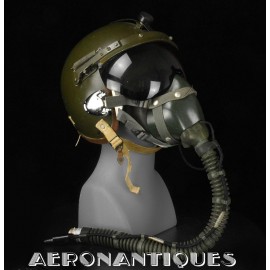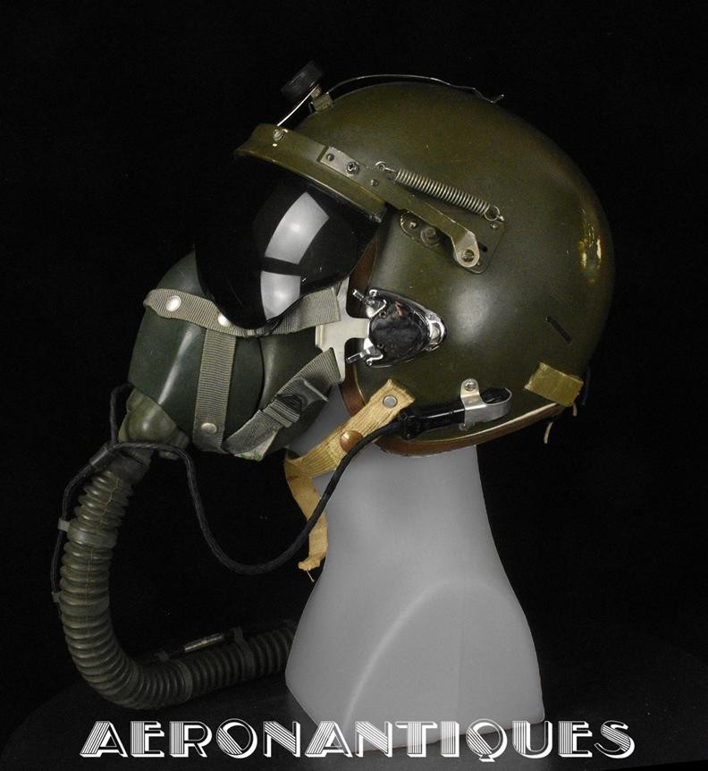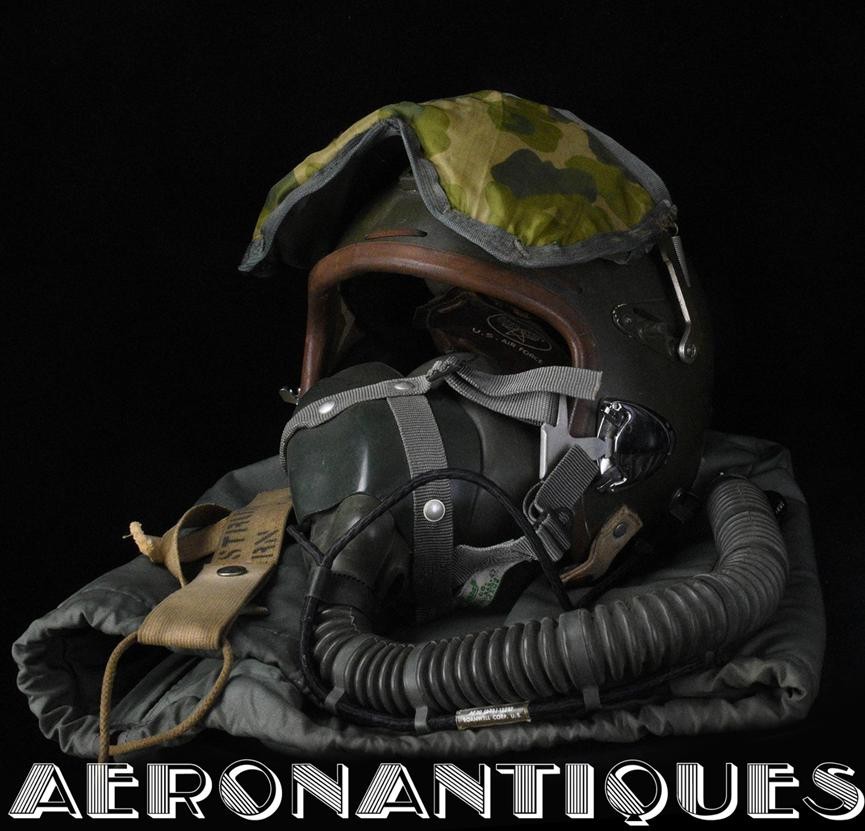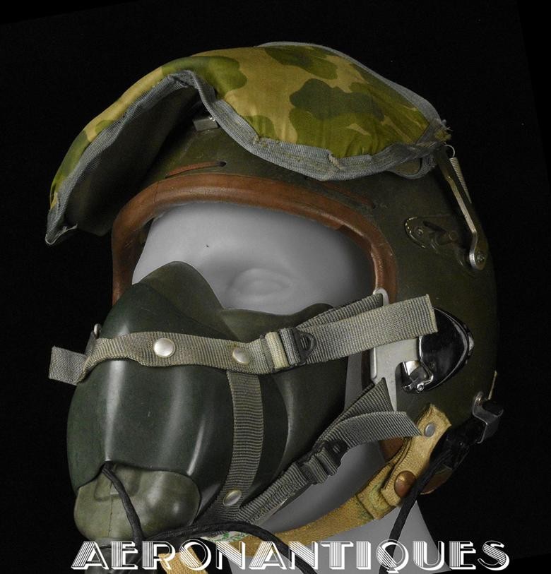 Casque modèle P-4B, taille LARGE fabrication CONSOLIDATED CONTROL CORP. daté 1959. Visière amovible teintée avec rail de guidage. La visière a été retaillée réglementairement pour s'adapter à la coque rigide "HARDMAN". Le casque est complet avec ses écouteurs H-149 et fiche pour le microphone du masque à oxygène, suspension en cuir et nylon. La bombe a été camouflée en Olive Drab Federal Standard 34087. Également un couvre visière a été fabriqué à partir de toile de parachute camouflée. Il s'agit de la première version avec attaches Hardman chromées qui seront vite remplacées par les modèles en fonte d'aluminium destinées au MBU-5 nouvellement conçu. Le modèle P-4B est la dernière évolution des séries P, produit pendant moins d'un an, il sera remplacé dès 1960 par le modèle HGU-2. C'est un vrai modèle P-4B, pas un modèle P-4A modifié comme l'indique l'absence d'orifice de sortie du cordon de communication à l'arrière de la bombe. Également inclus le masque à oxygène MBU-3/P daté 1956, taille LARGE avec coque rigide HARDMAN et attaches "christmas trees". Très bel ensemble parfaitement homogène. Unité non identifiée du tout début de la Guerre du Vietnam, possiblement un ensemble attribué à un pilote/co-pilote de B-52 ou RF-101 Voodoo, avant que les camouflages SEA soient mis en service dans l'US Air Force. Les missions de reconnaissance au-dessus du Laos sur RF-101 ont commencé dès 1960. Buste de présentation et sac de transport inclus.