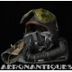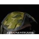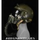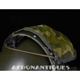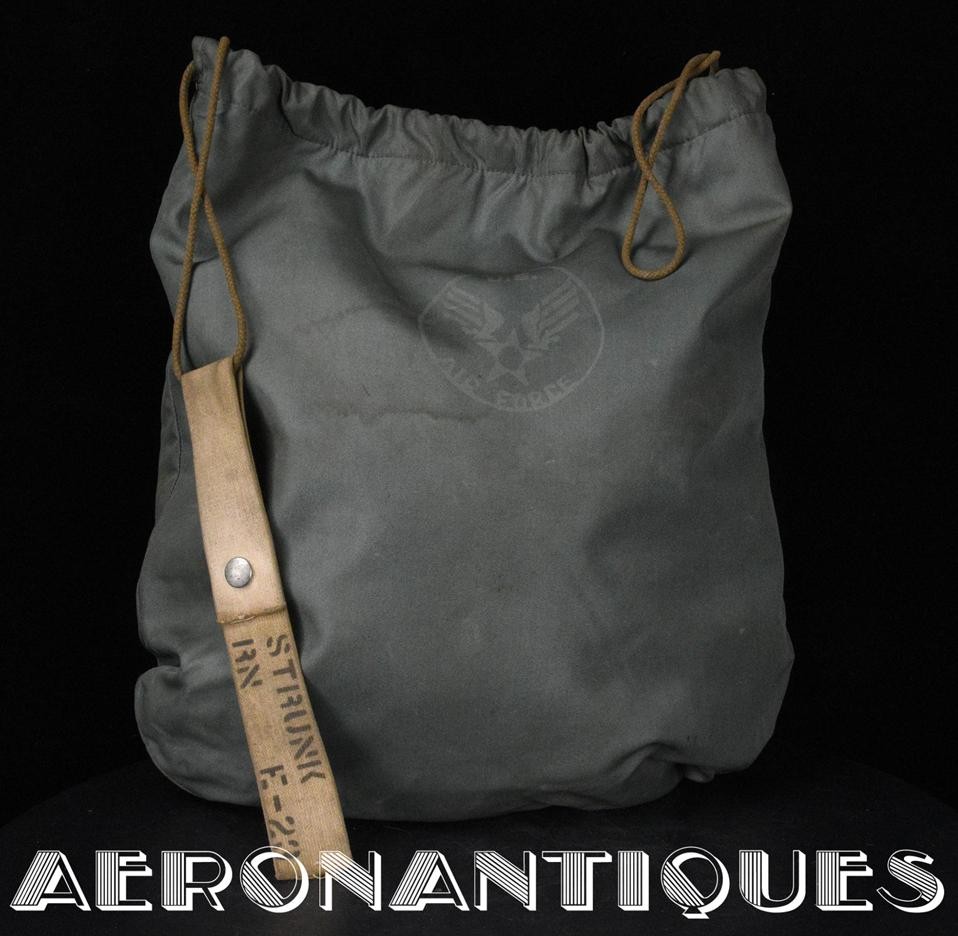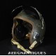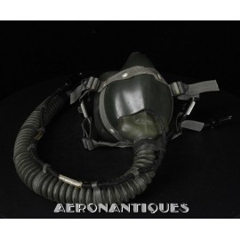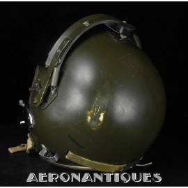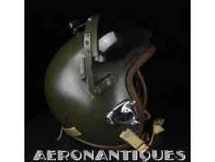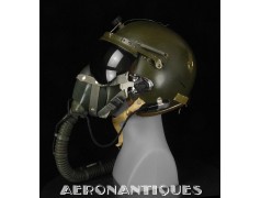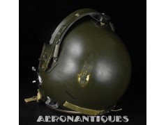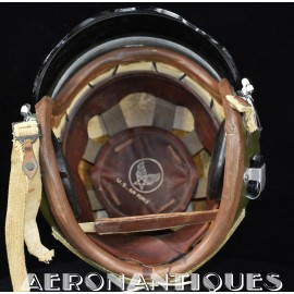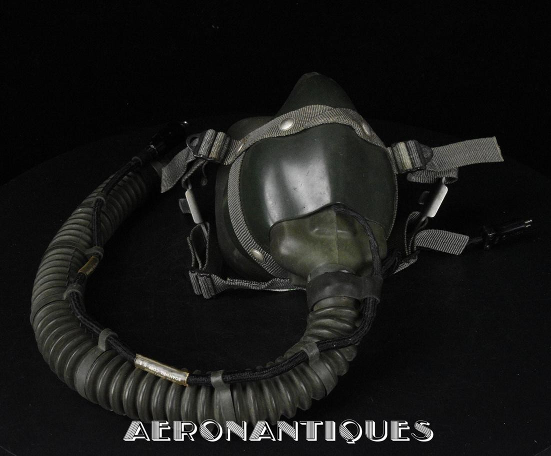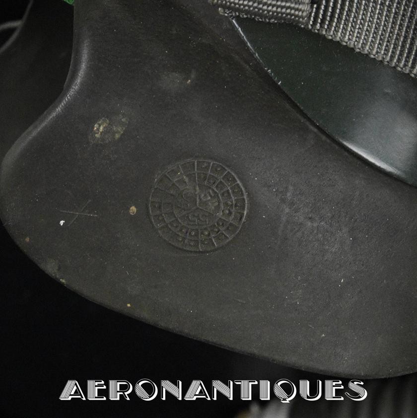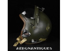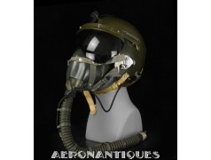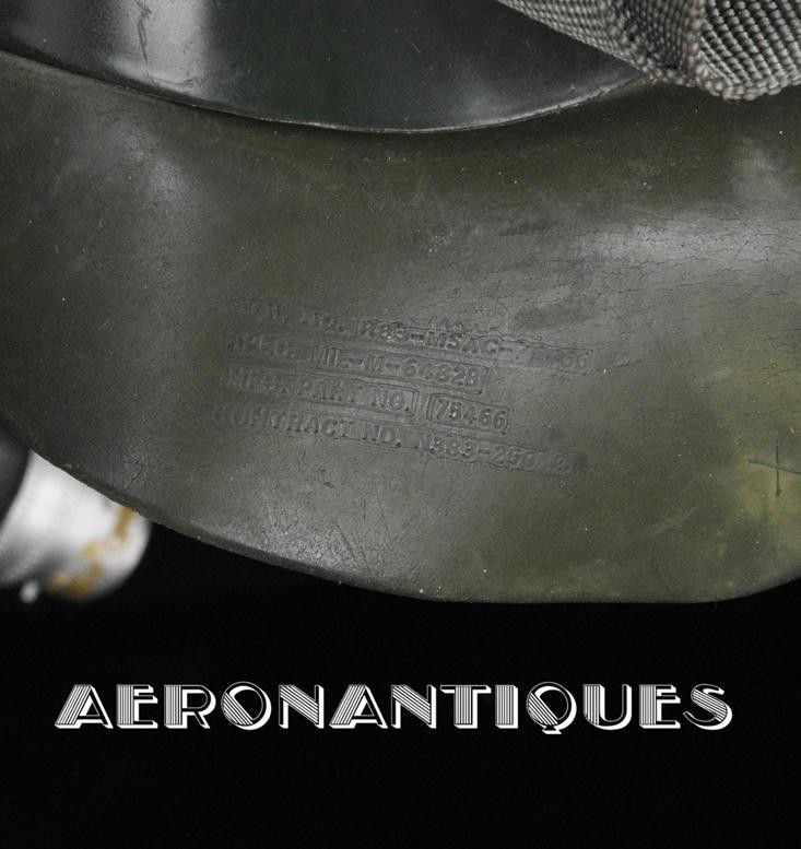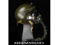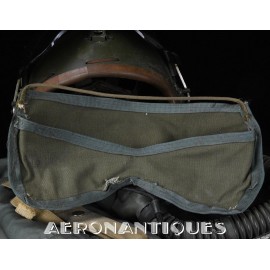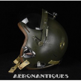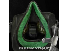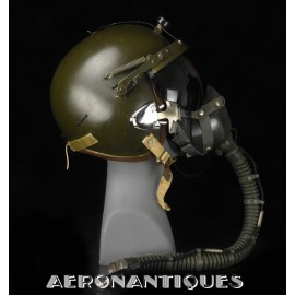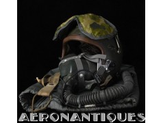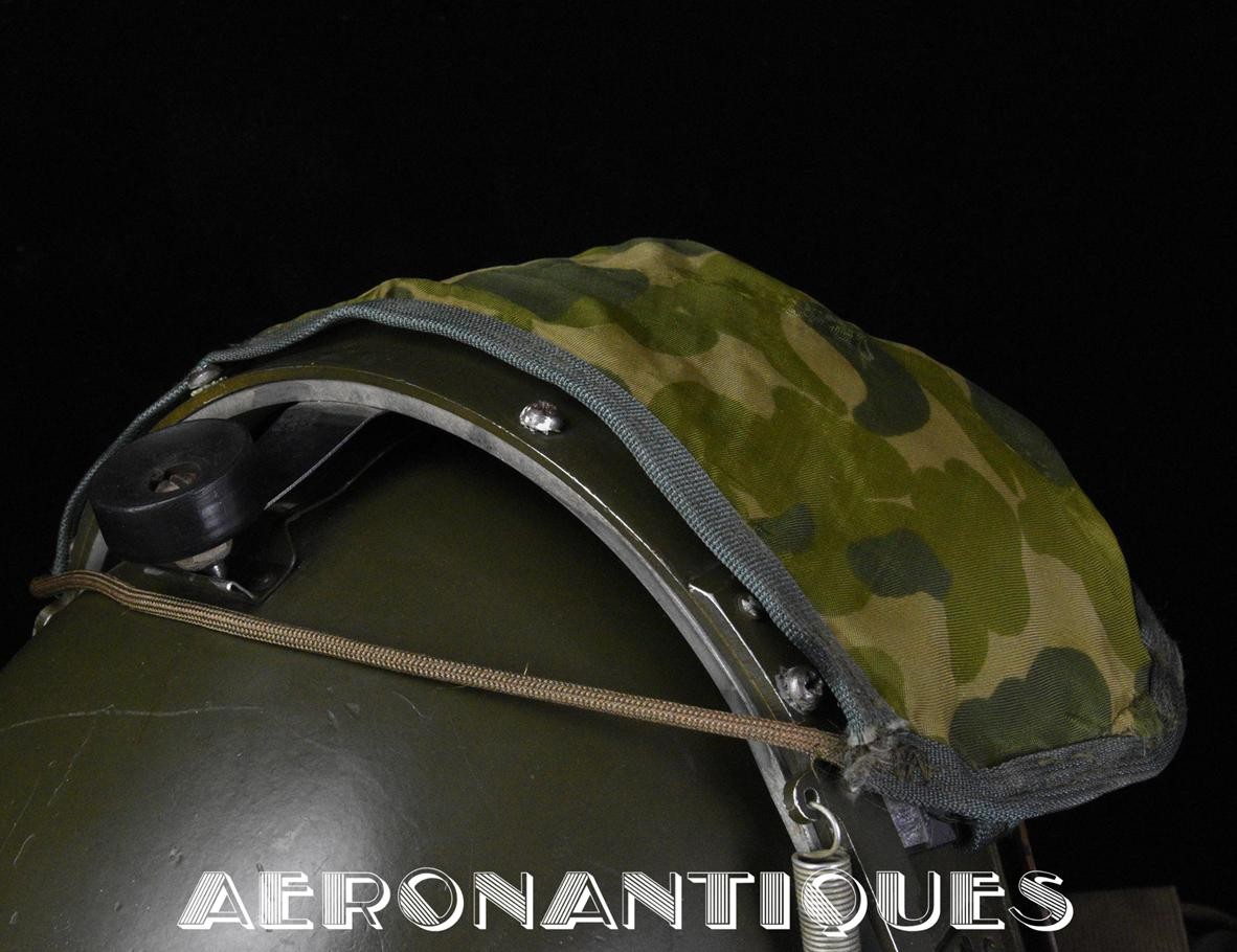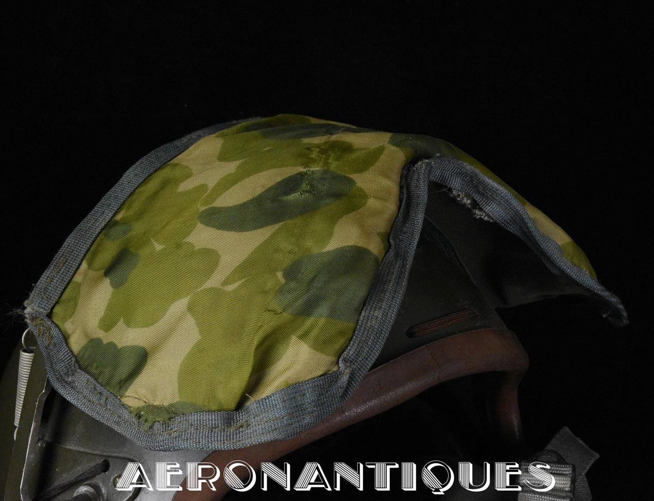 Casque modèle P-4B, taille LARGE fabrication CONSOLIDATED CONTROL CORP. daté 1959. Visière amovible teintée avec rail de guidage. La visière a été retaillée réglementairement pour s'adapter à la coque rigide "HARDMAN". Le casque est complet avec ses écouteurs H-149 et fiche pour le microphone du masque à oxygène, suspension en cuir et nylon. La bombe a été camouflée en Olive Drab Federal Standard 34087. Également un couvre visière a été fabriqué à partir de toile de parachute camouflée. Il s'agit de la première version avec attaches Hardman chromées qui seront vite remplacées par les modèles en fonte d'aluminium destinées au MBU-5 nouvellement conçu. Le modèle P-4B est la dernière évolution des séries P, produit pendant moins d'un an, il sera remplacé dès 1960 par le modèle HGU-2. C'est un vrai modèle P-4B, pas un modèle P-4A modifié comme l'indique l'absence d'orifice de sortie du cordon de communication à l'arrière de la bombe. Également inclus le masque à oxygène MBU-3/P daté 1956, taille LARGE avec coque rigide HARDMAN et attaches "christmas trees". Très bel ensemble parfaitement homogène. Unité non identifiée du tout début de la Guerre du Vietnam, possiblement un ensemble attribué à un pilote/co-pilote de B-52 ou RF-101 Voodoo, avant que les camouflages SEA soient mis en service dans l'US Air Force. Les missions de reconnaissance au-dessus du Laos sur RF-101 ont commencé dès 1960. Buste de présentation et sac de transport inclus.