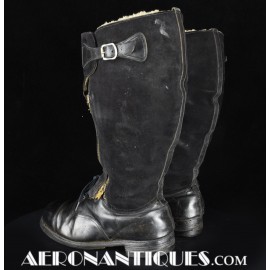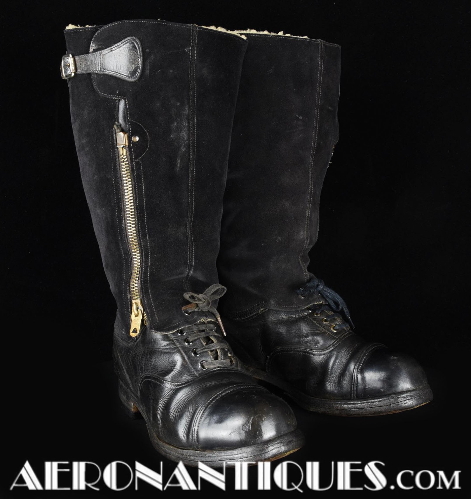 Bottes de vol de pilote de la Royal Air Force Pattern 43 plus connue sous le nom de "Escape Boots". Modèle réglementaire avec tige en mouton retourné et chaussant type richelieu à bout rapporté en cuir noir. Taille 7 ou 7 1/2 correspondant à du 40/41 français. Fermetures à glissière estampillée A.M (AIR MINISTRY) en parfait état de marche. Semelle cuir et talon caoutchouc. Ces bottes faisaient partie de l'équipement réglementaire des pilotes de chasse et des équipages de bombardier de la RAF mais étaient également appréciées par les  pilotes Américains de la 8th Air Force pour leur confort comme en témoignent de nombreuses photos d'époque.