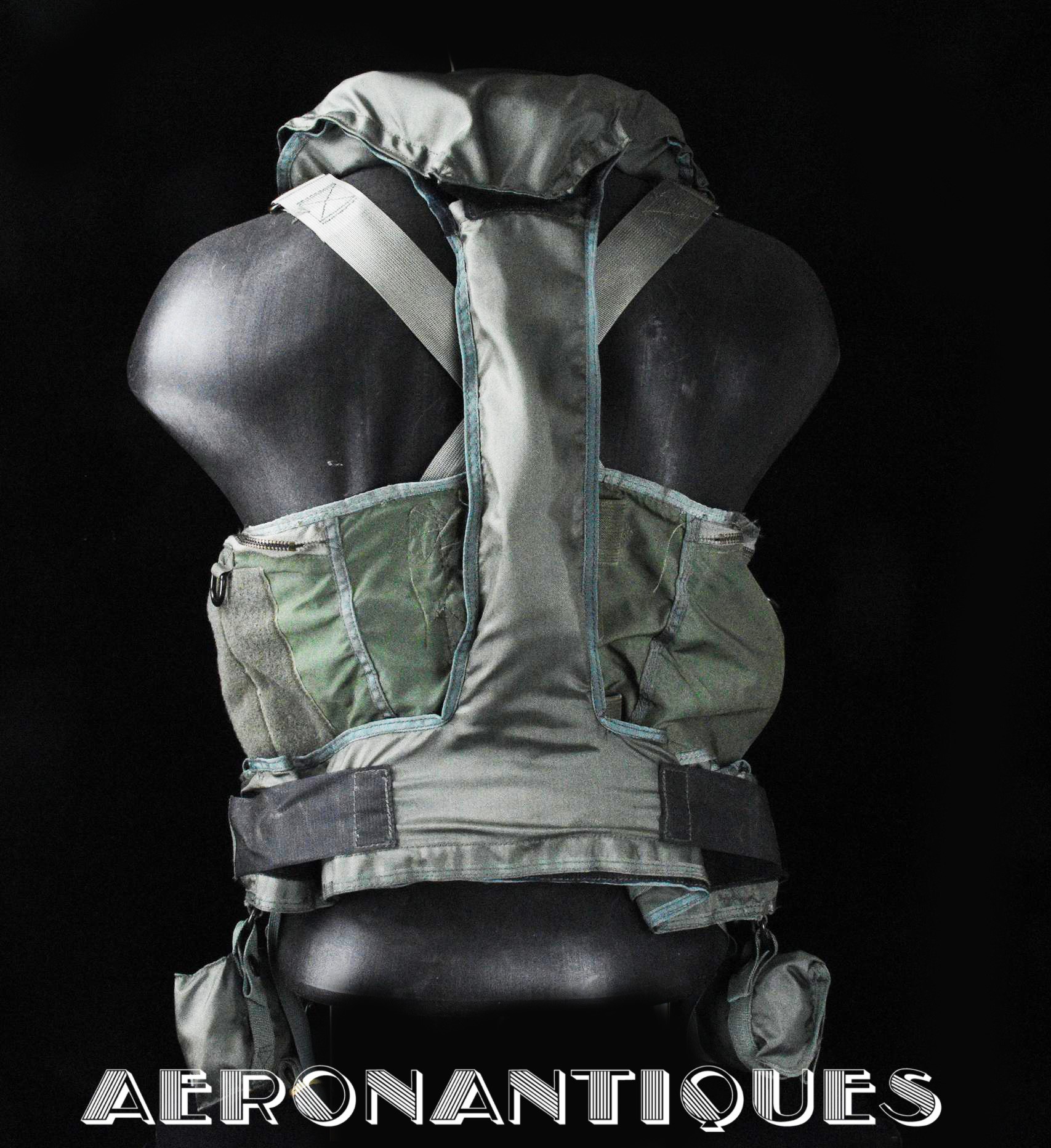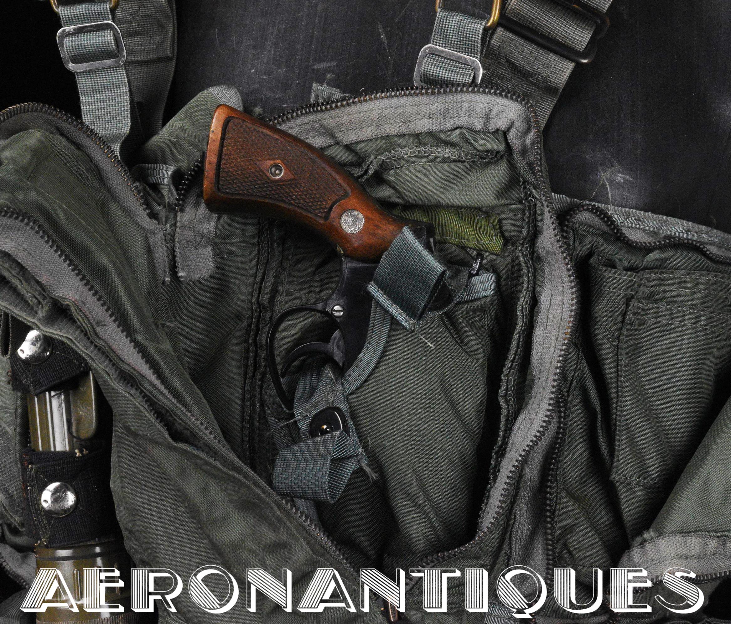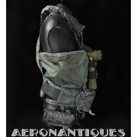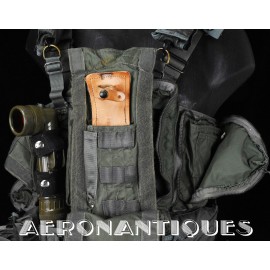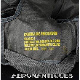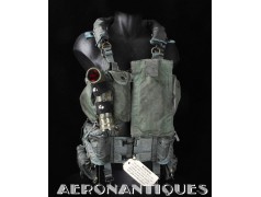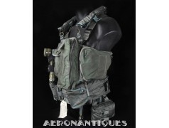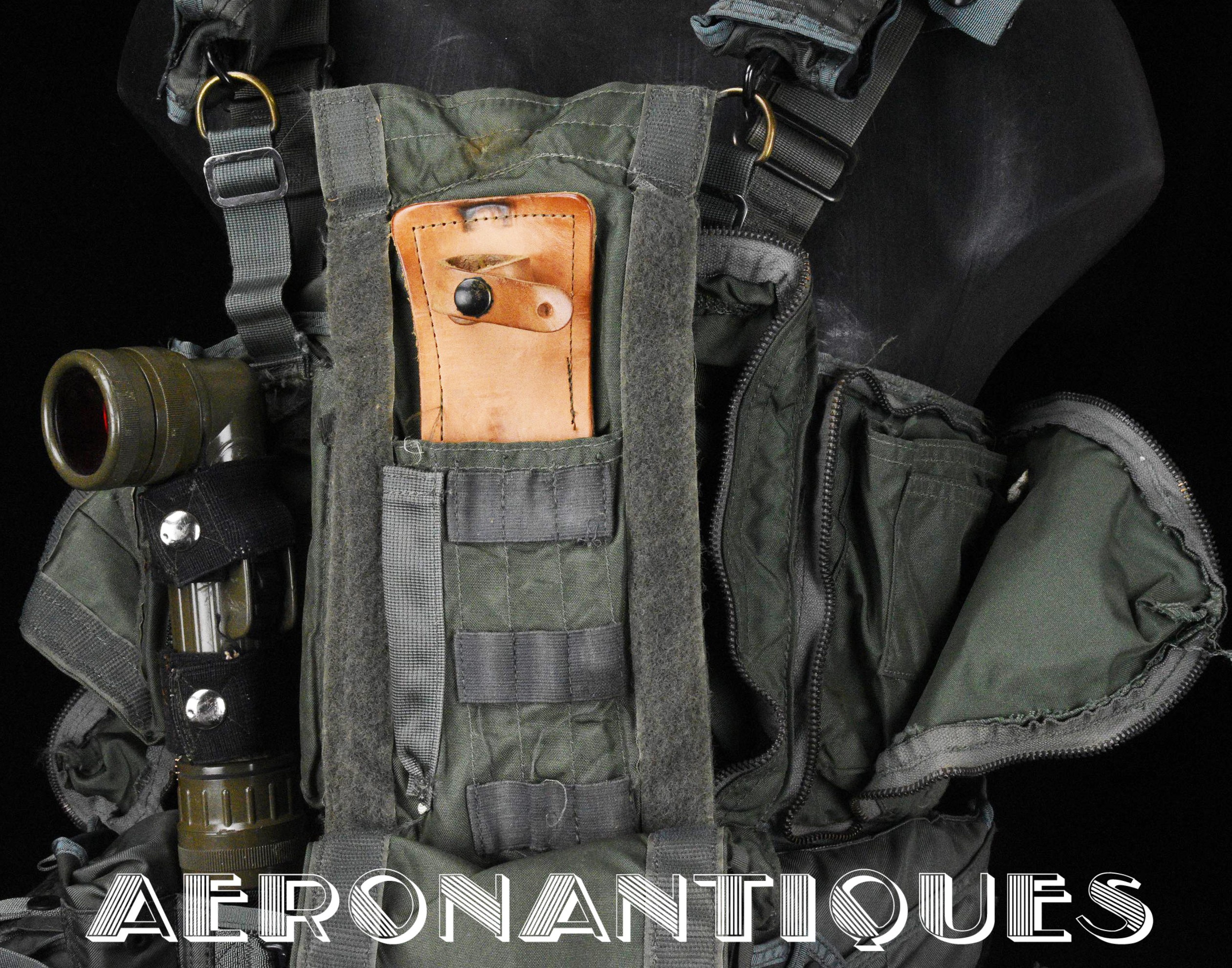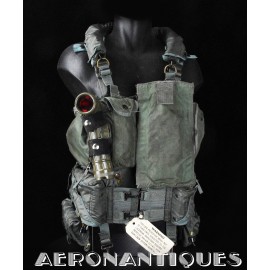 Ensemble gilet de sauvetage modèle LPA-2 et gilet de survie SV-2B. Période fin des années 70-80. Complet avec vessies de gonflage et déclencheurs. Également incluse les pochettes de colorant de repérage en mer et de fusées de détresse (vides) et la lampe coudée MX-991/U. Le gilet de survie SV-2B est dans sa configuration d'origine avec toutes ses poches, étui de couteau de survie, hilster (revolver non inclus) et sangles non coupées. Avant d'être remplacés au début des années 80 par les modèles LPU, ces gilets de sauvetage sont tous visuellement identiques pour les pilotes d'appareils équipés ou non de sièges éjectables, la seule différence résidant à l'intérieur avec la modification comprenant l'ajout du module FL-8/P à déclenchement automatique à l'eau de mer.