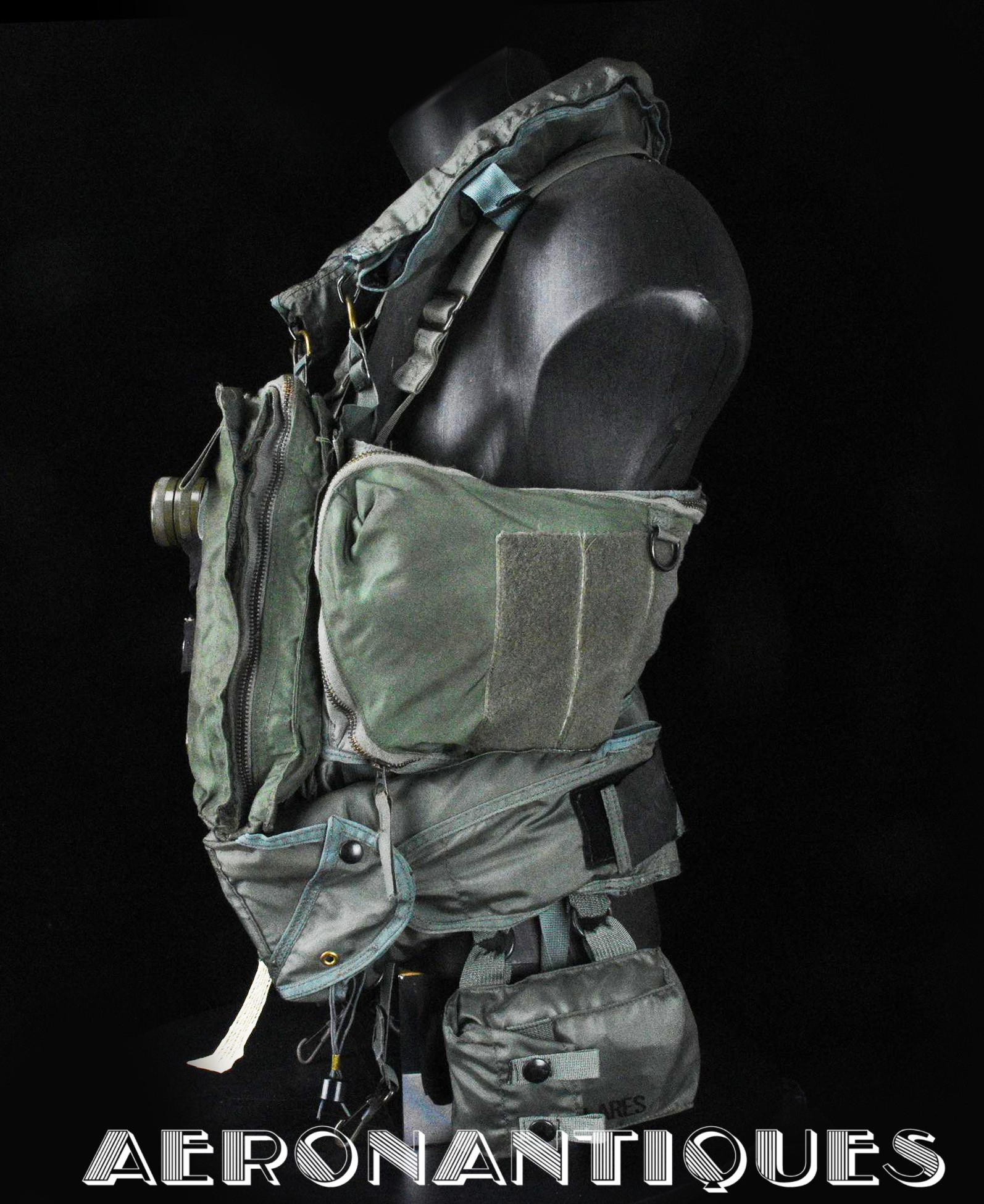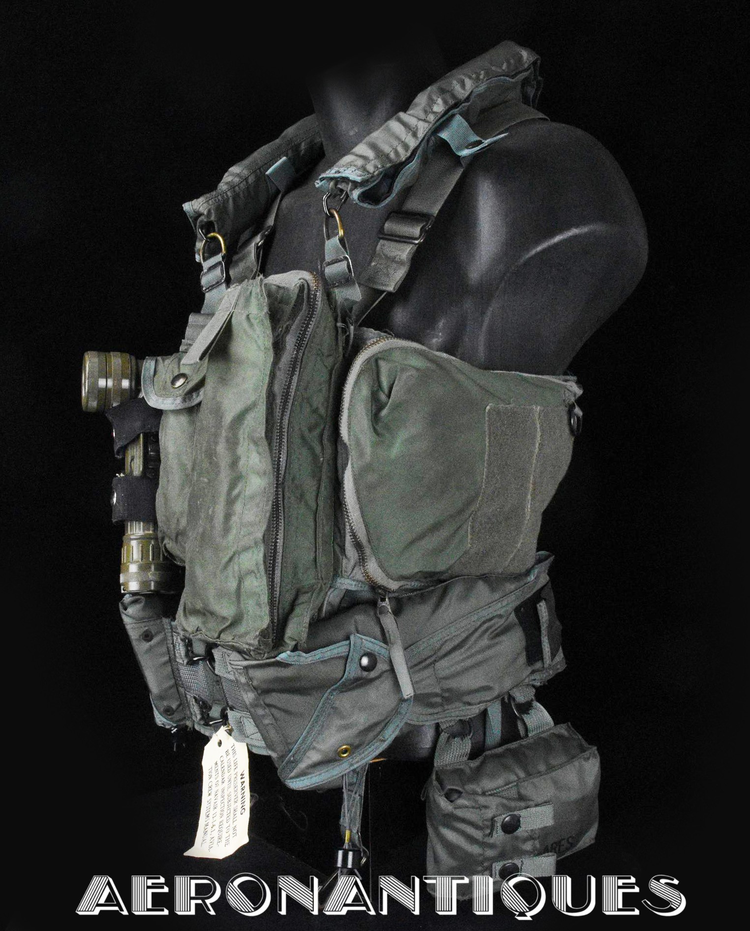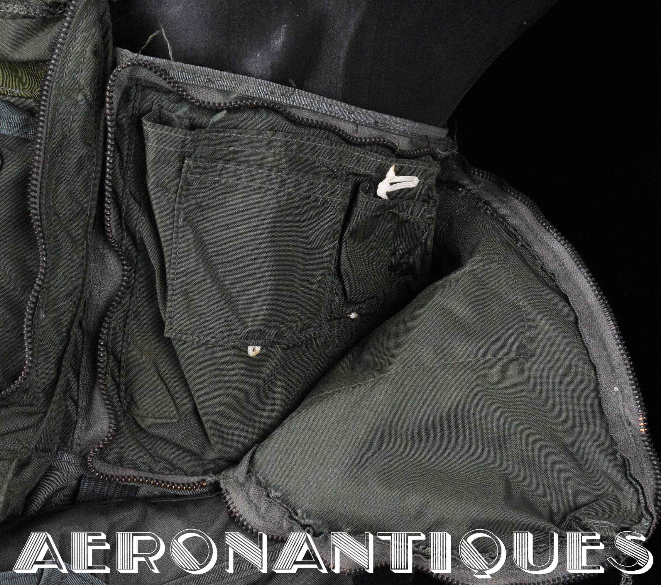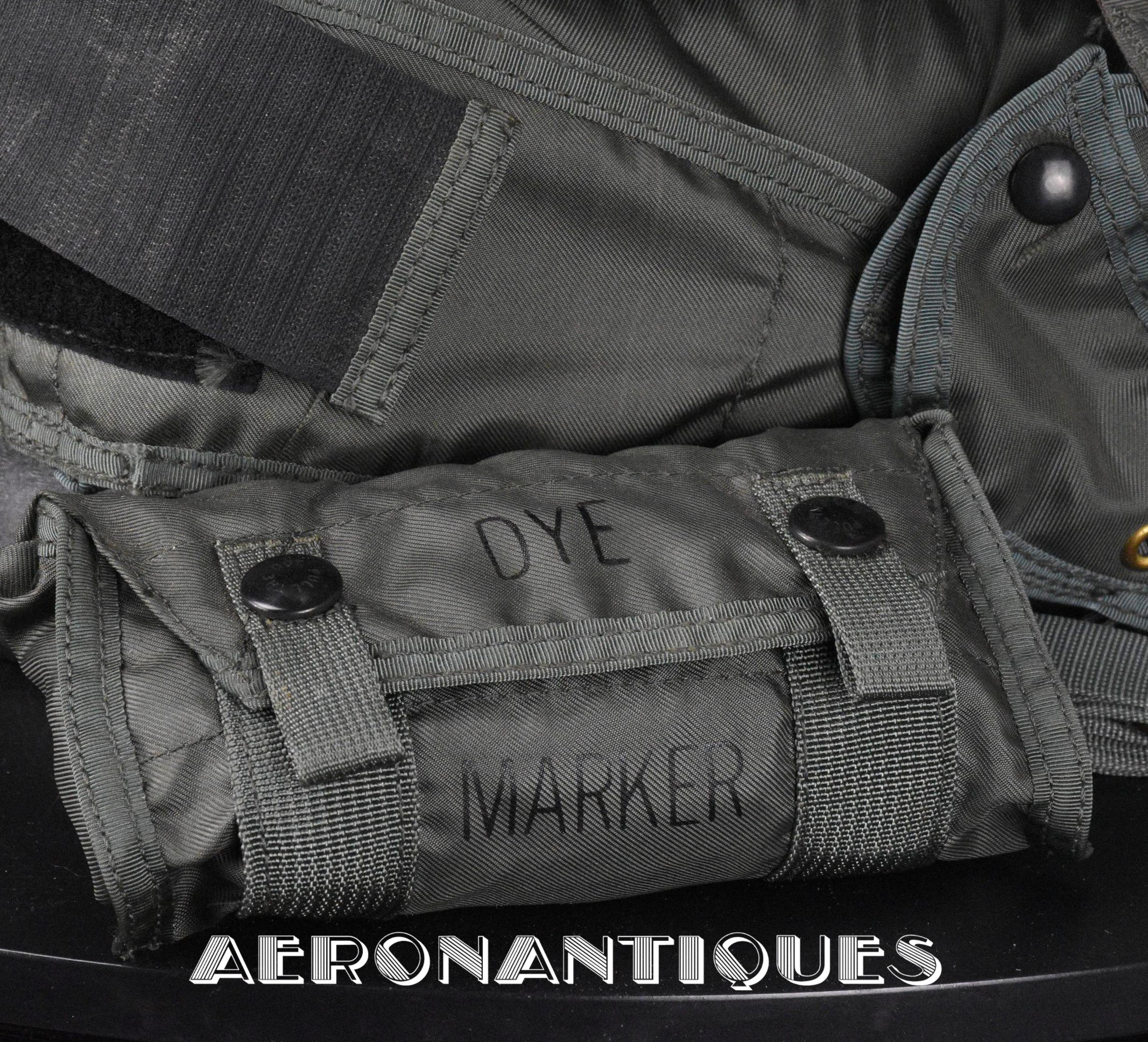 Ensemble gilet de sauvetage modèle LPA-2 et gilet de survie SV-2B. Période fin des années 70-80. Complet avec vessies de gonflage et déclencheurs. Également incluse les pochettes de colorant de repérage en mer et de fusées de détresse (vides) et la lampe coudée MX-991/U. Le gilet de survie SV-2B est dans sa configuration d'origine avec toutes ses poches, étui de couteau de survie, hilster (revolver non inclus) et sangles non coupées. Avant d'être remplacés au début des années 80 par les modèles LPU, ces gilets de sauvetage sont tous visuellement identiques pour les pilotes d'appareils équipés ou non de sièges éjectables, la seule différence résidant à l'intérieur avec la modification comprenant l'ajout du module FL-8/P à déclenchement automatique à l'eau de mer.