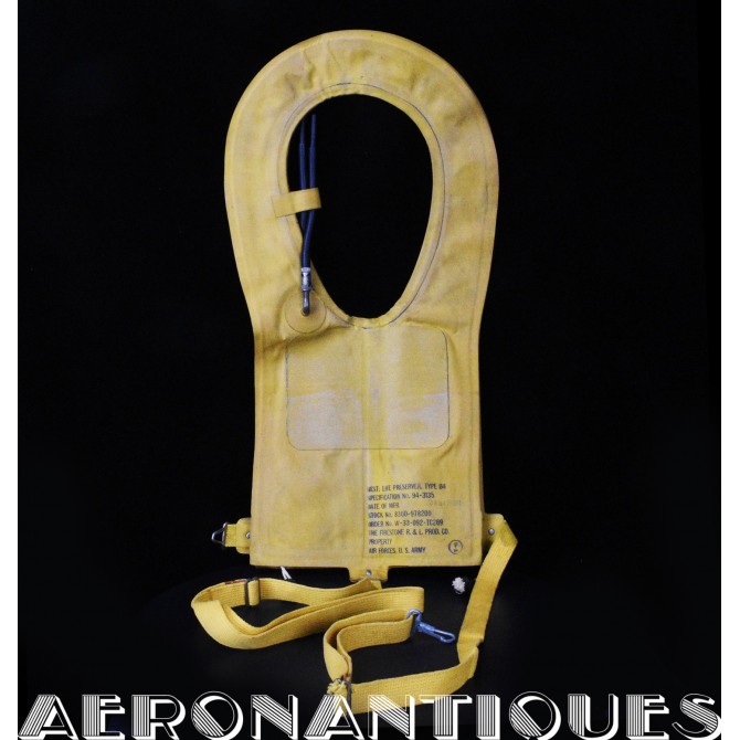 Gilet de sauvetage type B-4 également appelé "Mae-West" pour pilotes et équipages de l'US Army Air Force. Fabrication Janvier 1944 par la firme FIRESTONE. Complète avec toutes ses sangles, ses deux déclencheurs et tubes de gonflage de secours. Petit mousqueton précoce. Contrat US Army Air Force avec marquage correspondant. État exceptionnel. Gilet rare dans sa configuration d'origine sans modifications ou tampons d'inspection.