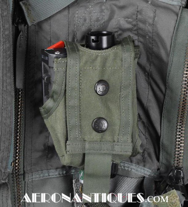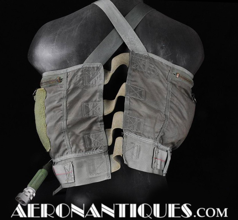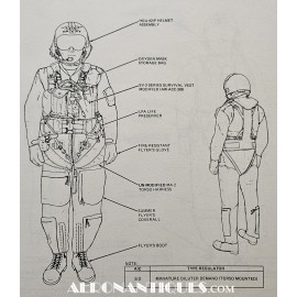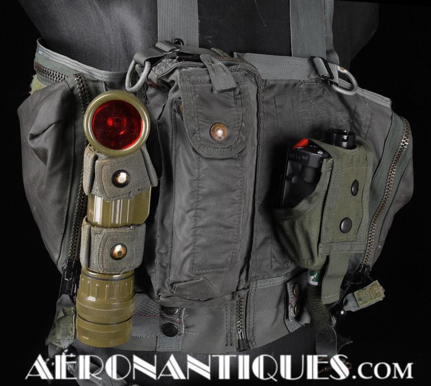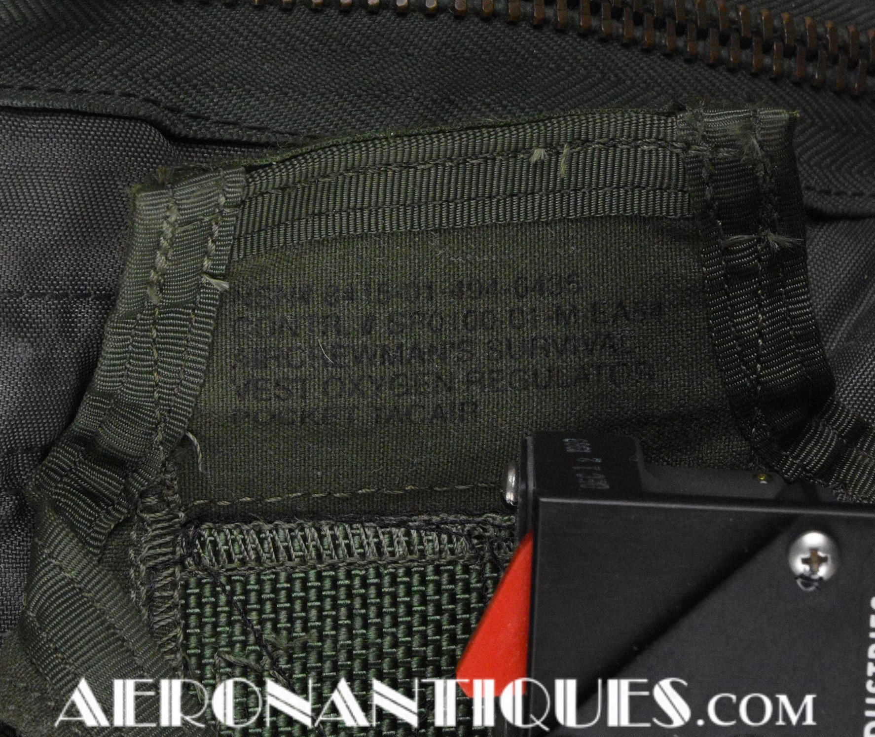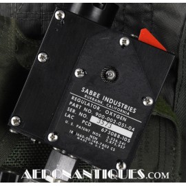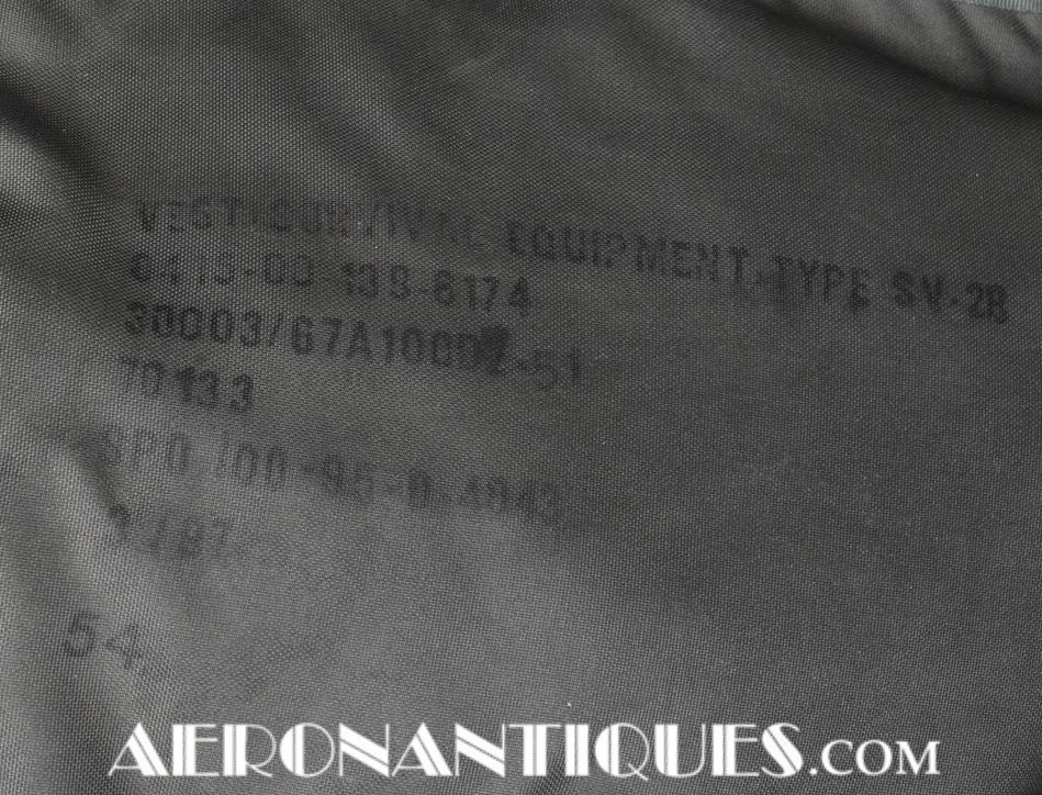 Gilet de survie type SV-2B pour pilotes de jet de l'US Navy ou Marine Corps période 1990's. Ce gilet a été modifié réglementairement en retirant la poche revolver/lance -fusée pour la remplacer par une poche spéciale pour le régulateur/dilueur d'oxygène à montage thoracique. Un connecteur à trois points commun aux masques à oxygène type MBU-12, MBU-13, MBU-14, MBU-20 ou MBU-23 se branche sur l'entrée supérieure du régulateur. Le régulateur, la durite ReDar et la lampe coudée MX-991U sont inclus. Équipement standard des pilotes et équipages volant sur AV-8 Harrier de l'US Marine Corps et S-3 Viking de l'US Navy.