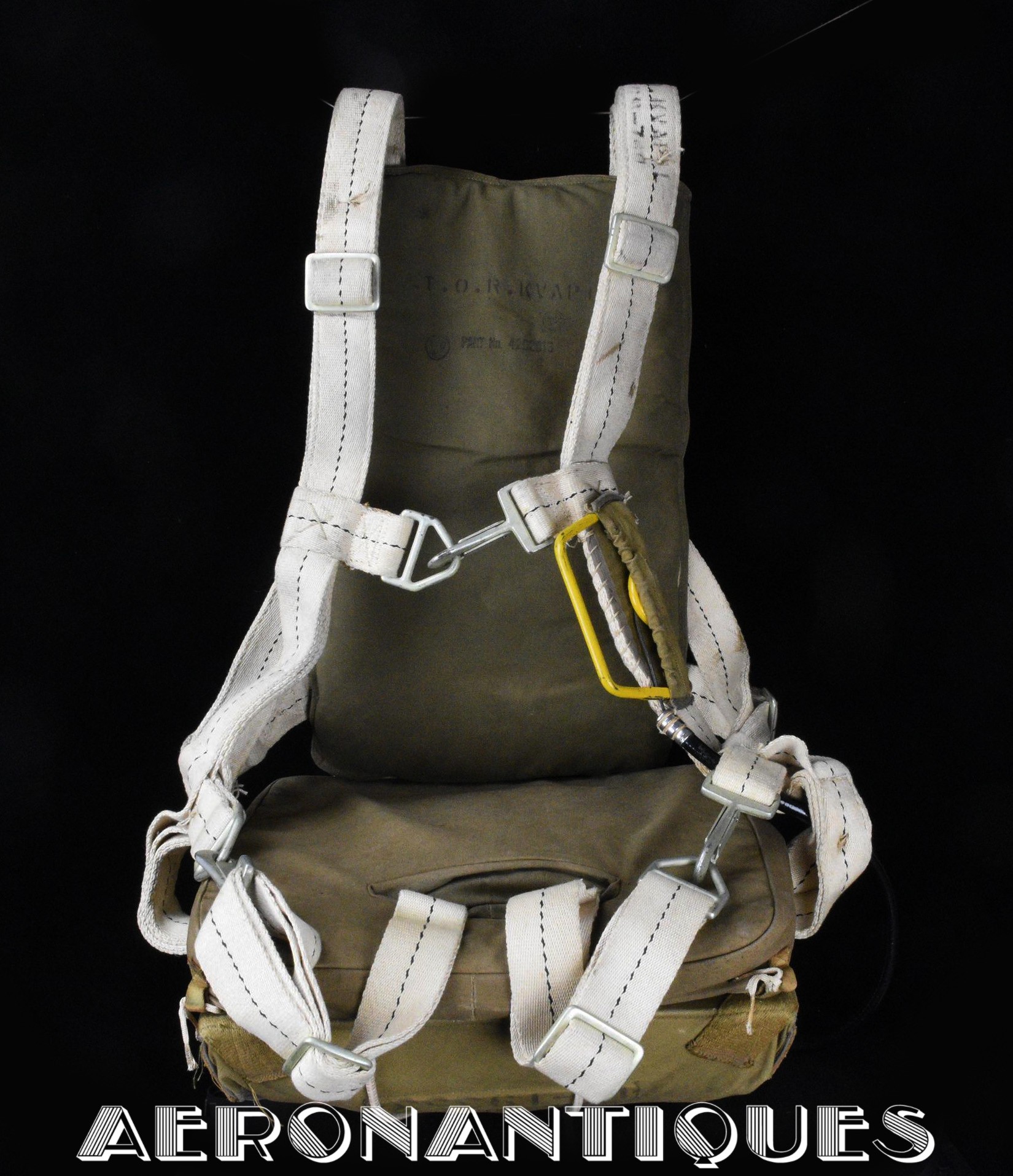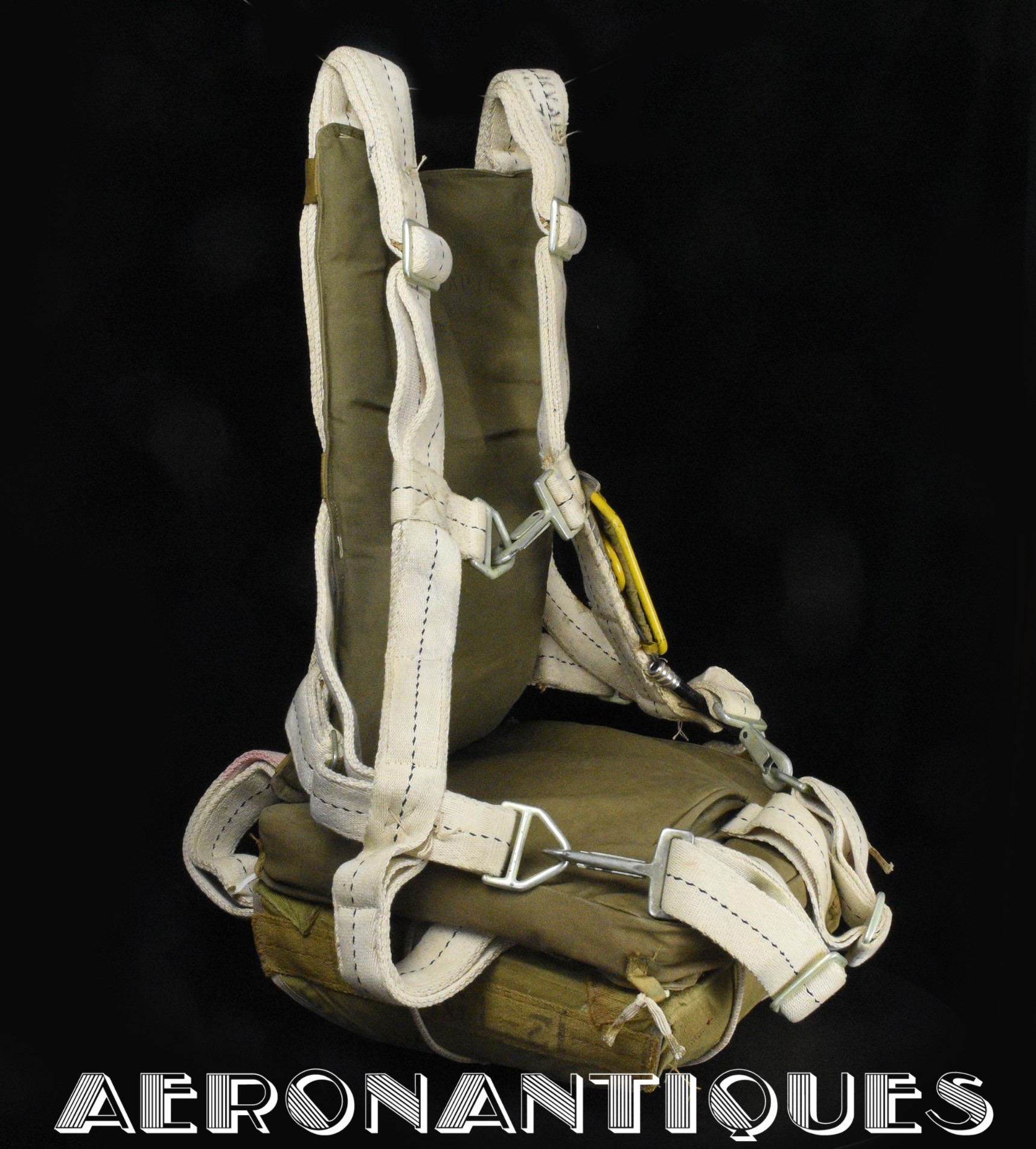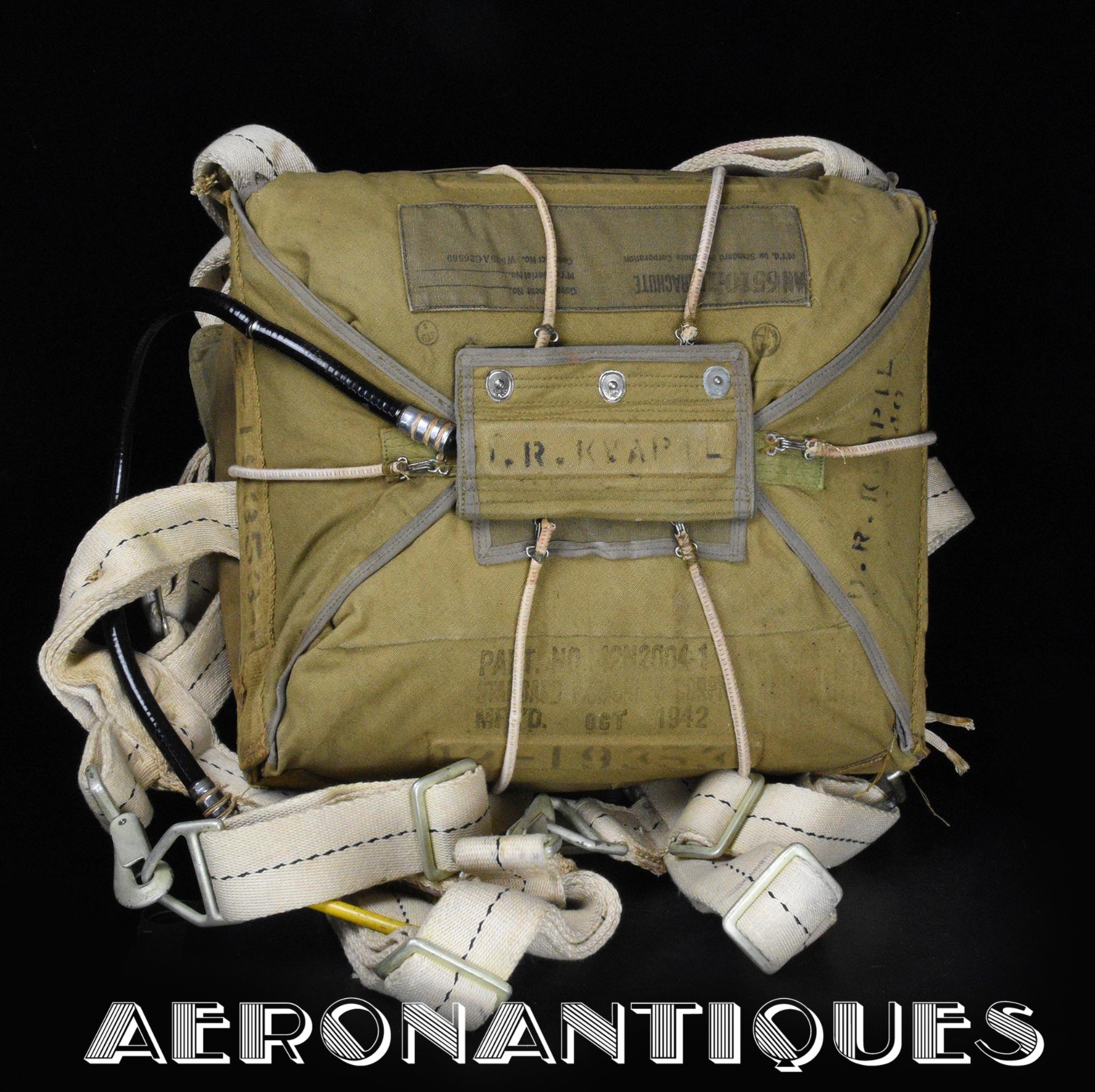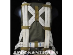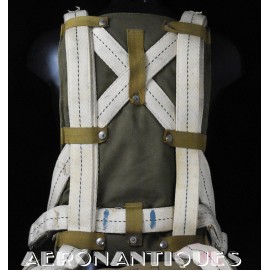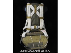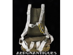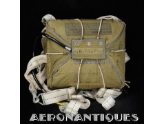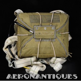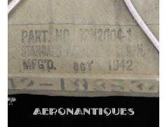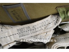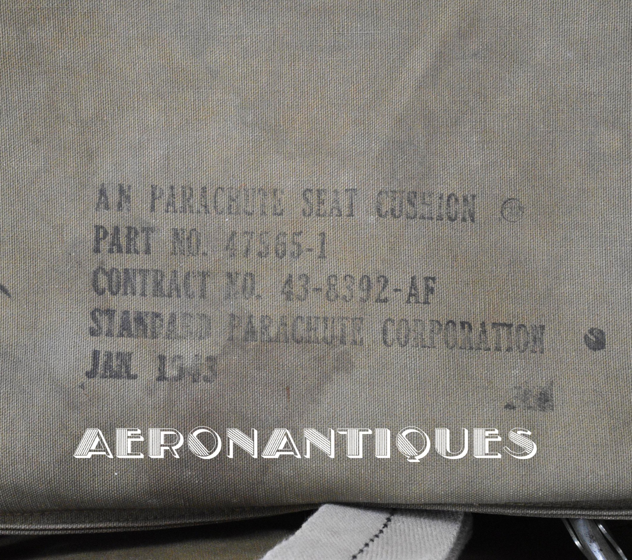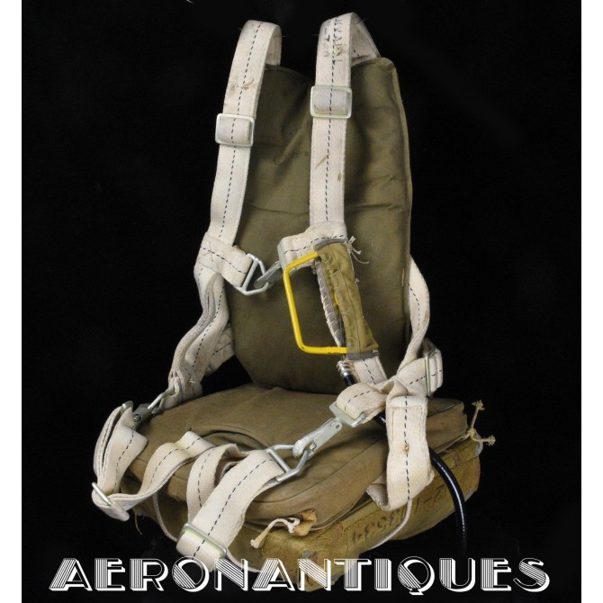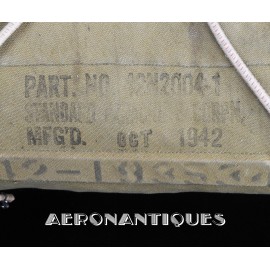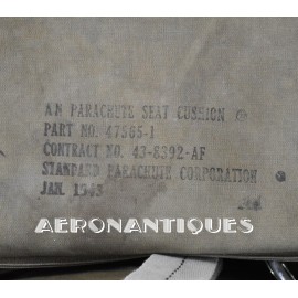 Exceptionnel parachute complet de pilote de chasse, bombardier ou transport de l'US Army Air Force ou Navy, modèle siège AN-6510, fabrication de 1942-43. Contrat militaire (AC/Air Corps) de guerre (W/War). Harnais 42G2012 fabrication STANDARD PARACHUTE CORP datée Octobre 1942. Enveloppe modèle 42N2004-1 (pour voilure de 24 pieds), fabrication STANDARD PARACHUTE CORP datée Octobre 1942. Coussin dorsal 42D2013. Coussin de siège 47565-1, fabrication STANDARD PARACHUTE CORP datée Janvier 1943. Voilure pliée d'origine à l'intérieur de l'enveloppe. Typique des pilotes de P-51 Mustang, P-47 Thunderbolt, B-17 Flying Fortress, C-47 Skytrain/Dakota, etc... Le parachute siège modèle AN-6510-1 (-1 pour voilure blanche -2 voilure rouge et blanche) a été produit de 1942 à 1943, il sera remplacé par le modèle S-5 équipé d'une boucle à dégrafage rapide Irving à partir de 1944.
