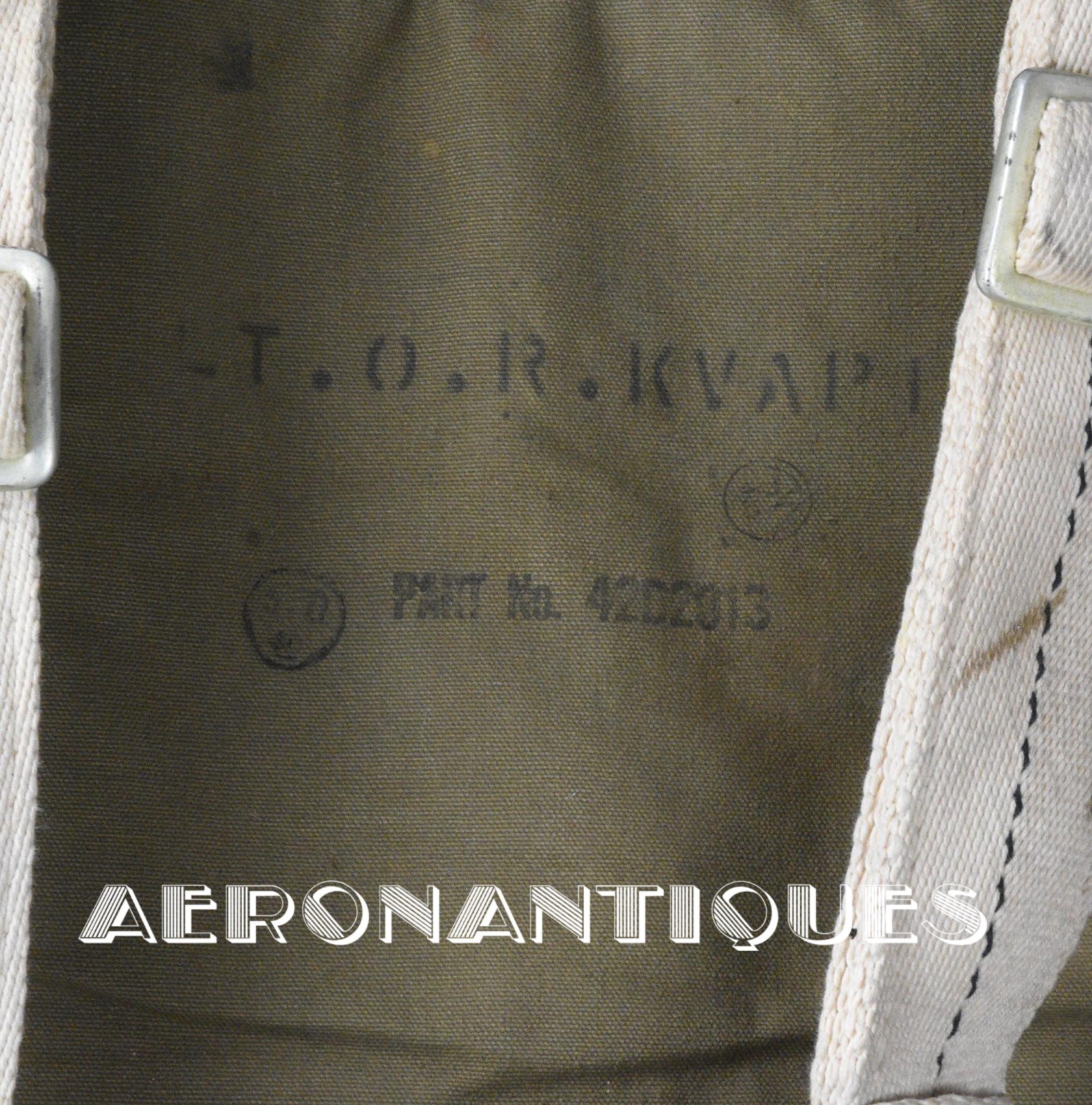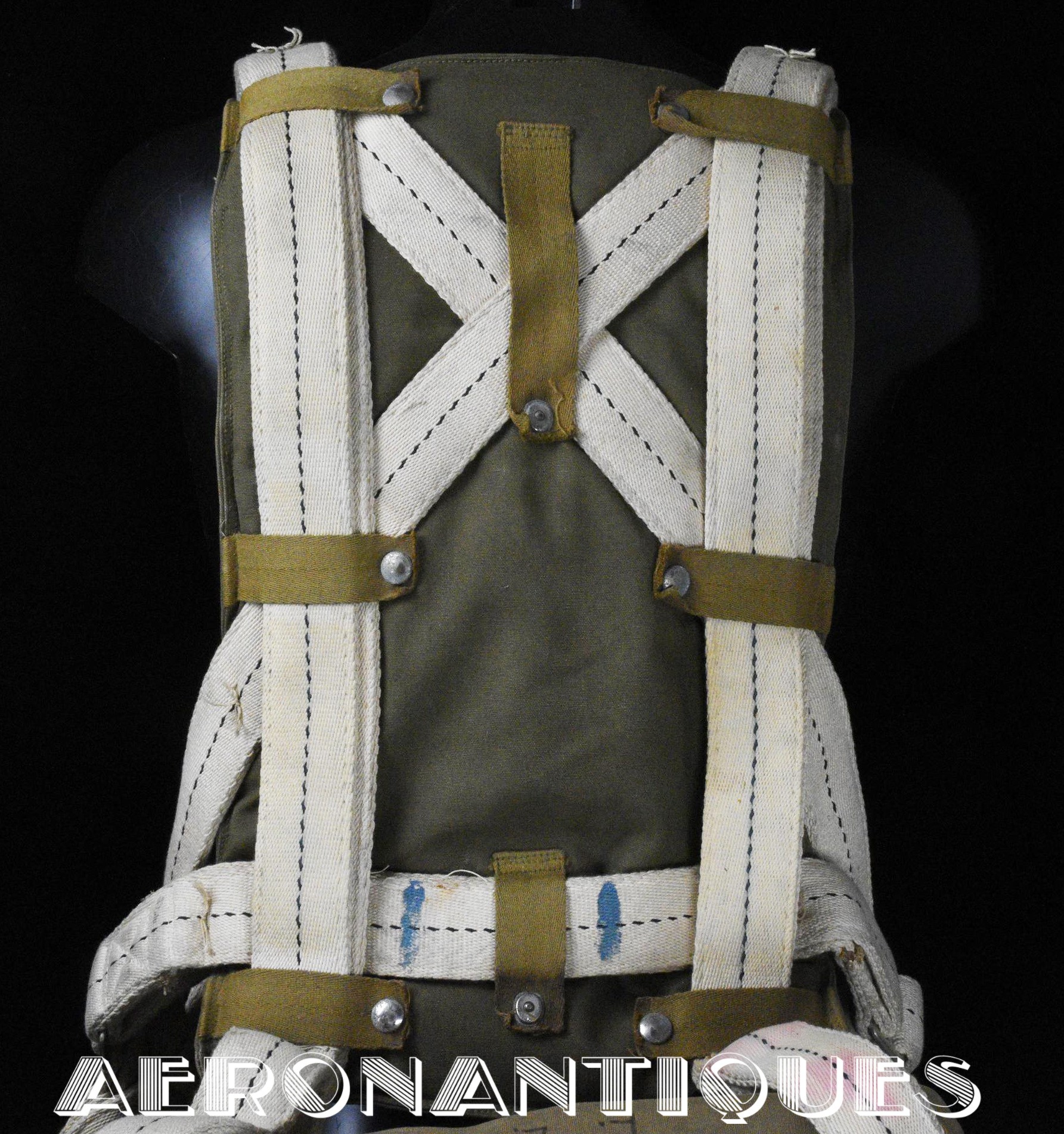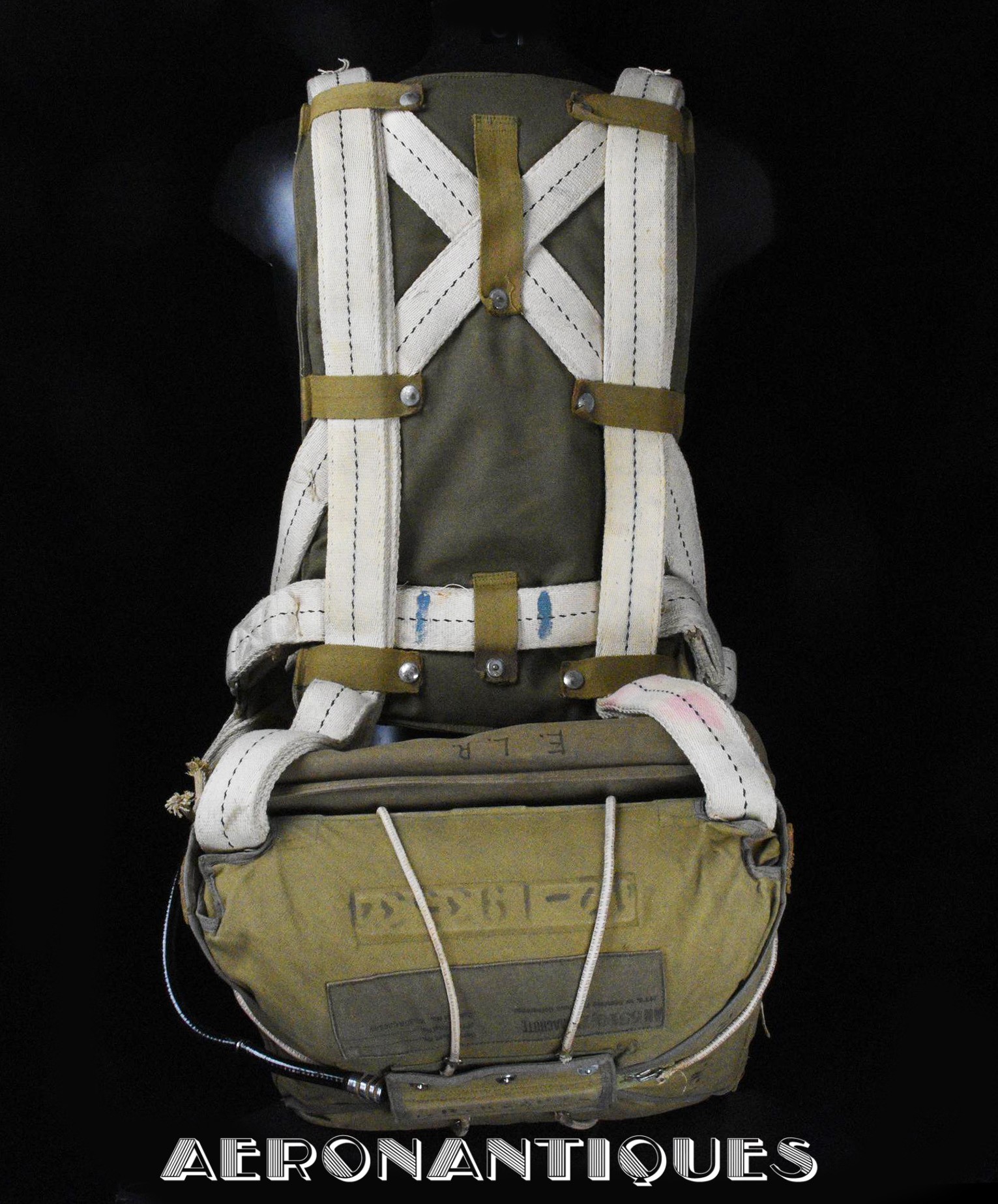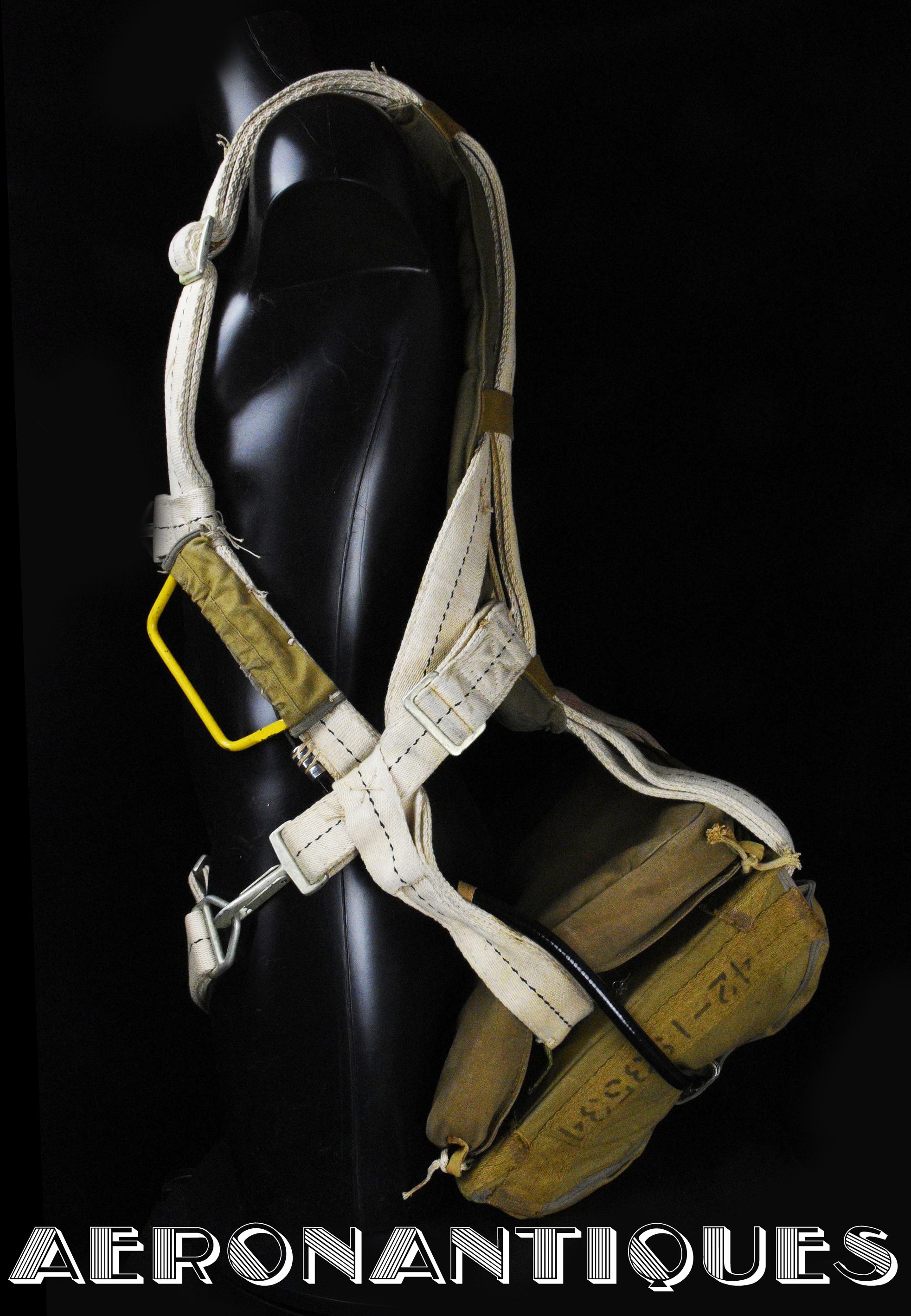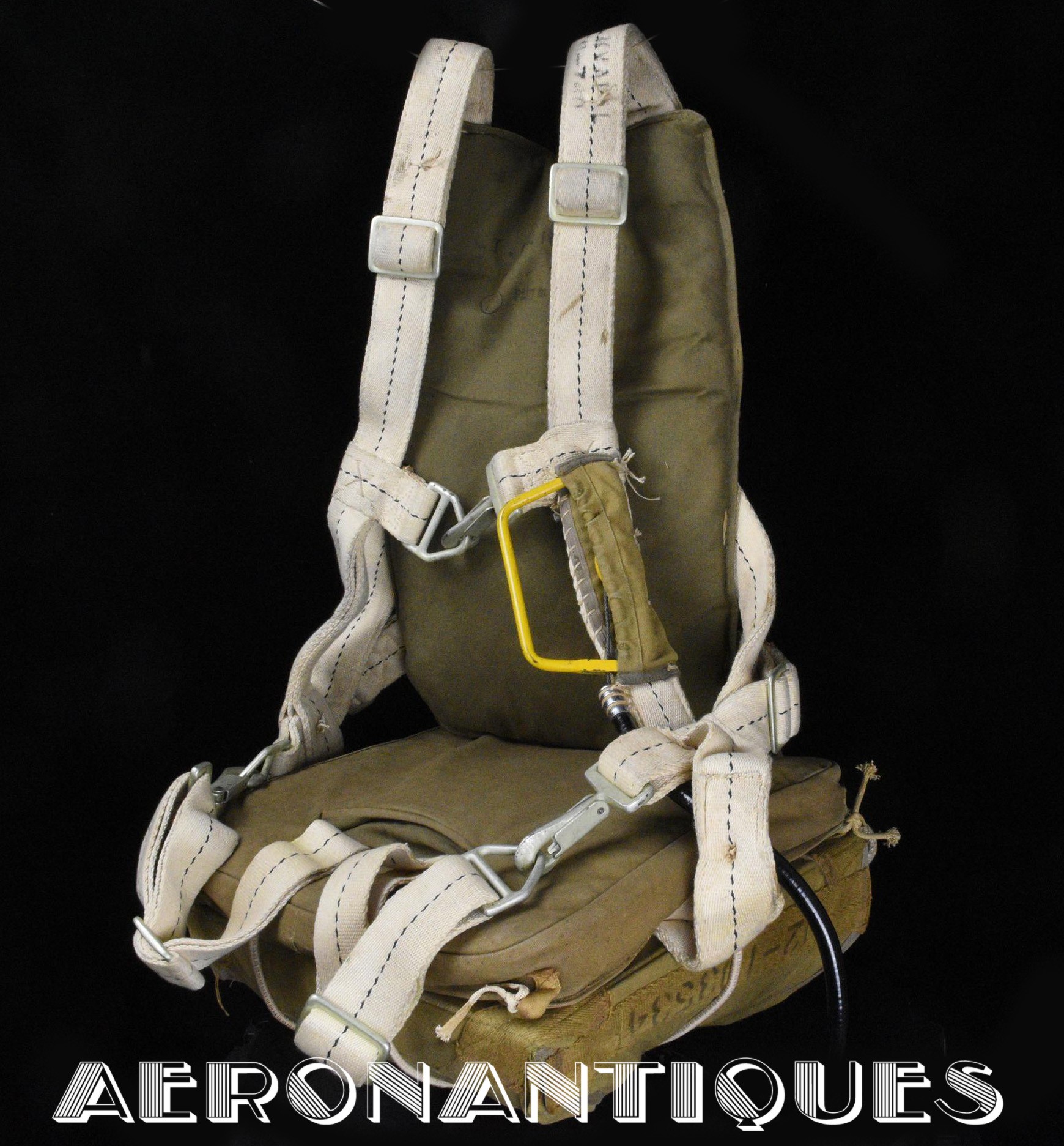 Exceptionnel parachute complet de pilote de chasse, bombardier ou transport de l'US Army Air Force ou Navy, modèle siège AN-6510, fabrication de 1942-43. Contrat militaire (AC/Air Corps) de guerre (W/War). Harnais 42G2012 fabrication STANDARD PARACHUTE CORP datée Octobre 1942. Enveloppe modèle 42N2004-1 (pour voilure de 24 pieds), fabrication STANDARD PARACHUTE CORP datée Octobre 1942. Coussin dorsal 42D2013. Coussin de siège 47565-1, fabrication STANDARD PARACHUTE CORP datée Janvier 1943. Voilure pliée d'origine à l'intérieur de l'enveloppe. Typique des pilotes de P-51 Mustang, P-47 Thunderbolt, B-17 Flying Fortress, C-47 Skytrain/Dakota, etc... Le parachute siège modèle AN-6510-1 (-1 pour voilure blanche -2 voilure rouge et blanche) a été produit de 1942 à 1943, il sera remplacé par le modèle S-5 équipé d'une boucle à dégrafage rapide Irving à partir de 1944.