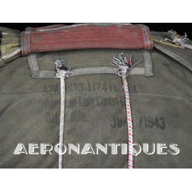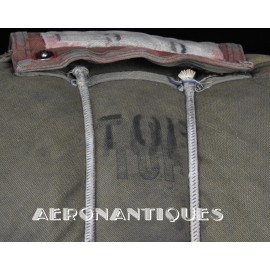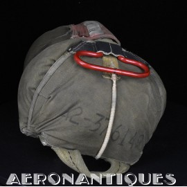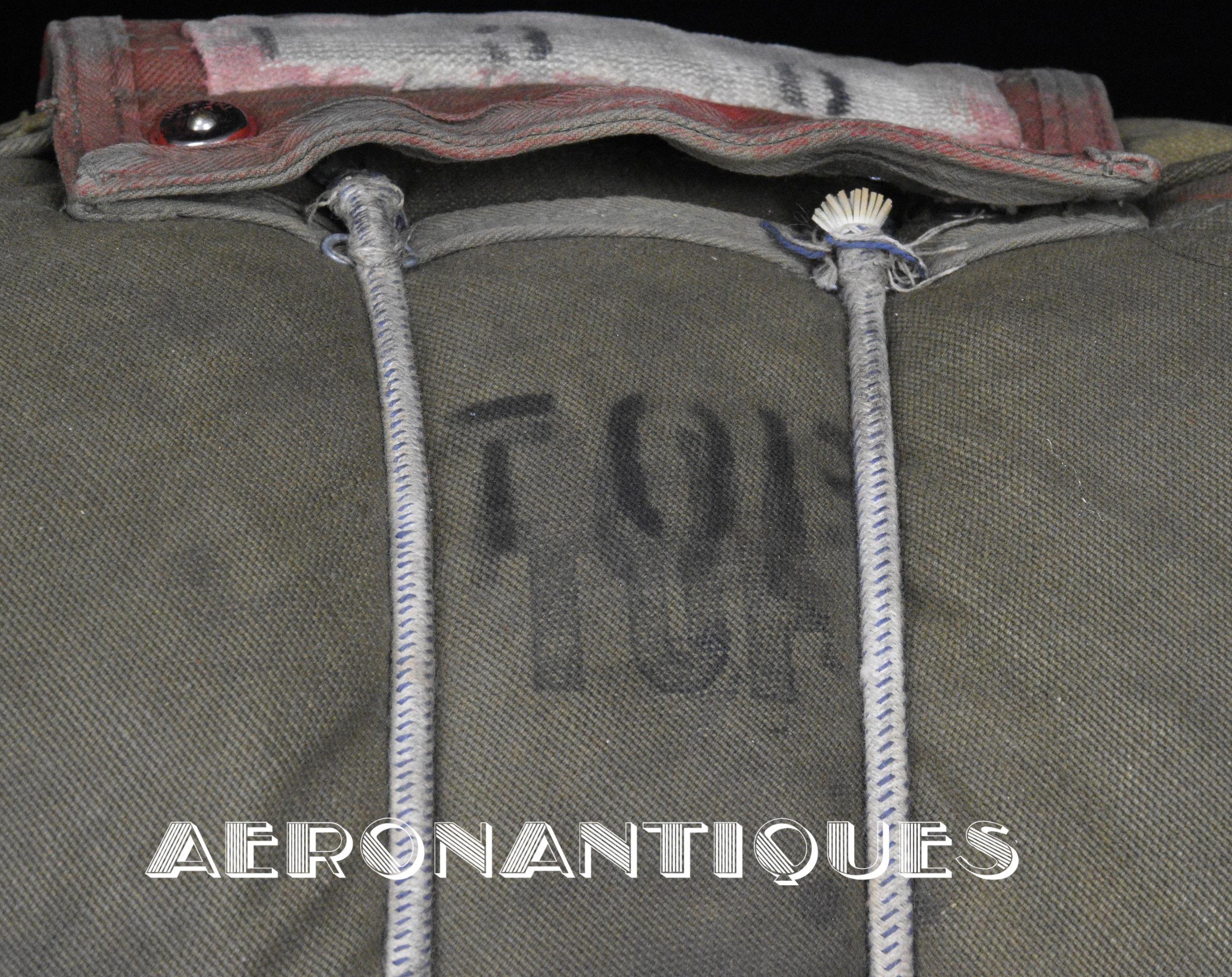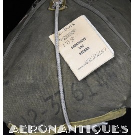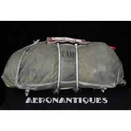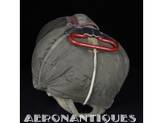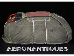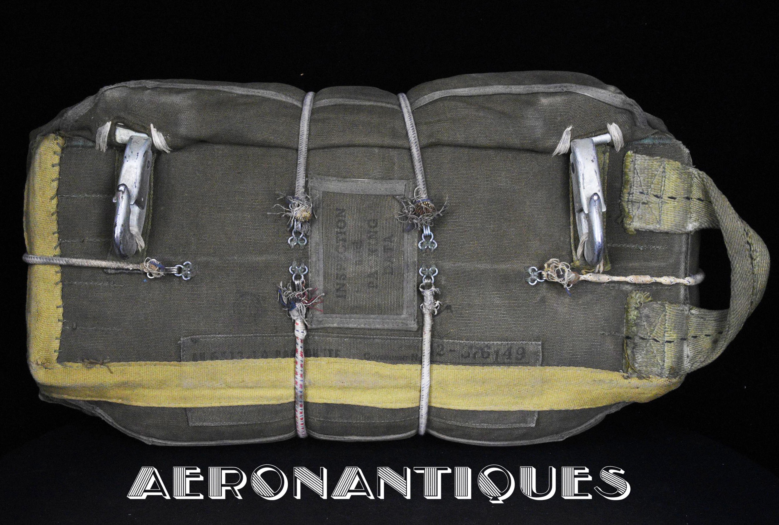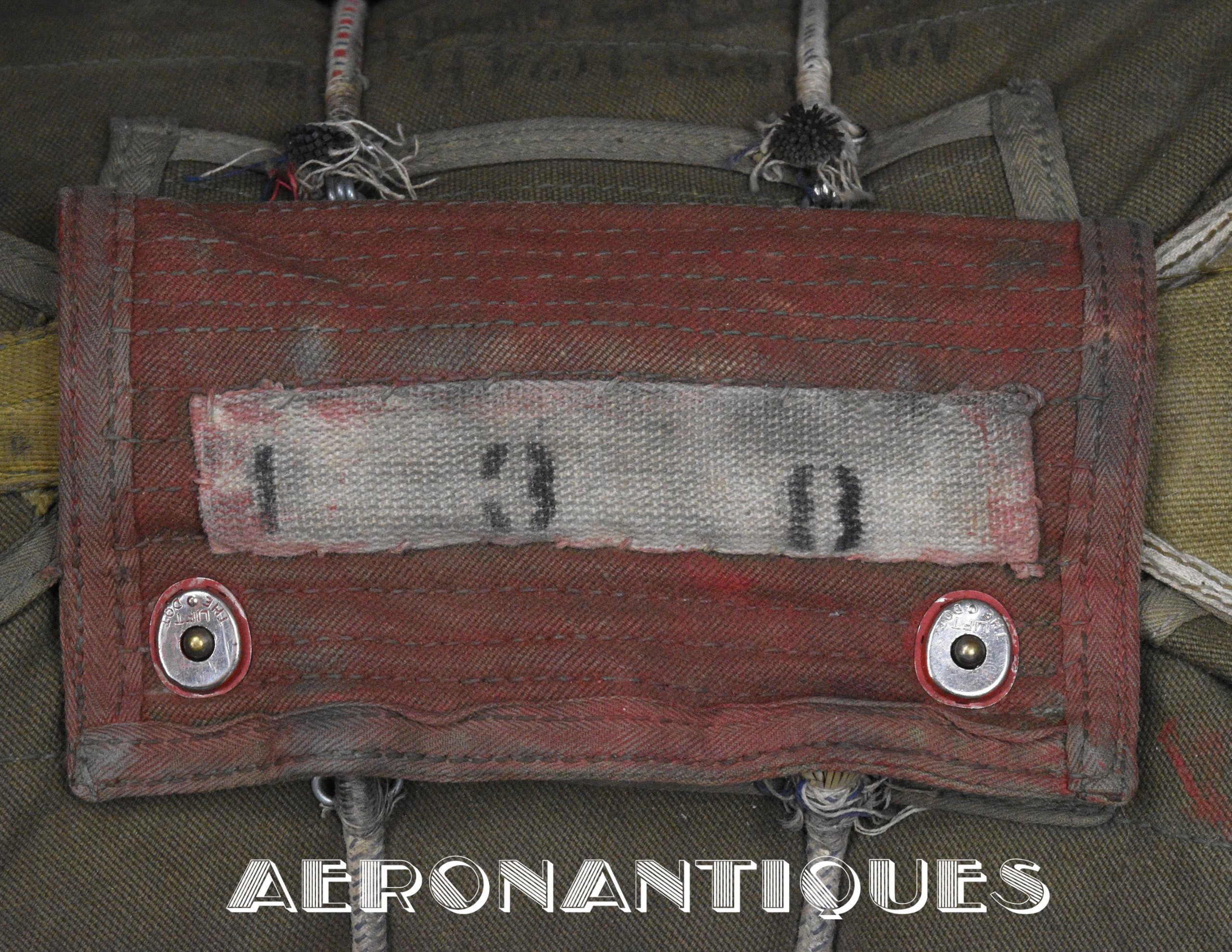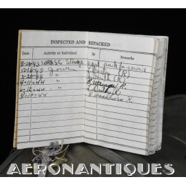 Rare enveloppe de parachute d'équipage de bombardier type AN-6513-1A Quick Attachable Chest (QAC) "Red Group", complet avec voilure, élastiques d'origine, poignée de déclenchement, mousquetons d'attaches au harnais et carnet d'entretien. Marquage à la peinture rouge sur le rabat permettant d'associer en cas d'urgence la bonne enveloppe de parachute (Rouge=Attaches avec mousquetons sur le parachute et anneaux sur le harnais). Fabrication LADY CORSET datée 1943. Ce type de parachutes équipait les membres d'équipages de bombardiers de l'Army Air Force tels que pilotes, mitrailleurs, radios, mécaniciens embarqués, etc...