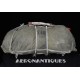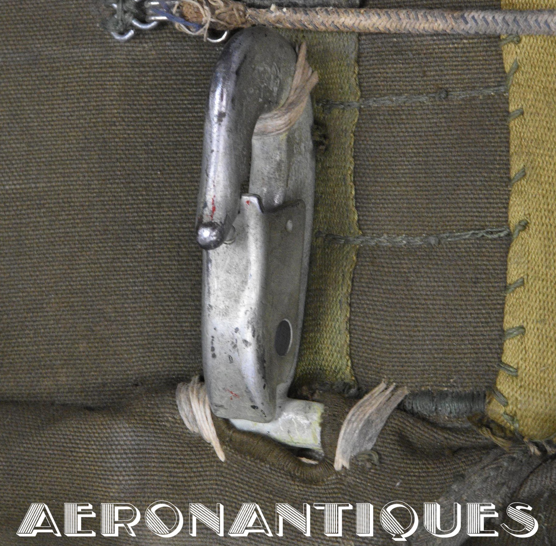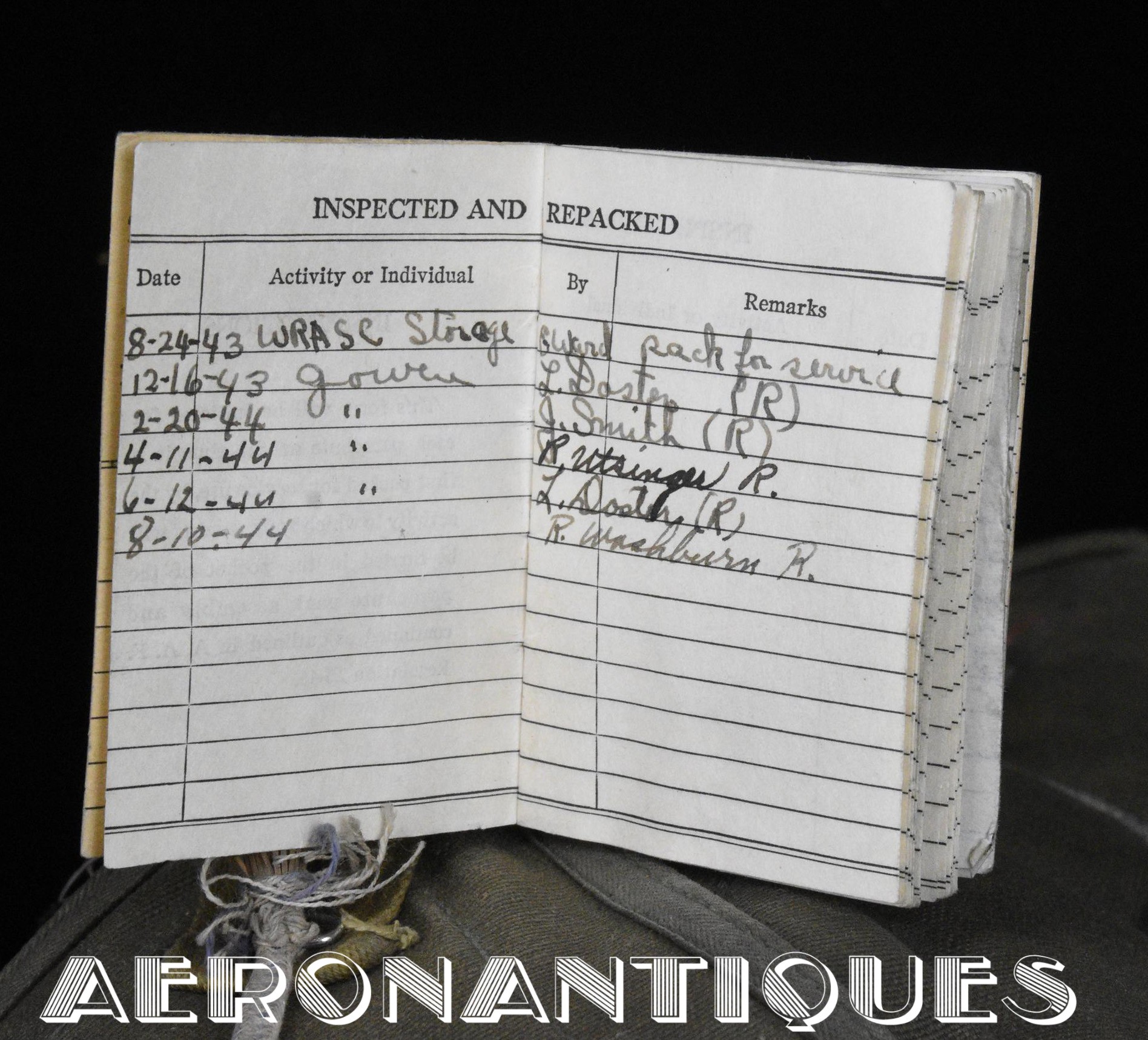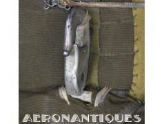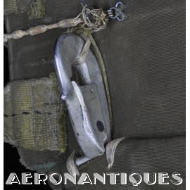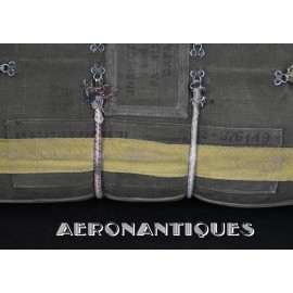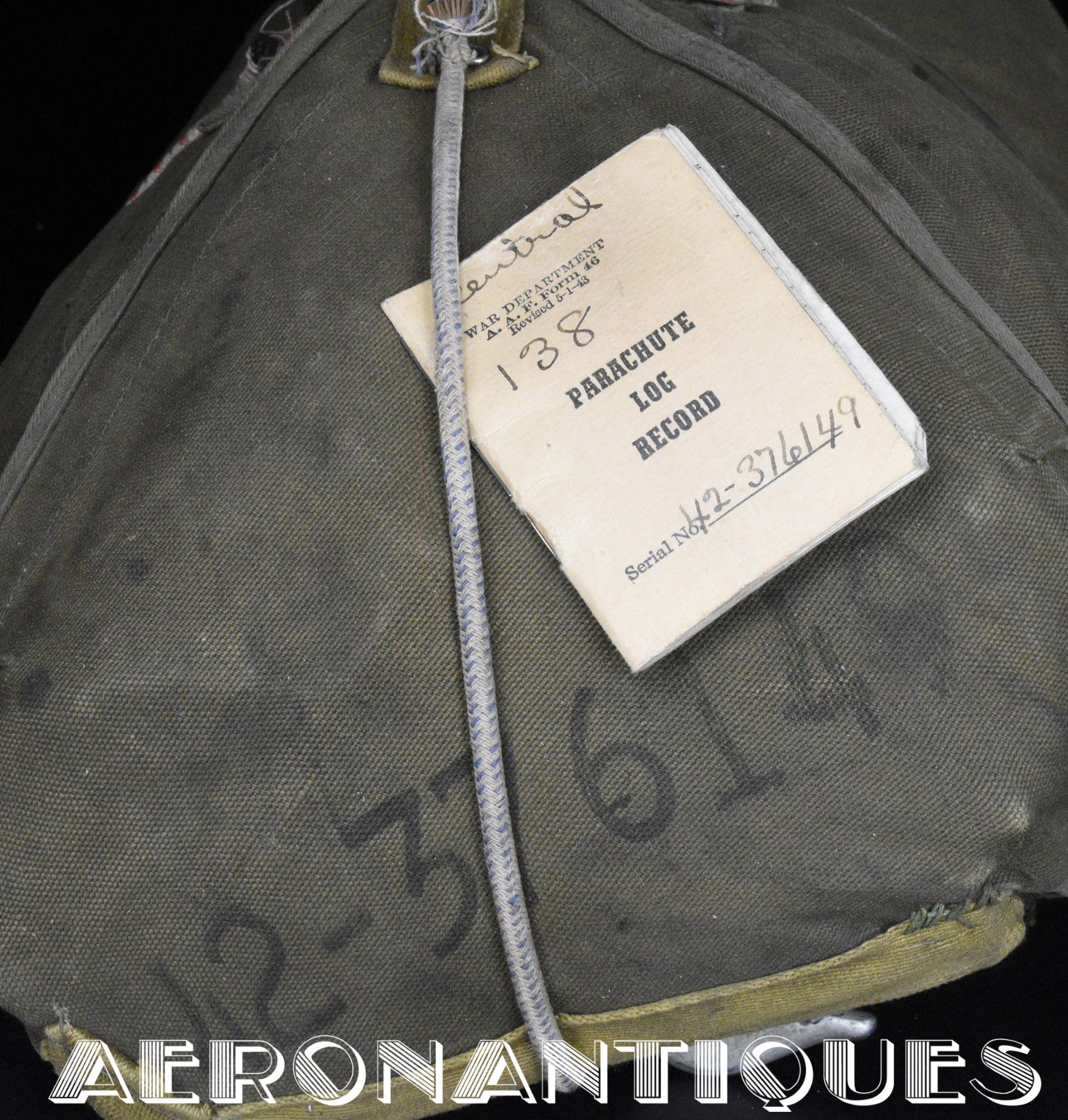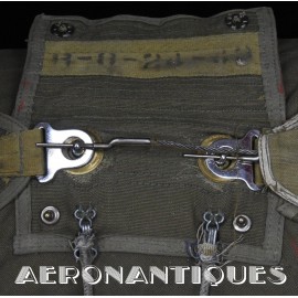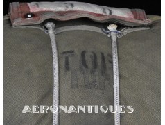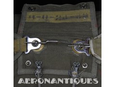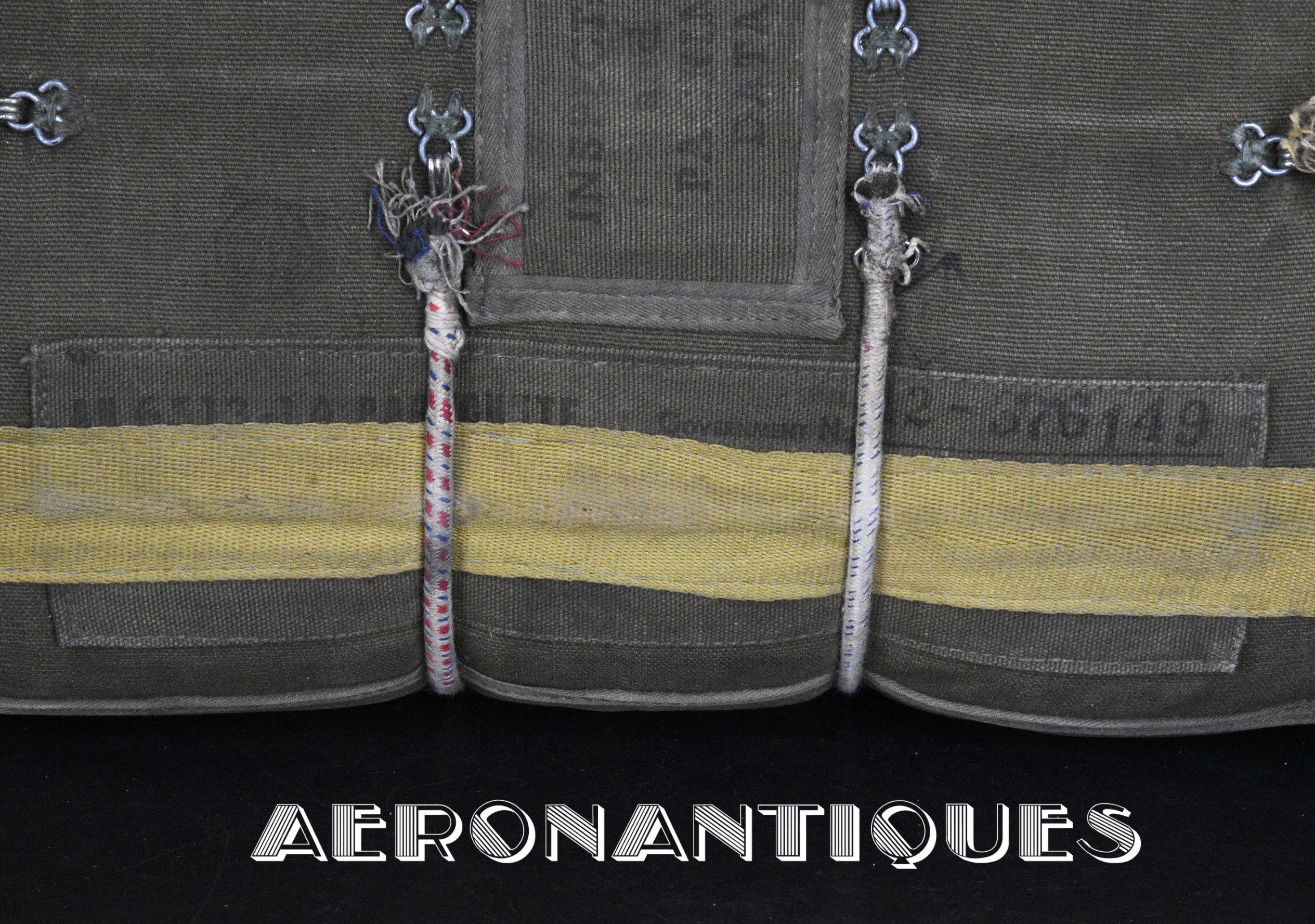Rare enveloppe de parachute d'équipage de bombardier type AN-6513-1A Quick Attachable Chest (QAC) "Red Group", complet avec voilure, élastiques d'origine, poignée de déclenchement, mousquetons d'attaches au harnais et carnet d'entretien. Marquage à la peinture rouge sur le rabat permettant d'associer en cas d'urgence la bonne enveloppe de parachute (Rouge=Attaches avec mousquetons sur le parachute et anneaux sur le harnais). Fabrication LADY CORSET datée 1943. Ce type de parachutes équipait les membres d'équipages de bombardiers de l'Army Air Force tels que pilotes, mitrailleurs, radios, mécaniciens embarqués, etc...