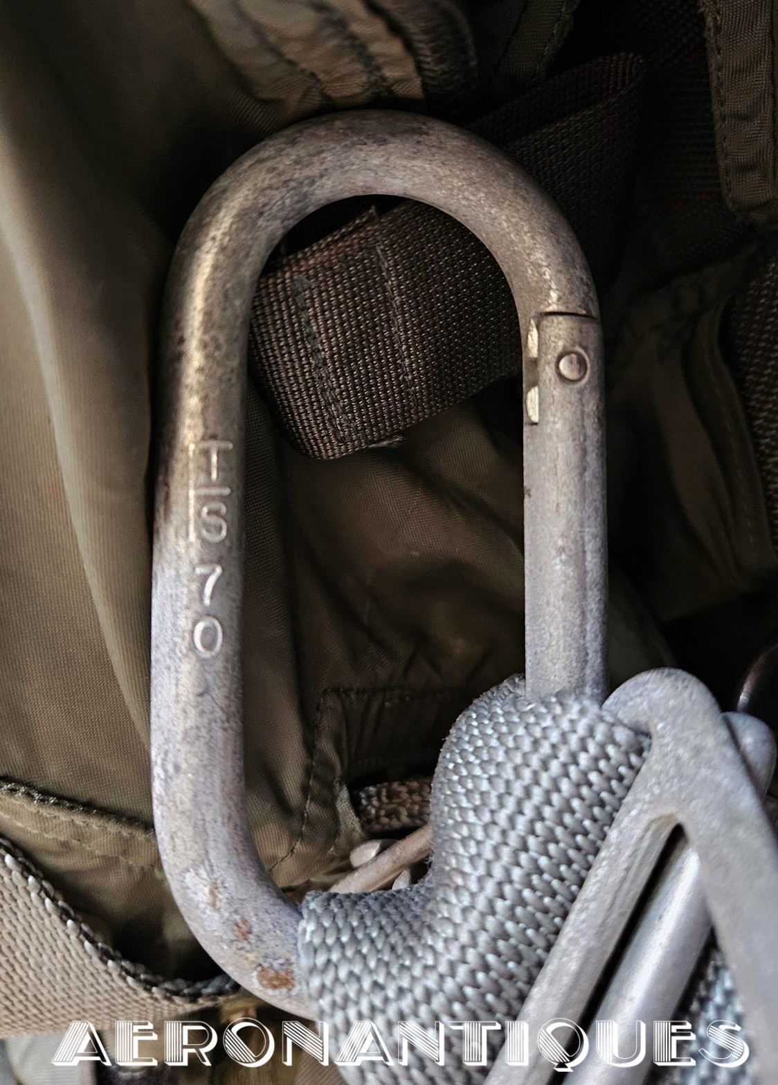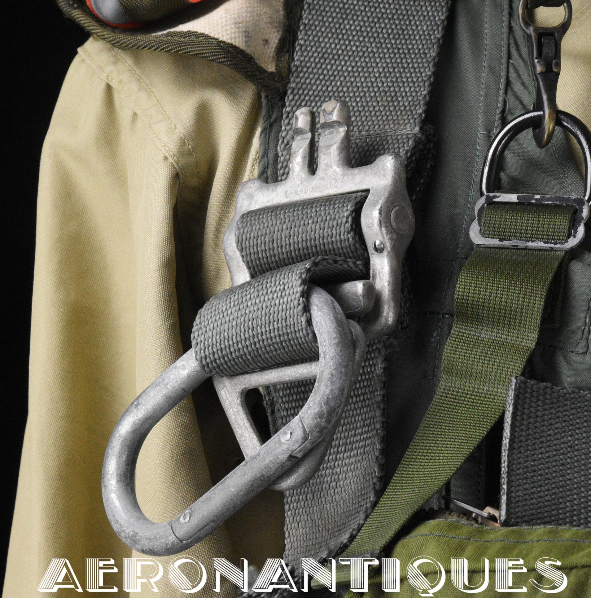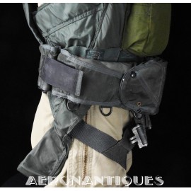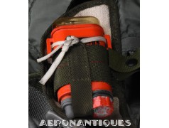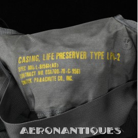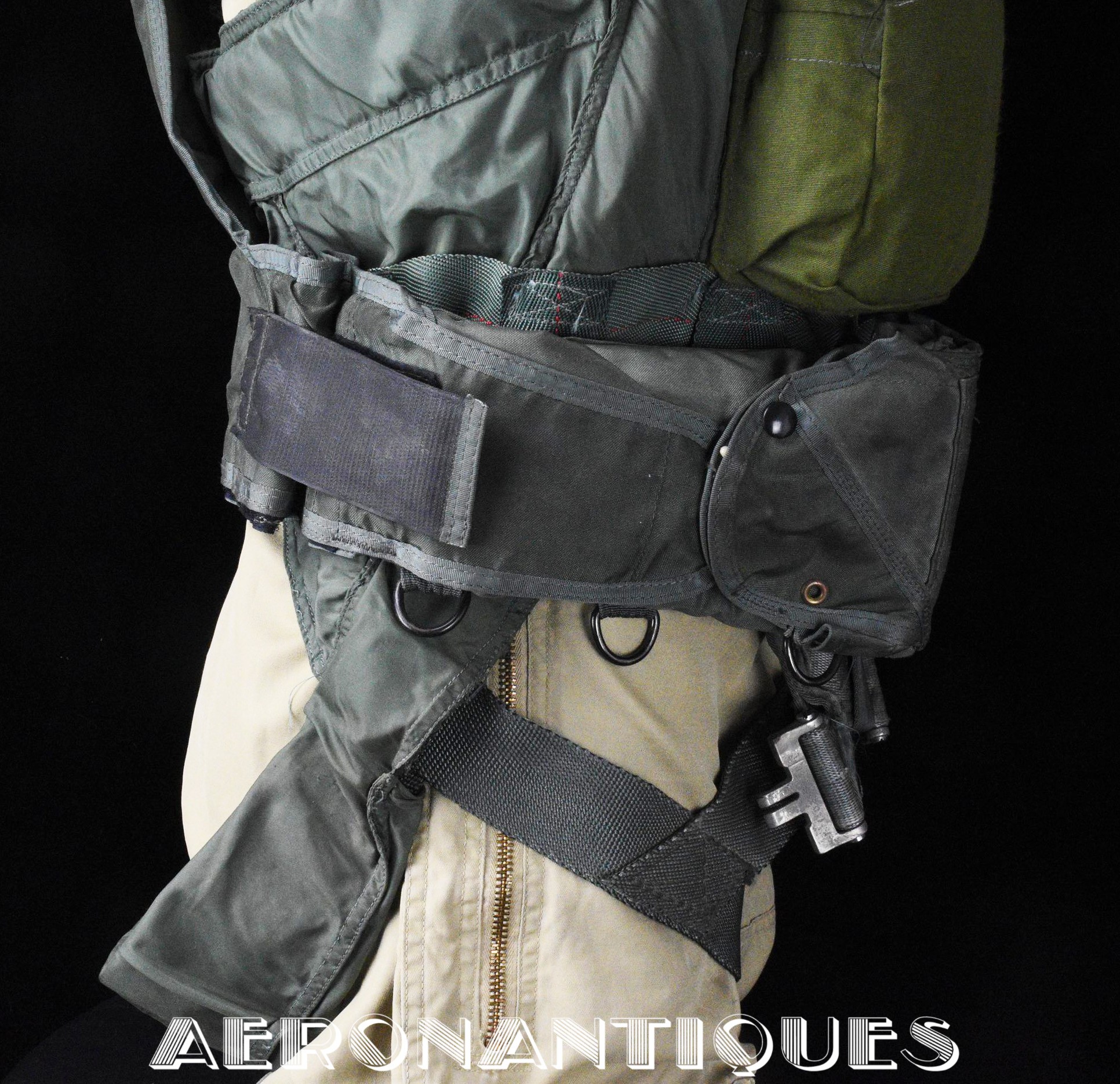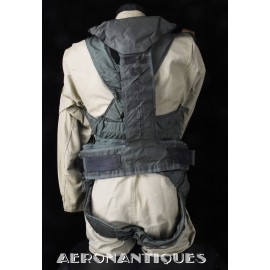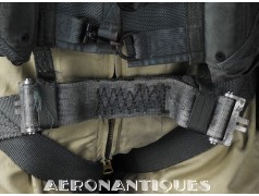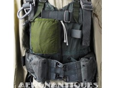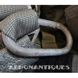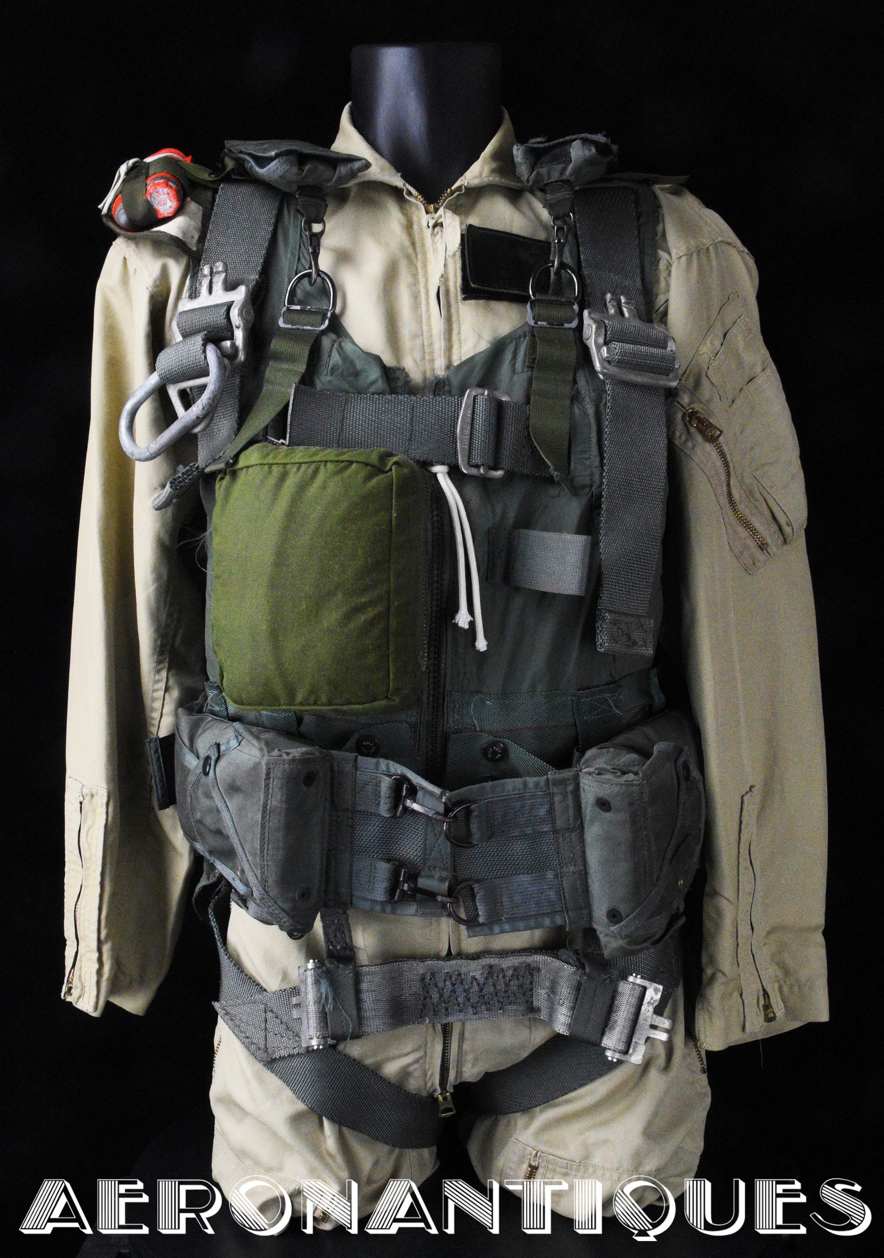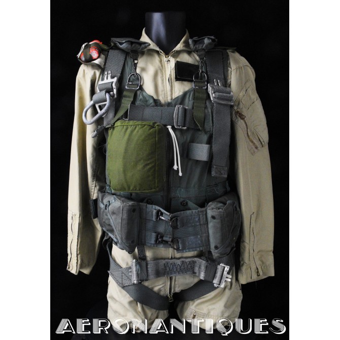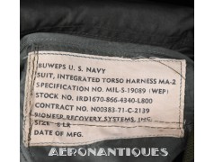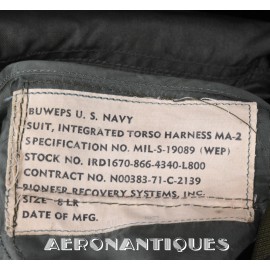 Ensemble harnais et gilet de sauvetage de pilote de l'US Navy ou US Marine Corps modèle MA-2, fabrication PIONEER PARACHUTE CO. Fabrication du début des années 70. Taille LARGE REGULAR. Complet avec toutes ses boucles KOCH aux épaules et à la taille. Fermeture à glissière TALON. Anneau d'extraction en "V" doublé d'un mousqueton réglementaire daté 1970 facilitant le passage du crochet de câble d'extraction (plus tard directement remplacé par un mousqueton plus large à partir du milieu des années 70) . La combinaison intégrée a été modifiée par les "Aircrew Survival Equipmentmen" pour rendre le harnais plus confortable. Une pochette permettant de stocker des accessoires de survie a été rajoutée directement sur le côté droit du gilet du harnais. Un support de lampe de détresse à également été rajouté sur l'épaule droite (lampe incluse, modèle précoce correspondant à la période, montée d'origine sur l'ensemble). Le gilet de sauvetage est un modèle LPA-2 daté de 1970, complet avec sa vessie et ses deux déclencheurs. Ce type d'ensemble était porté sur F-8 Crusader, F-4 Phantom, A-4 Skyhawk, A-6 Intruder, RA5C Vigilante et certaines versions du A-1 Skyraider.