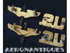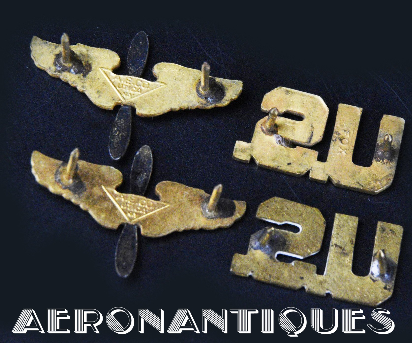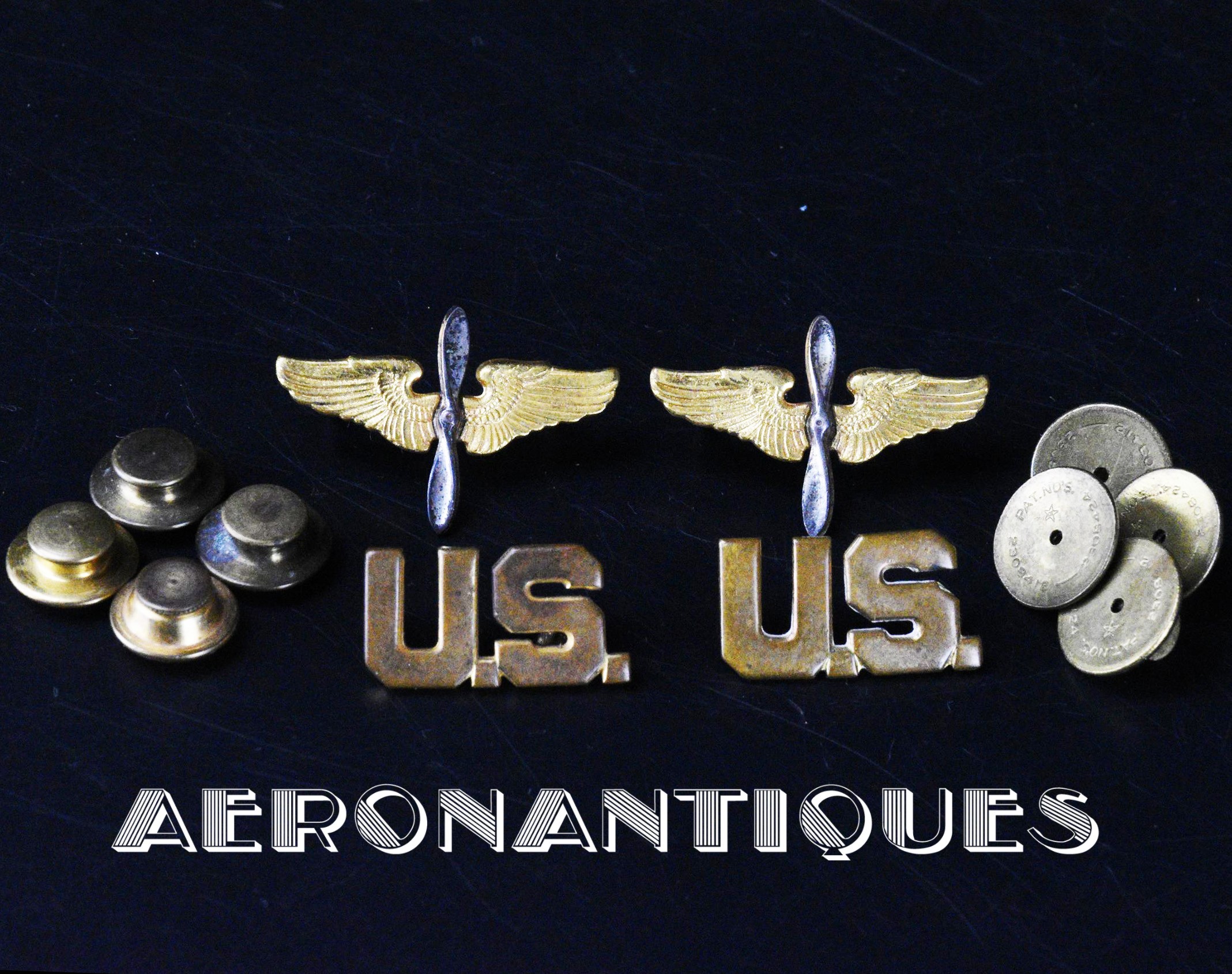 Ensemble complet de 4 insignes de col pour officiers de l'US Army Air Force, 2 hélices ailées en deux parties fabrication AMCRAFT avec attaches bouton précoces, deux U.S, fabrication américaine FOX datant de la Seconde Guerre Mondiale avec attaches papillons laiton lisses BALLOU circa 1942-43.