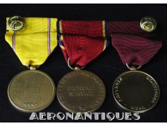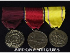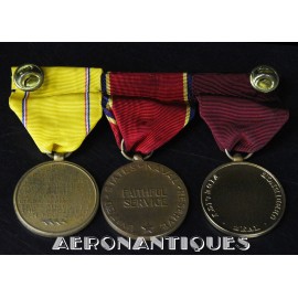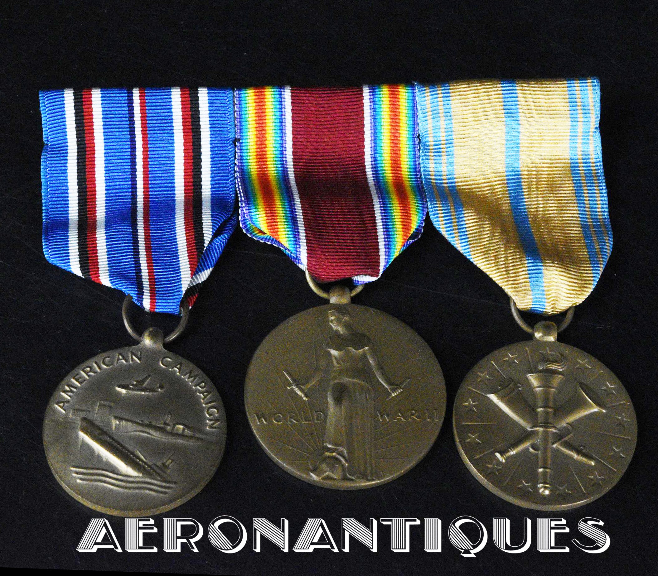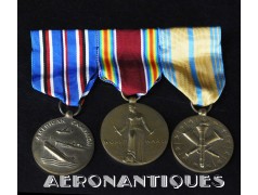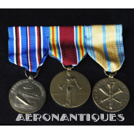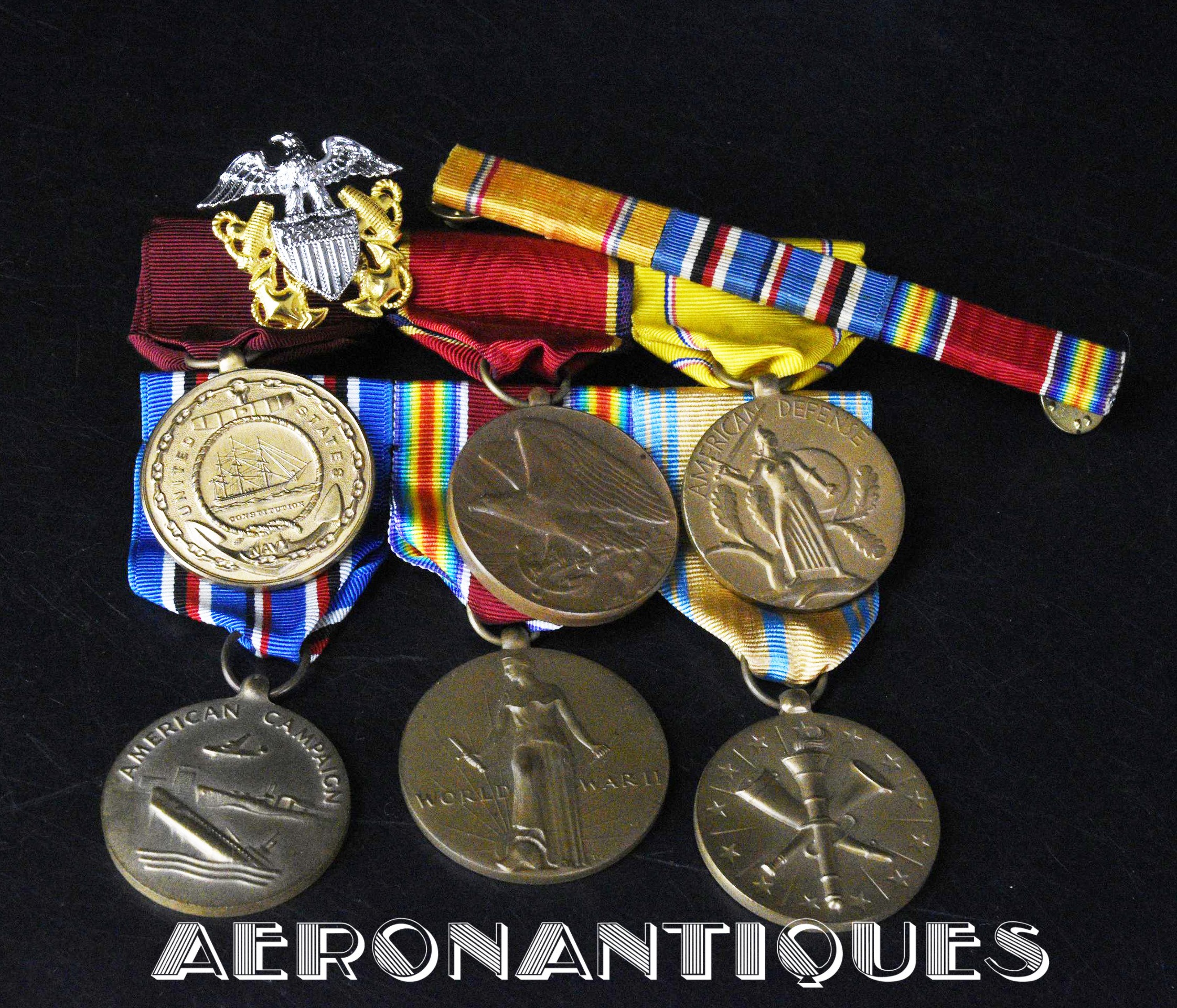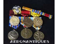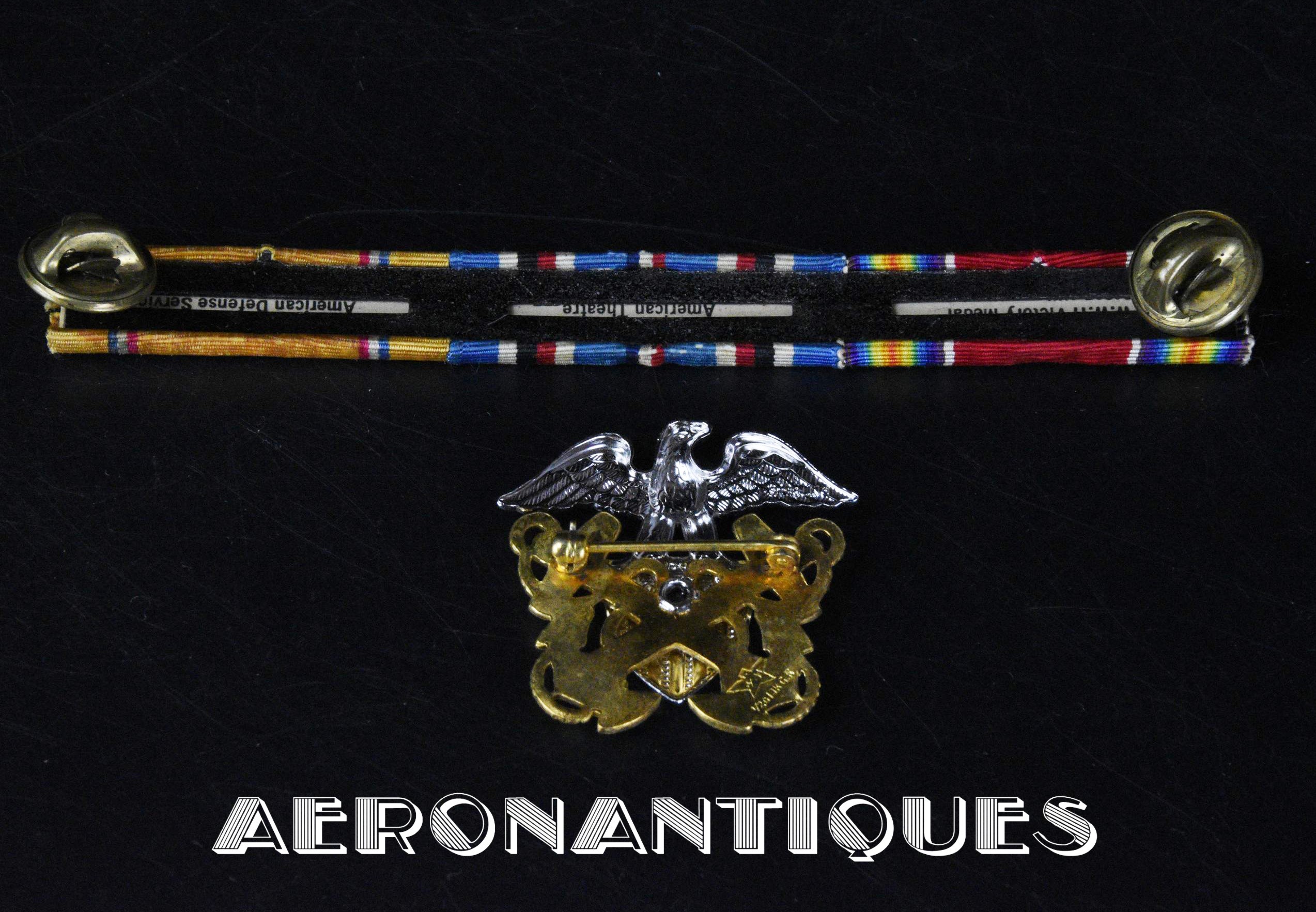 Ensemble de décorations période WWII ayant appartenu à un pilote de l'US Navy, montées d'origine sur barrettes, trouvées telles quelles dans une boîte du fabricant d'insignes VANGUARD. Également inclus trois rubans montés sur barrettes et un insigne de calot d'officier US Navy.