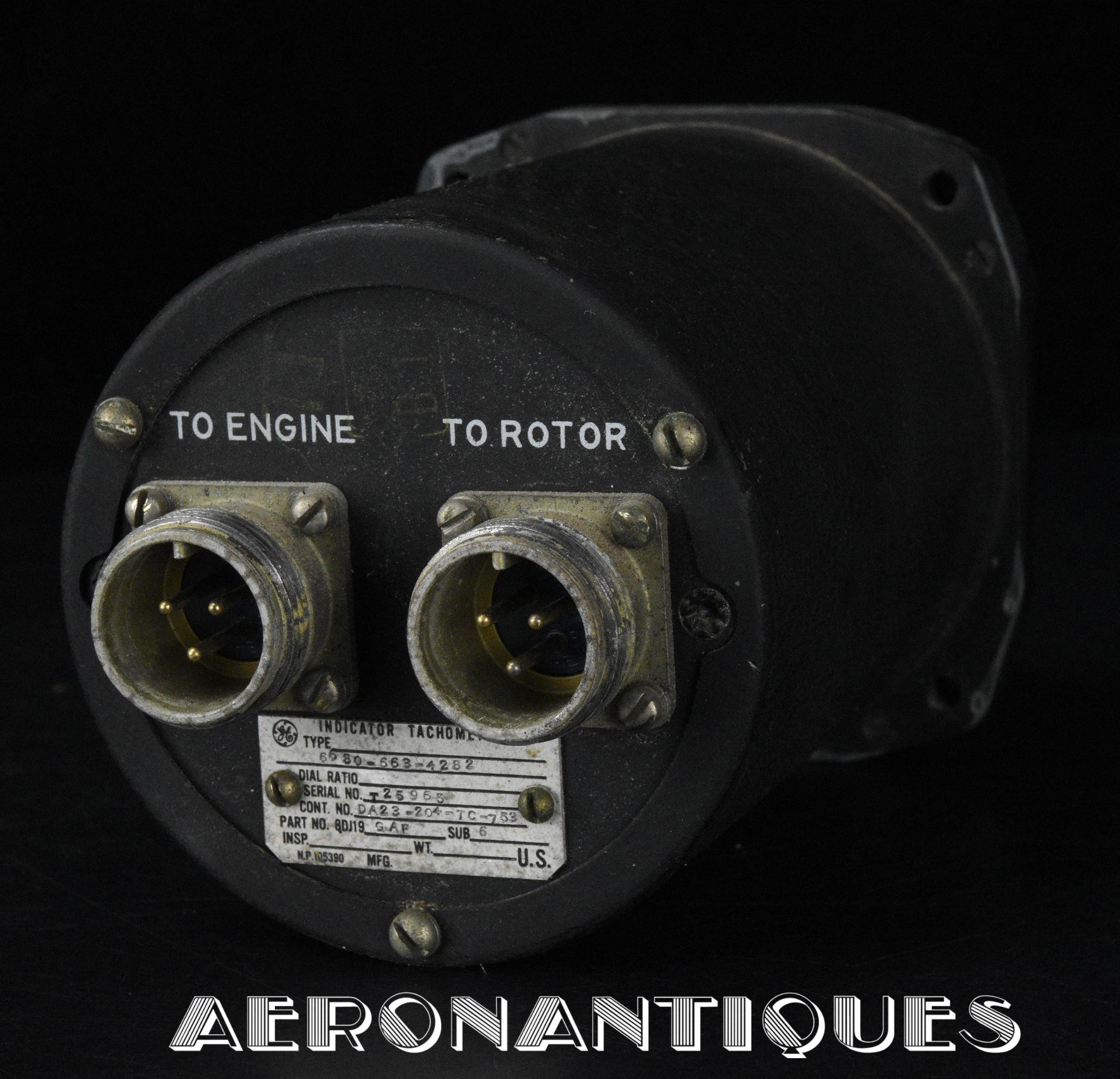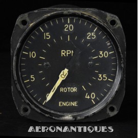 Compte tour à double lecture provenant du mythique hélicoptère Sikorsky H-34, fabrication des années 50, gradué de 0 à 4000 avec double aiguille moteur et rotor. Diamètre 85 mm. Profondeur 130 mm. Belle pièce de vitrine. Cet hélicoptère a été utilisé par l'US Army et l'US Navy mais également l'Armée française pendant la Guerre d'Algérie.