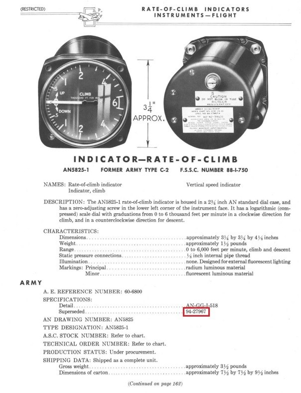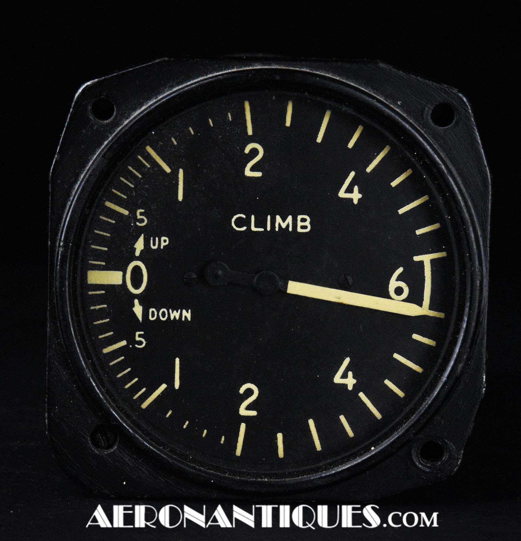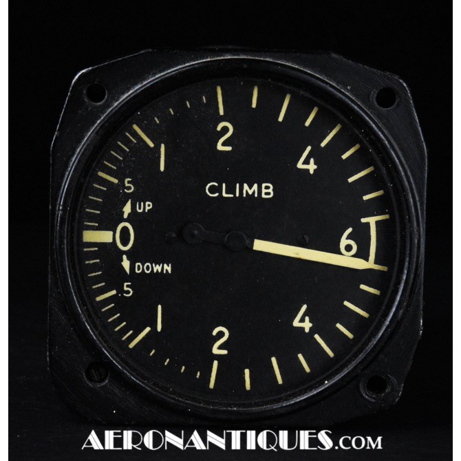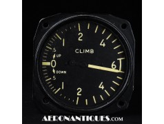 Indicateur de taux de montée type C-2 période WWII. Plaques d'identification manquantes (traces des rivets). Diamètre 80 mm. Profondeur 120 mm. Ce type d'instruments a été monté sur la plupart des bombardiers B-17, B-24, B-25, B-26, chasseurs P-38, P-39, P-40, P-47, P-51, ou transporteurs C-46 et C-47. Belle pièce de vitrine.
