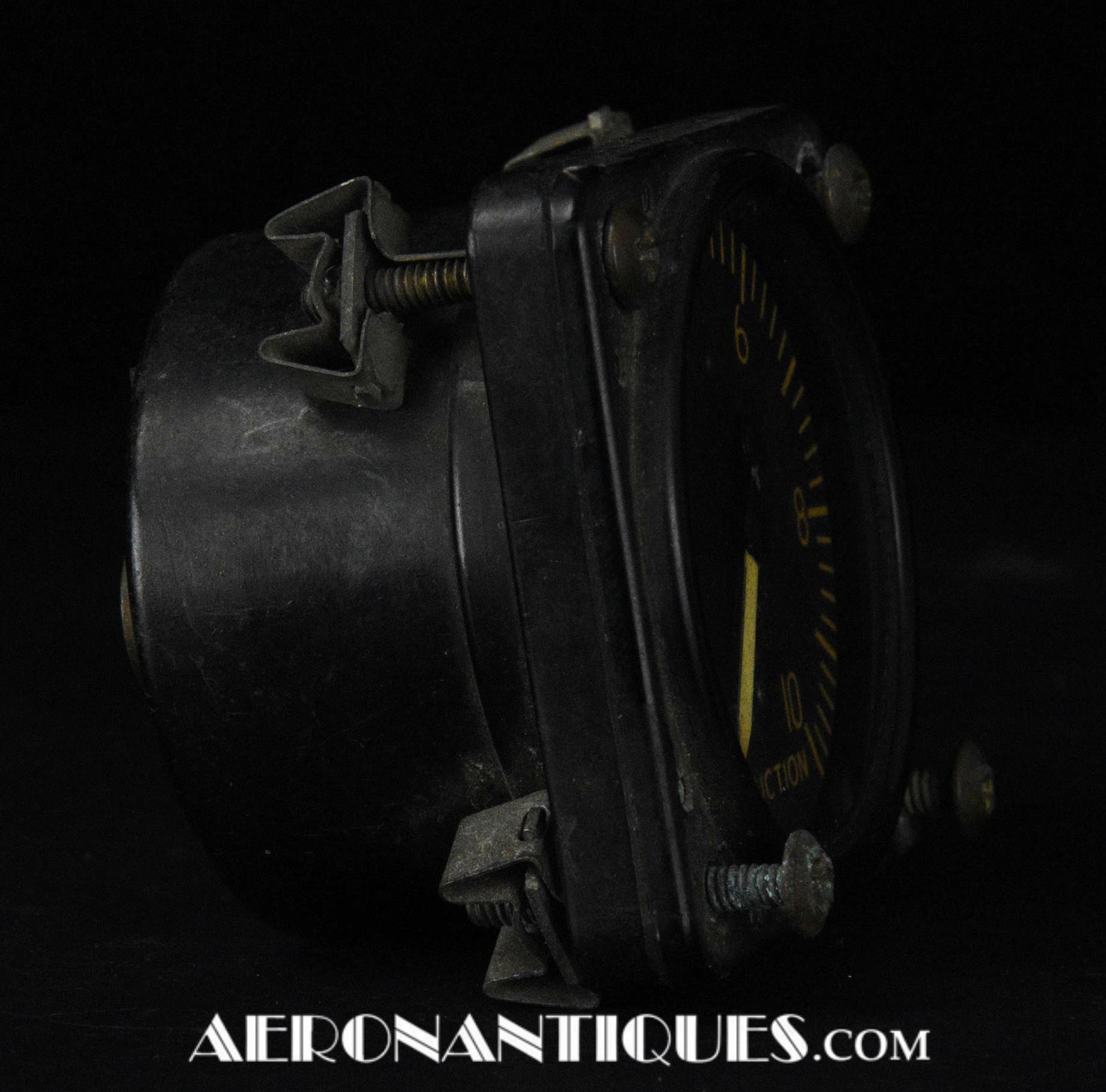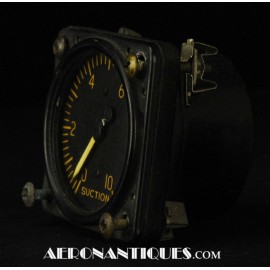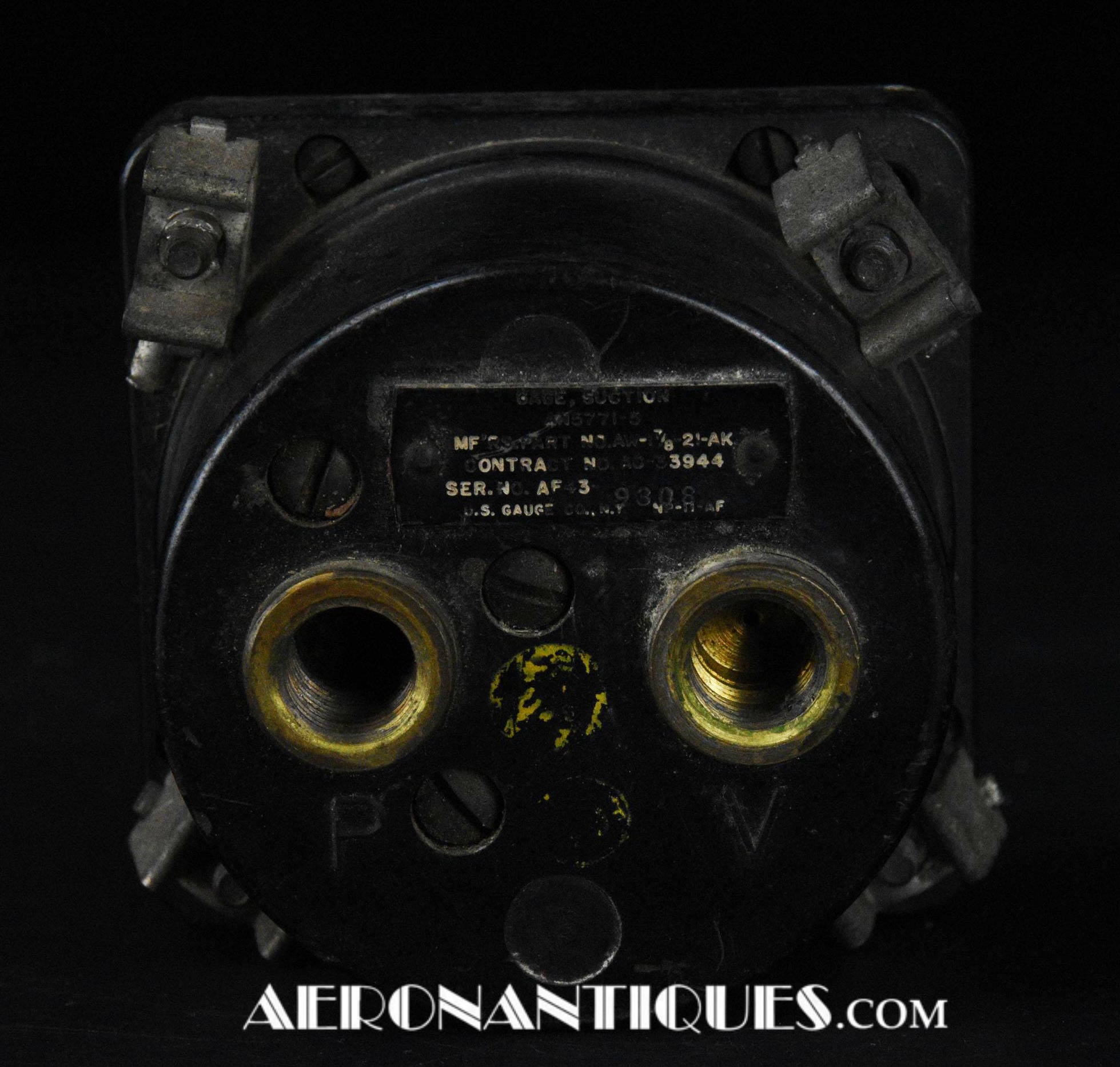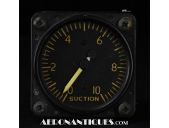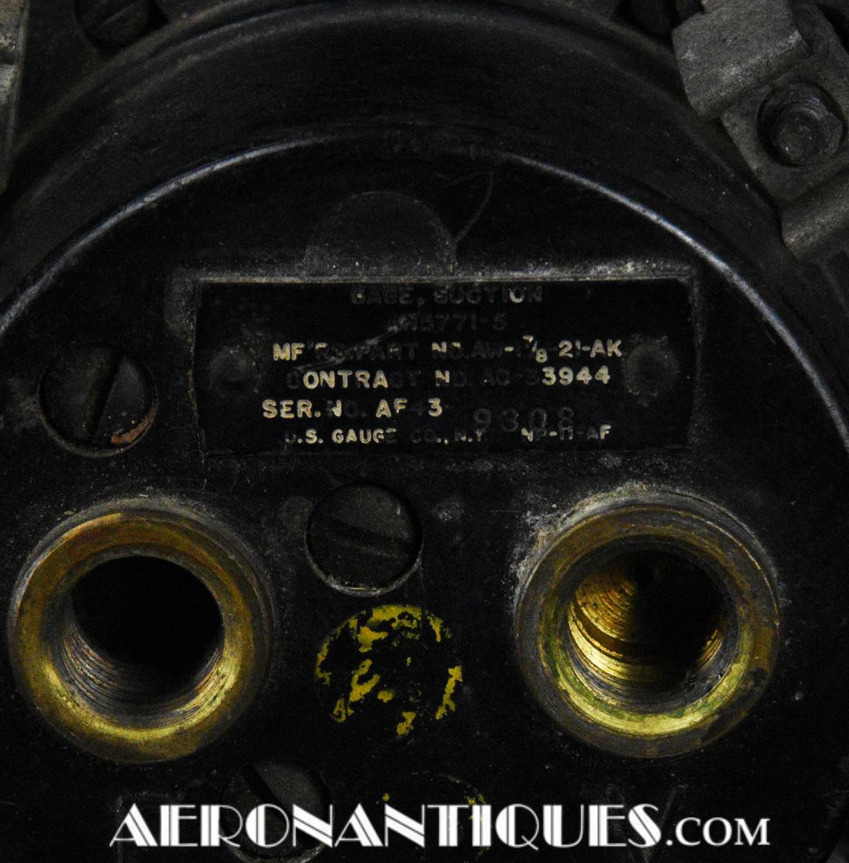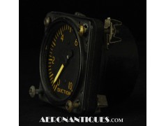 Manomètre à dépression type AN 5771-5 de l'US Army Air Corps, période WWII. Il mesure le niveau de dépression généré par le moteur ou les tubes Venturi pour alimenter les instruments gyroscopiques pneumatiques, tels que le gyroscope d'horizon, le gyroscope directionnel et l'indicateur de virage et d'inclinaison. Équipement standard sur tous les appareils de l'US Army Air Corps, y compris les bombardiers (B-17 Superfortress, B-24 Liberator, B-25 Mitchell), les chasseurs (P-38 Lightning, P-47 Thunderbolt, P-51 Mustang) ou les avions de transport (Dakota Skytrain C-47).