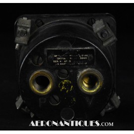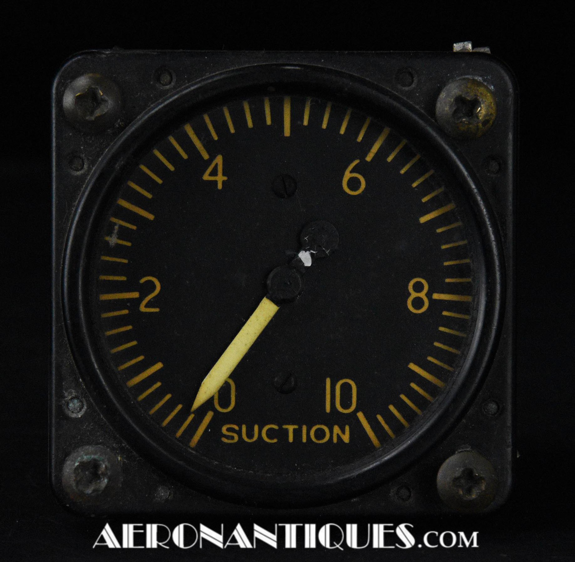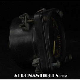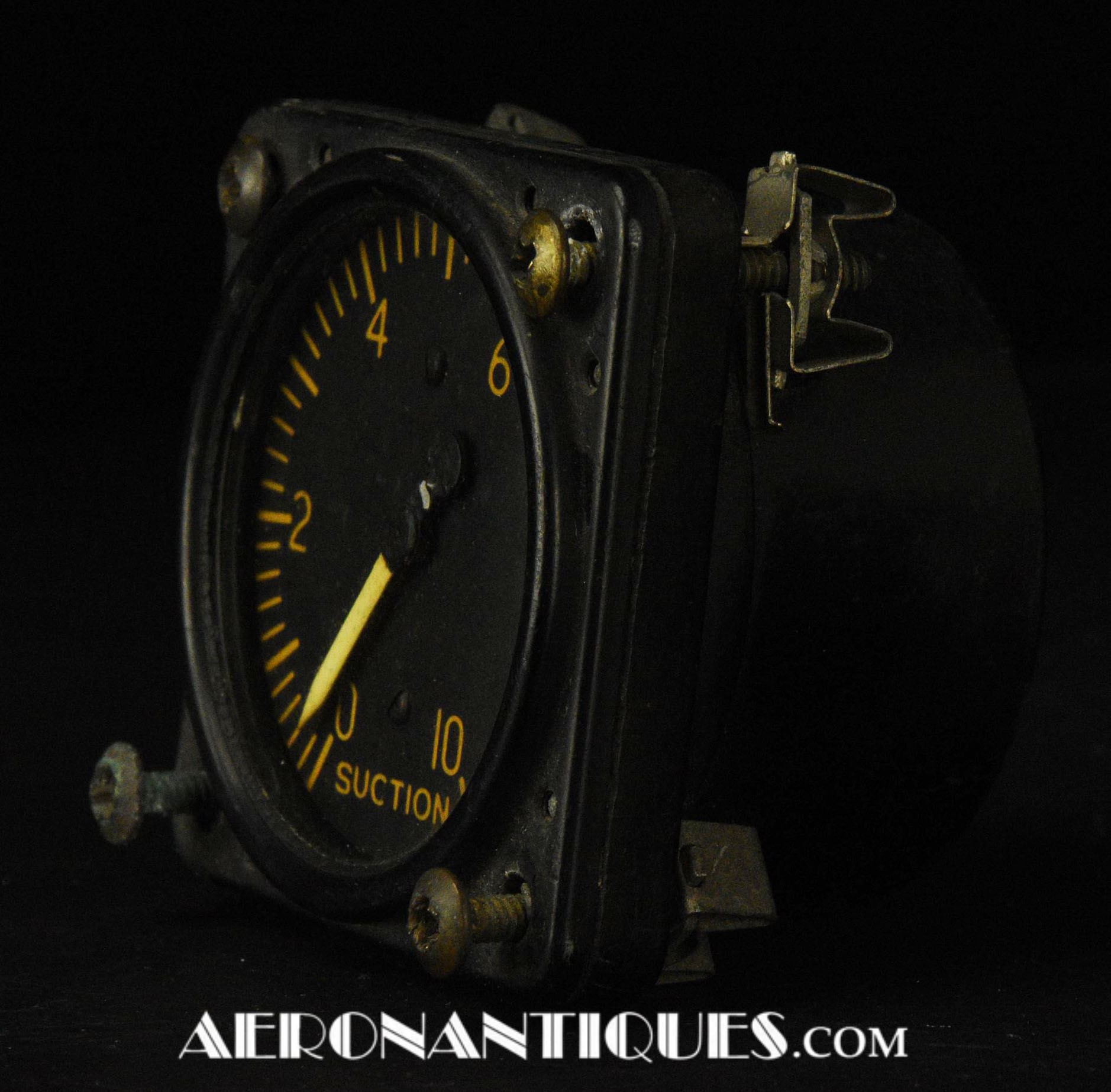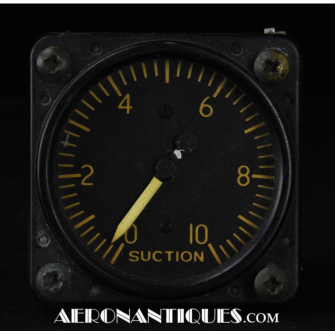Manomètre à dépression type AN 5771-5 de l'US Army Air Corps, période WWII. Il mesure le niveau de dépression généré par le moteur ou les tubes Venturi pour alimenter les instruments gyroscopiques pneumatiques, tels que le gyroscope d'horizon, le gyroscope directionnel et l'indicateur de virage et d'inclinaison. Équipement standard sur tous les appareils de l'US Army Air Corps, y compris les bombardiers (B-17 Superfortress, B-24 Liberator, B-25 Mitchell), les chasseurs (P-38 Lightning, P-47 Thunderbolt, P-51 Mustang) ou les avions de transport (Dakota Skytrain C-47).